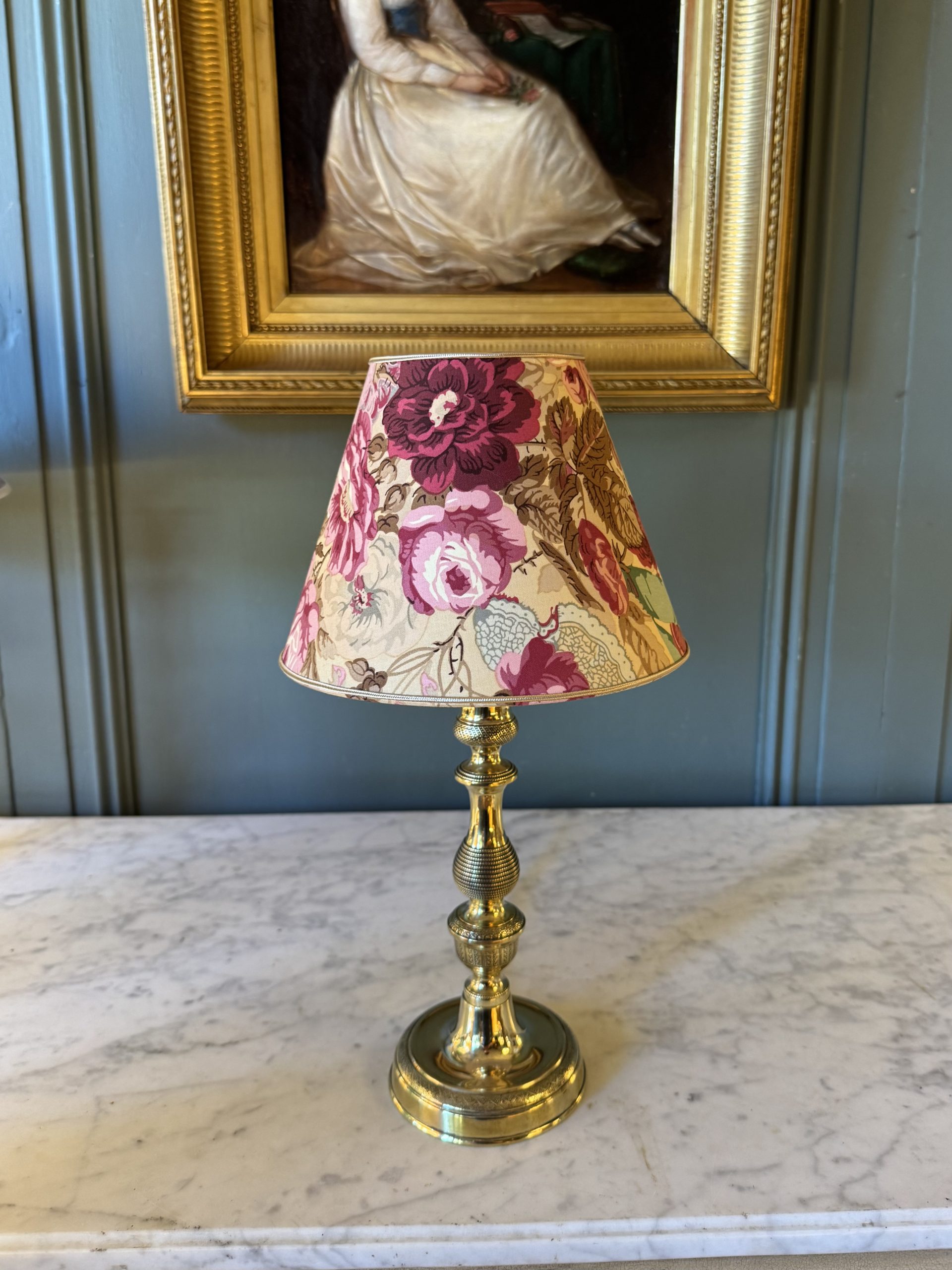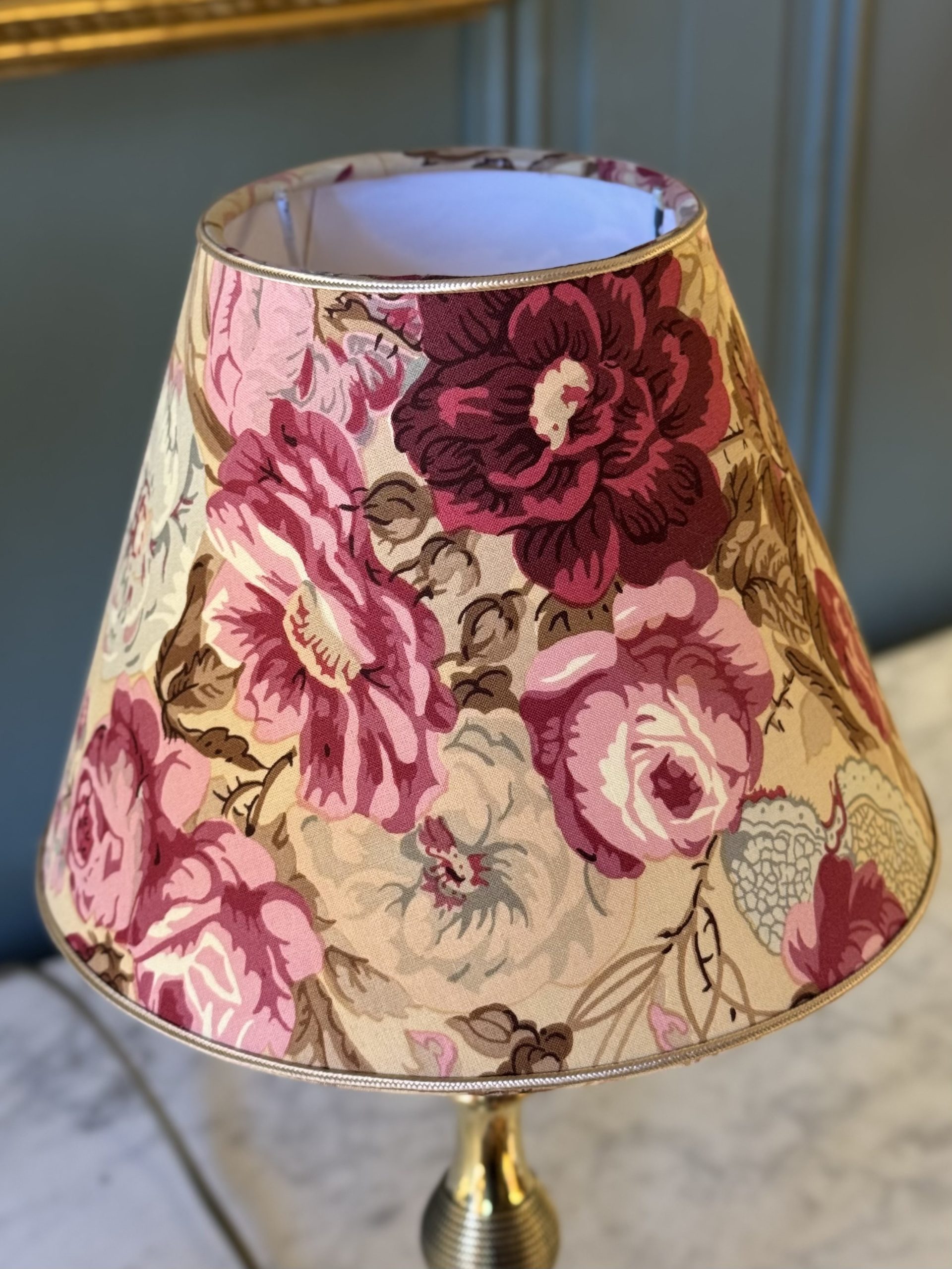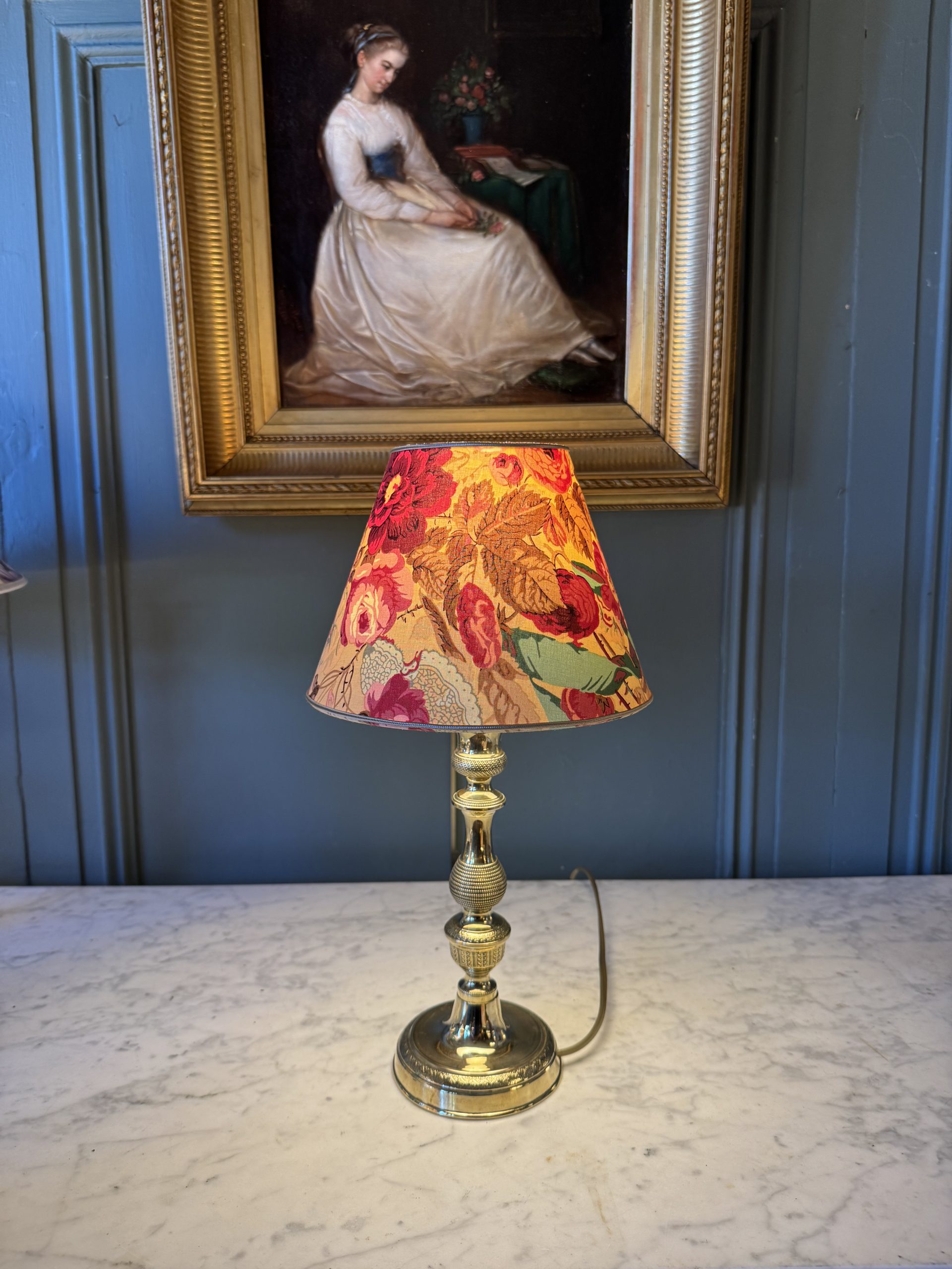 Its empire-shaped lampshade was created from a fabric decorated with old roses.