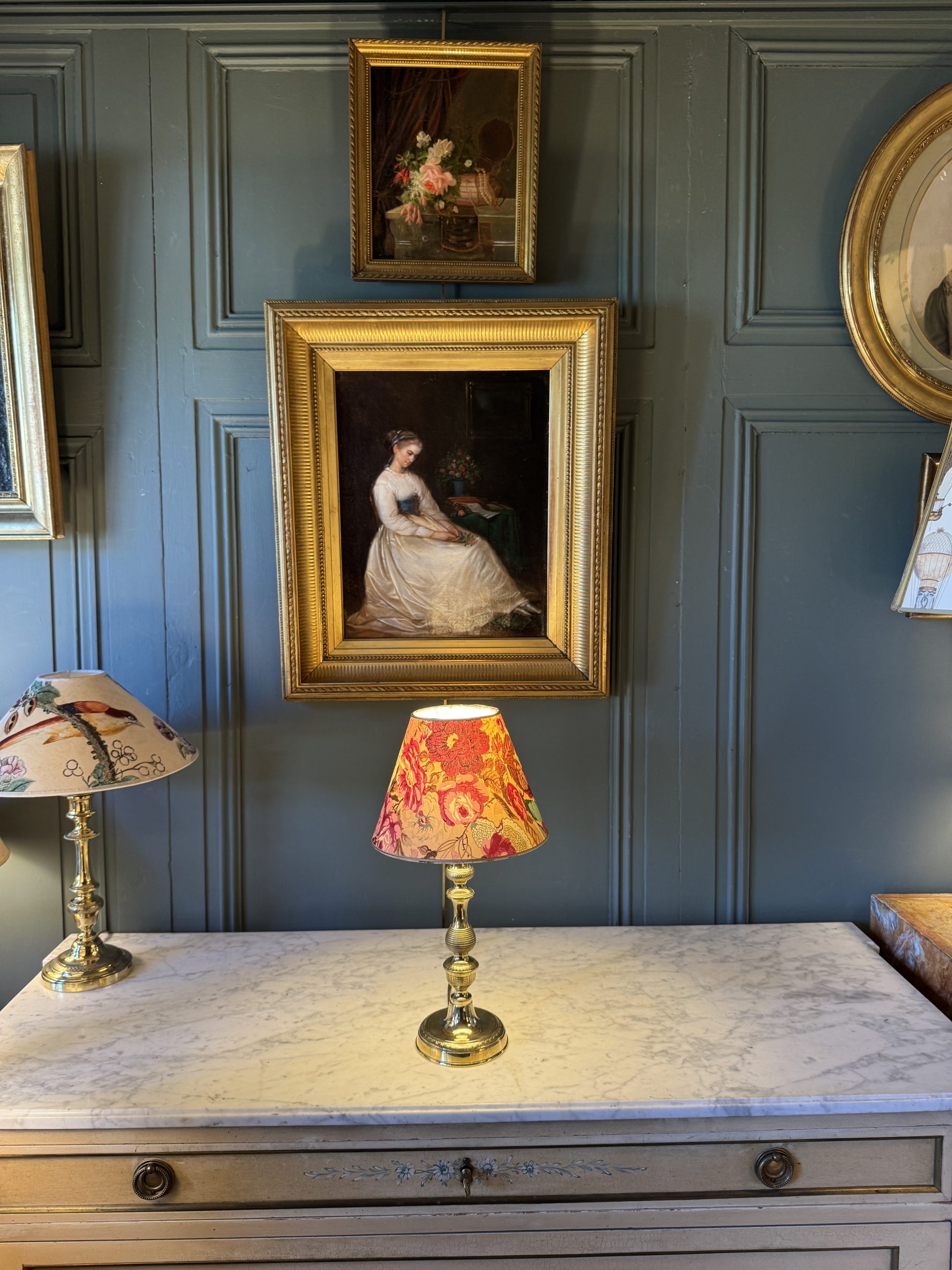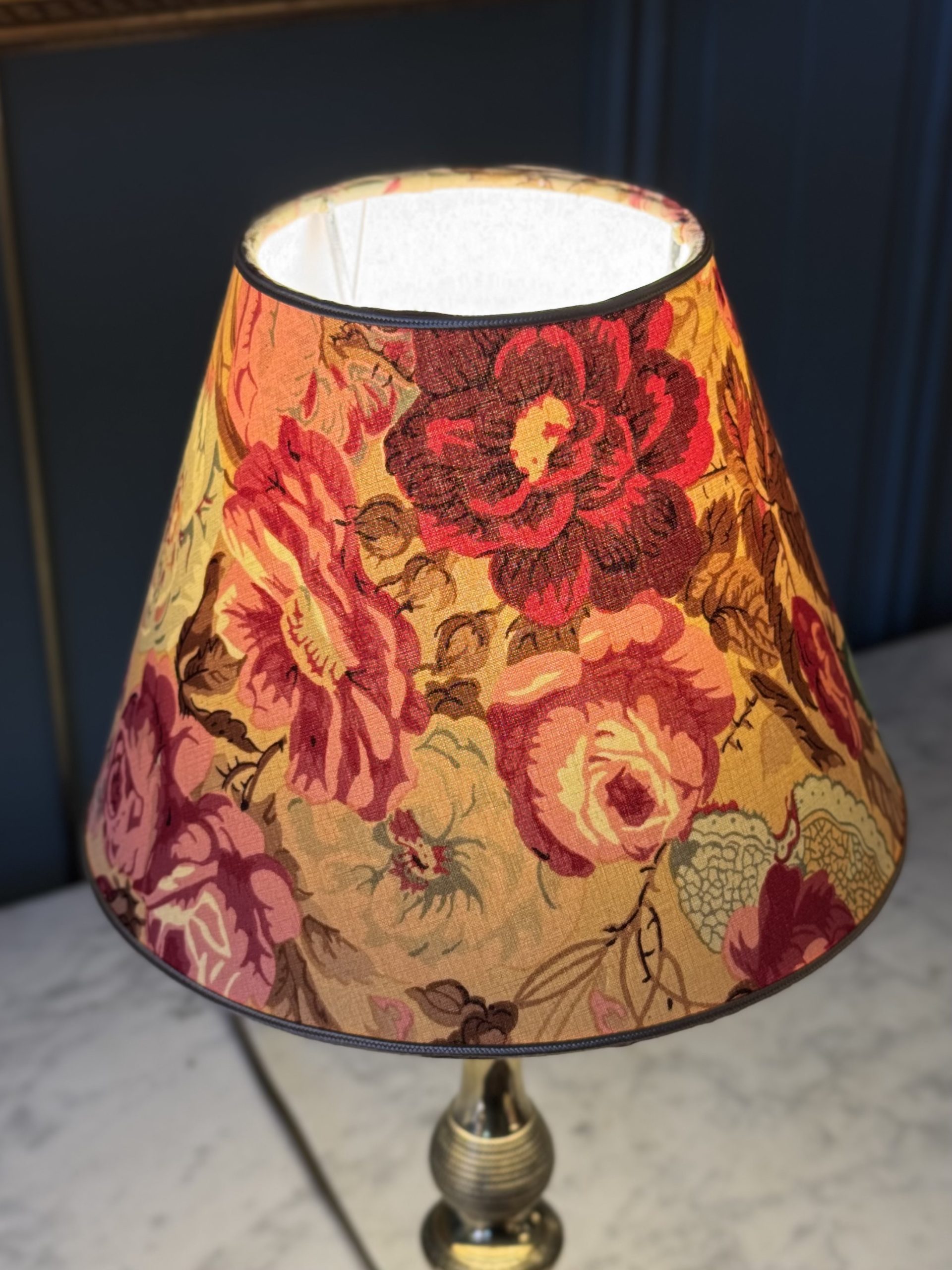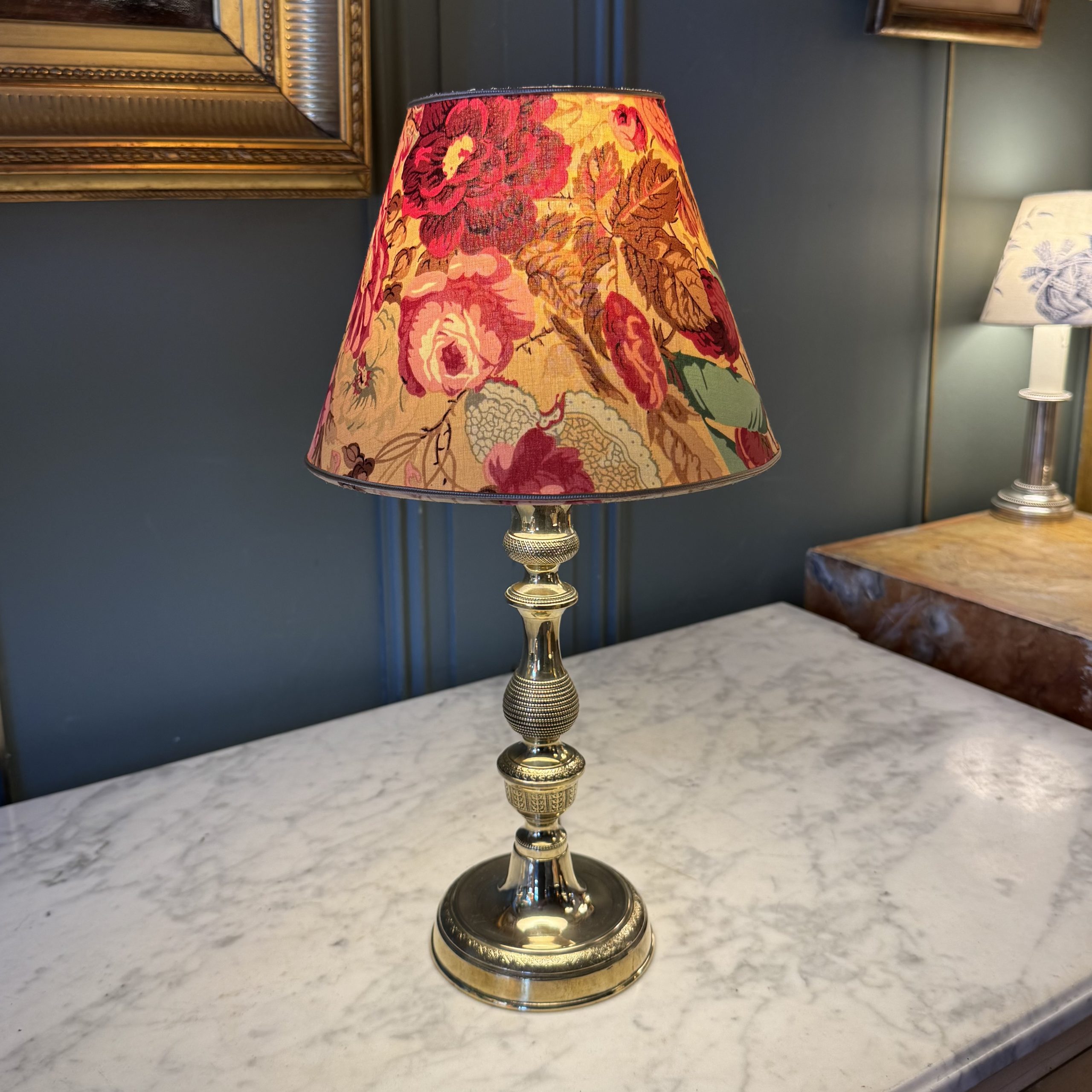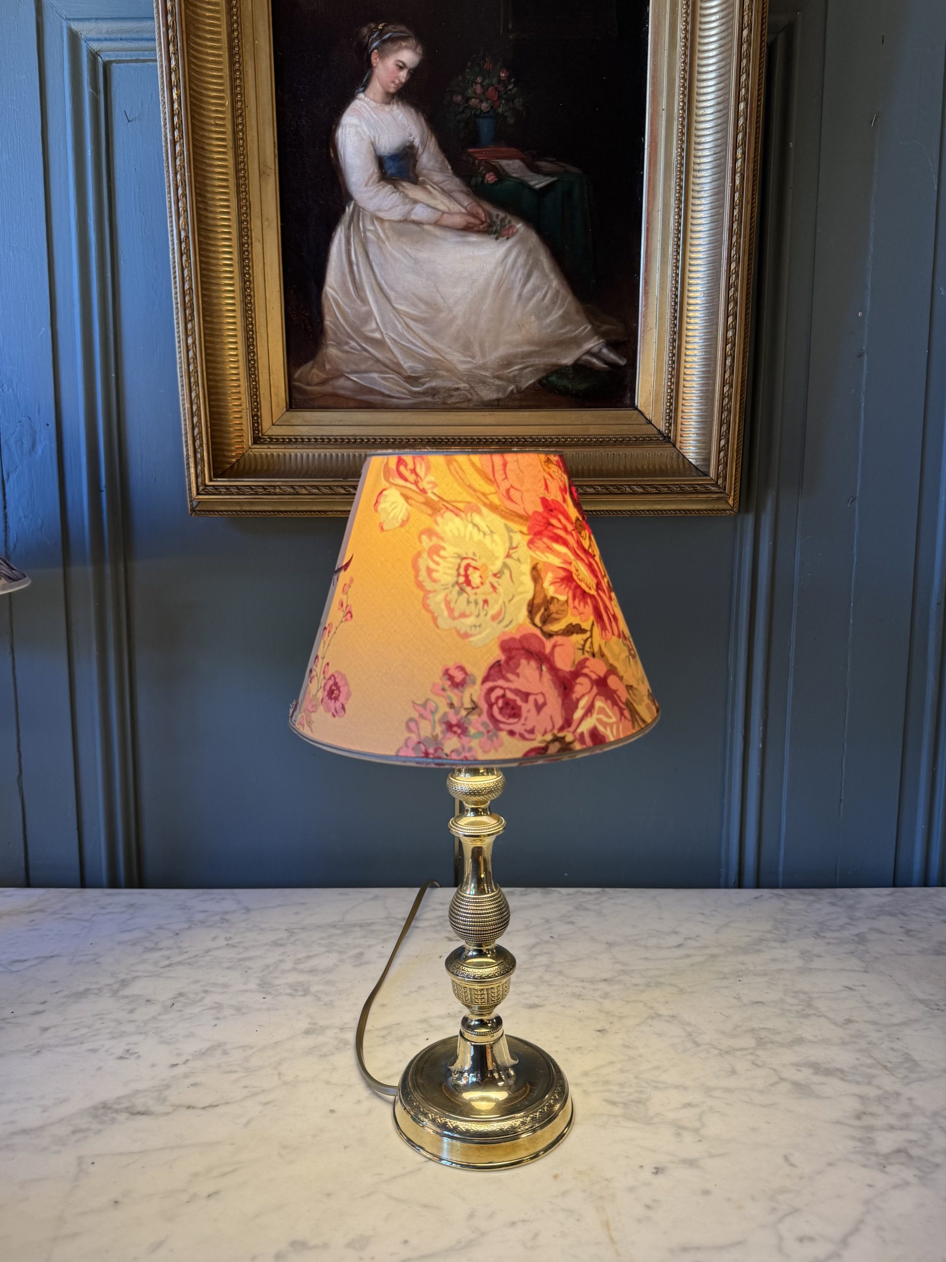 Its empire-shaped lampshade was created from a fabric decorated with old roses.