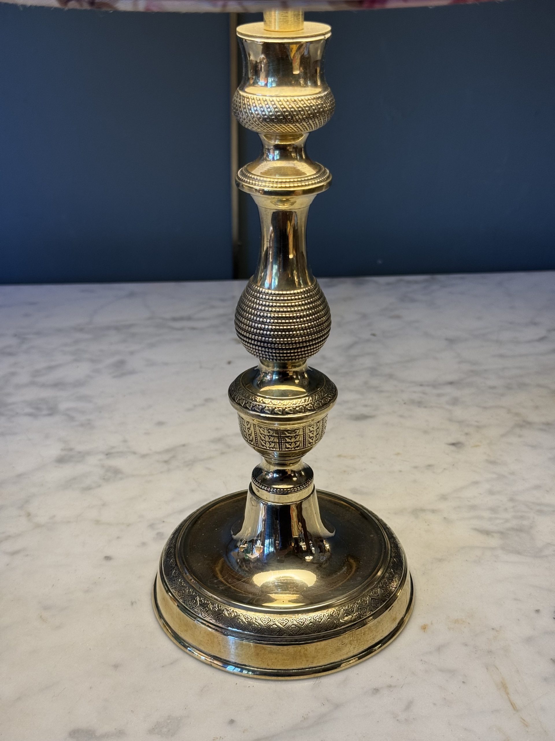 19th century candlestick, restoration period, in polished bronze (gold color), chiseled and guilloché, mounted as a lamp.