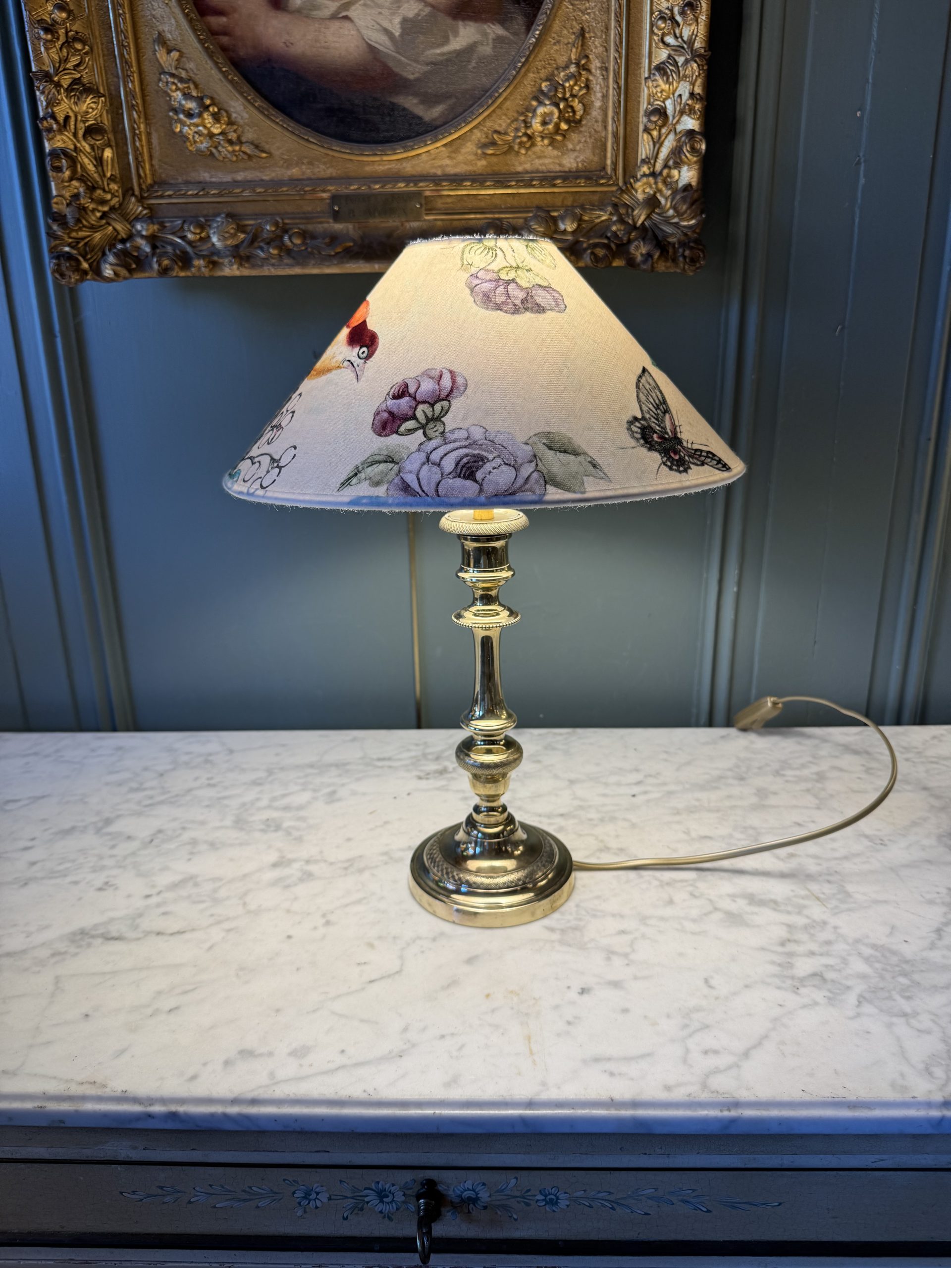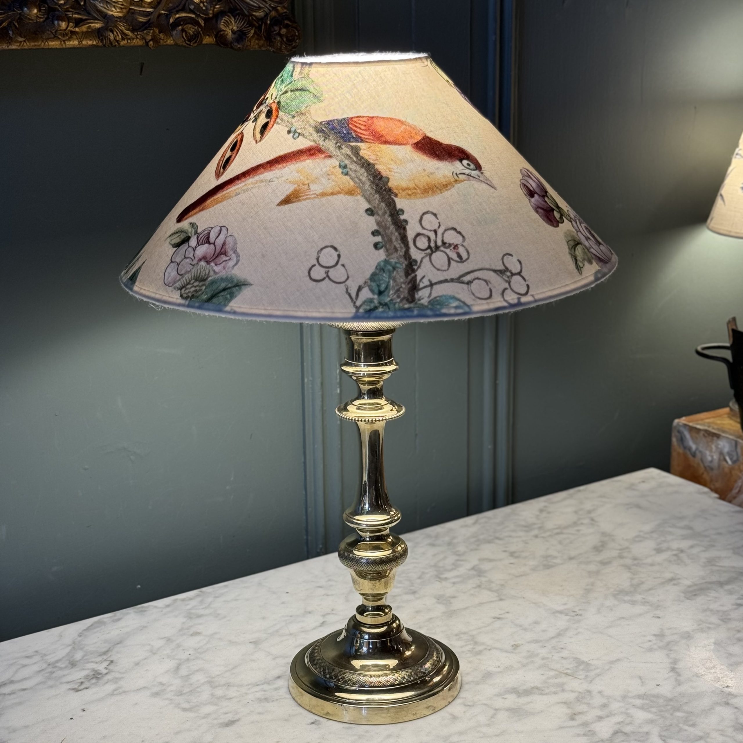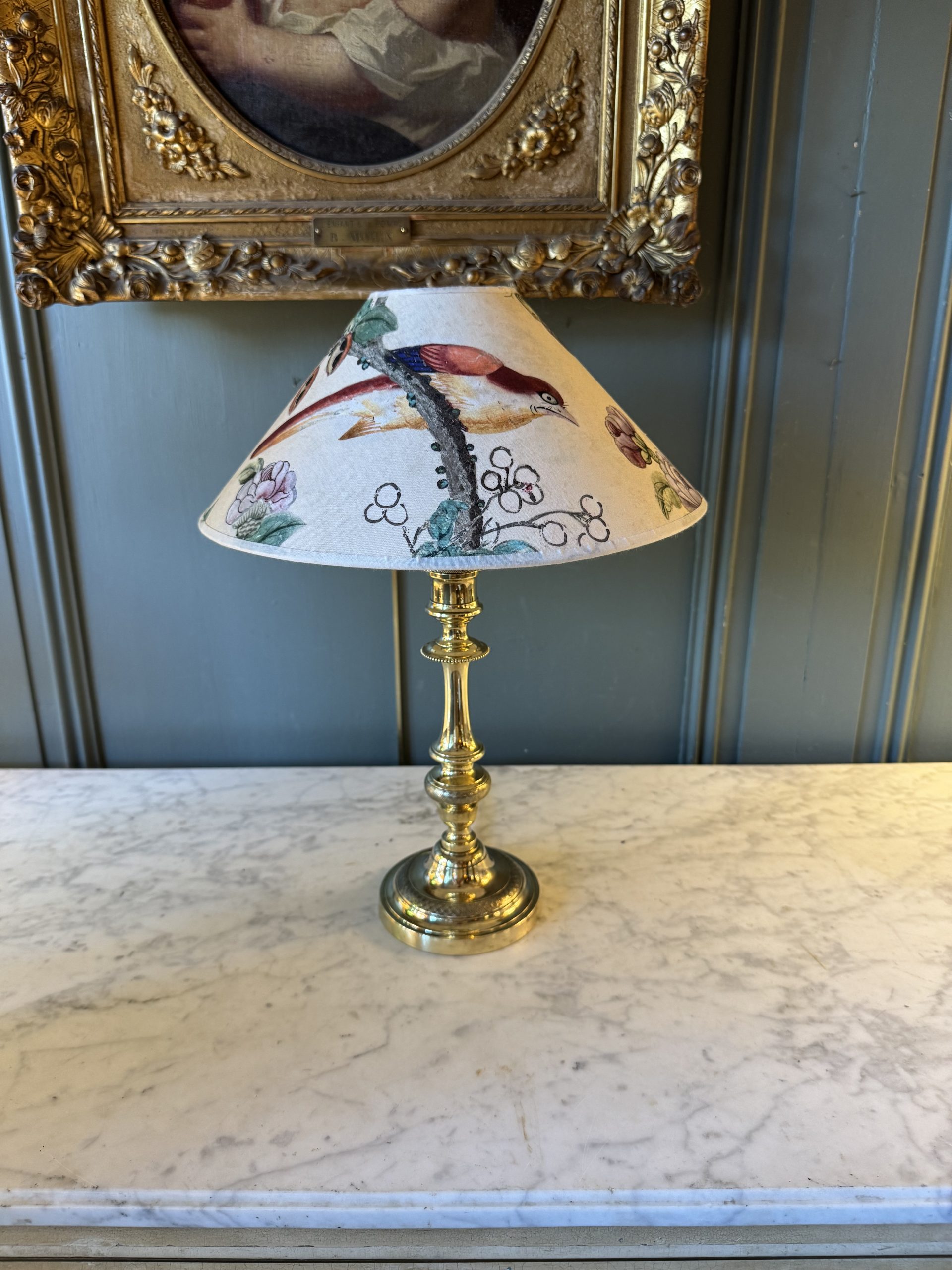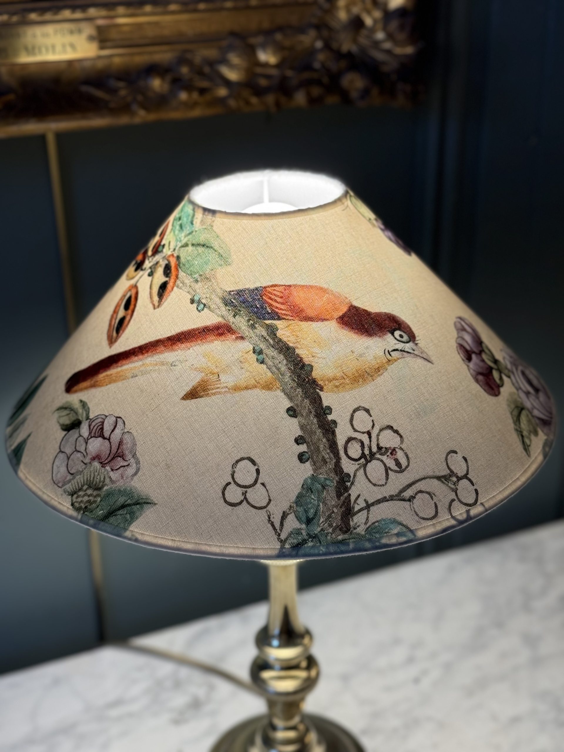 Its conical lampshade was created from an Antoinette Poisson “Canton” fabric decorated with a bird, butterfly and floral.