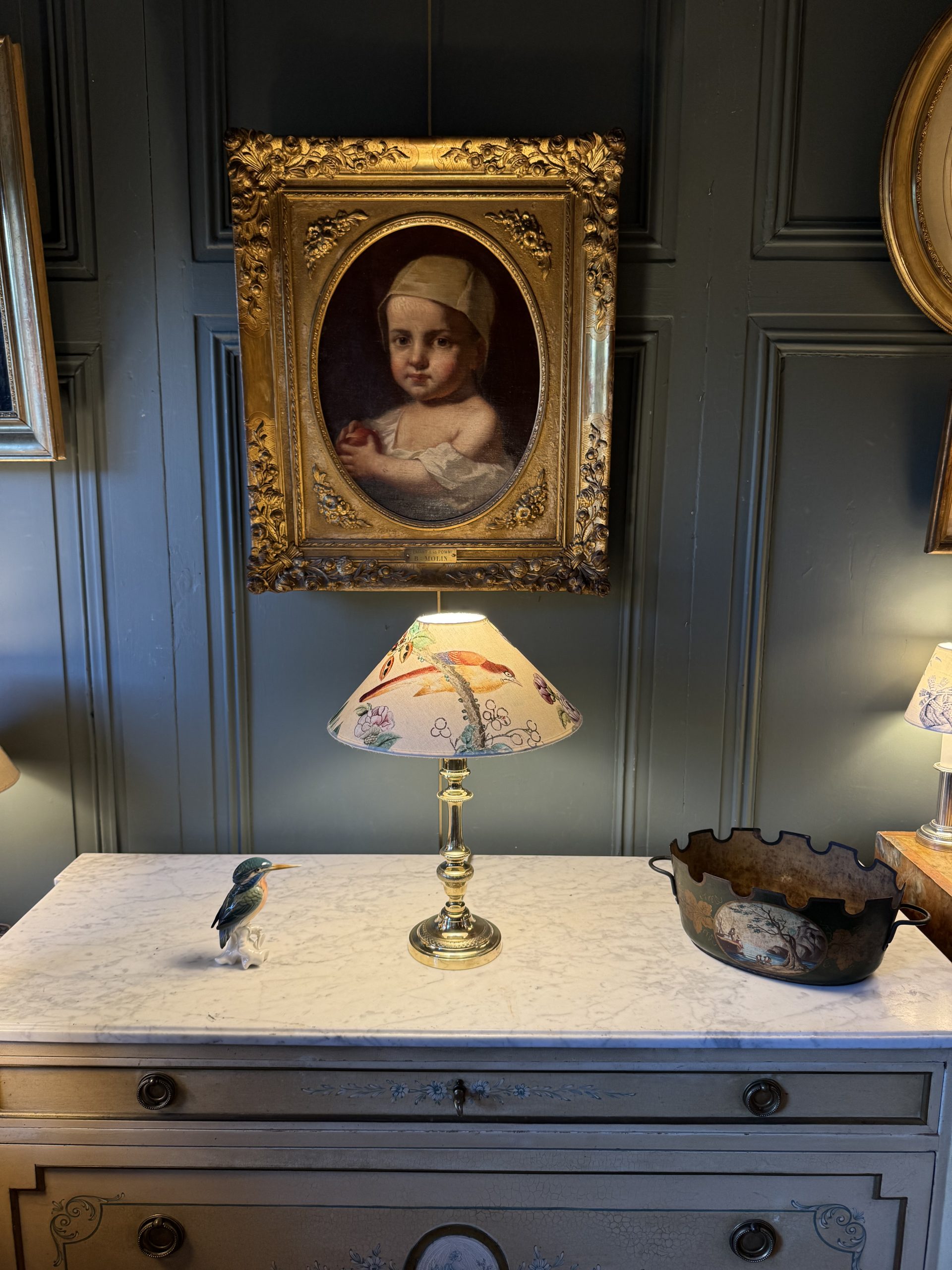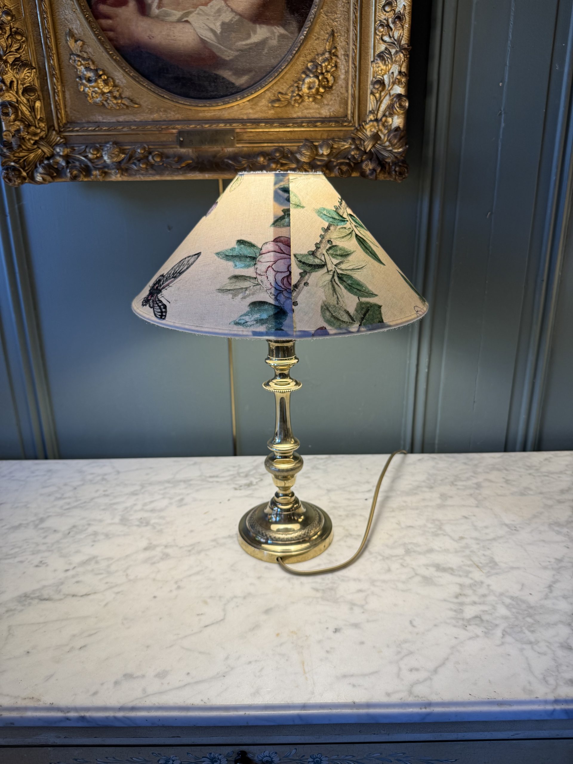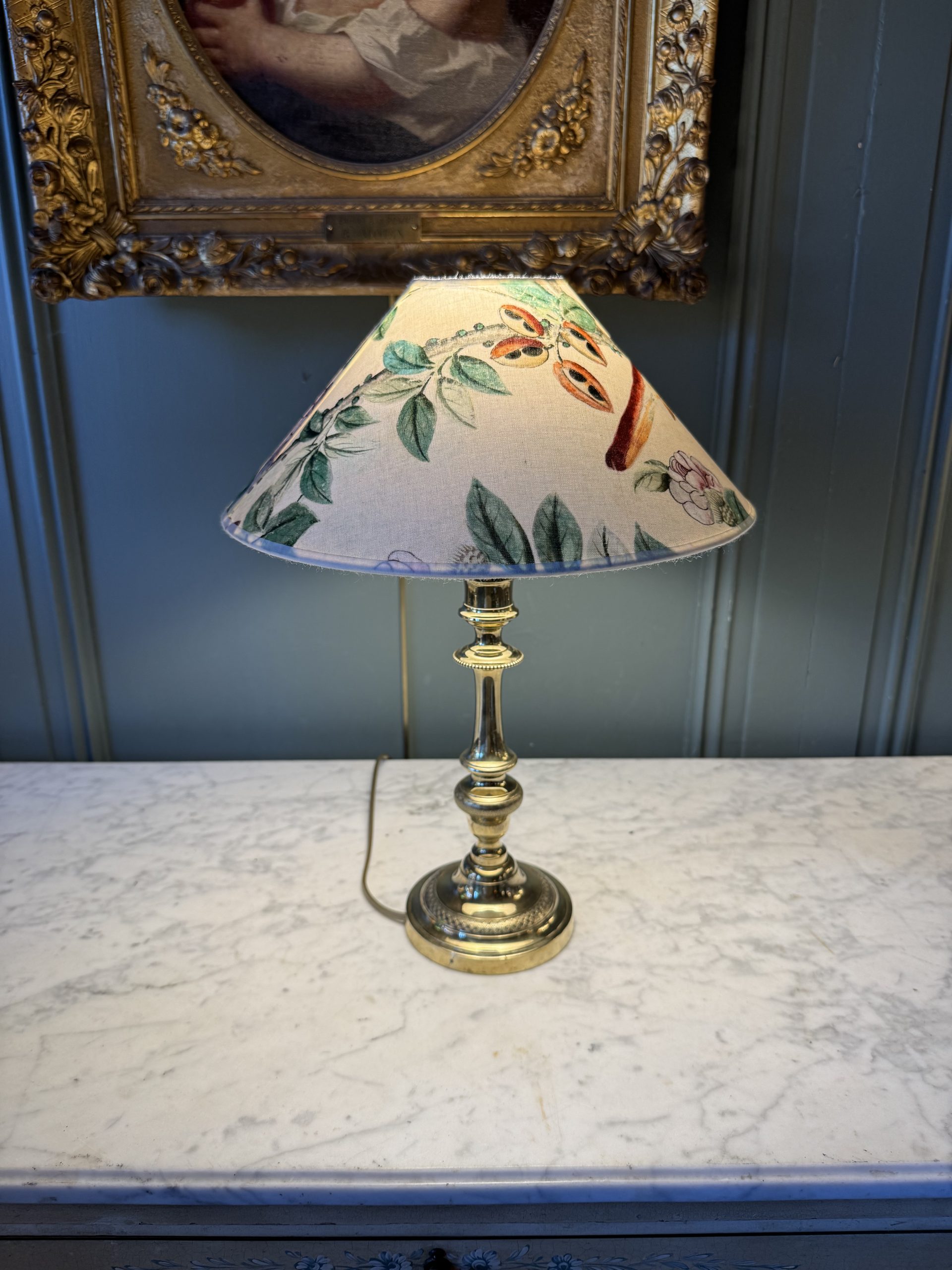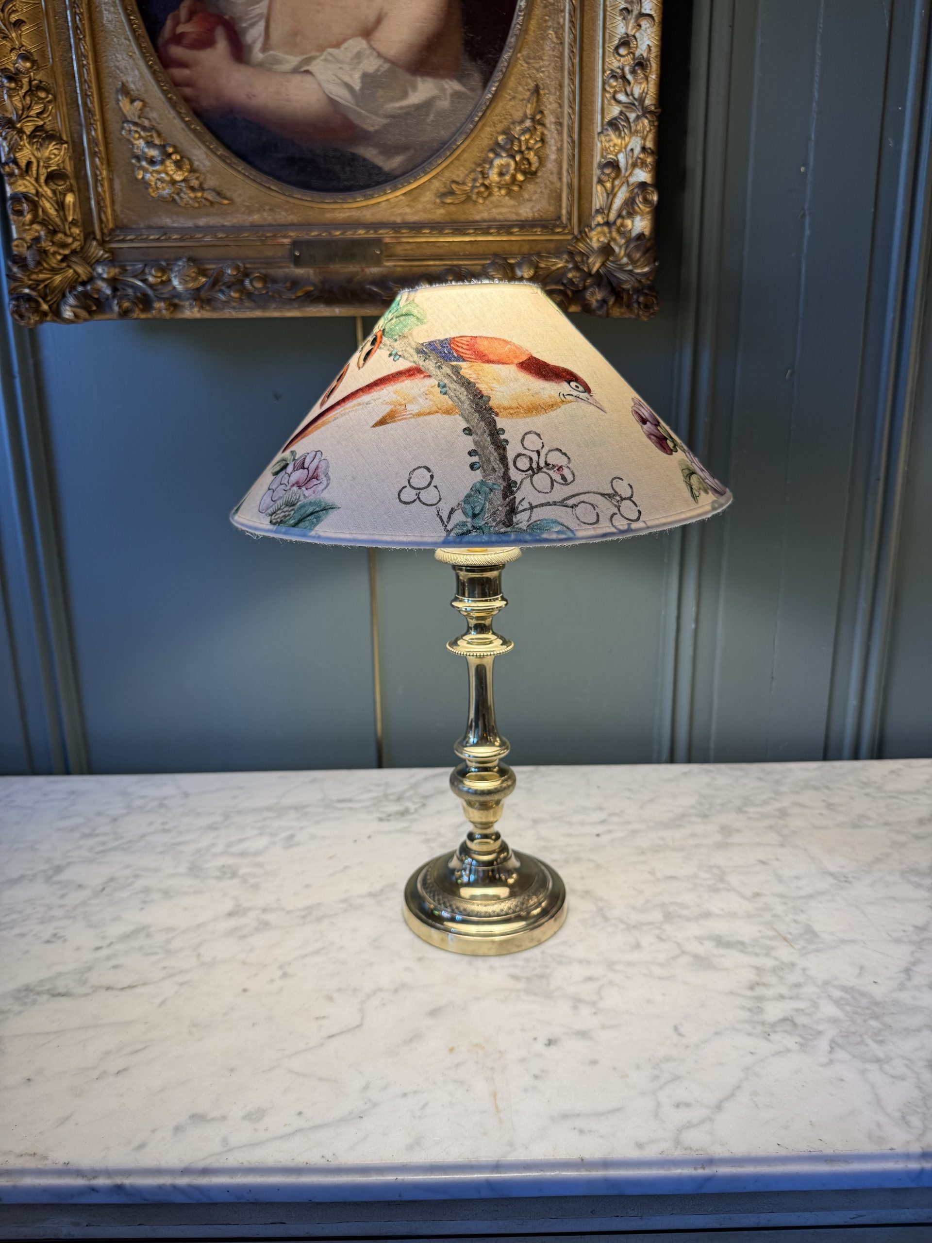 Its conical lampshade was created from an Antoinette Poisson “Canton” fabric decorated with a bird, butterfly and floral.