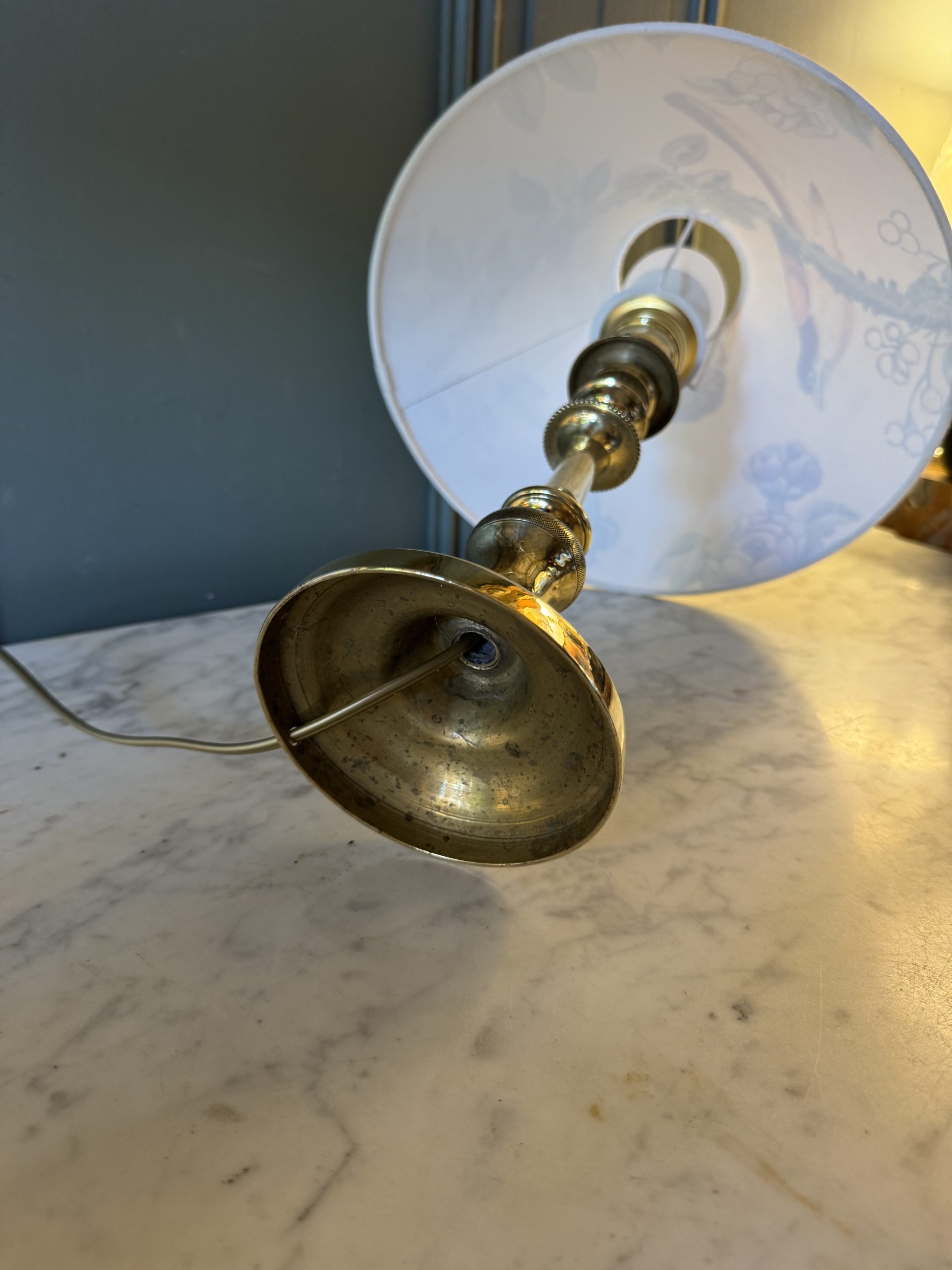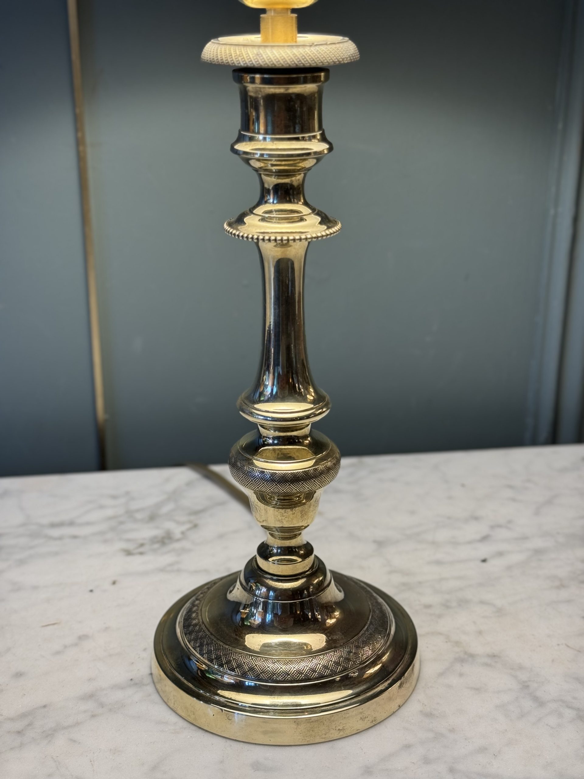 Mid-19th century candlestick in polished bronze (gold color) guilloché mounted as a lamp. New electrification: gilded brass socket for E27 screw bulb, new wire.
