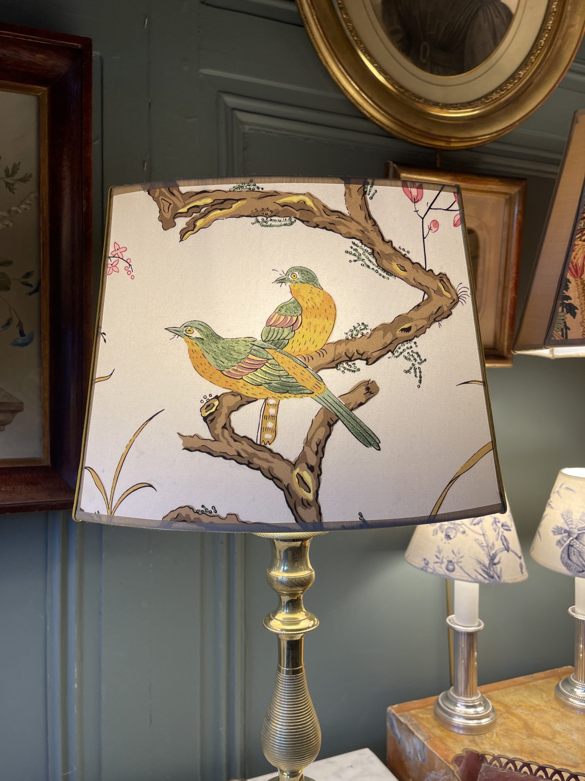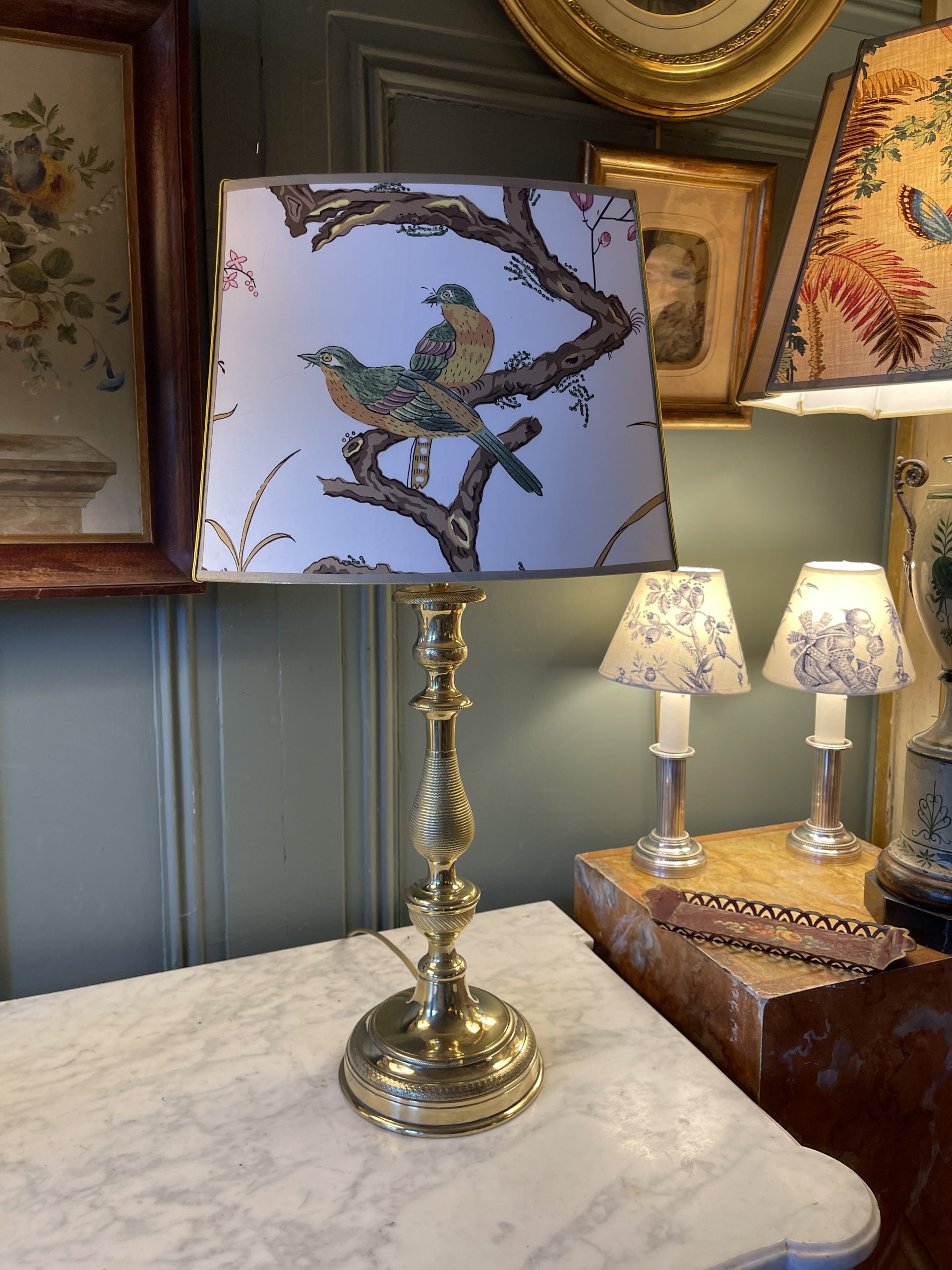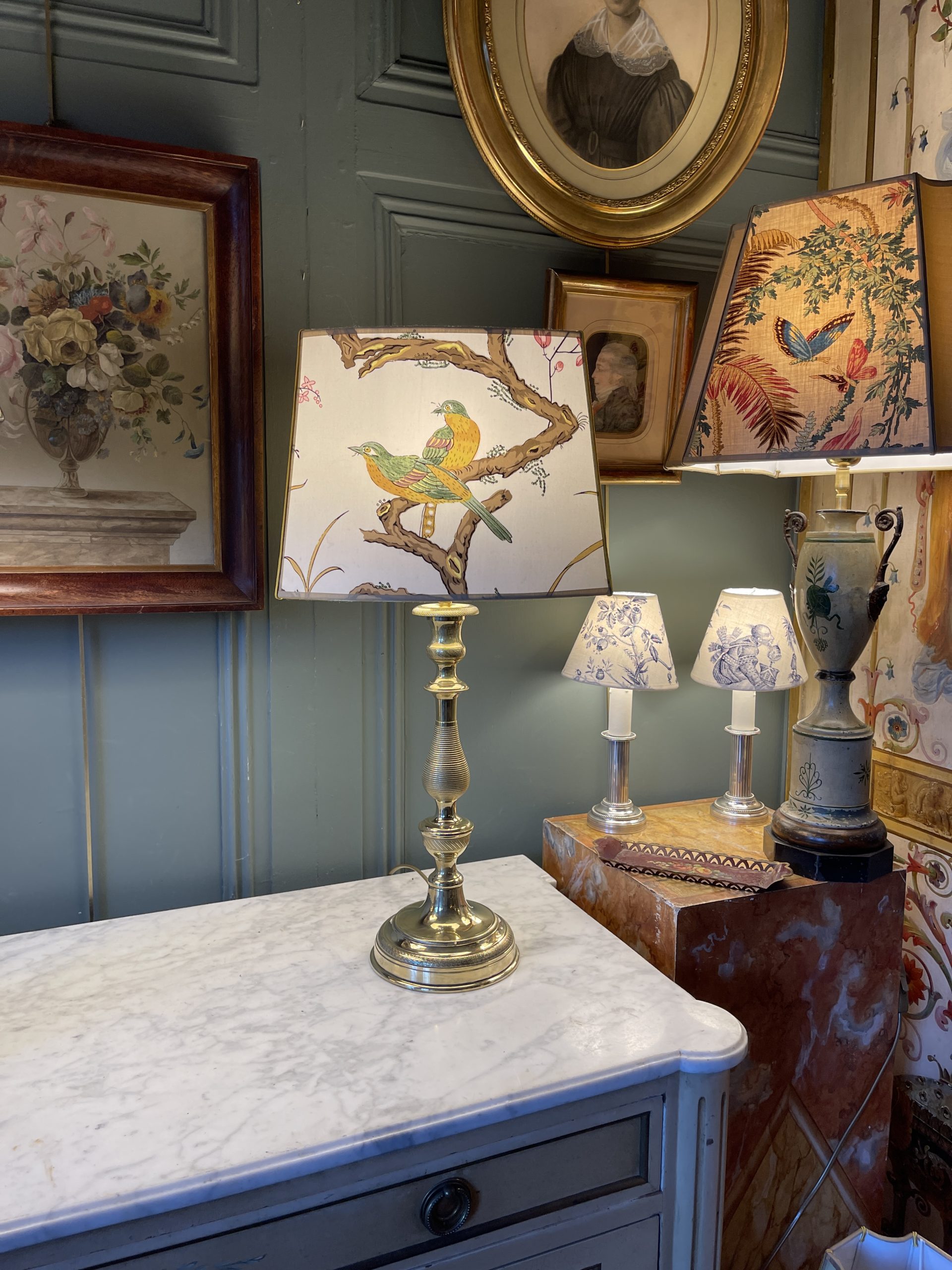 Its oval lampshade with cut sides was created from a Manuel Canovas fabric “Pavillon de Bidaine” with floral decoration and a bird.
