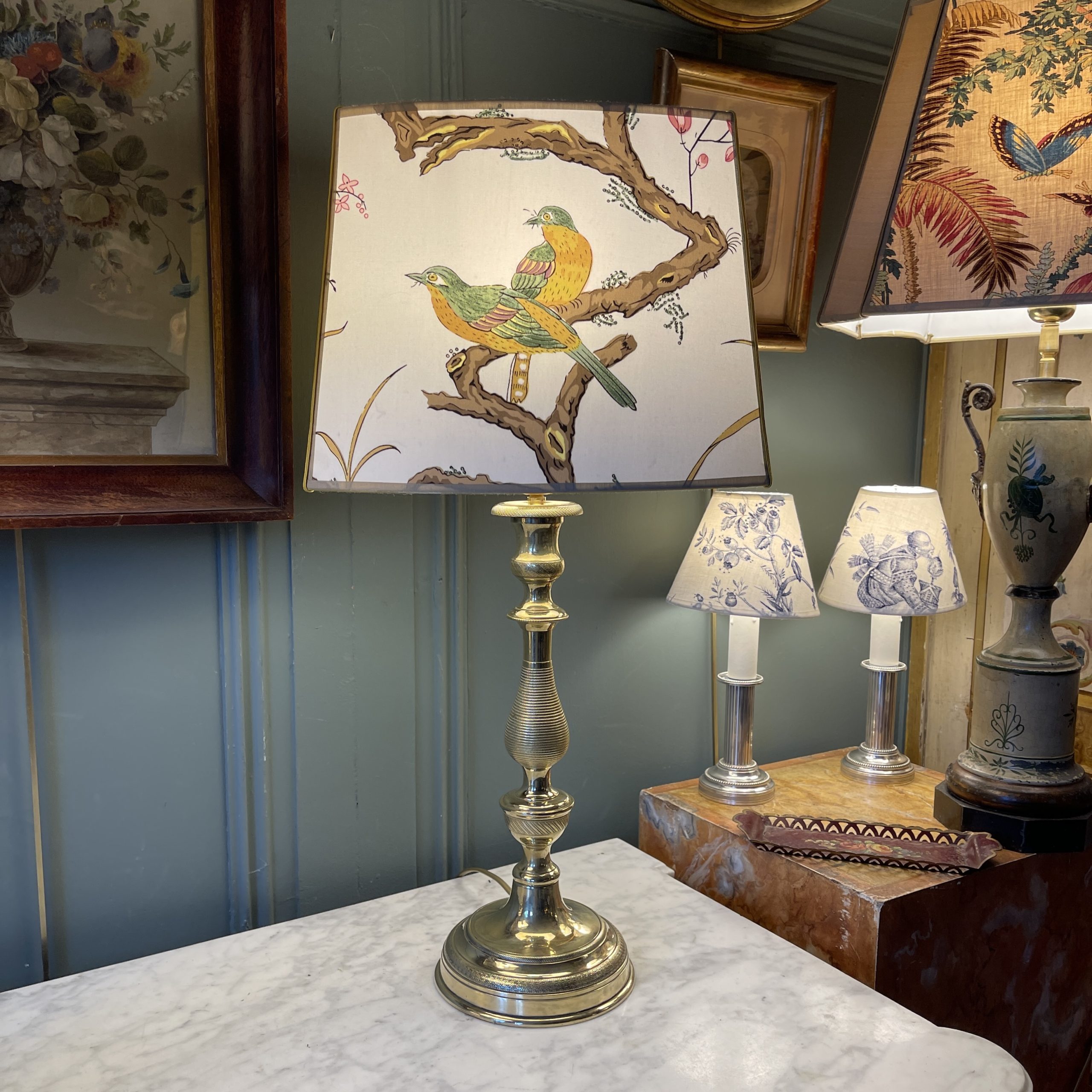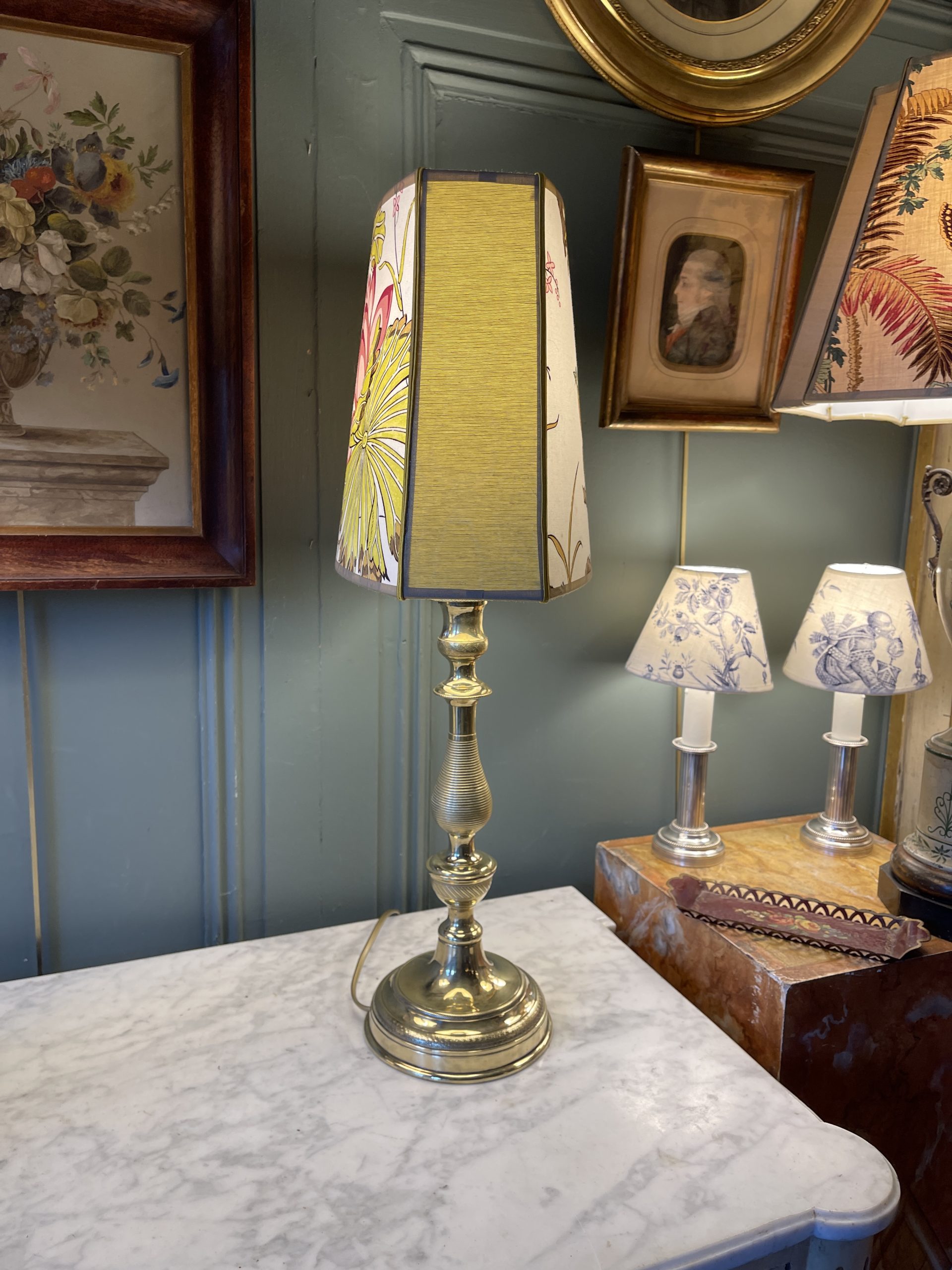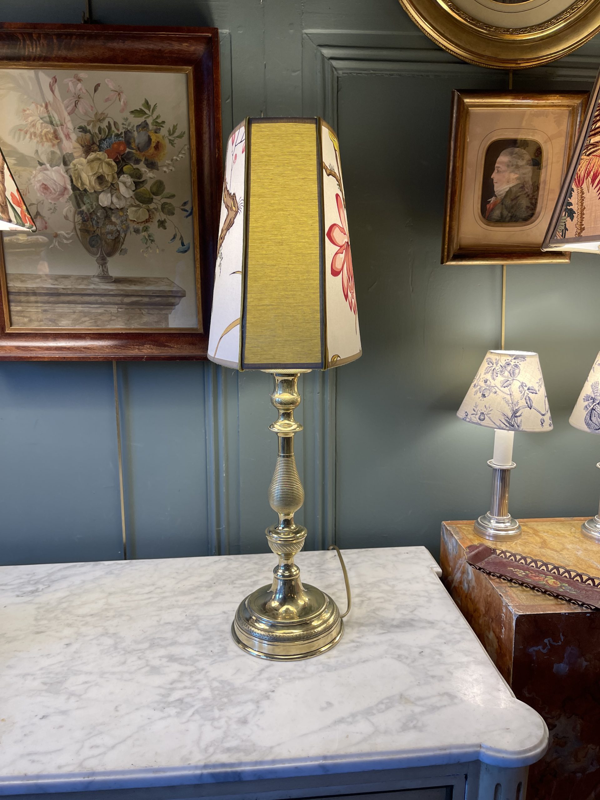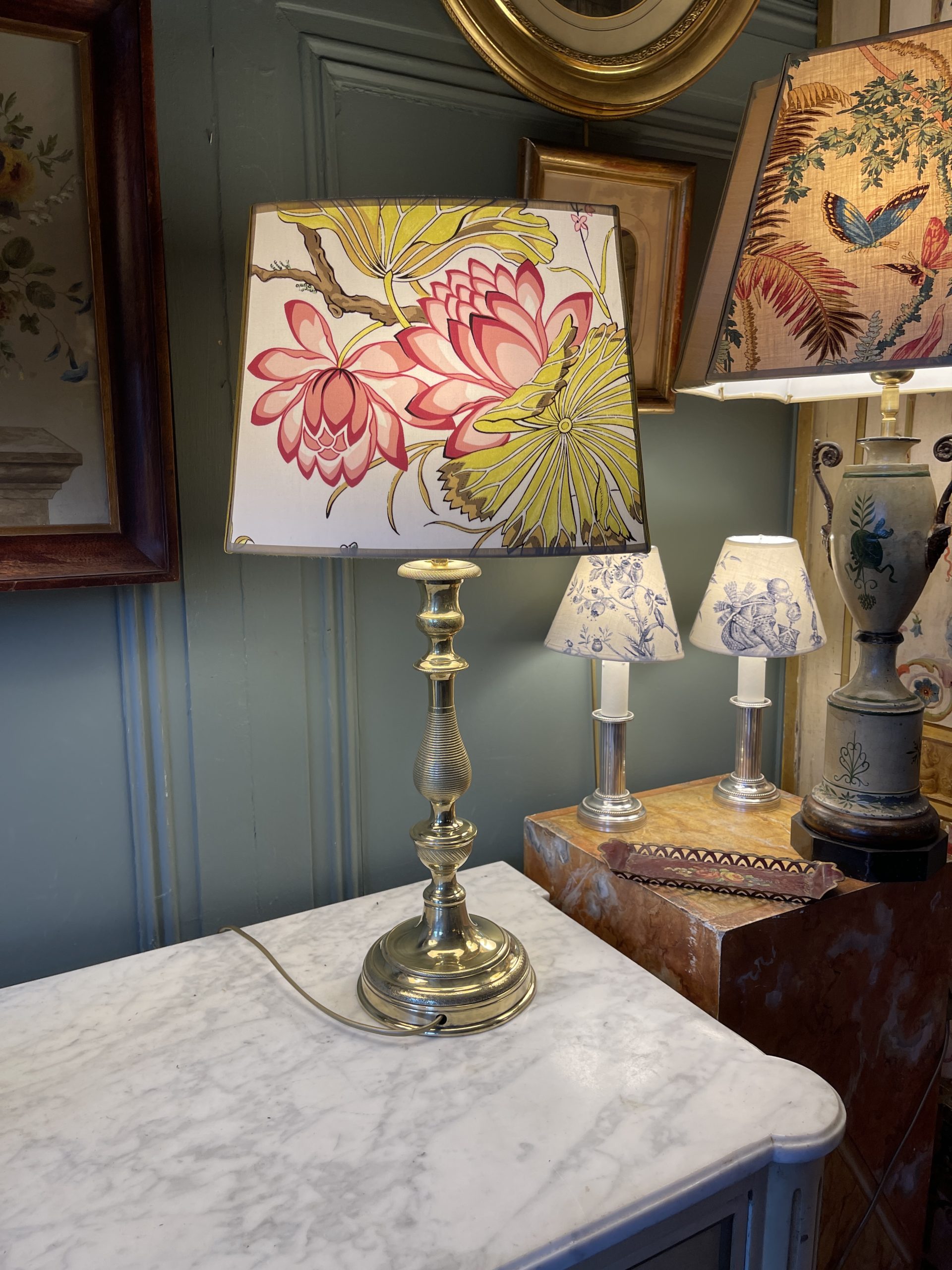 Its oval lampshade with cut sides was created from a Manuel Canovas fabric “Pavillon de Bidaine” with floral decoration and a bird.