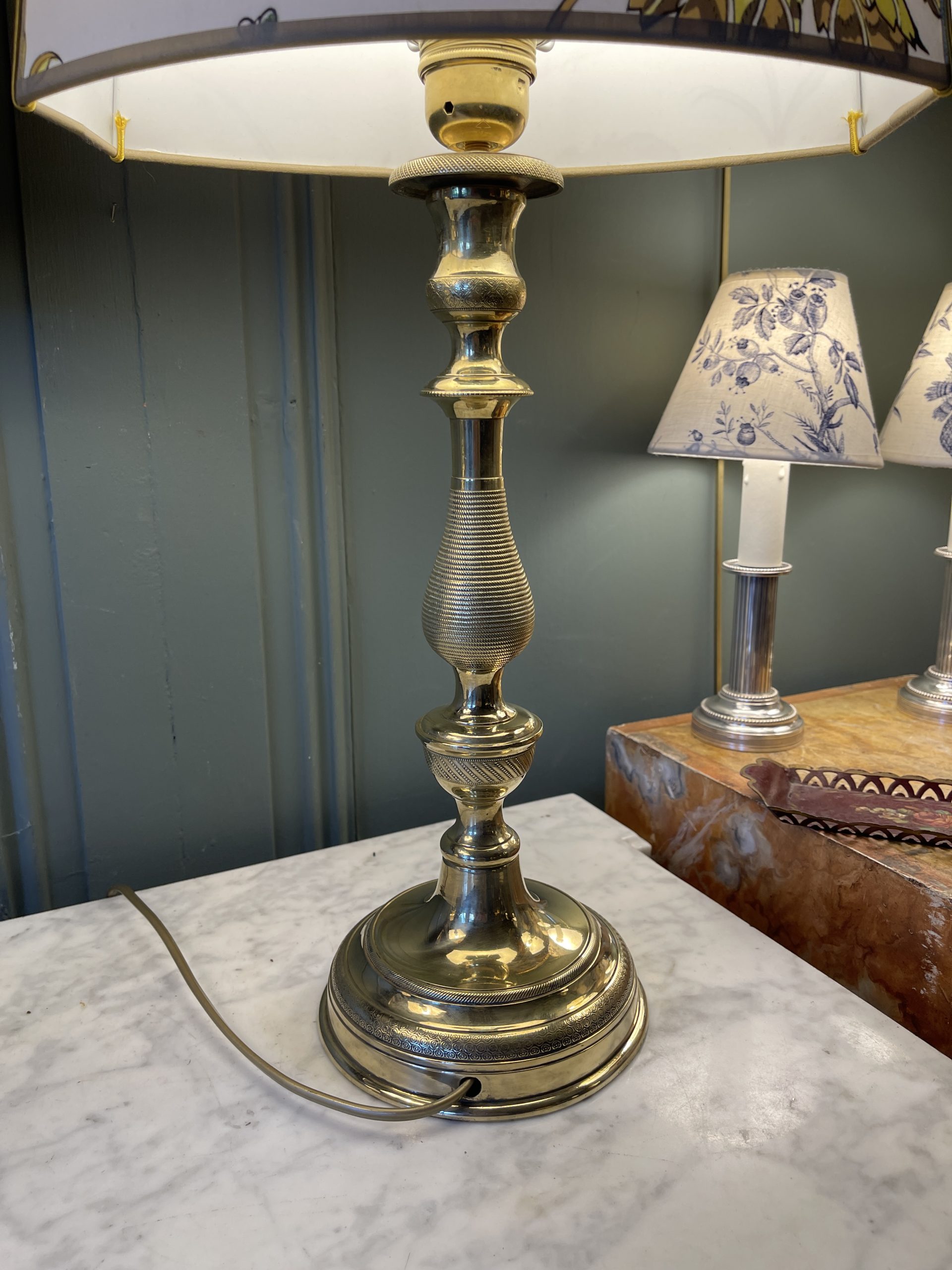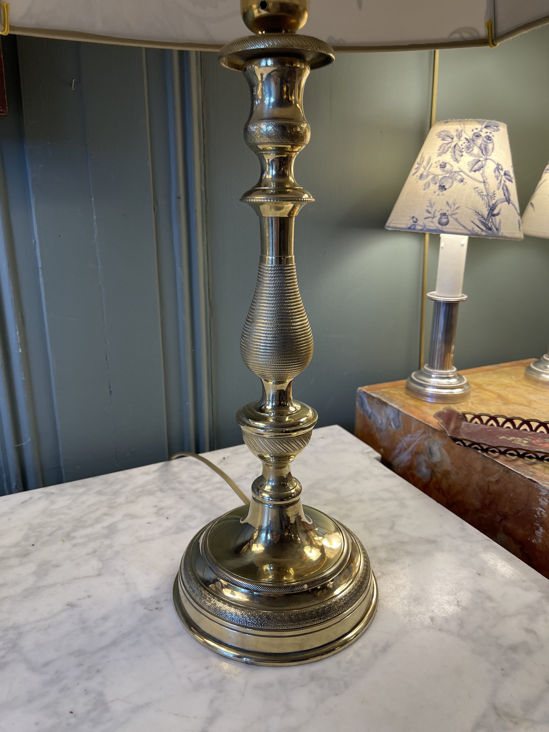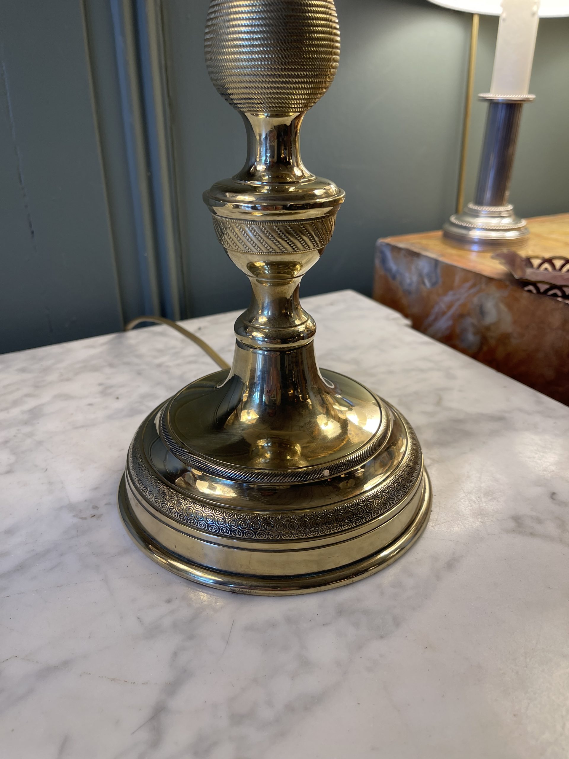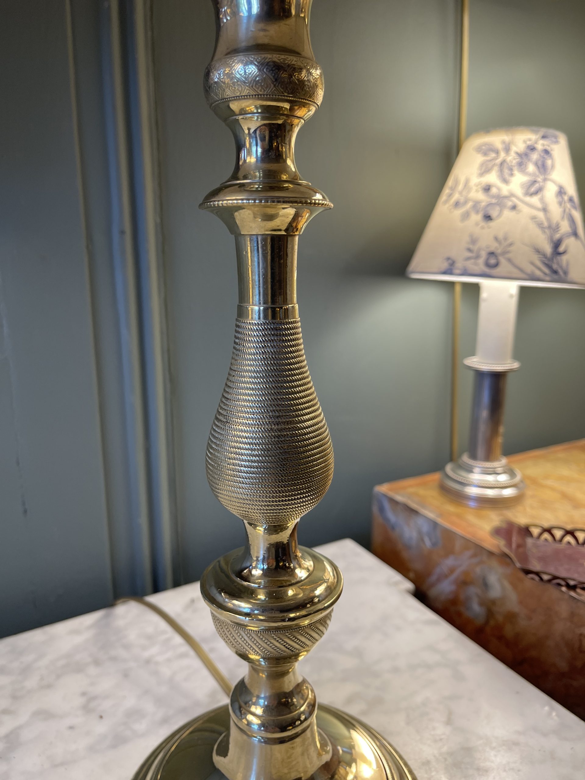 Large 19th century candlestick, restoration period, in polished bronze (gold color) chiseled, mounted as a lamp.