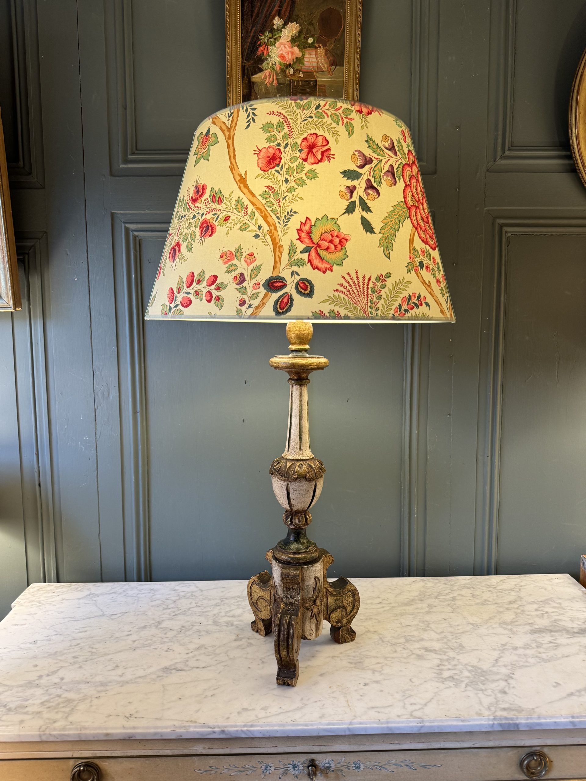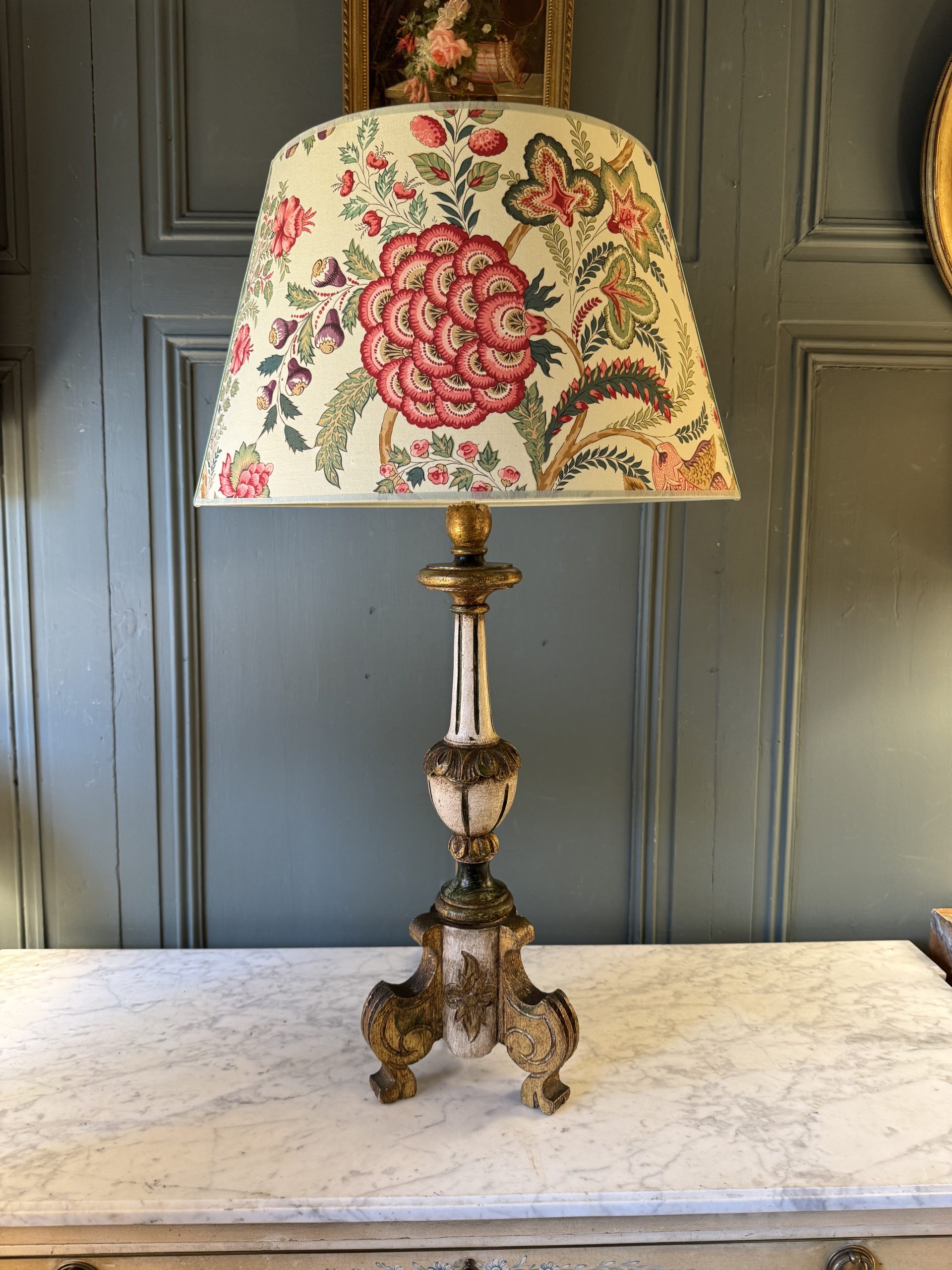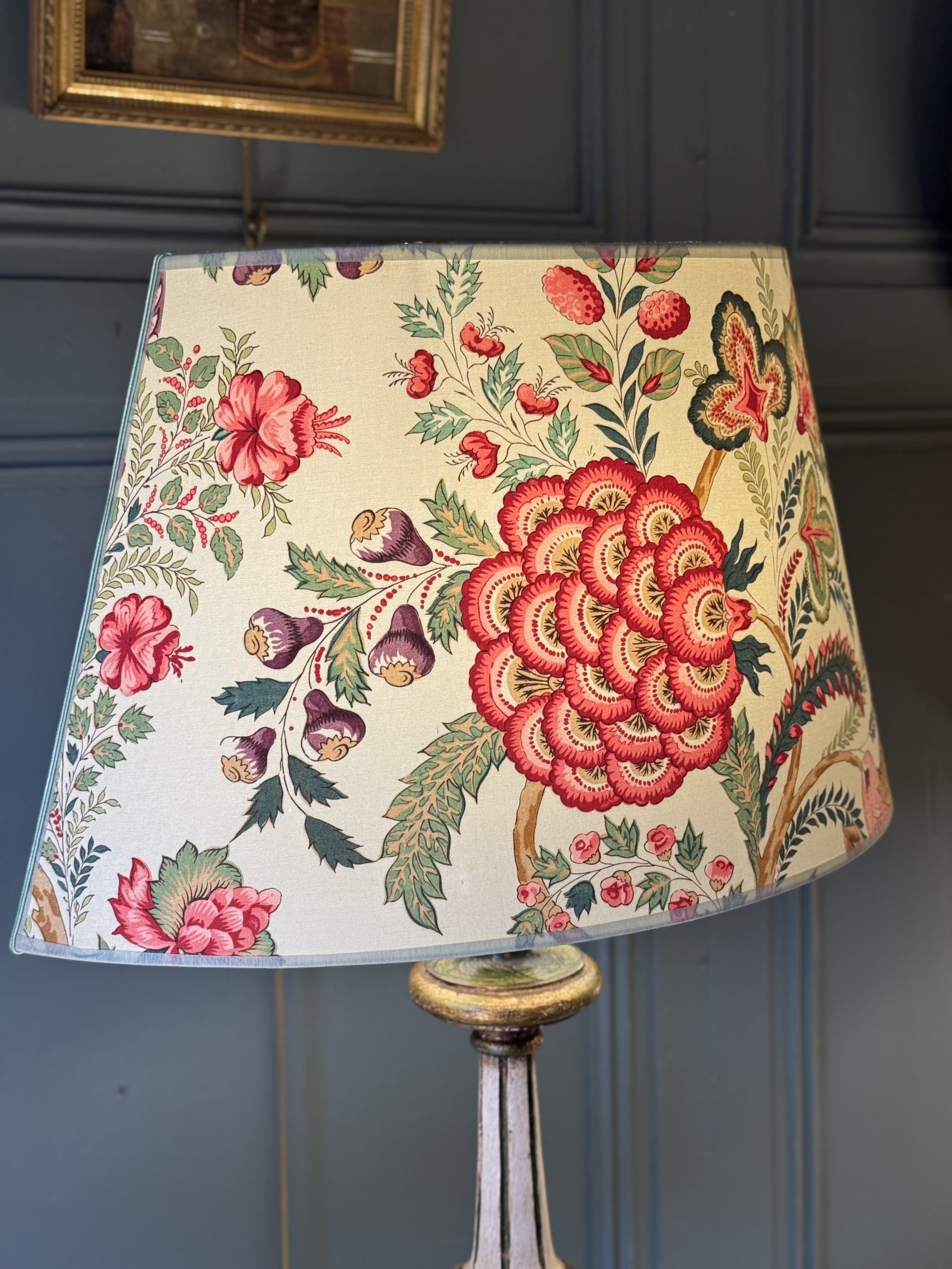 Its pointed oval lampshade was created from a Canova fabric with floral decoration on a pale green background.