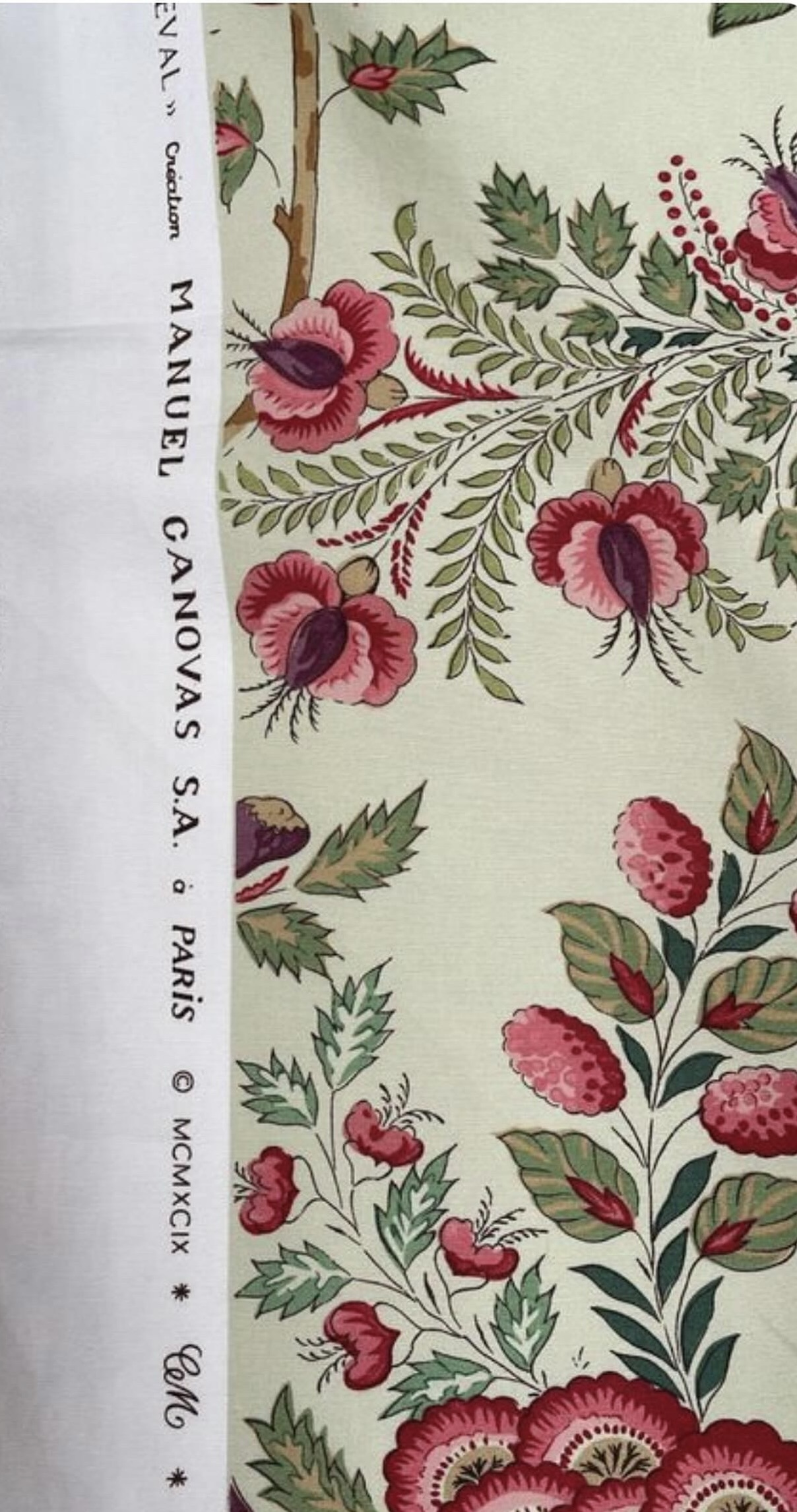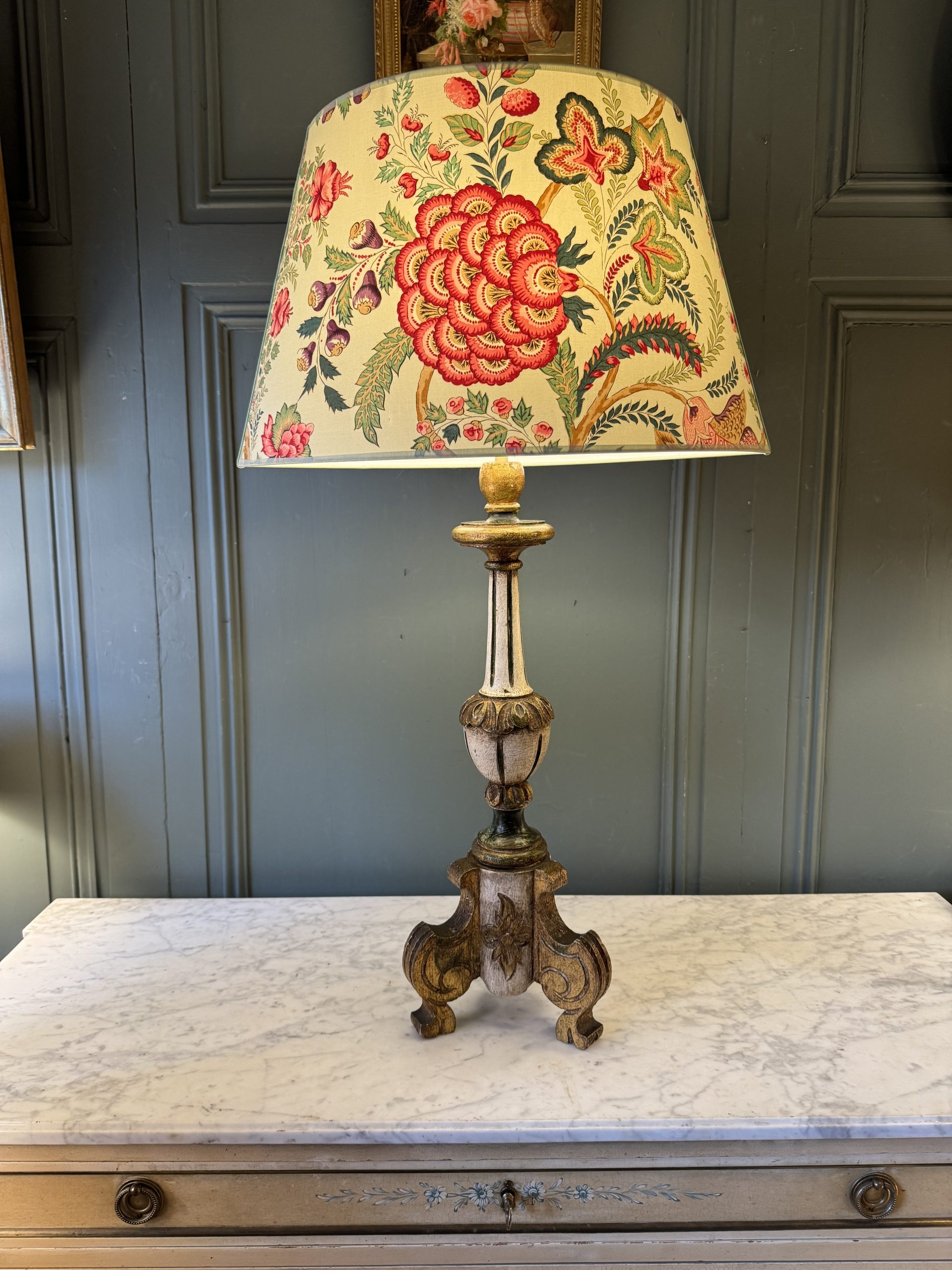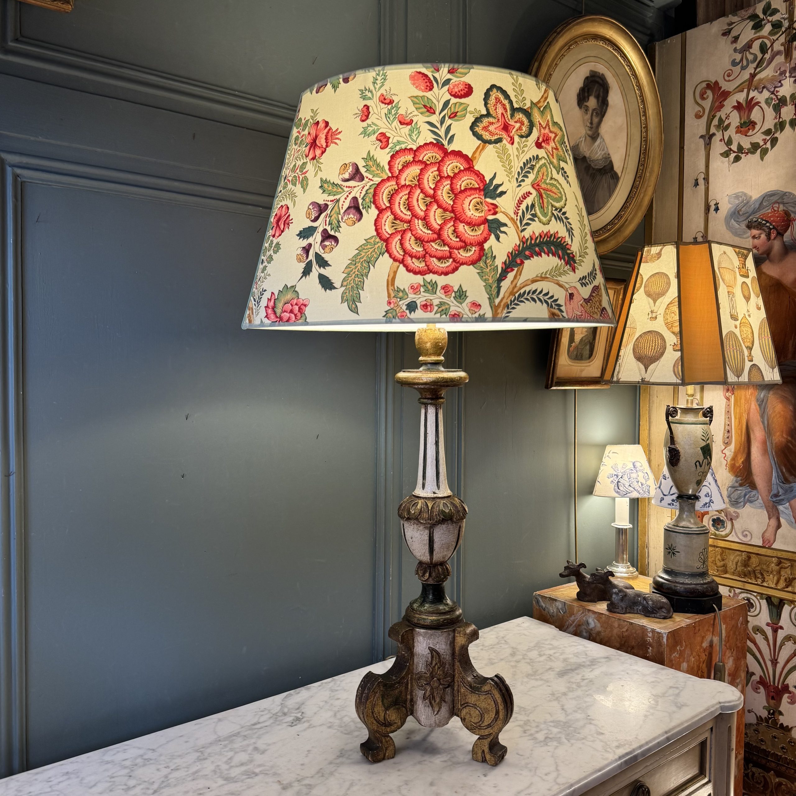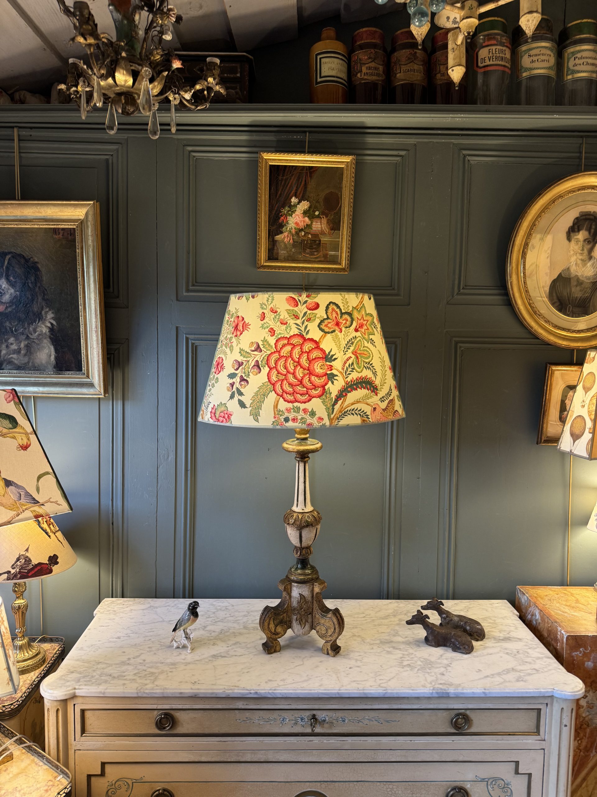 Its pointed oval lampshade was created from a Canova fabric with floral decoration on a pale green background.