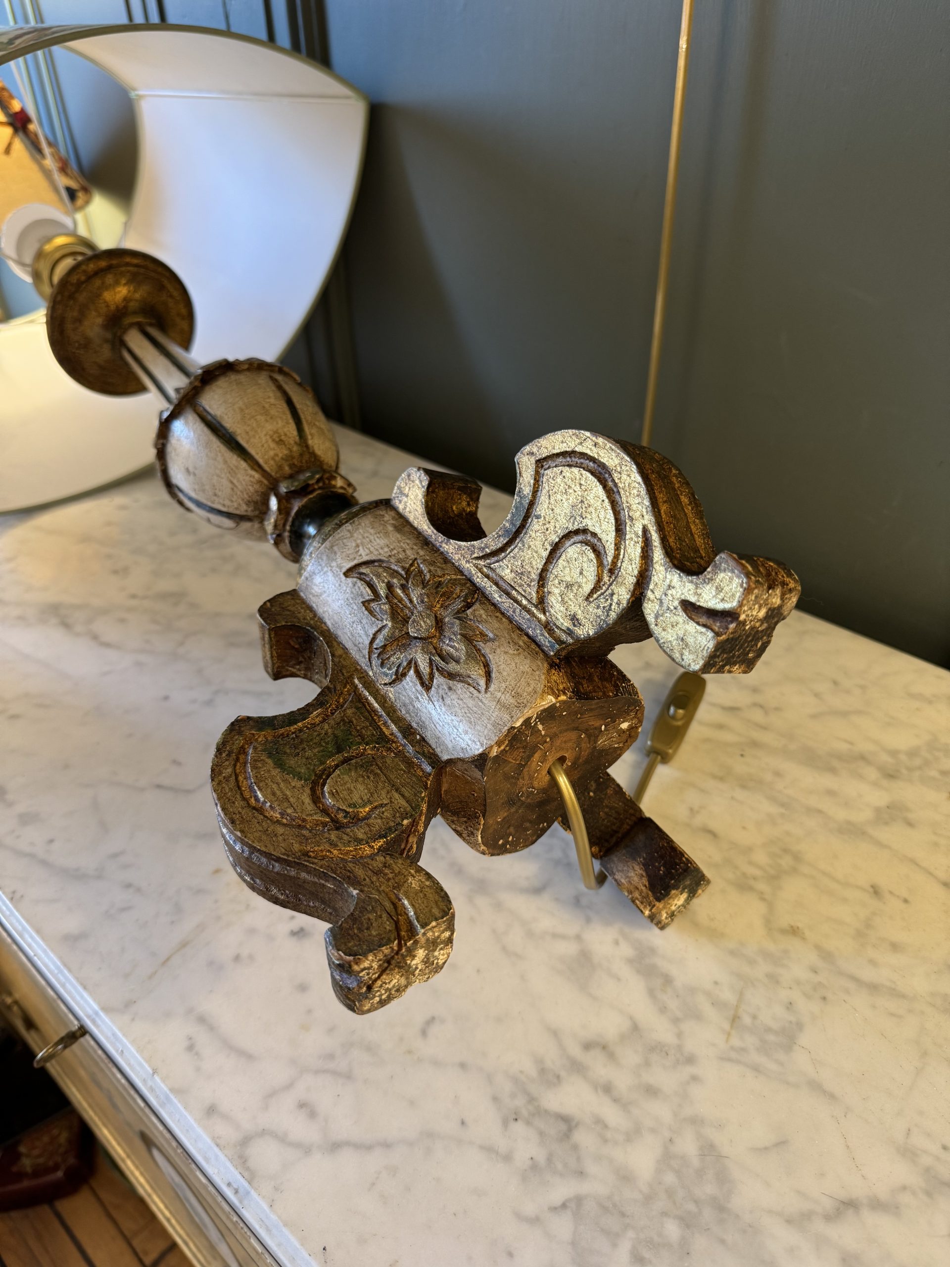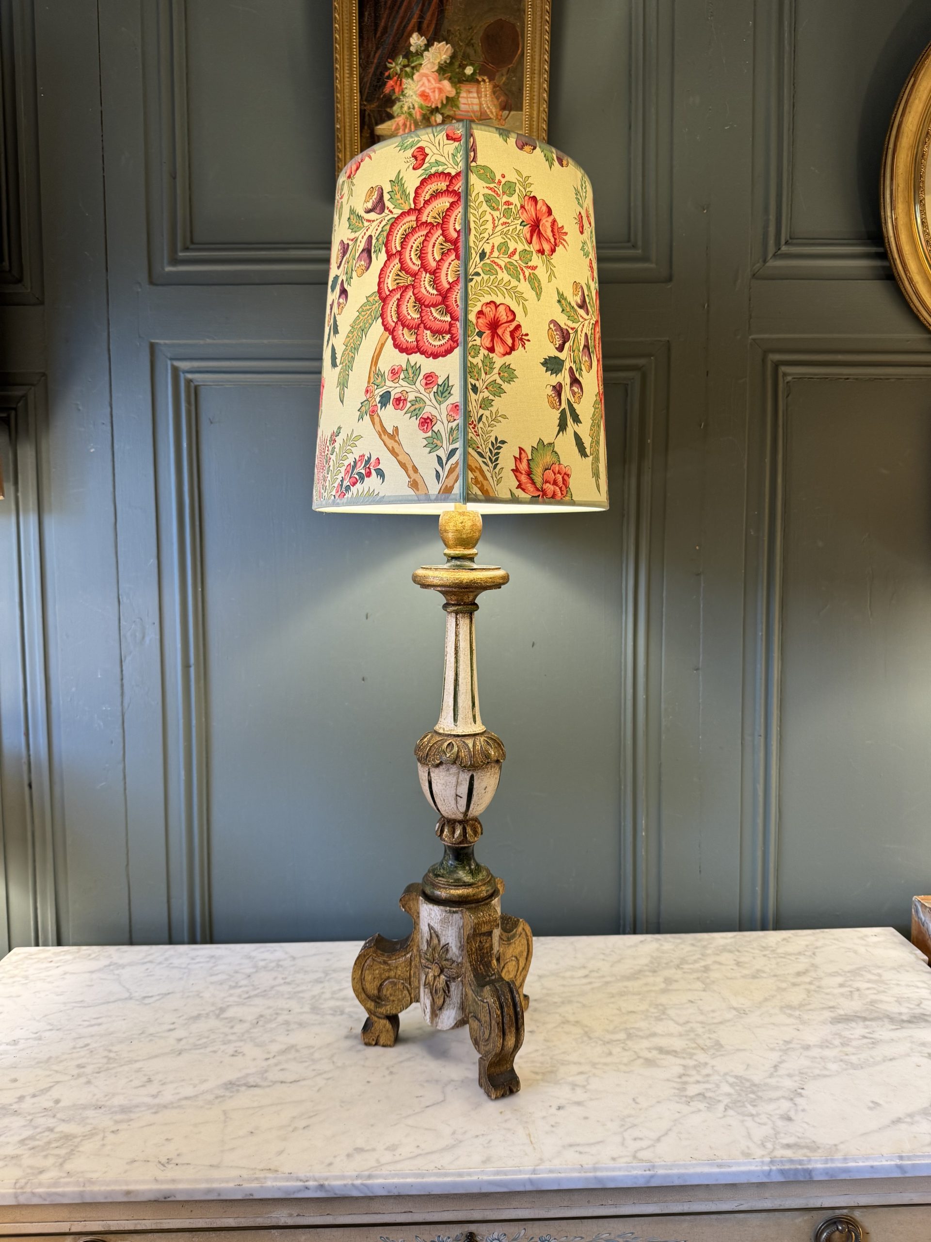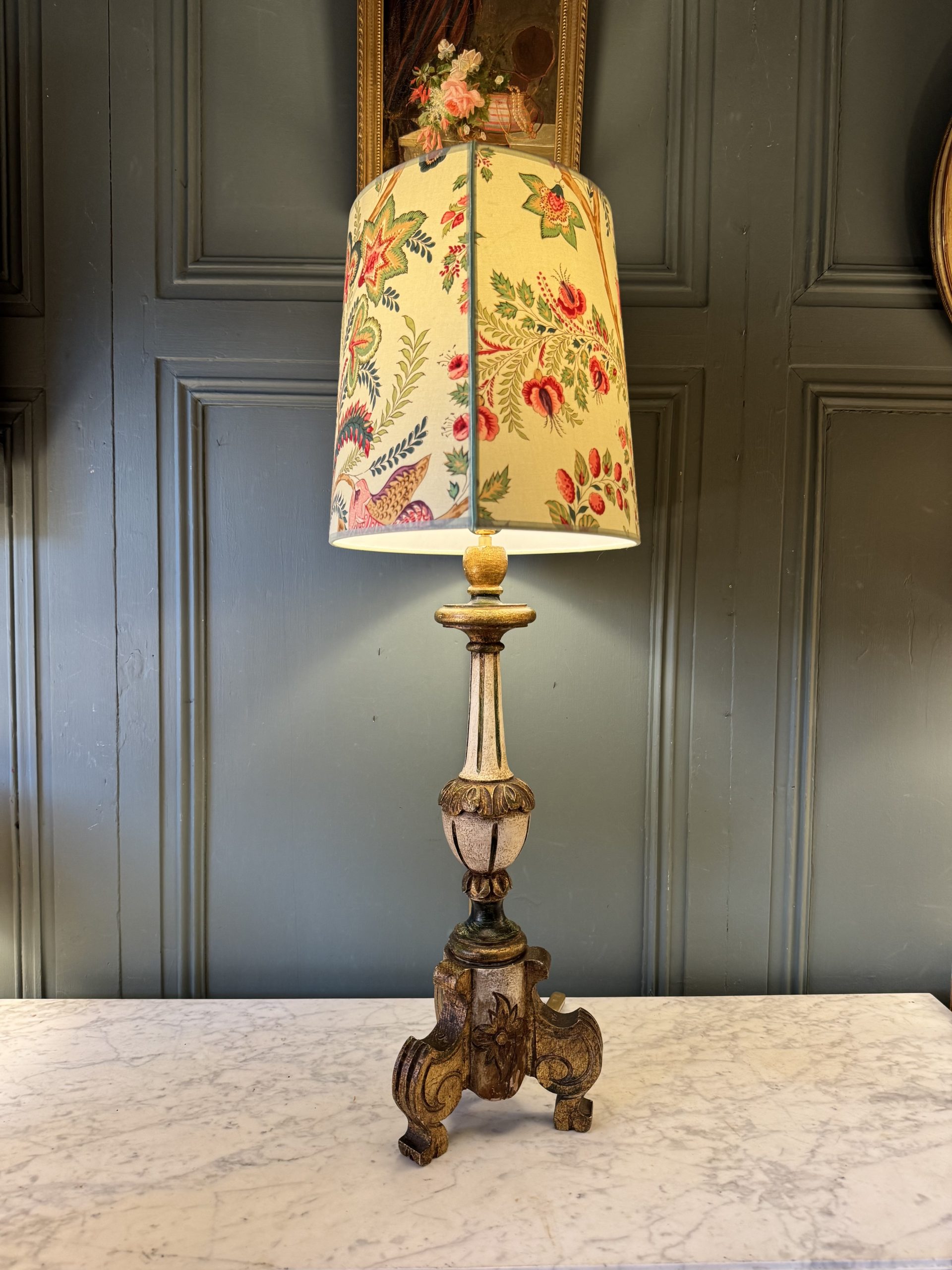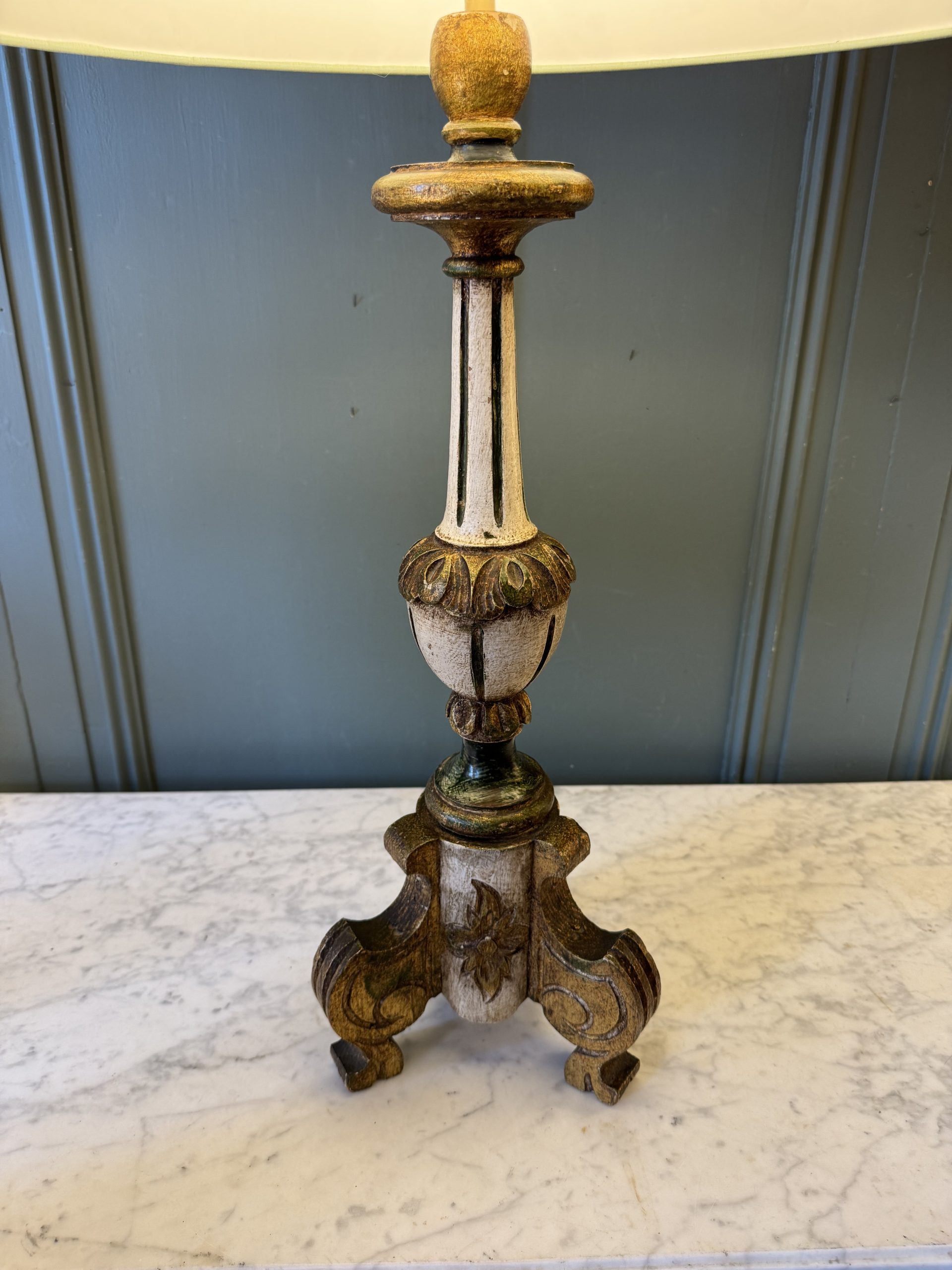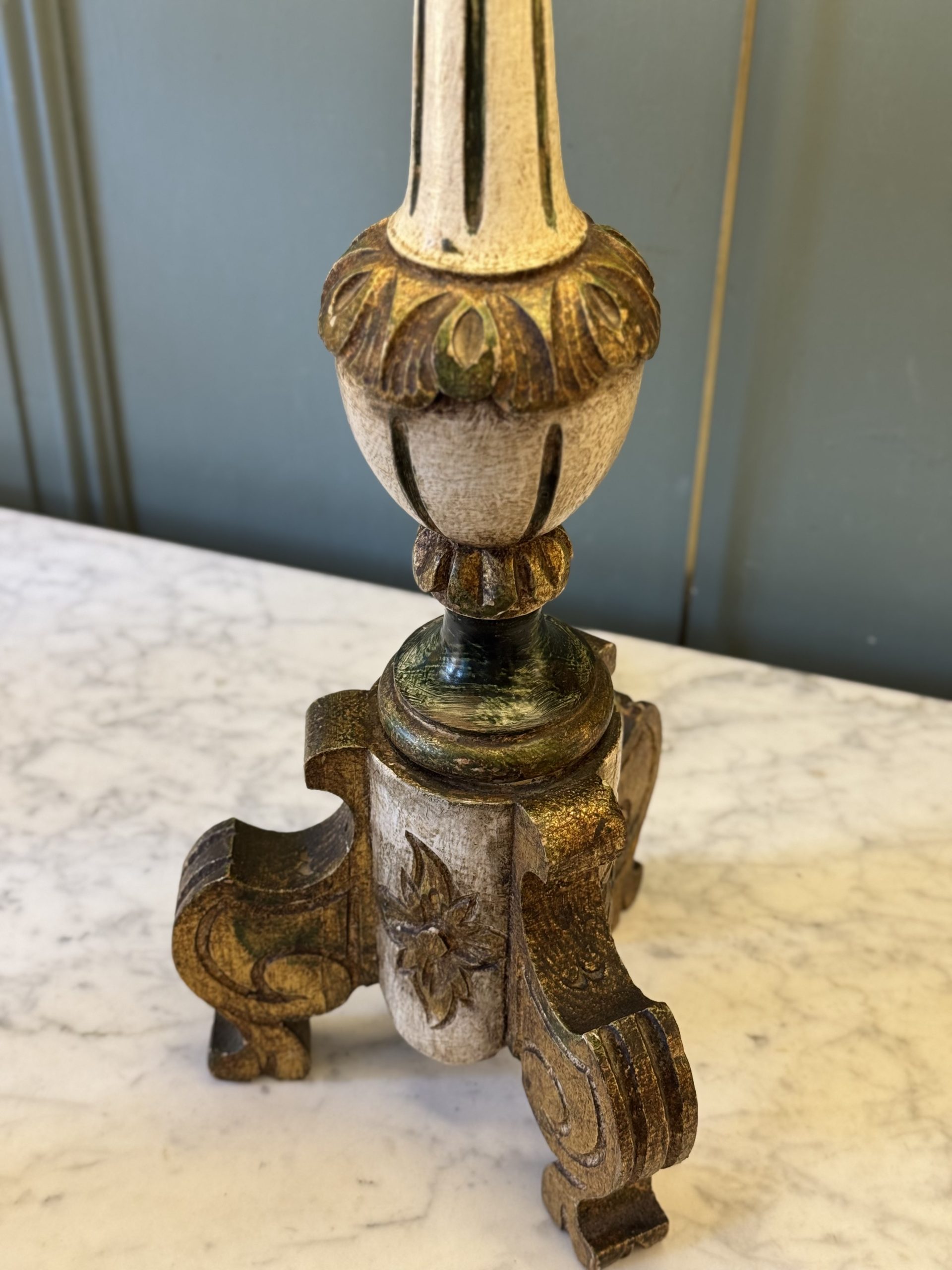Large tripod lamp in polychrome painted wood in green, off-white and gold, 20th century.
