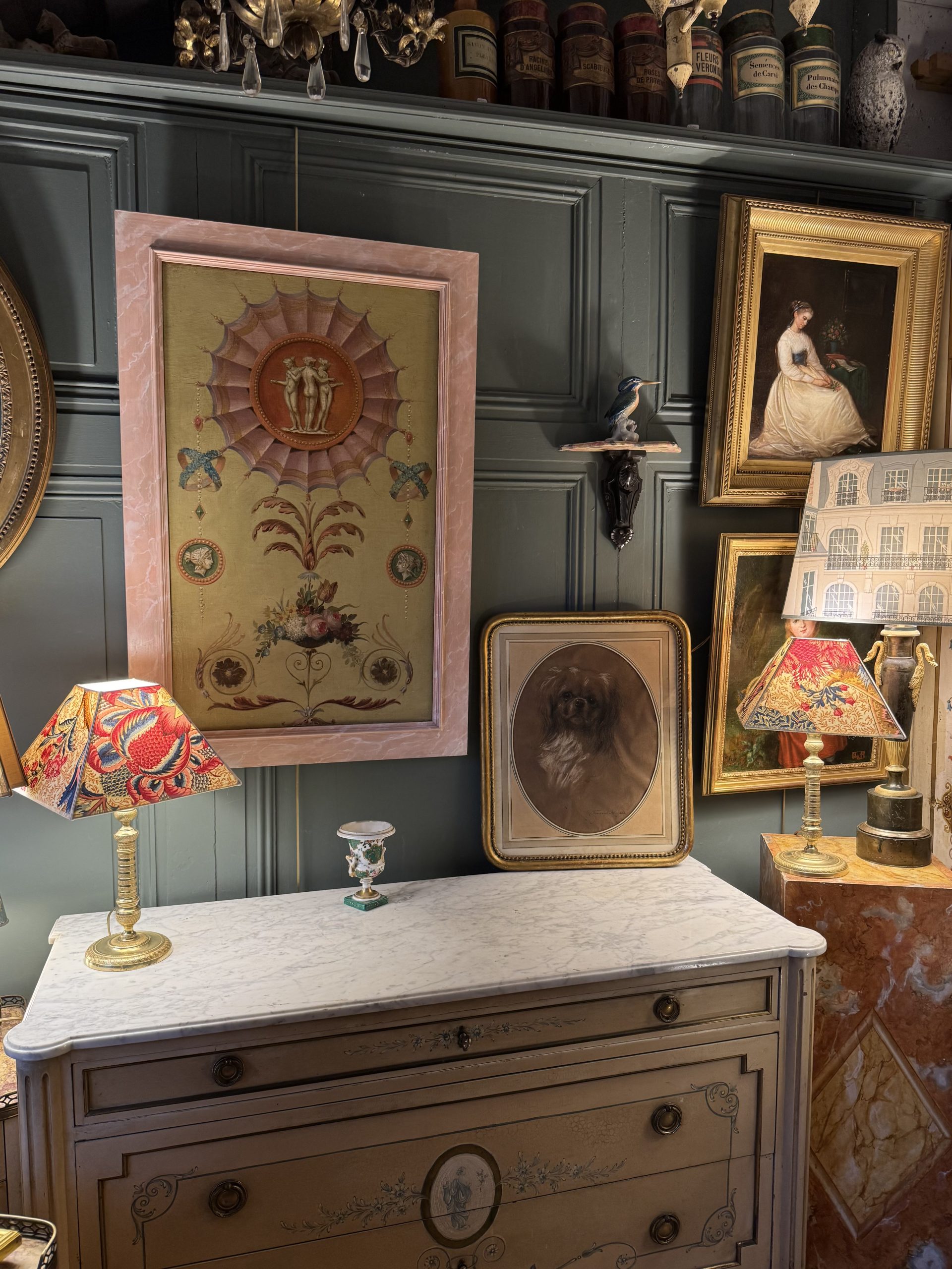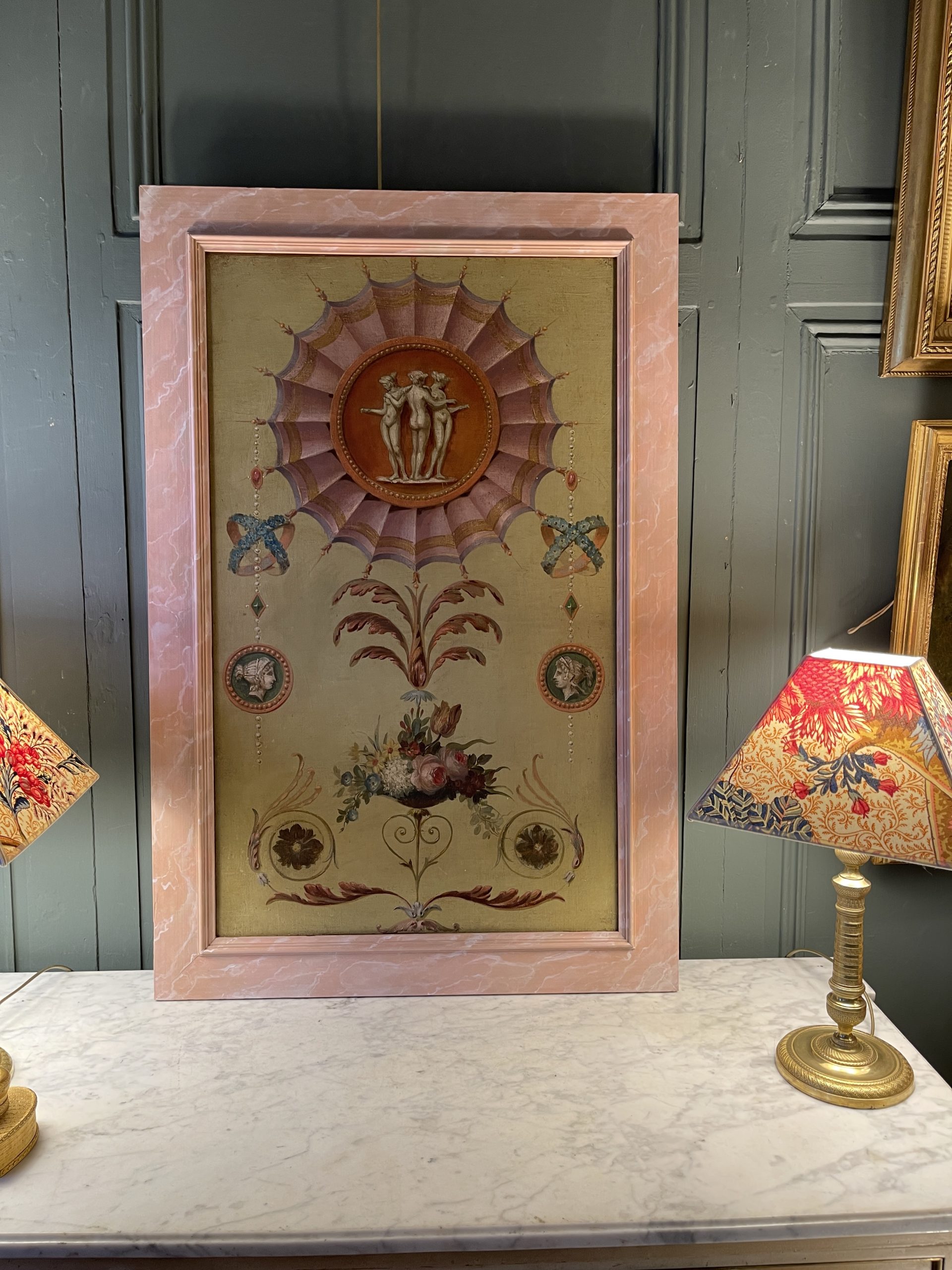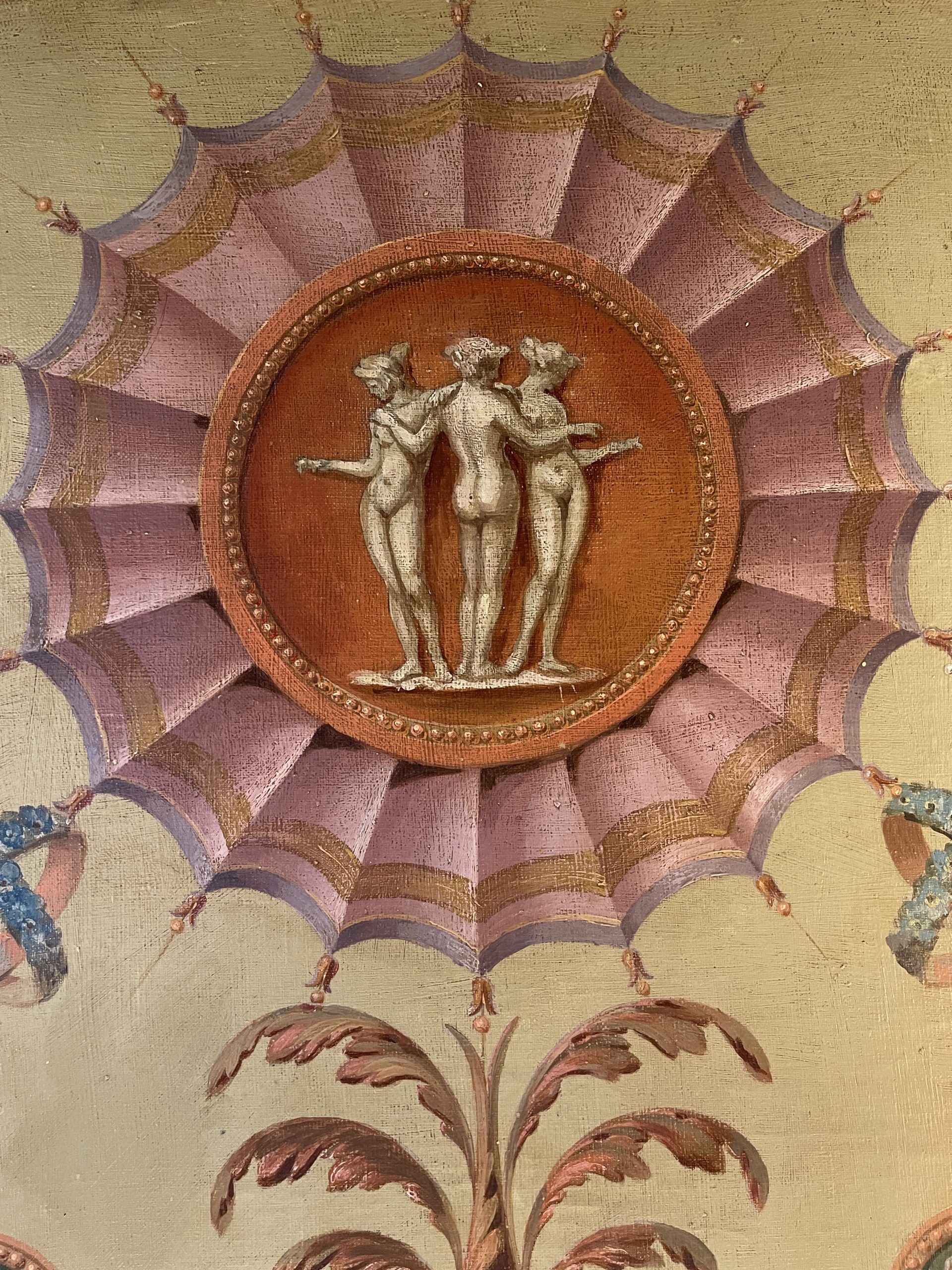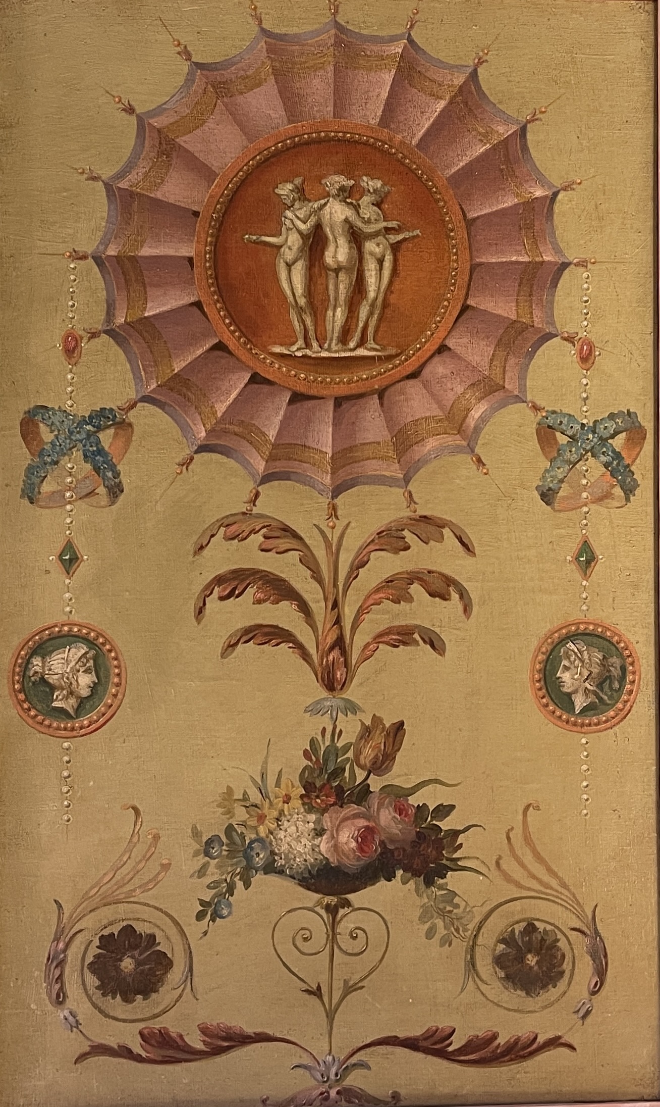 Louis XVI style decorative panel featuring the Three Graces, scrolling foliage, a bouquet of flowers, and cameos.