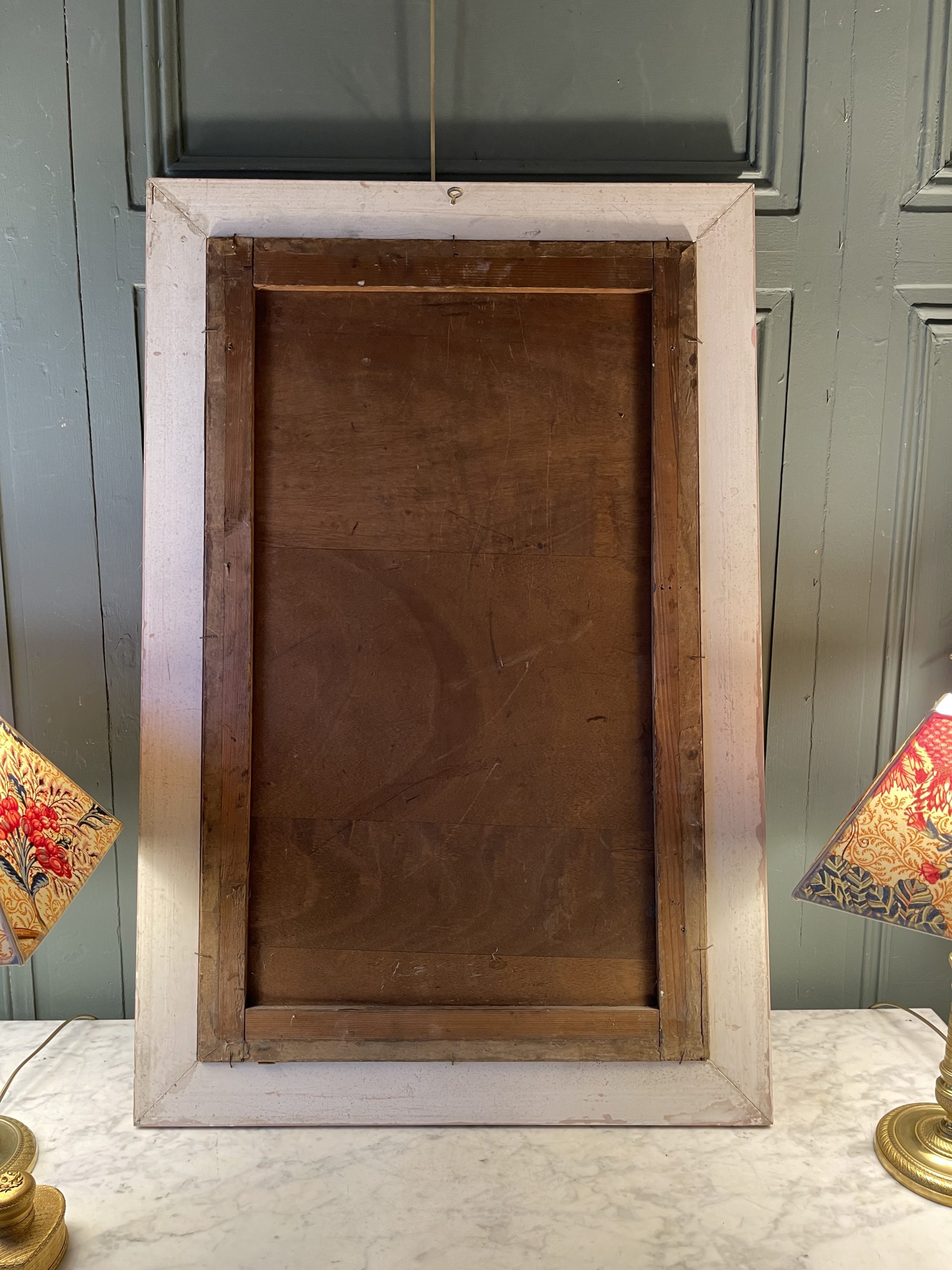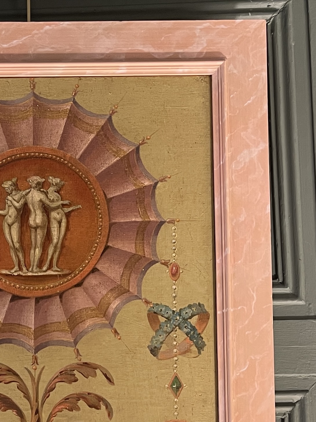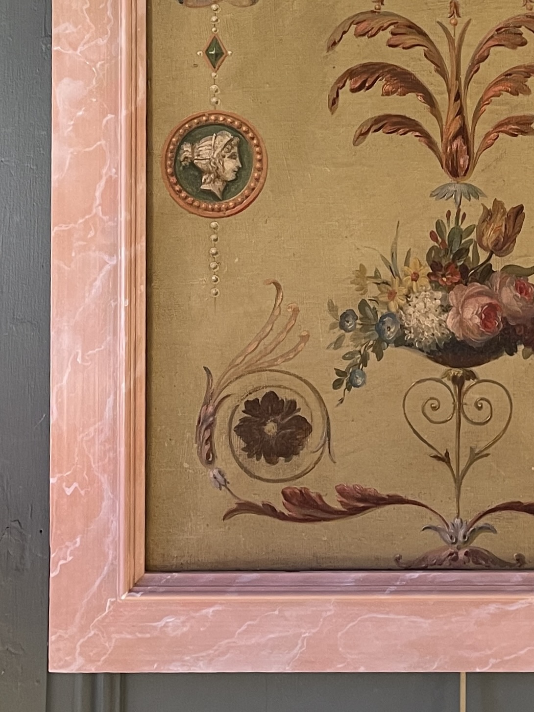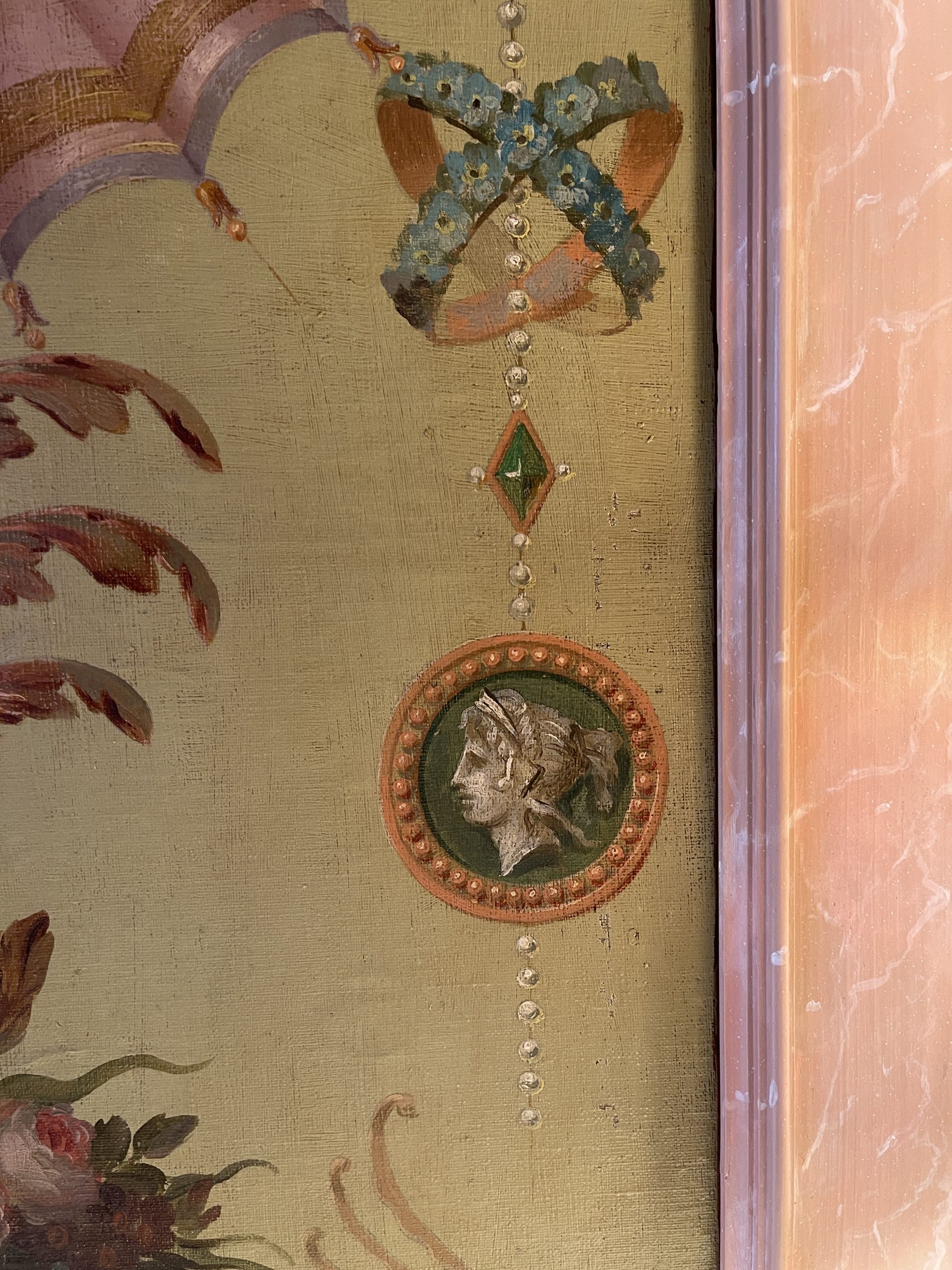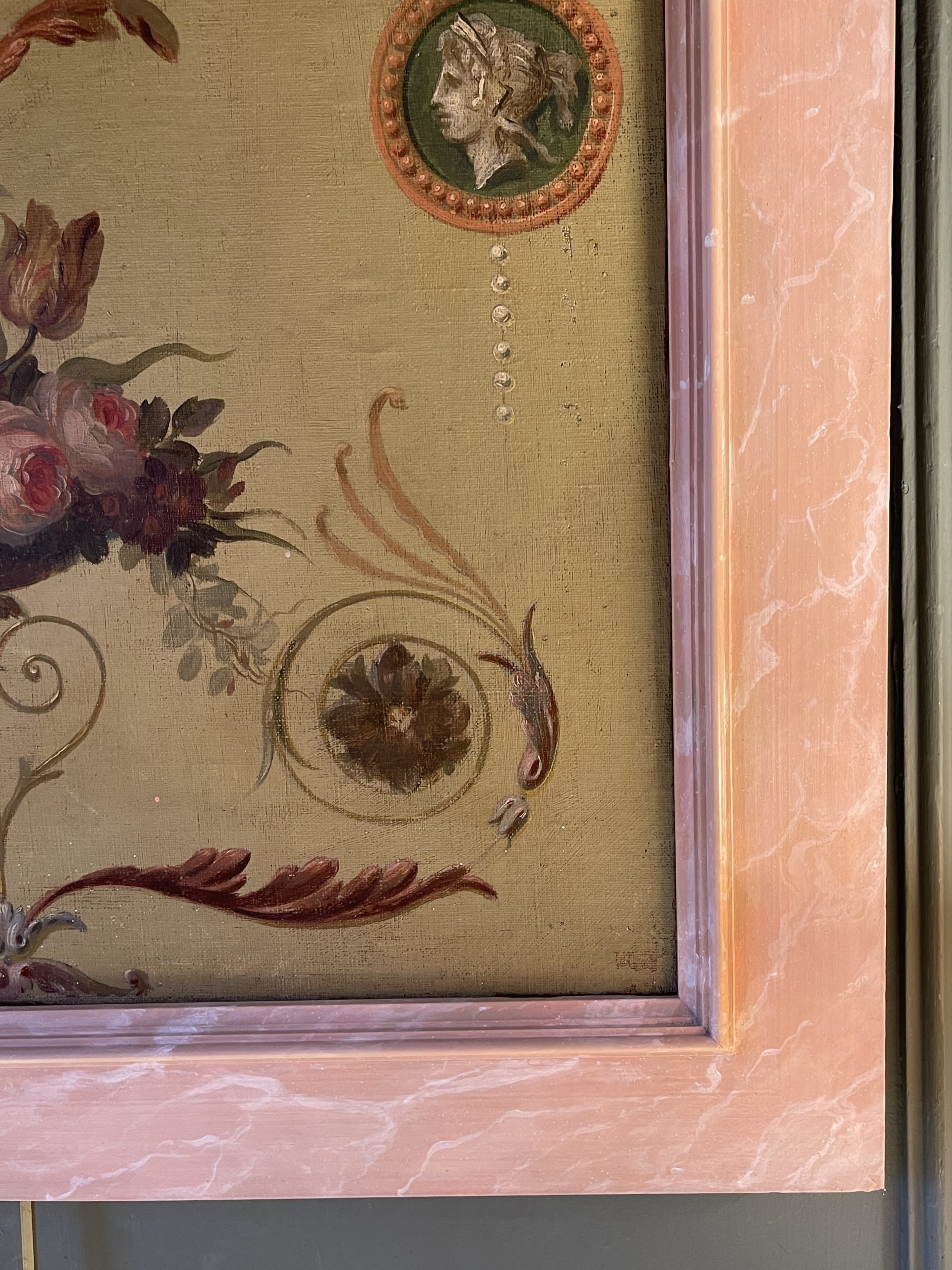 Framed in wood painted to imitate pink marble.