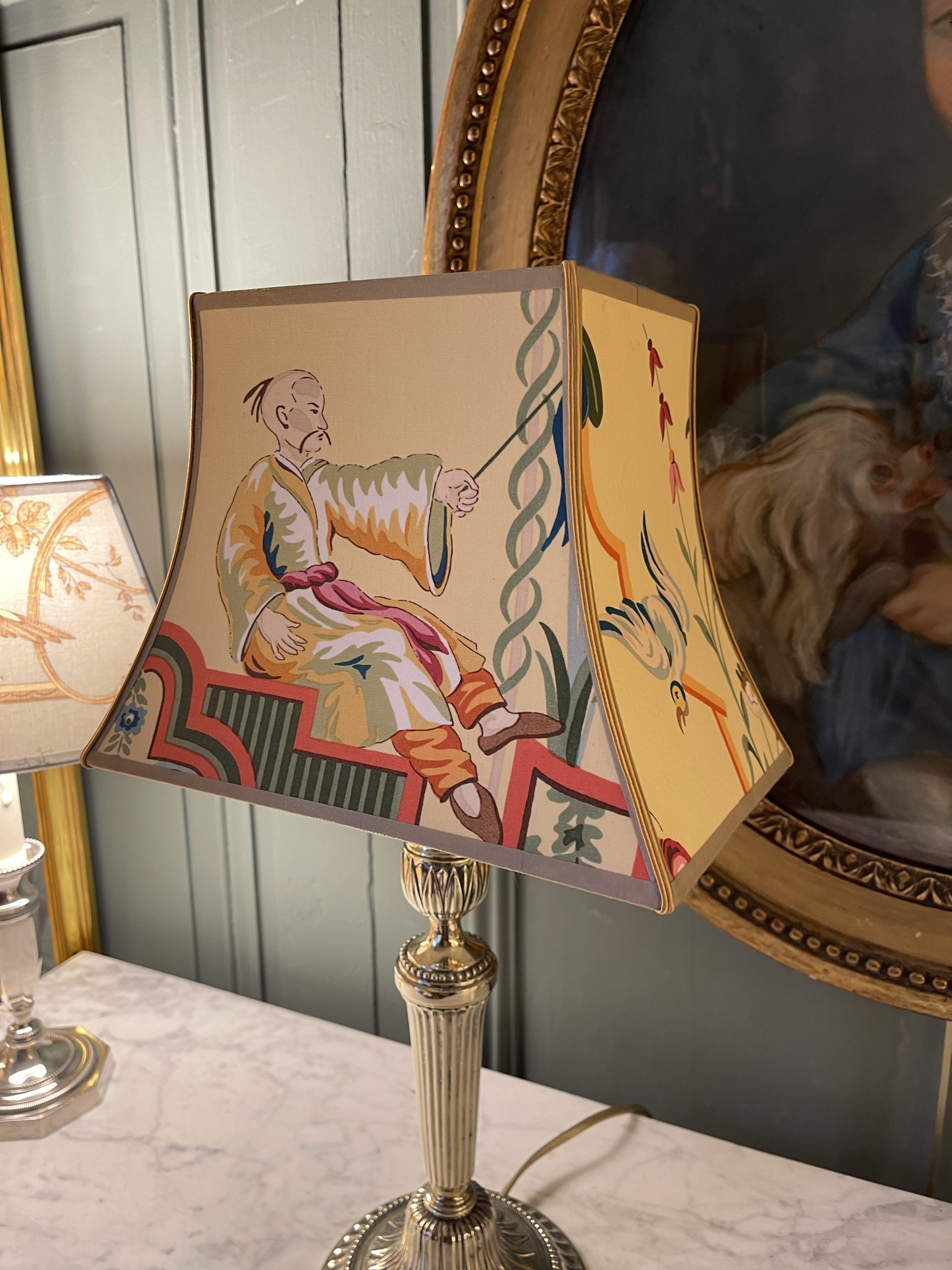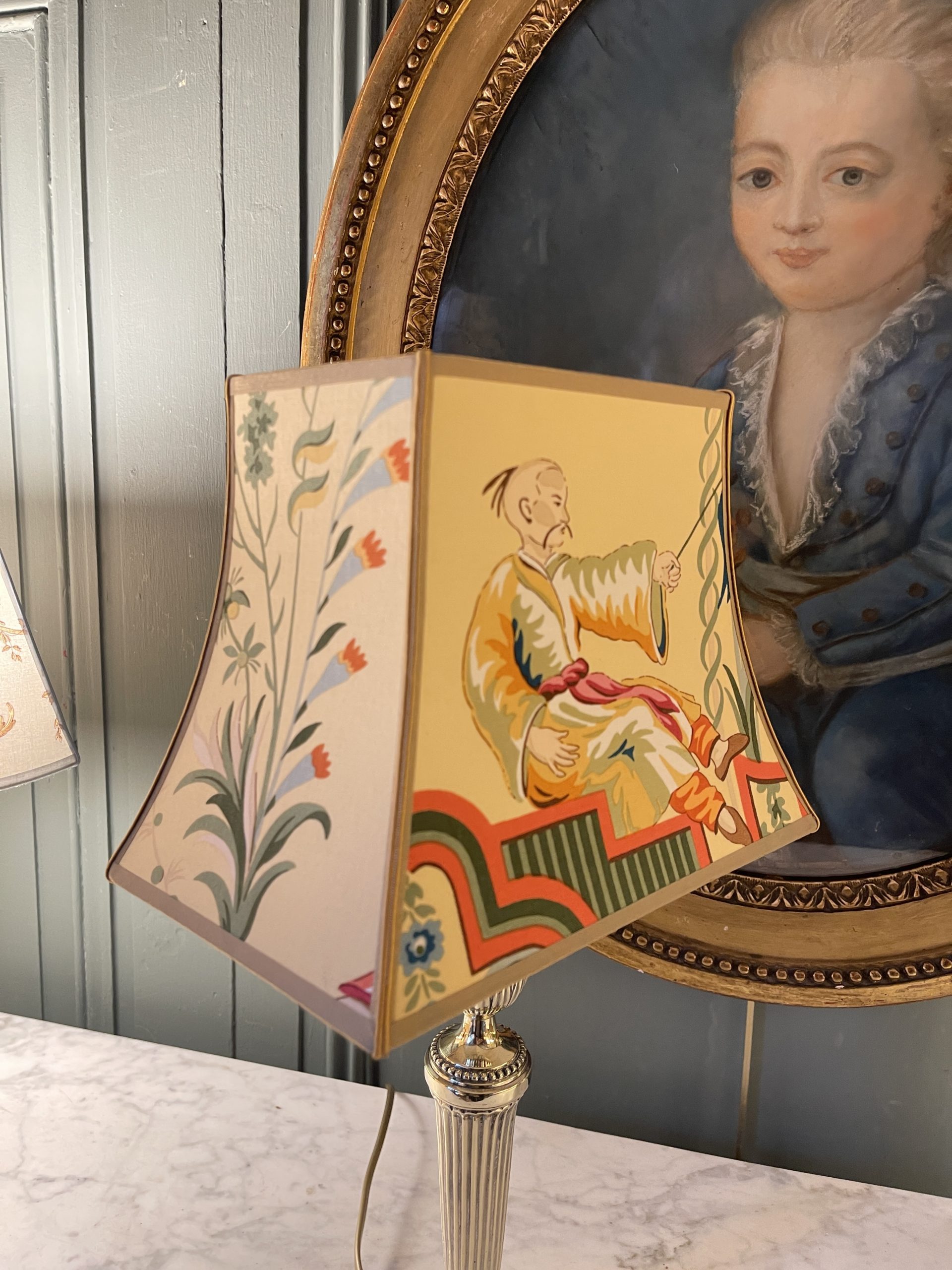 Its pagoda-style lampshade was created from a Brunschwig & Fils River Song fabric with Asian figures.