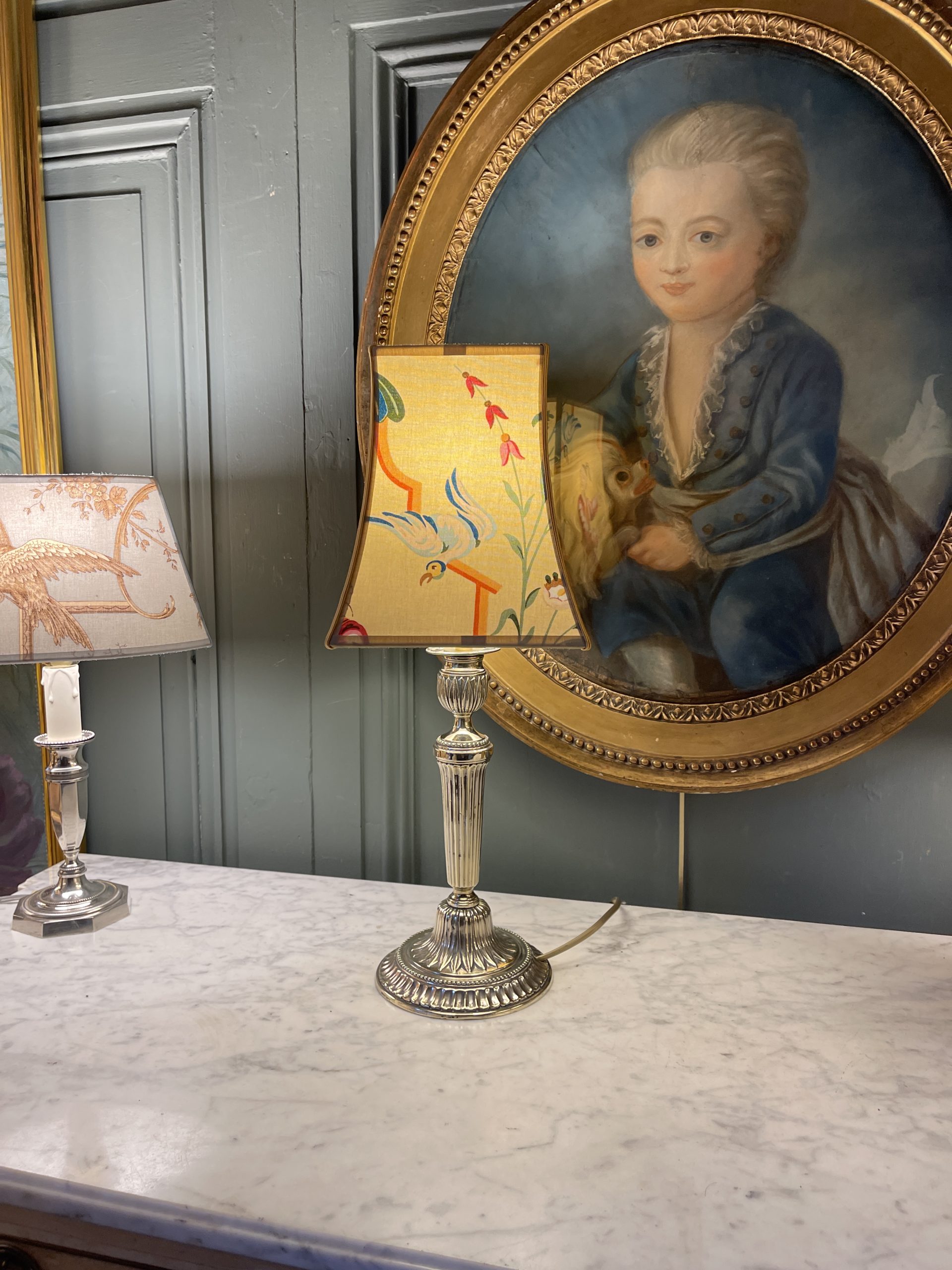 Dimensions: Total height: 46 cm / Height of candlestick: 26 cm / Base: 13.5 cm / Lampshade dimensions: 25 cm x 16 cm.
