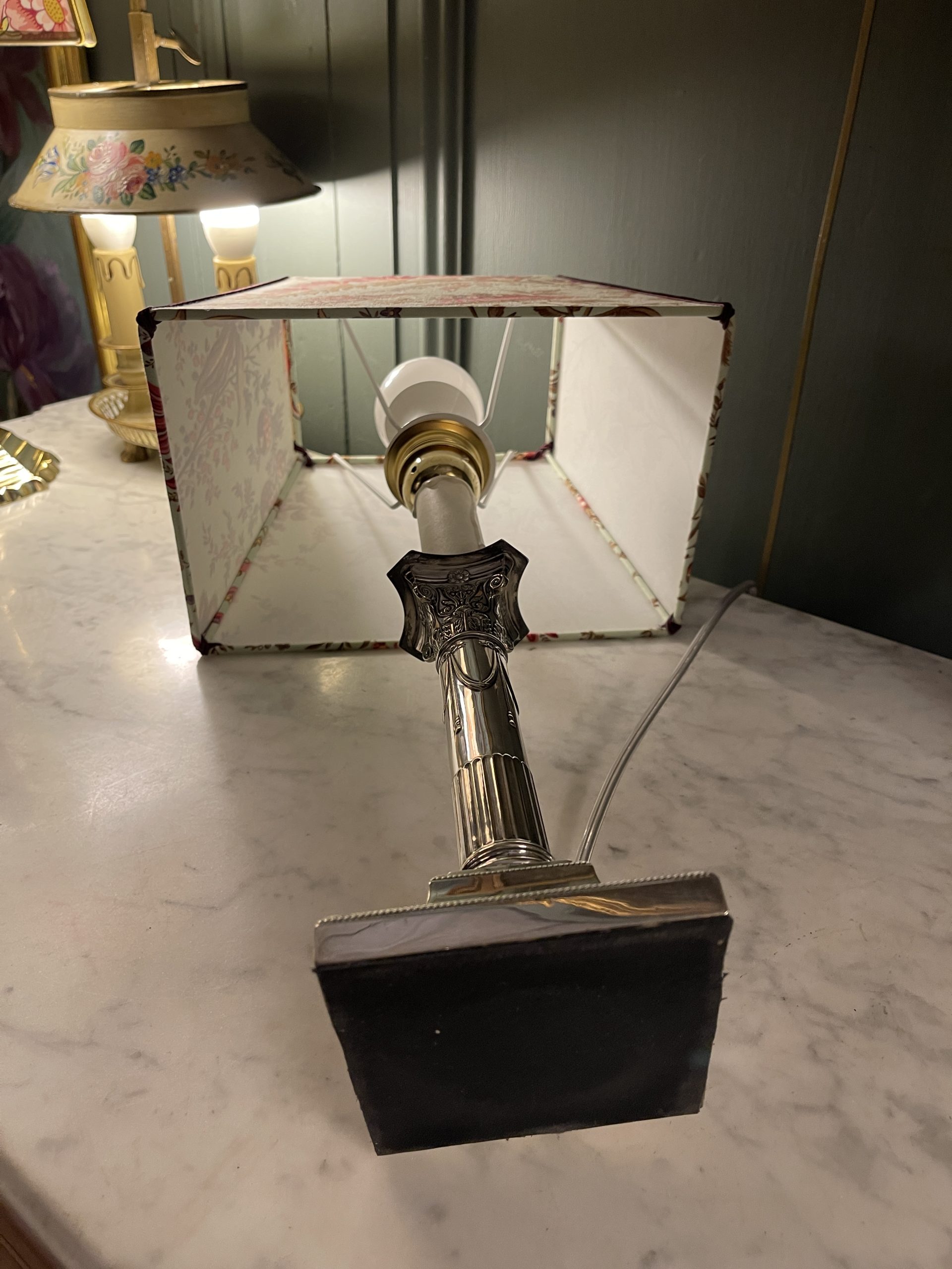 The rectangular lampshades were created from a floral fabric on a celadon green background.
