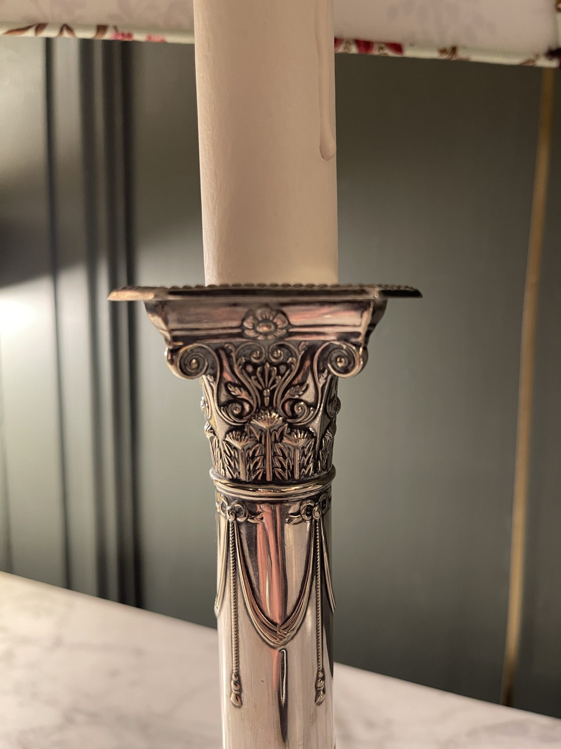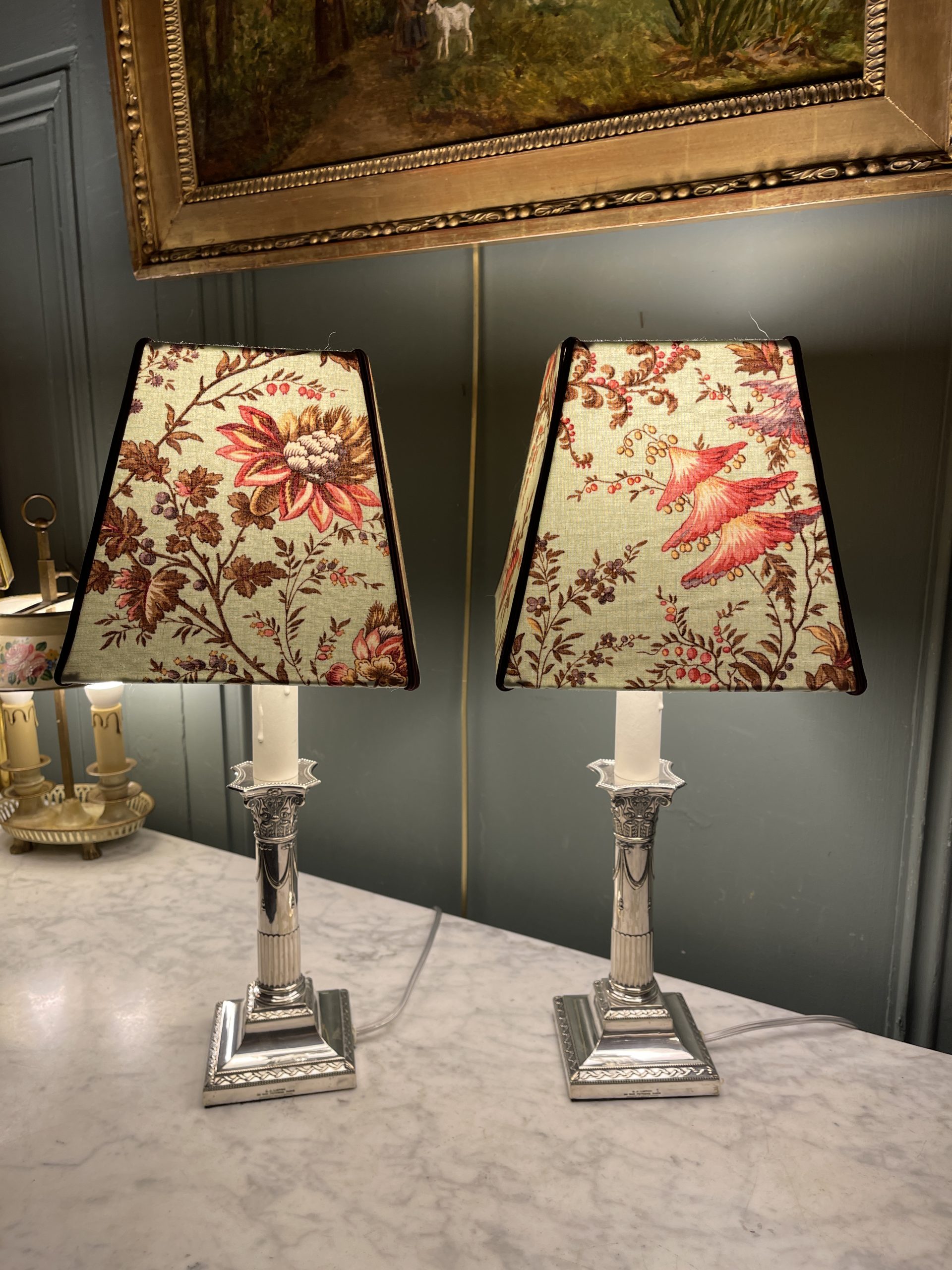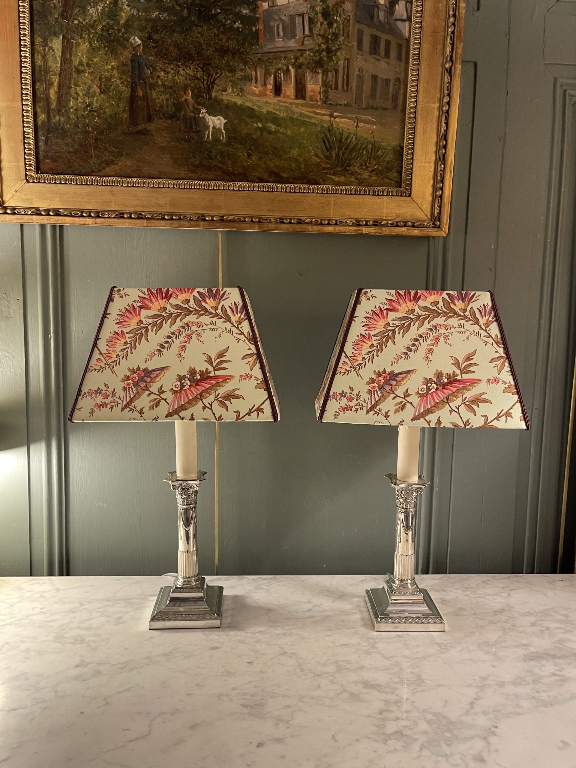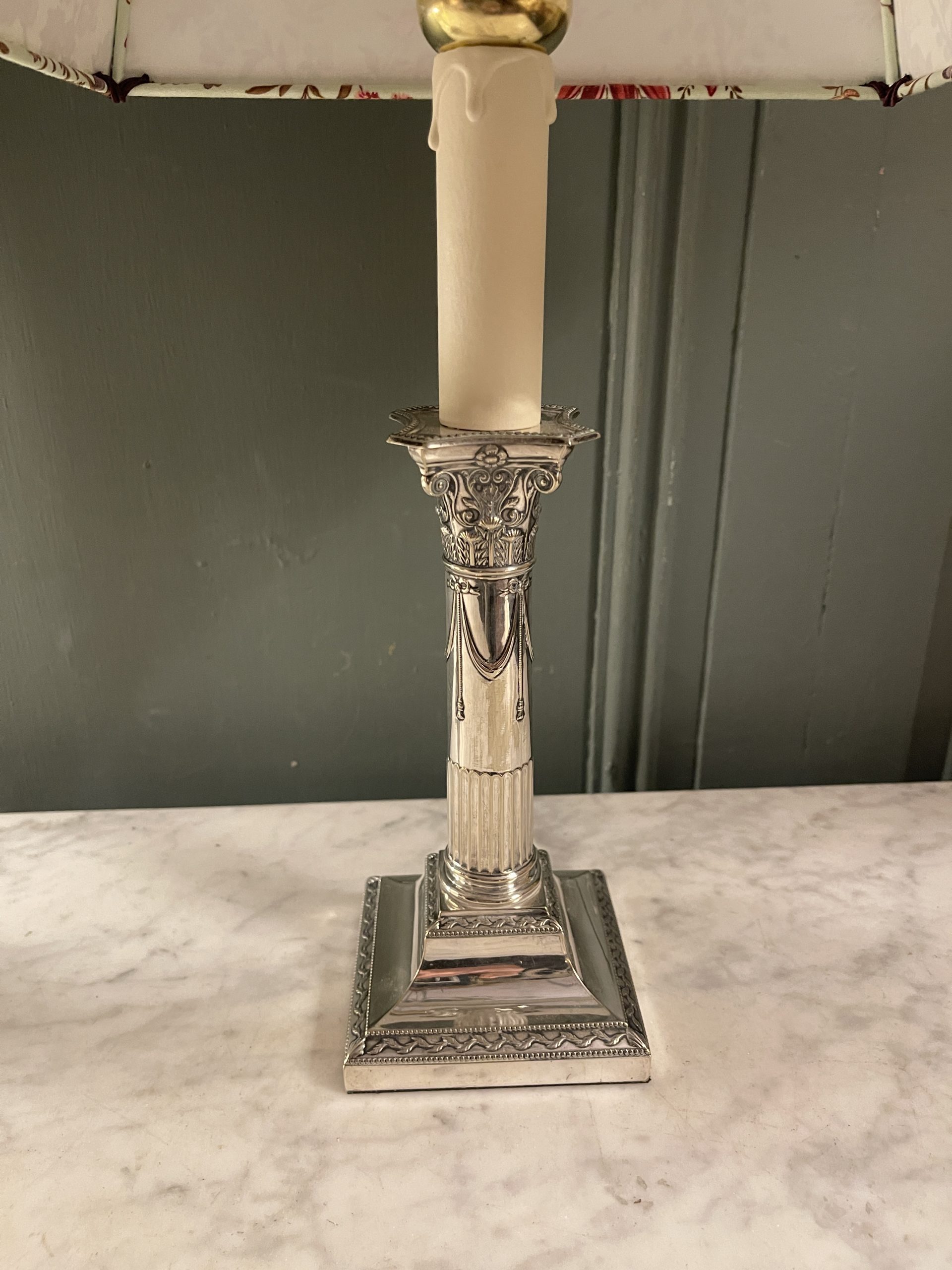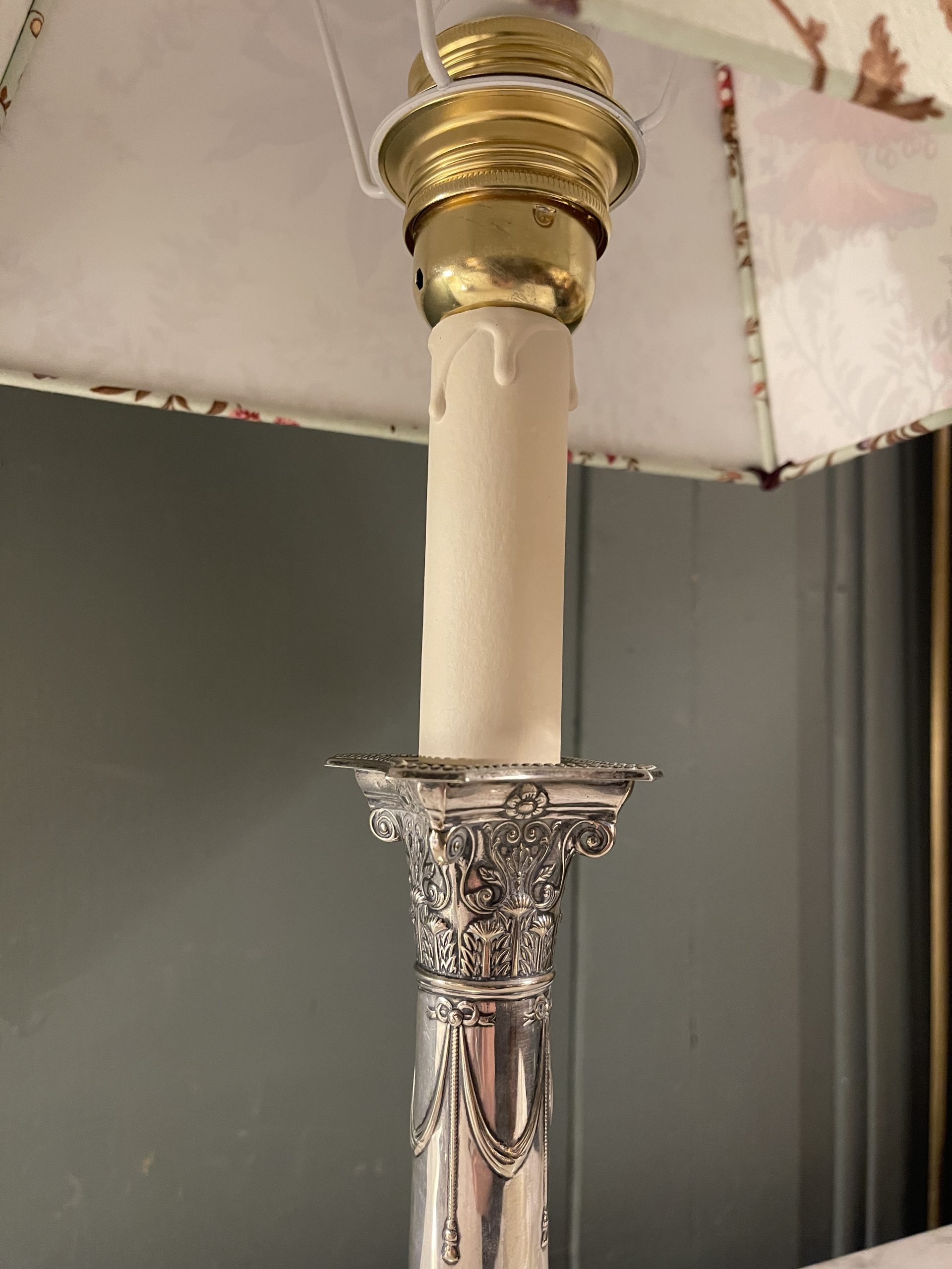 Pair of silver-plated metal candlesticks mounted as Louis XVI style lamps, 20th century.