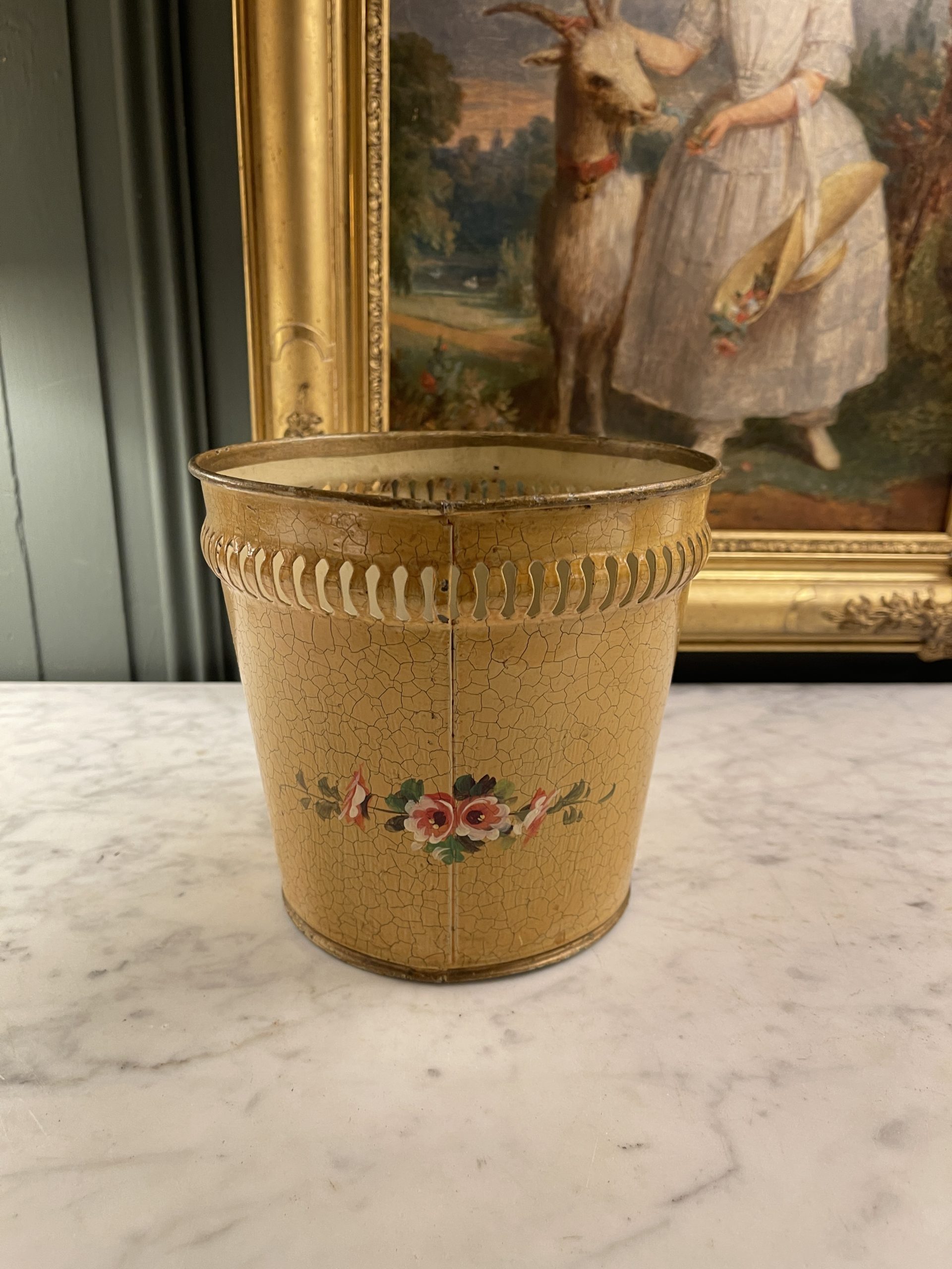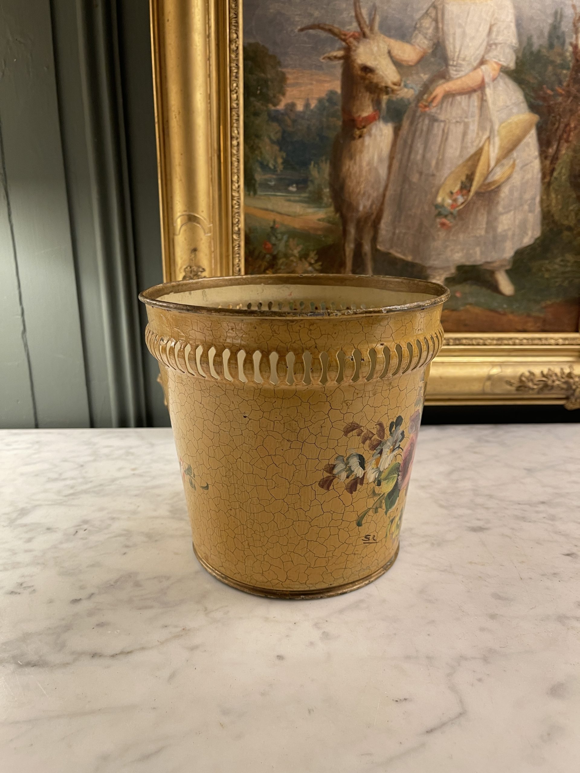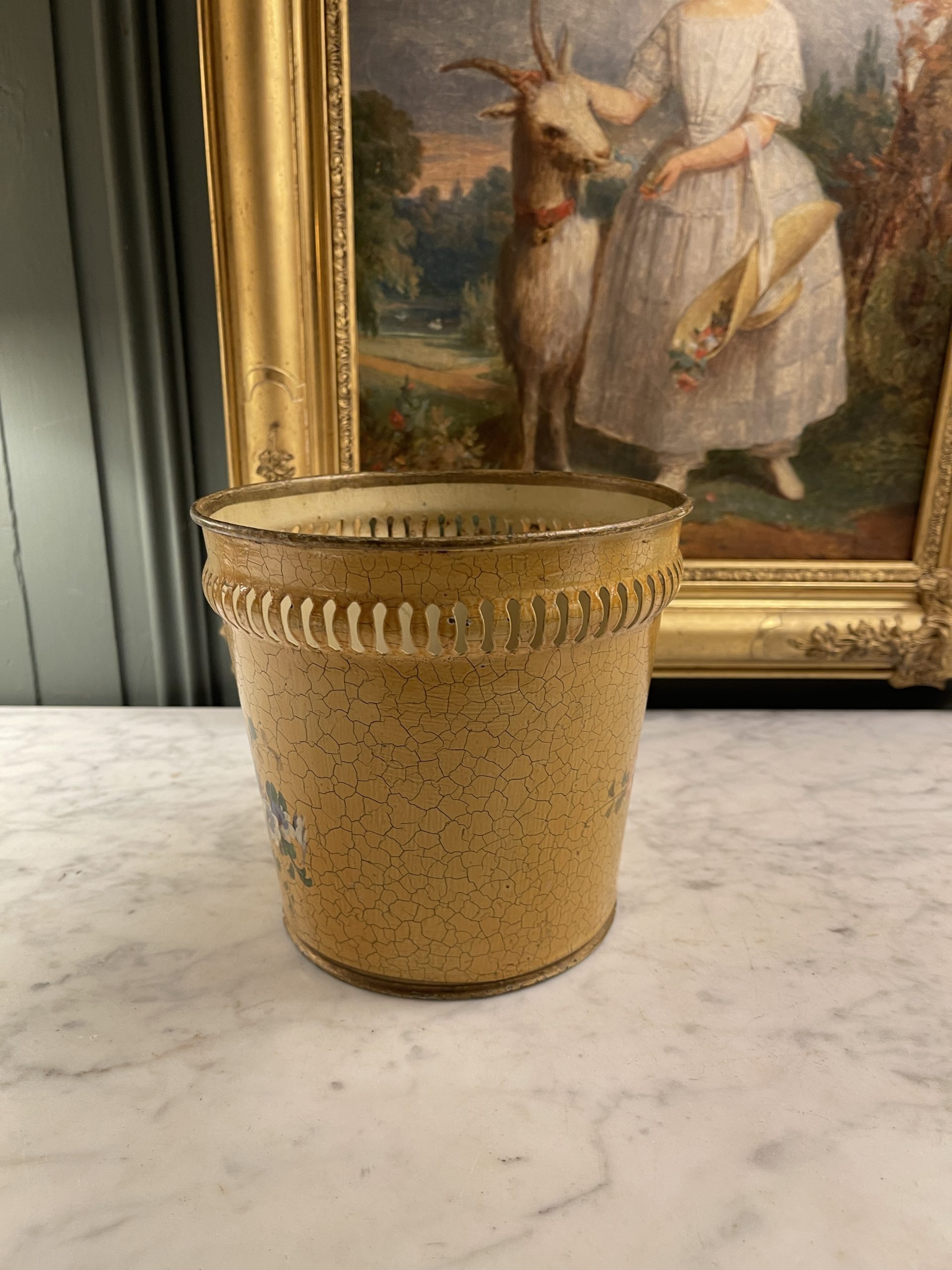 A 20th-century painted metal cachepot or basket with a floral design on a crackled yellow background.