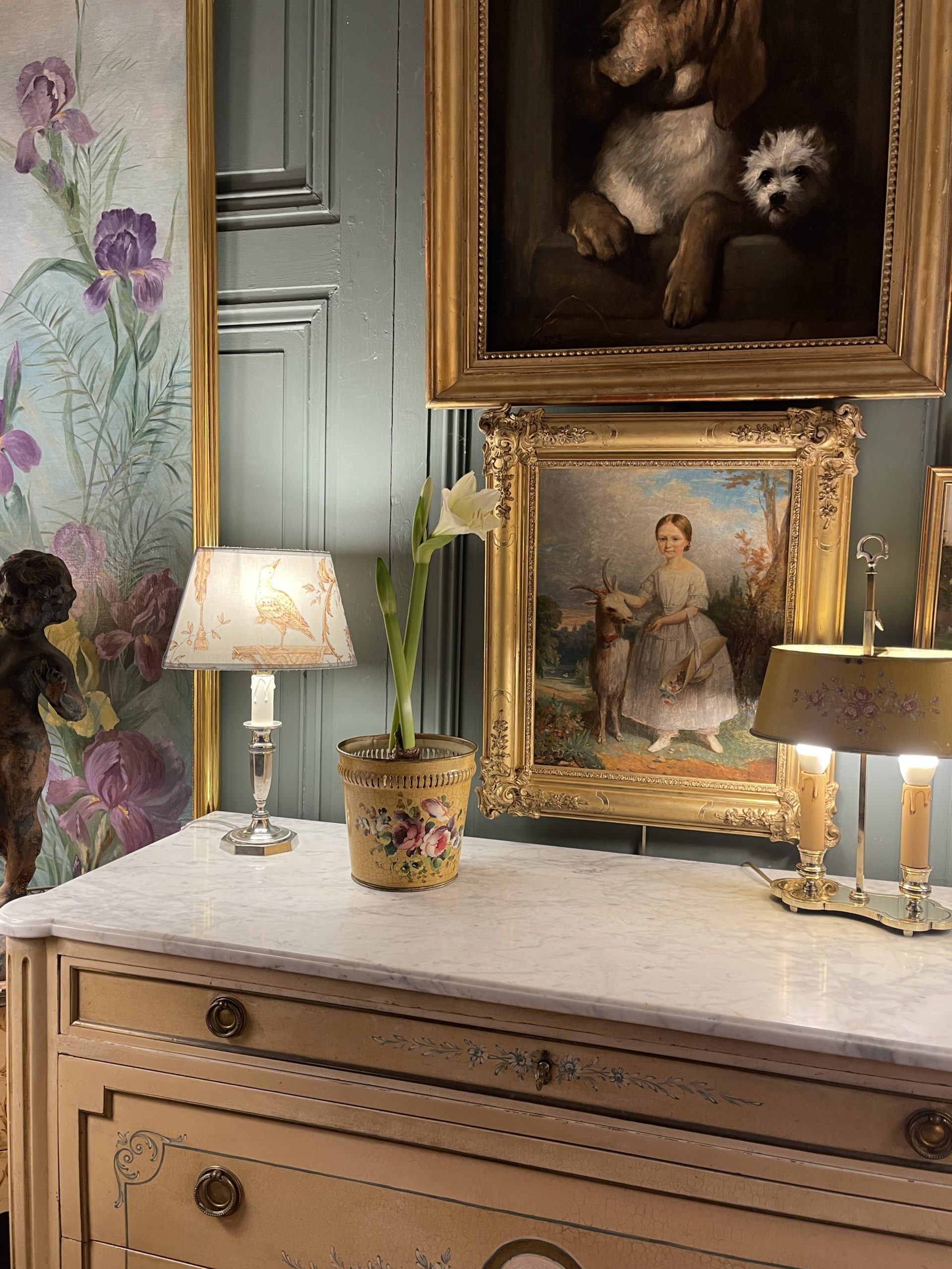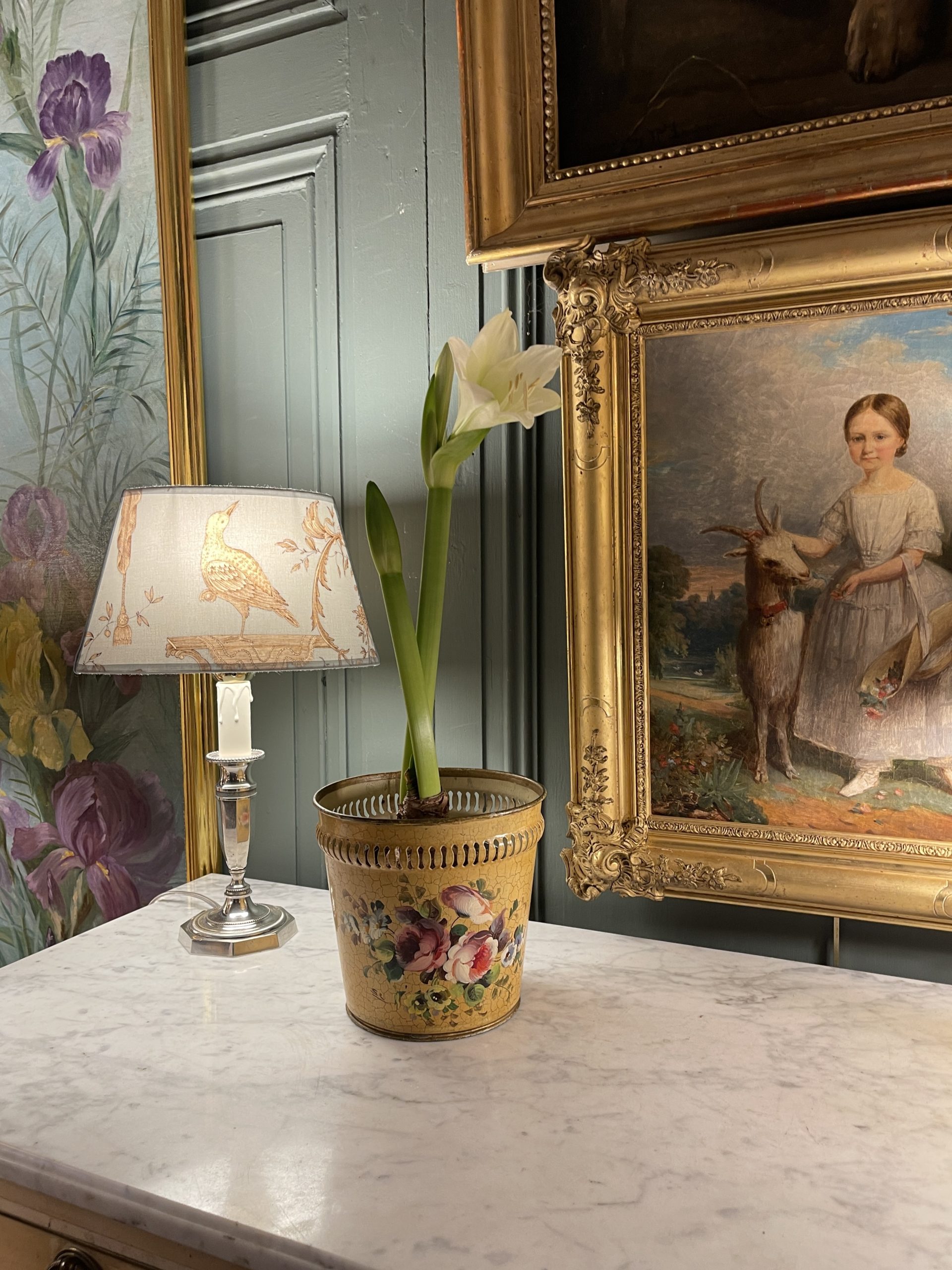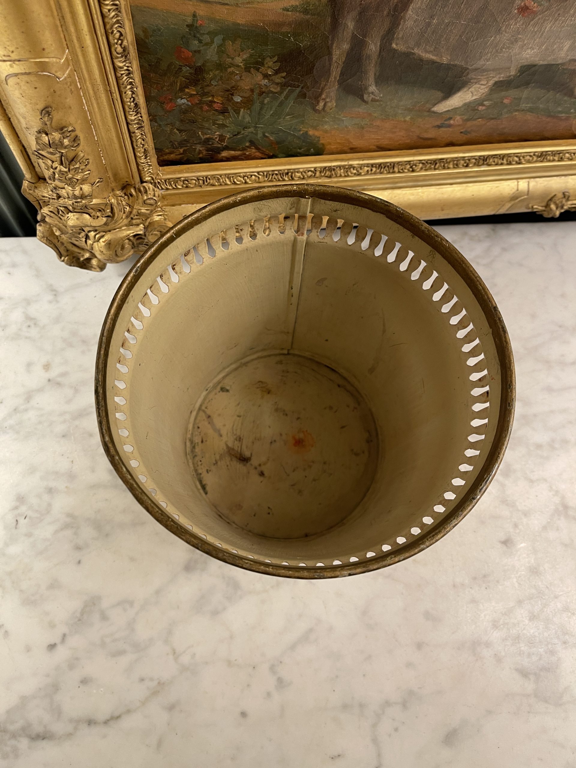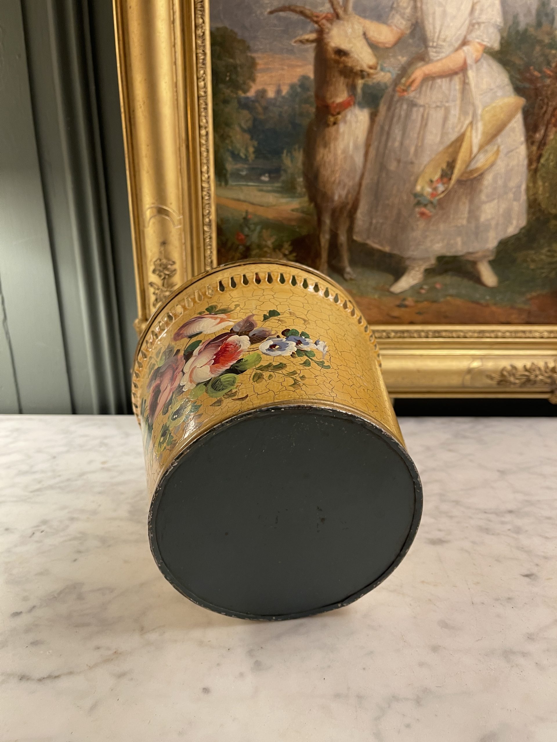 A 20th-century painted metal cachepot or basket with a floral design on a crackled yellow background.