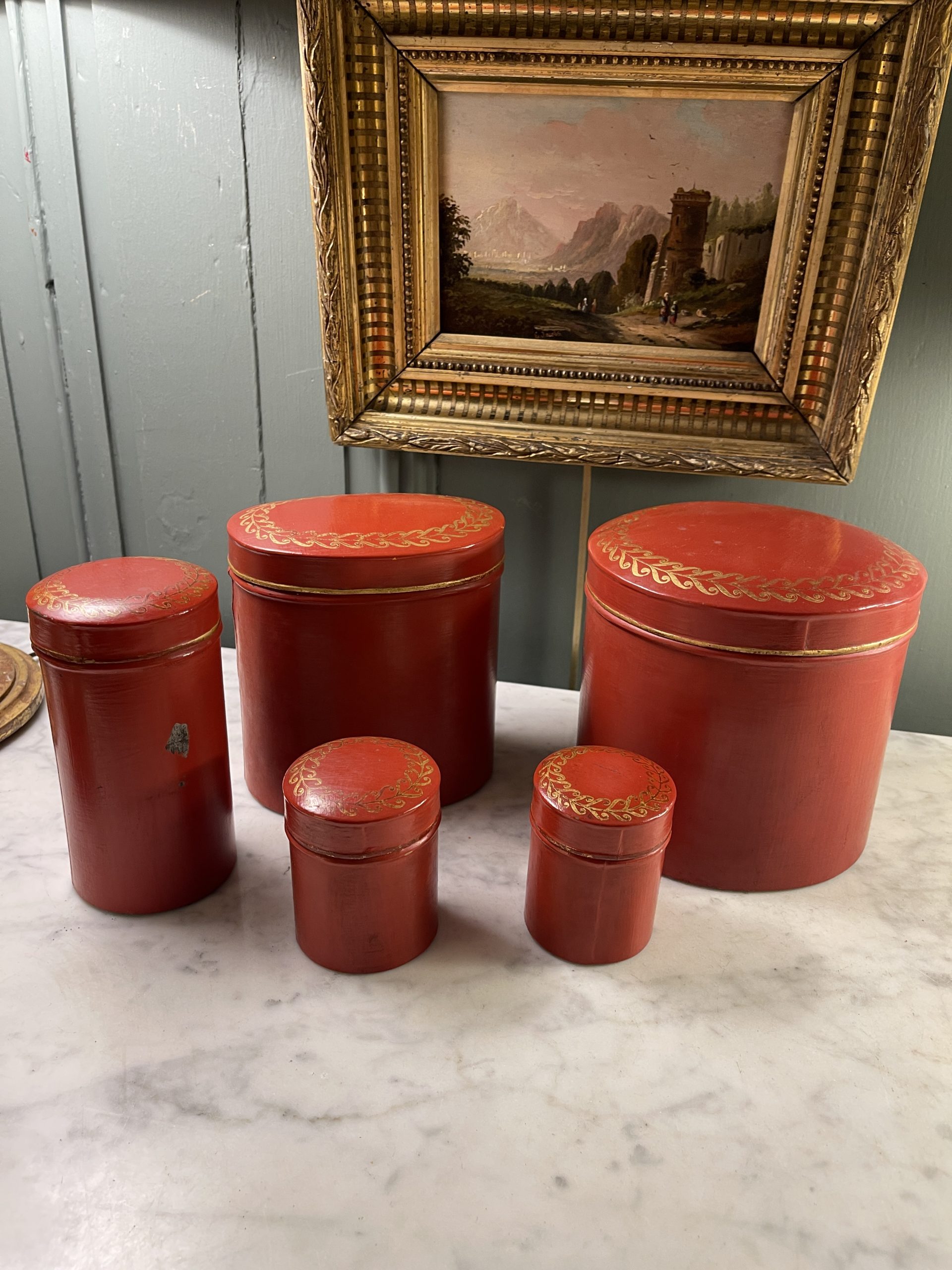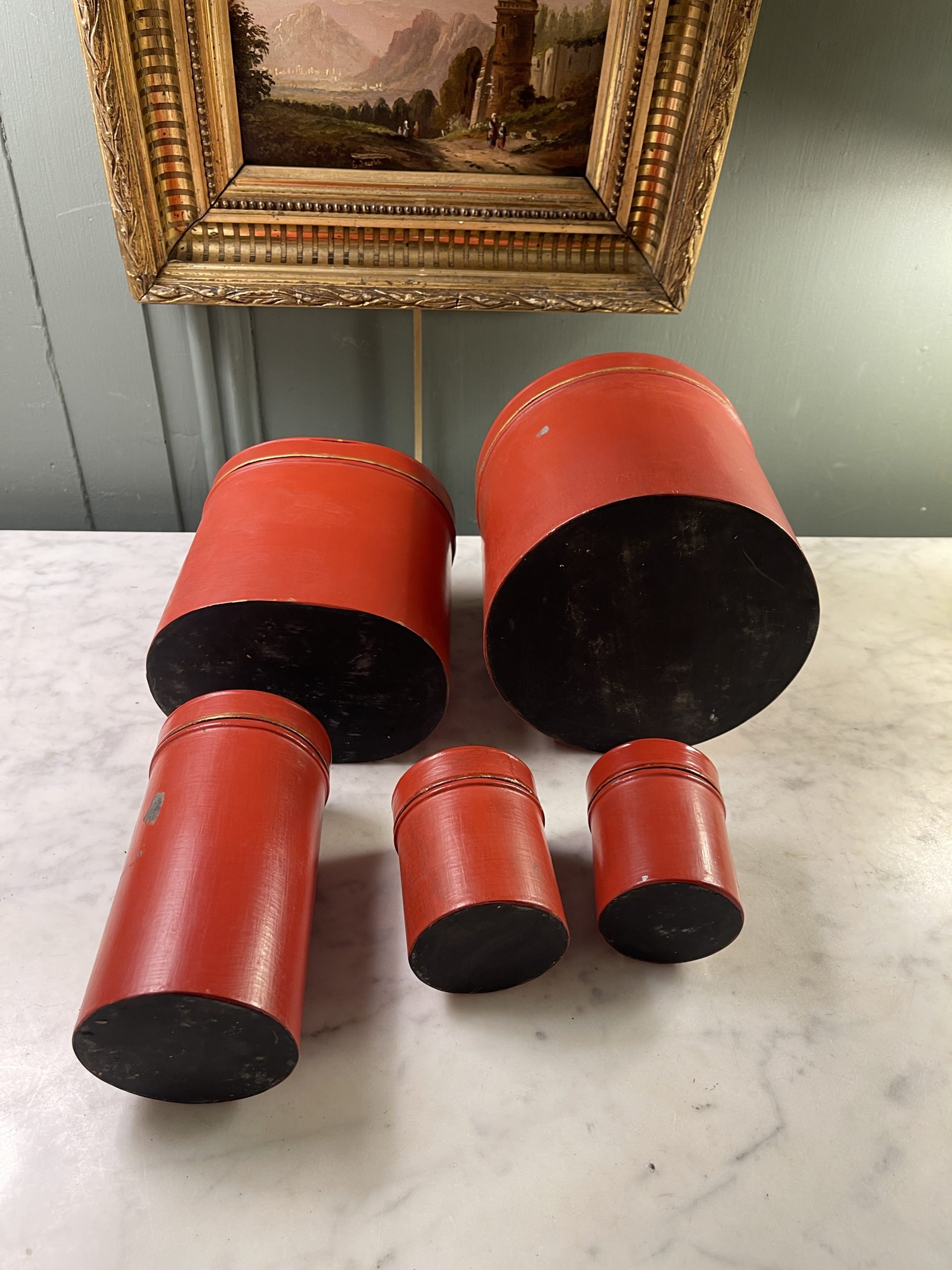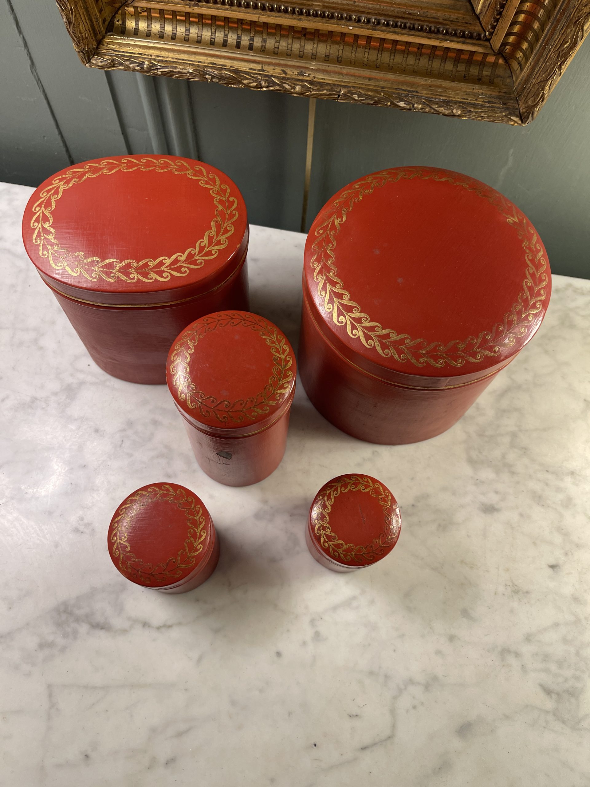 Set of five red painted tin boxes with gilt friezes on their domed lids, dating from the early 20th century.