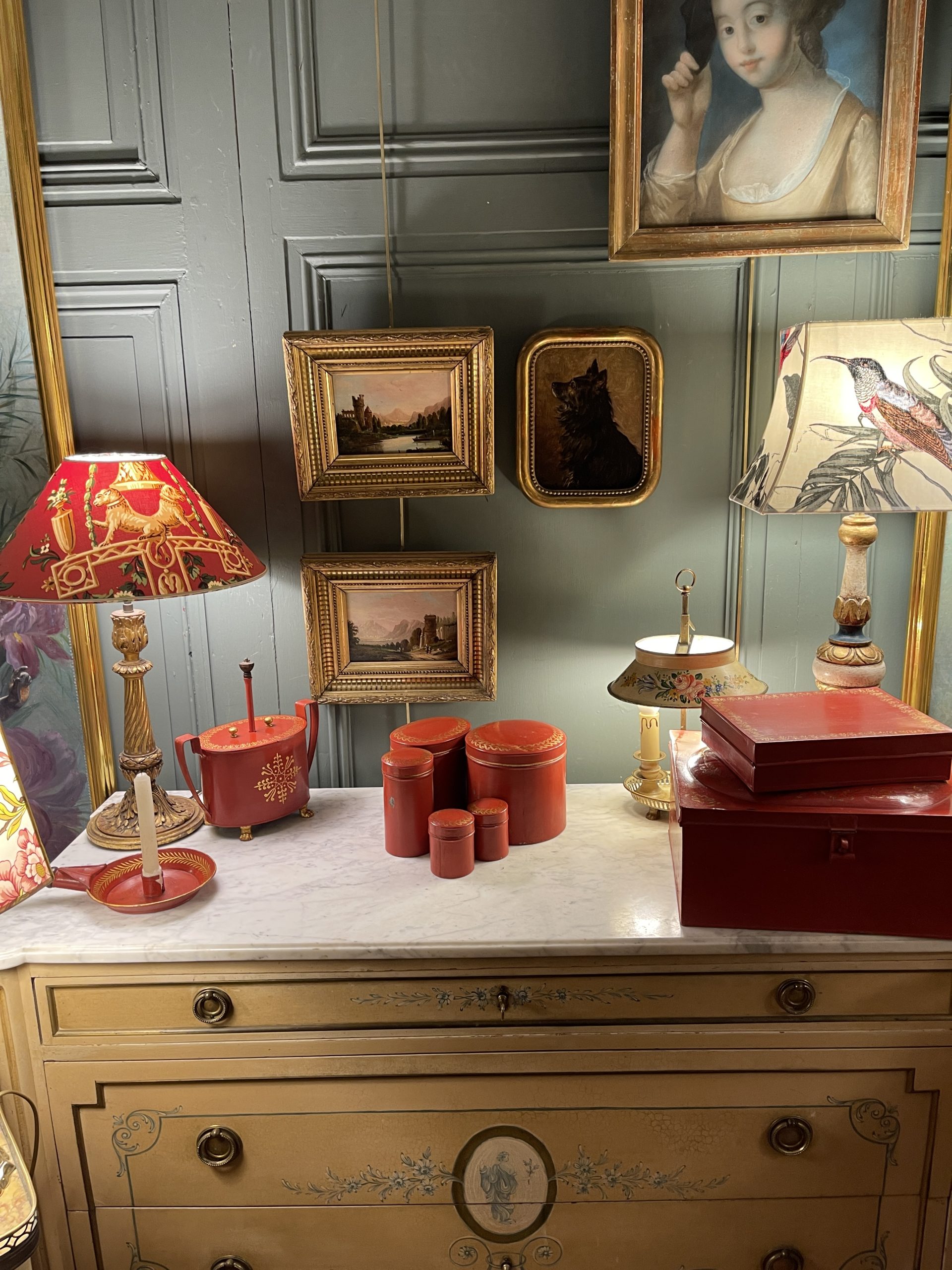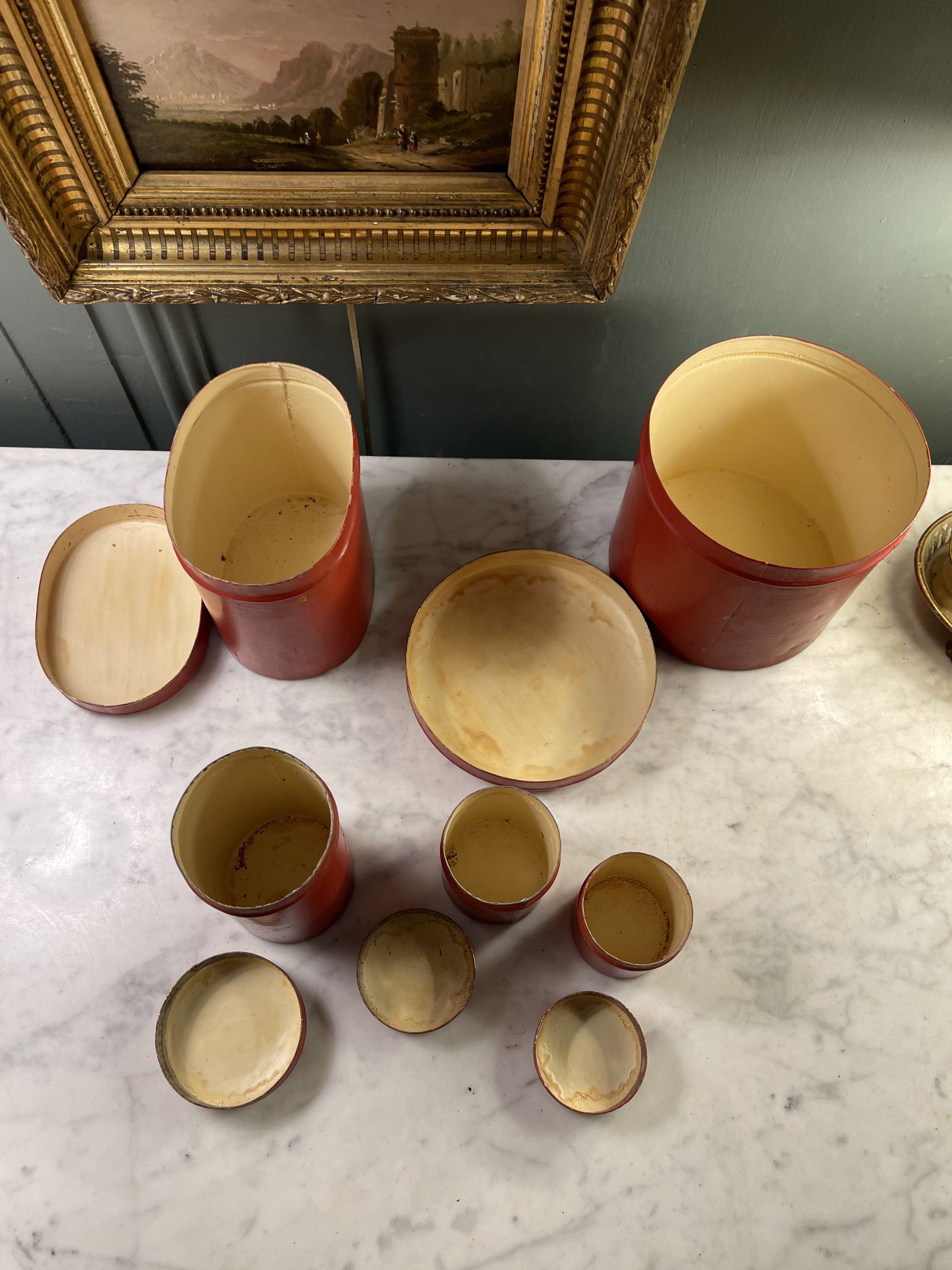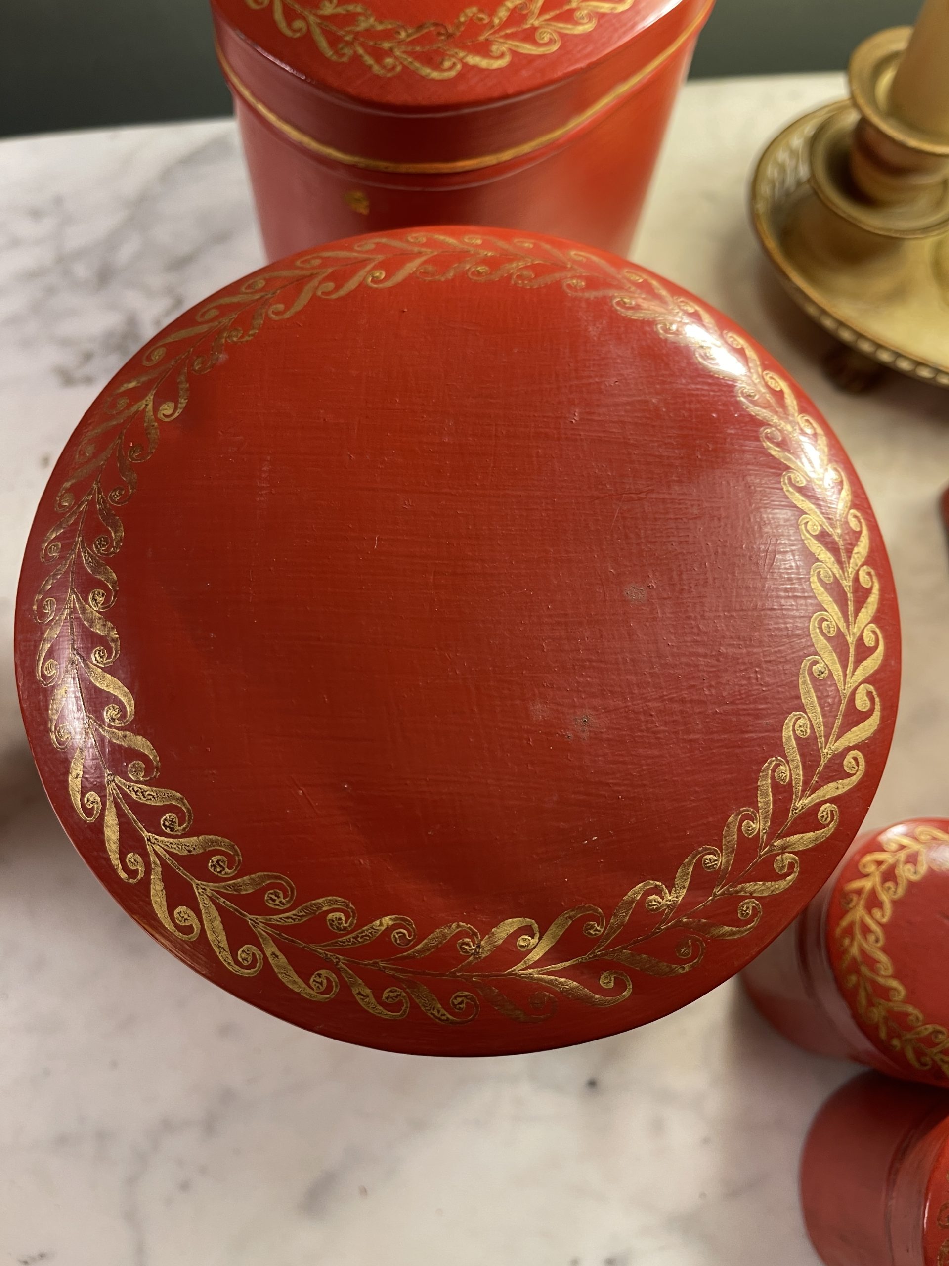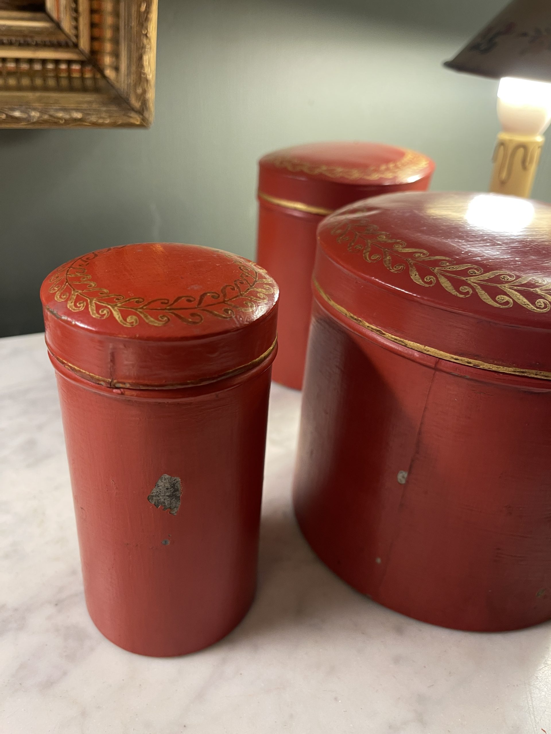 Set of five red painted tin boxes with gilt friezes on their domed lids, dating from the early 20th century.