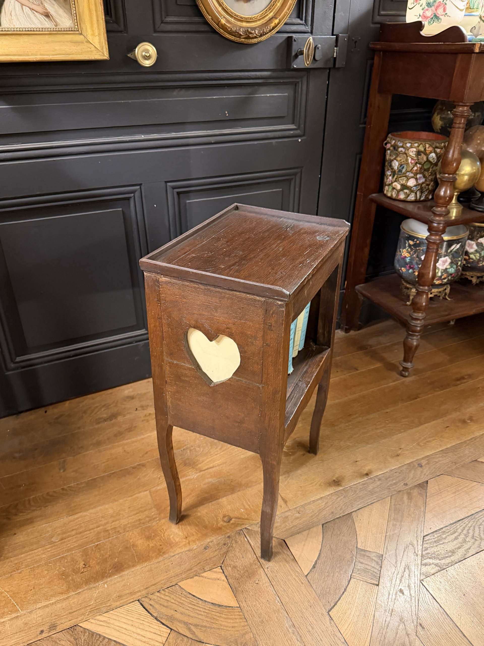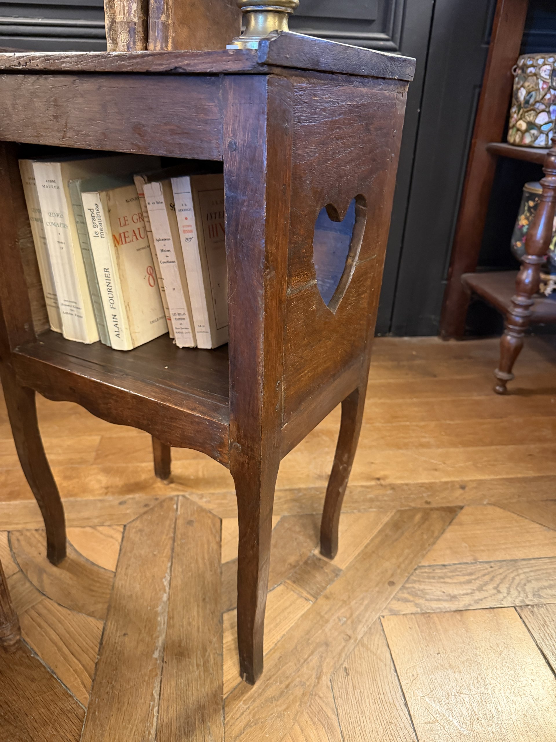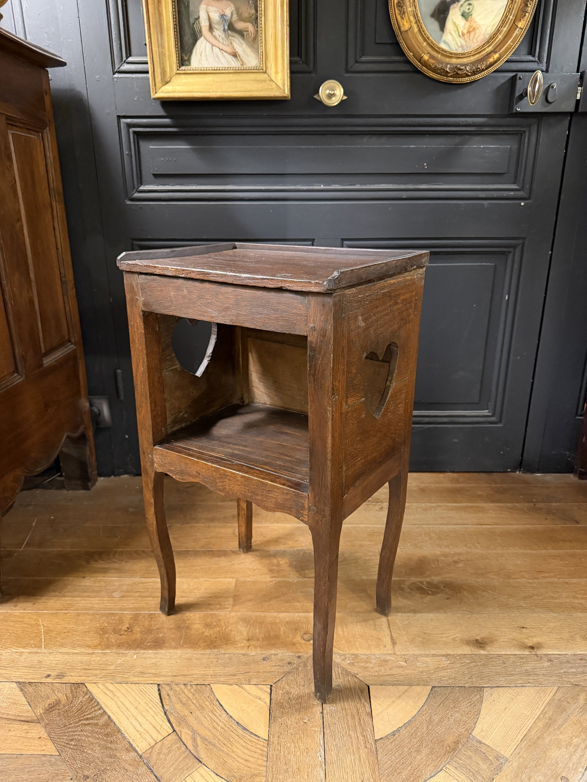Small bedside table with openwork heart decoration on its sides, made of oak in the Louis XV style, late 18th century.