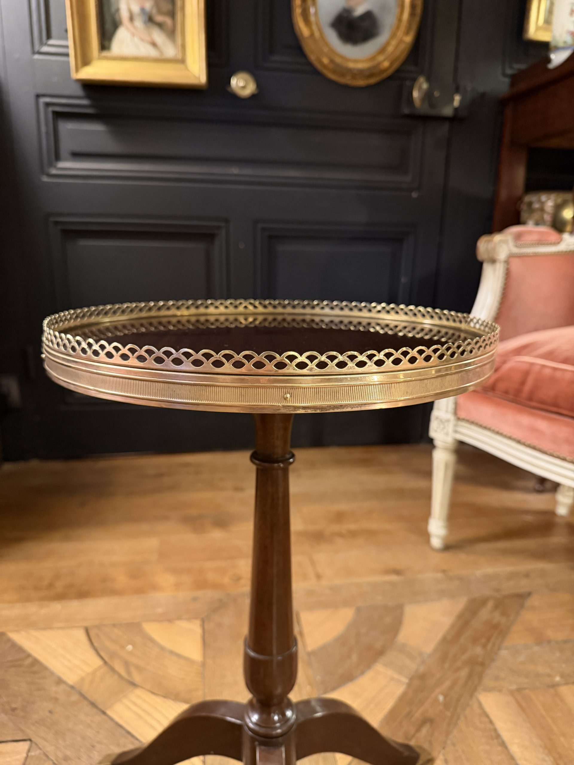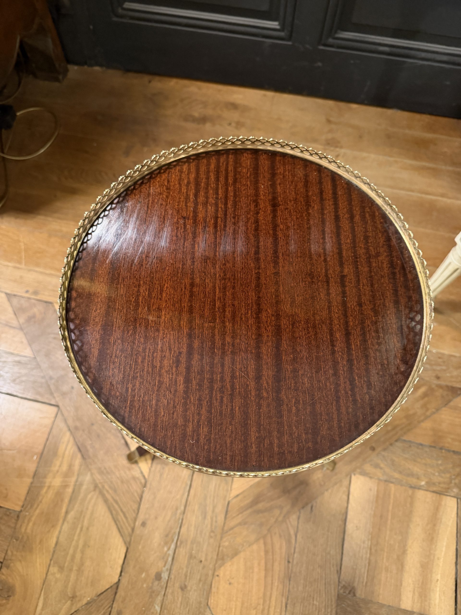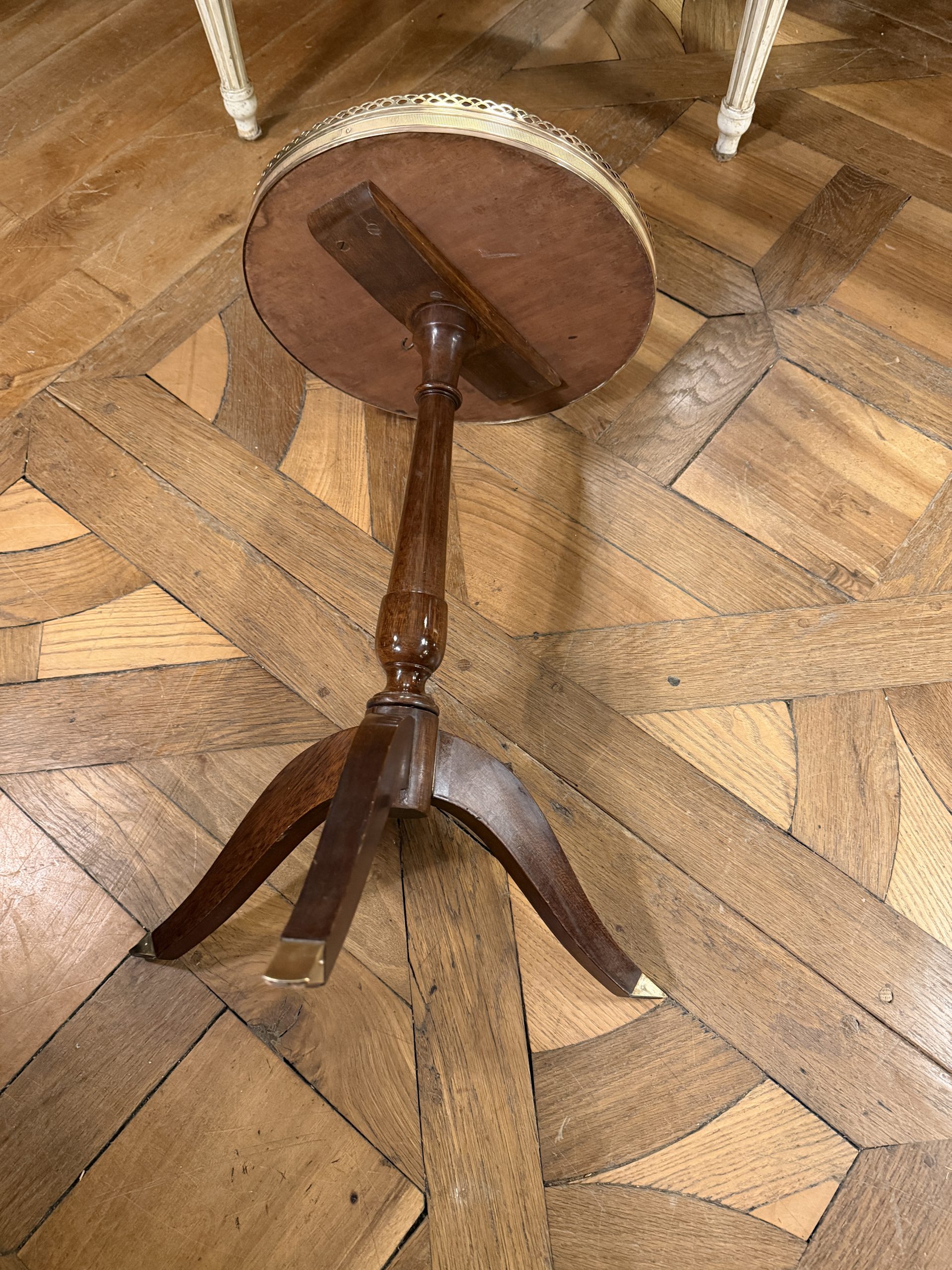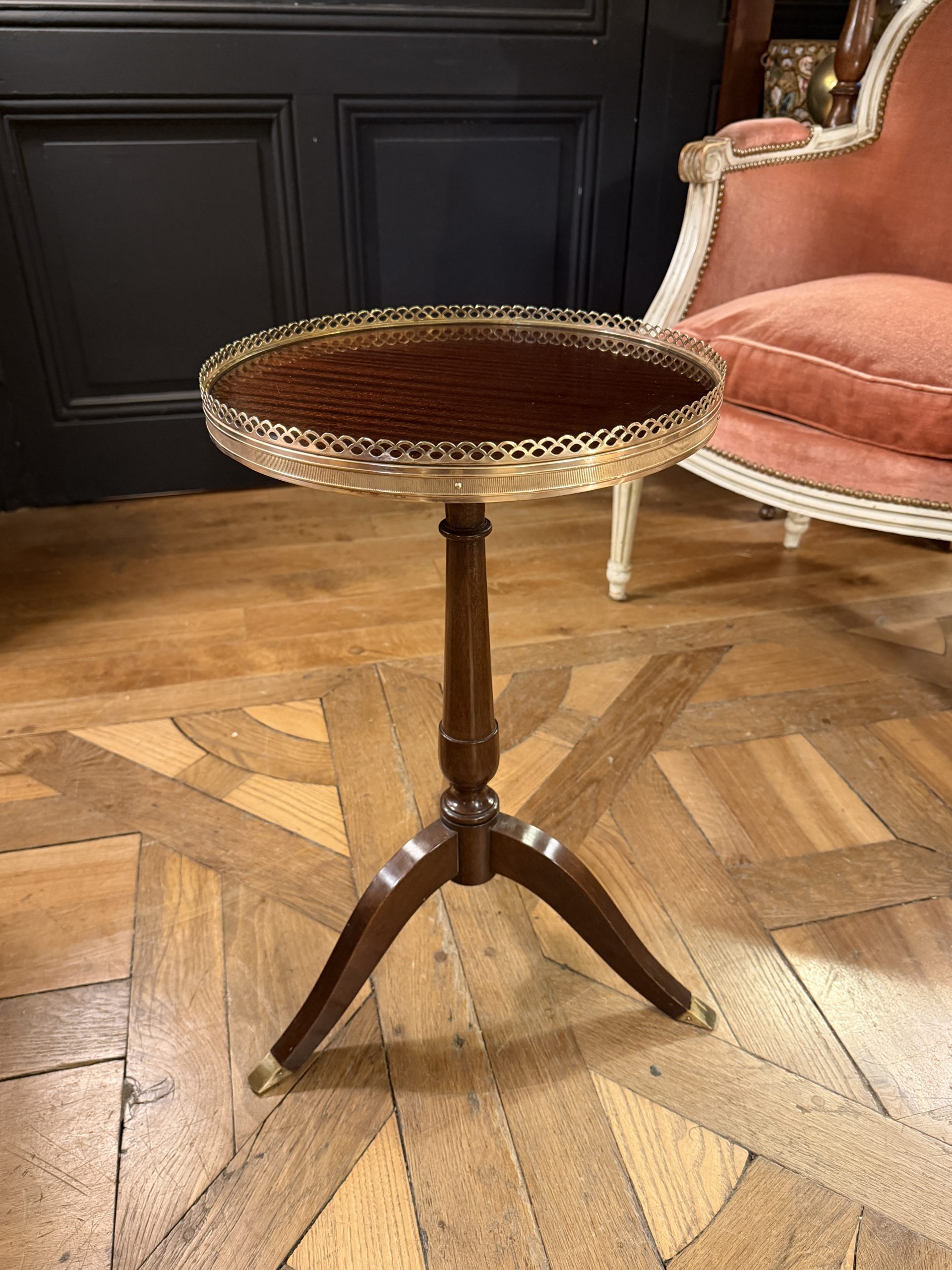 Small 20th-century varnished mahogany tripod side table. Its top is encircled by an openwork brass gallery.