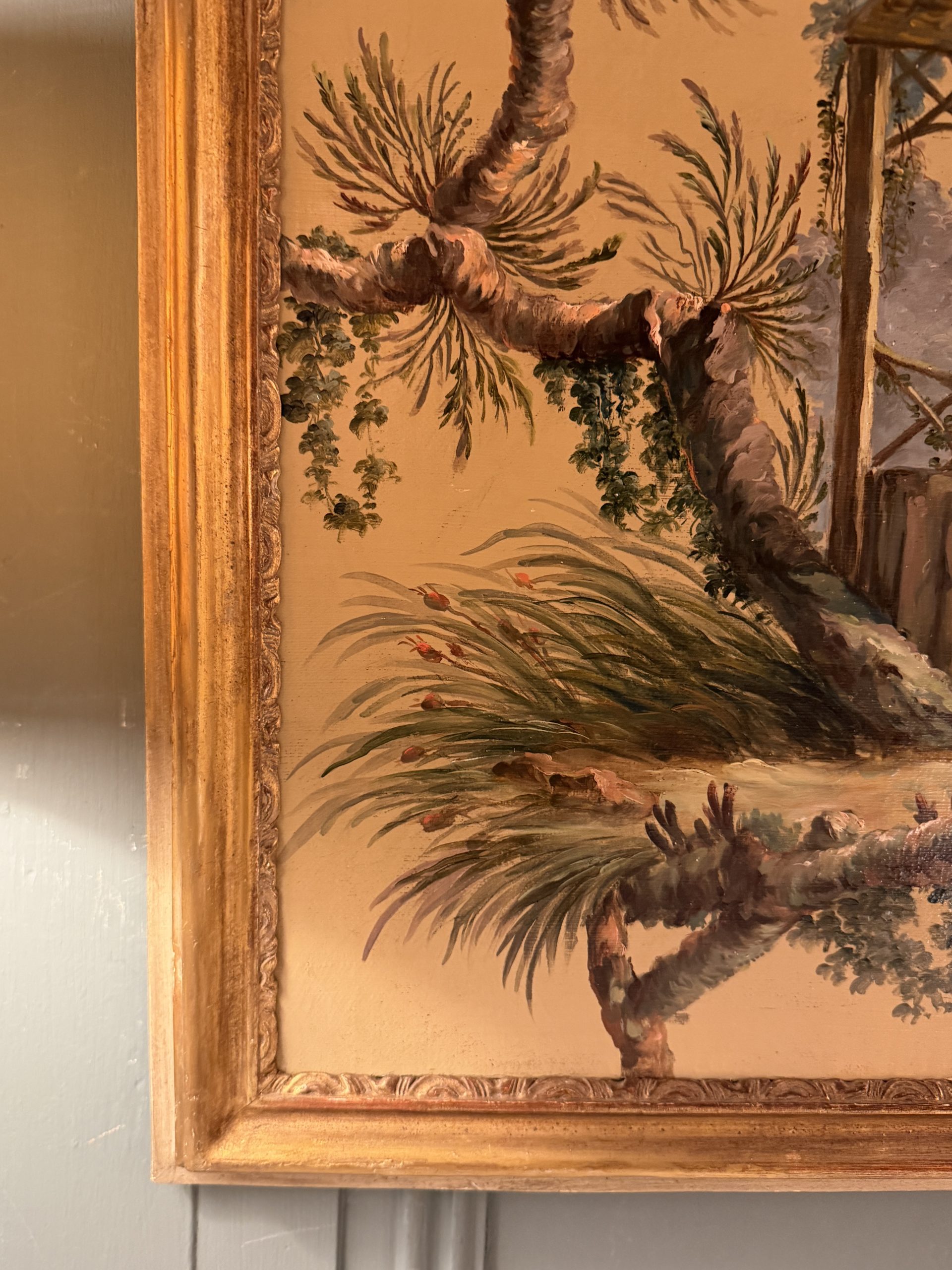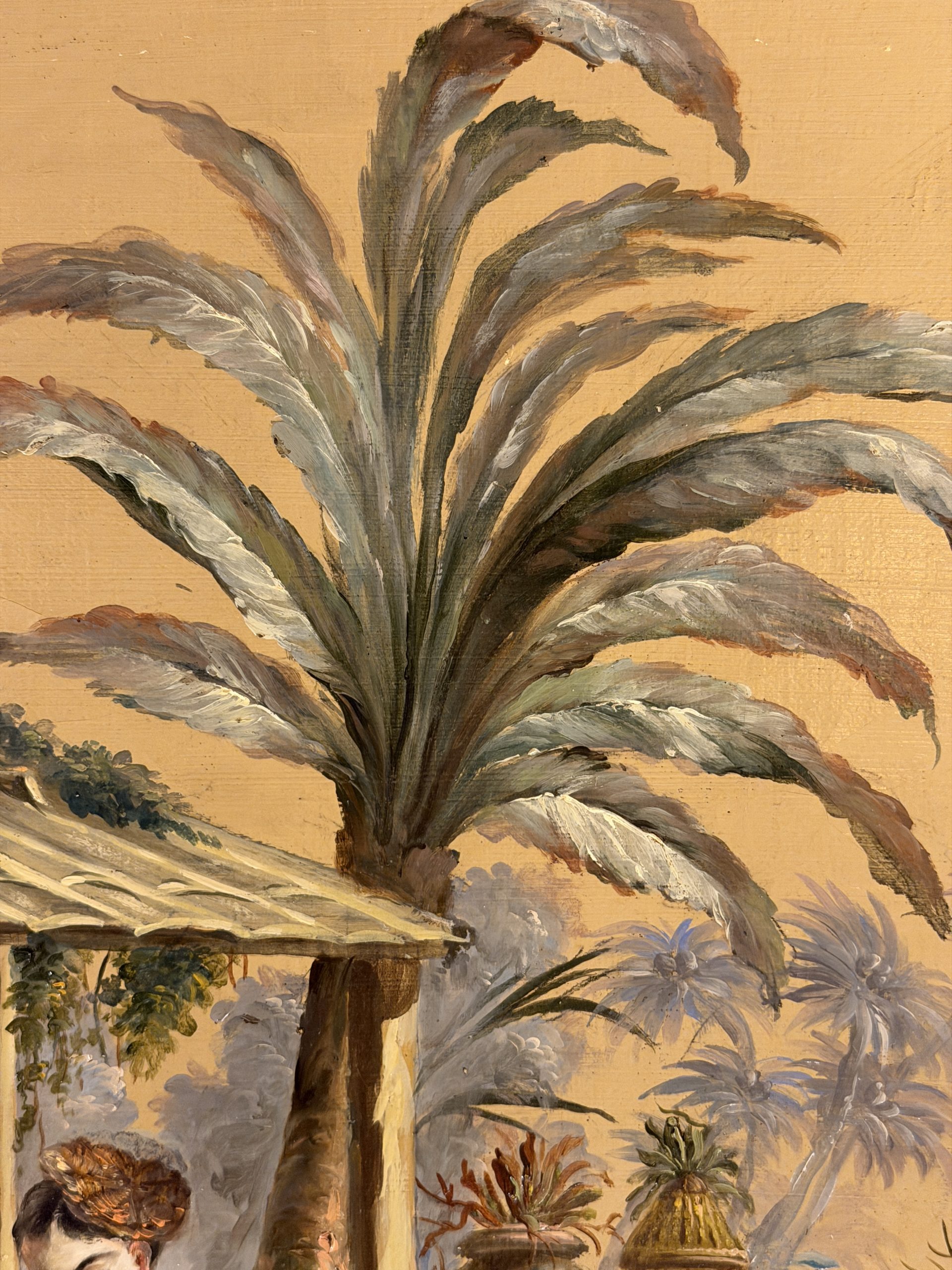 Des personnages asiatiques se tiennent auprès d’un kiosque entouré d’un décor végétale dans le style rocaille.