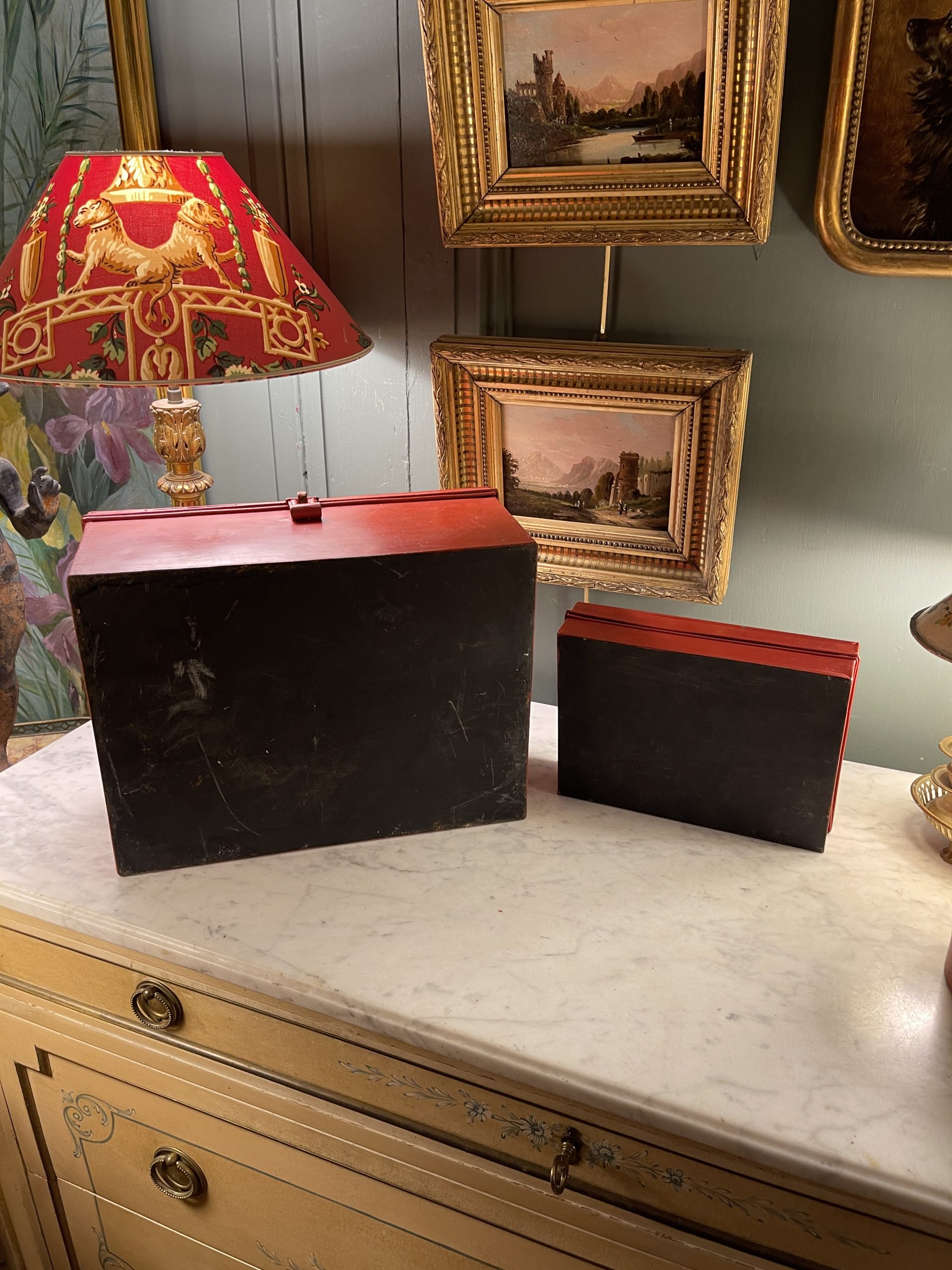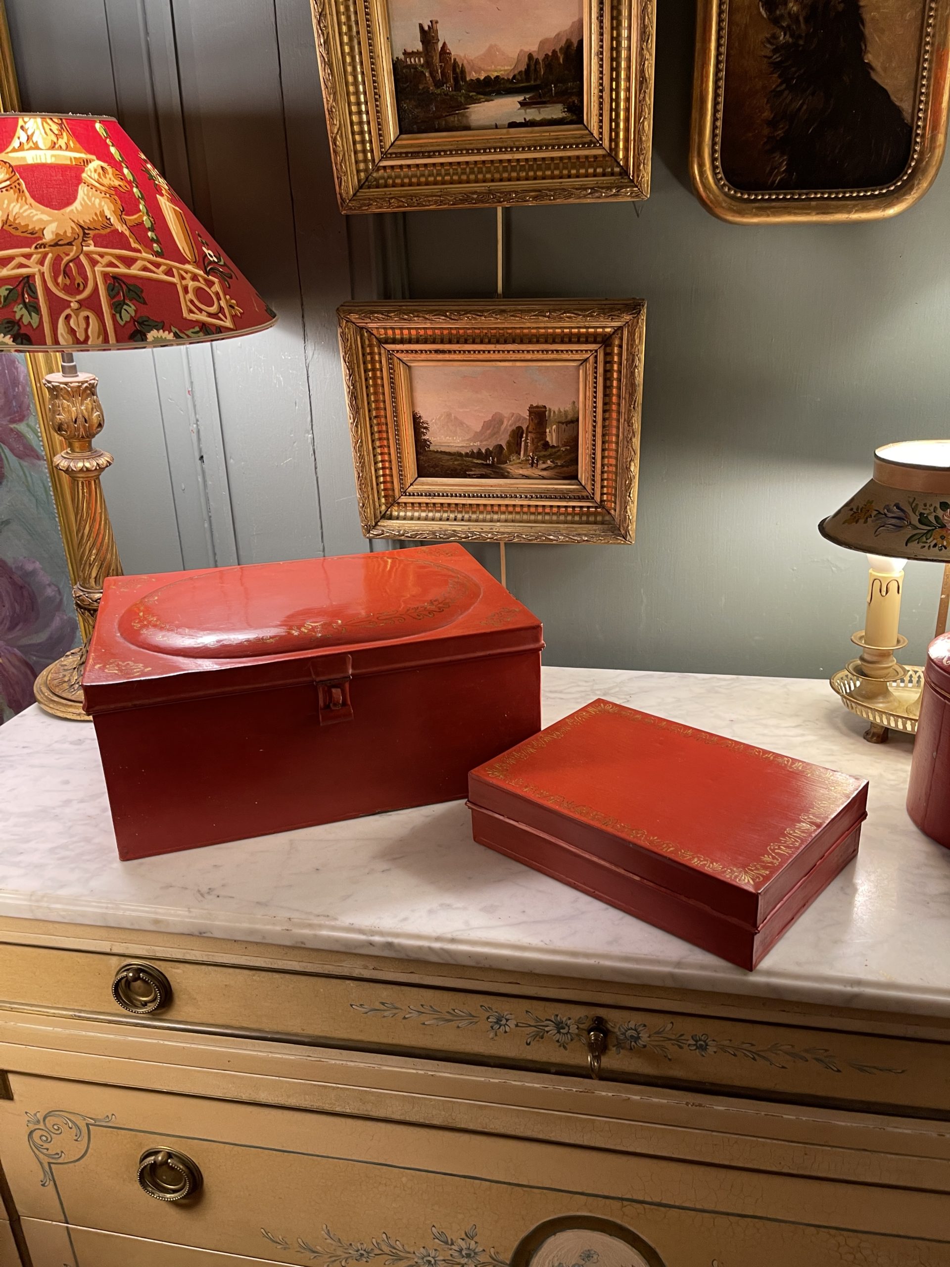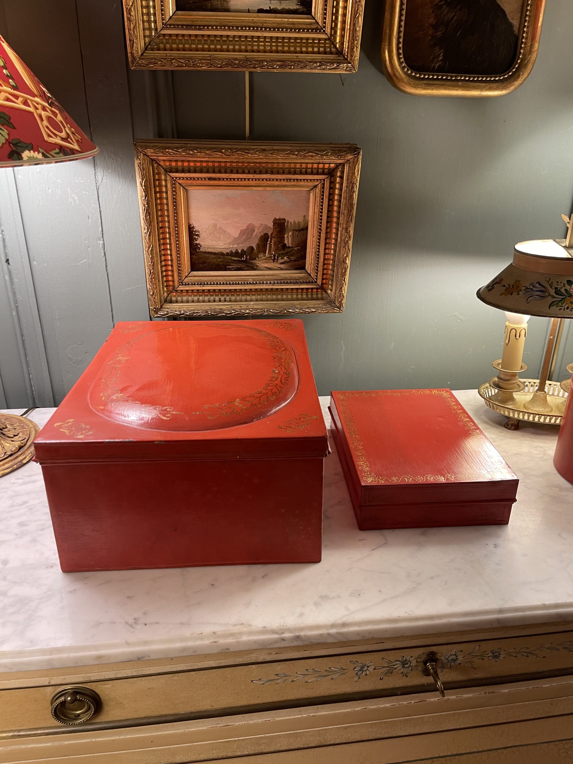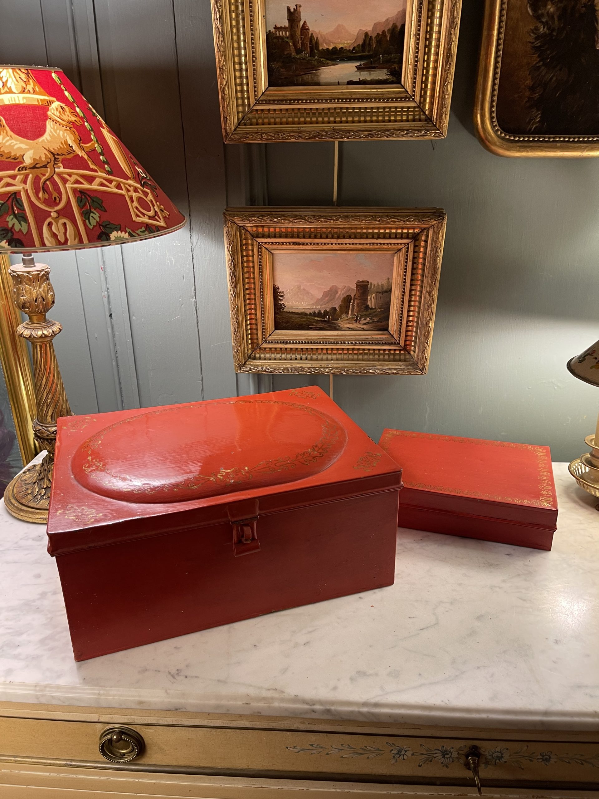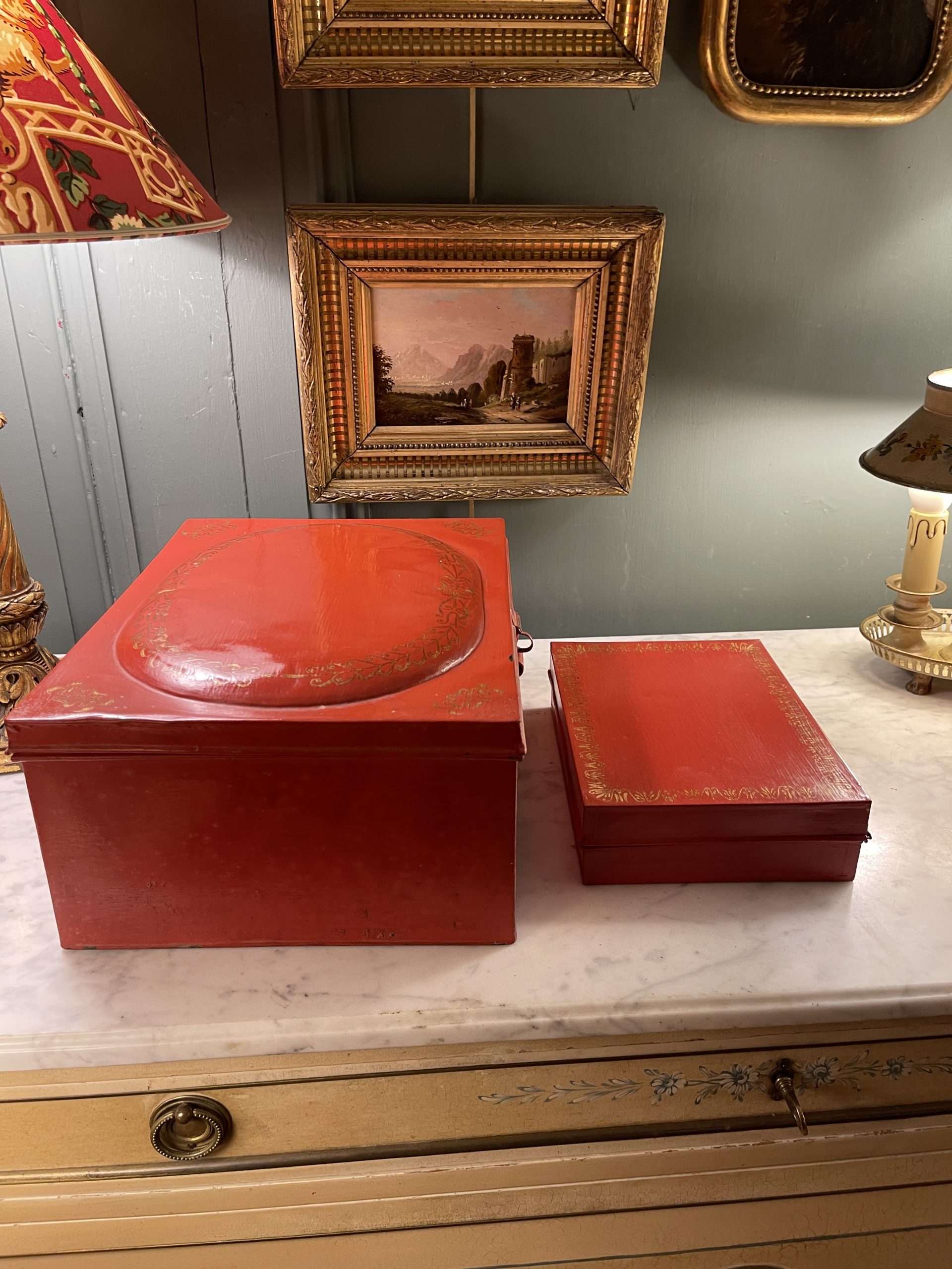 Ensemble de deux boîtes en tôle peinte de couleur rouge ornées de frises dorées datant de la première partie du XXème.