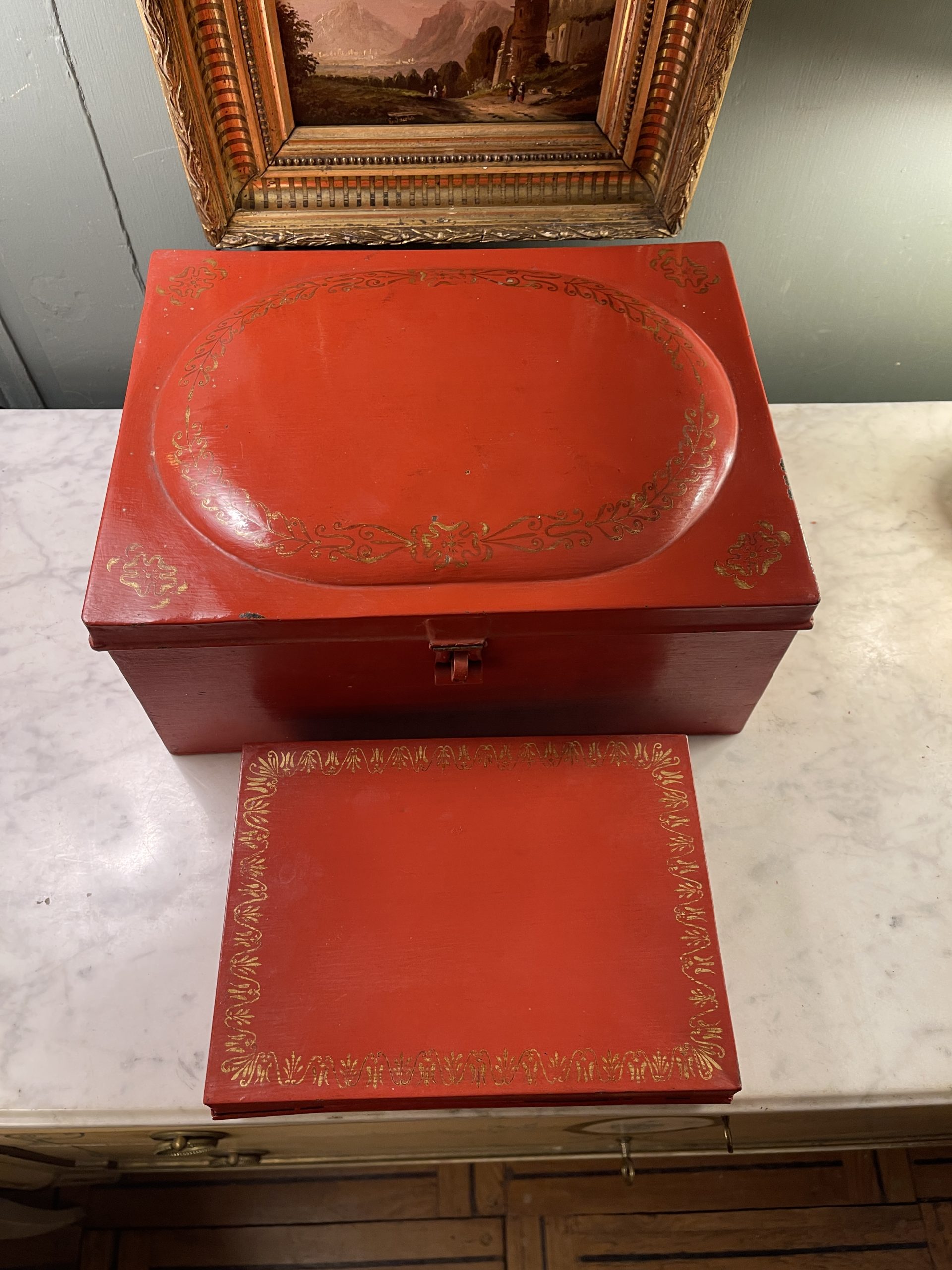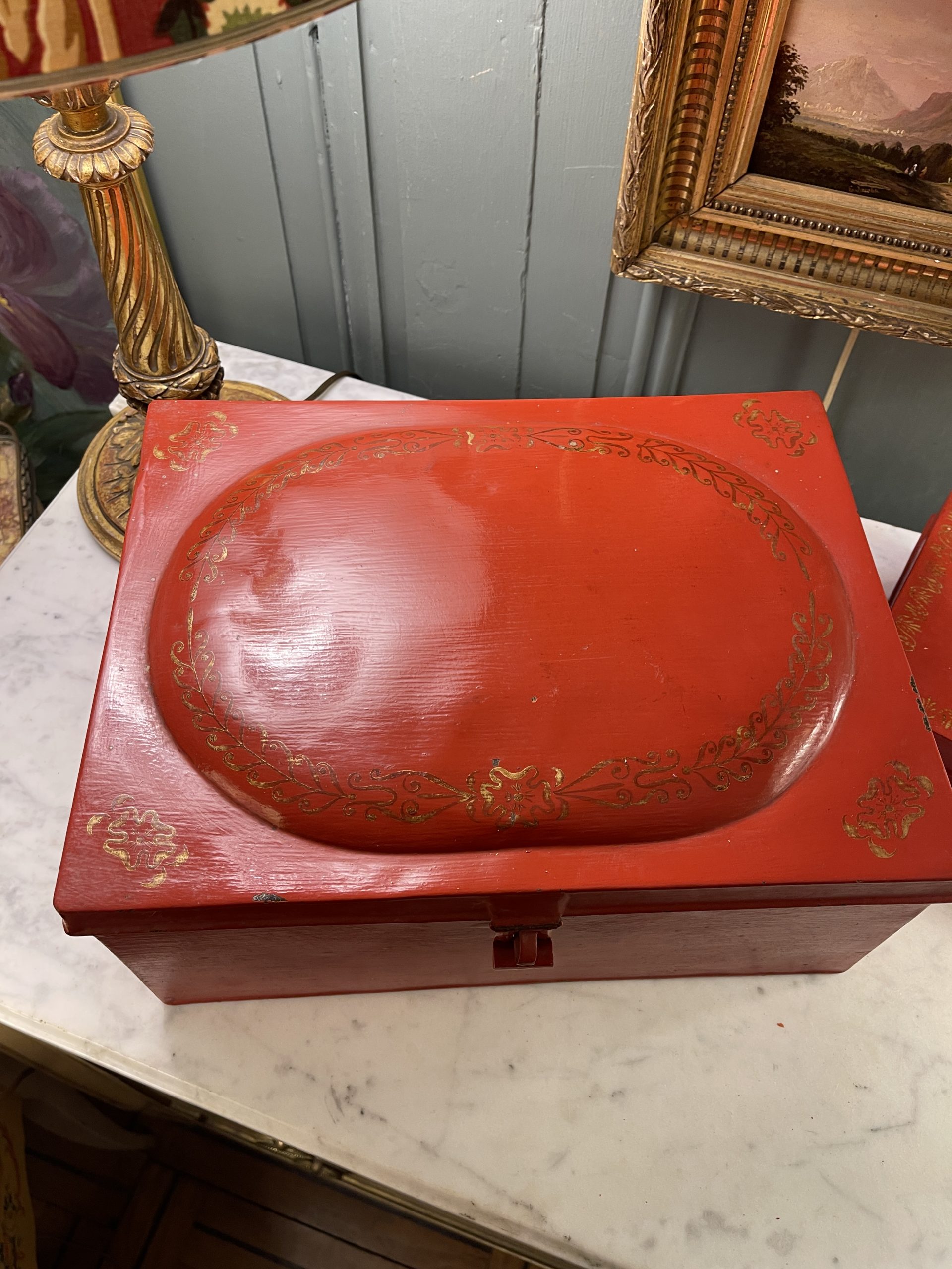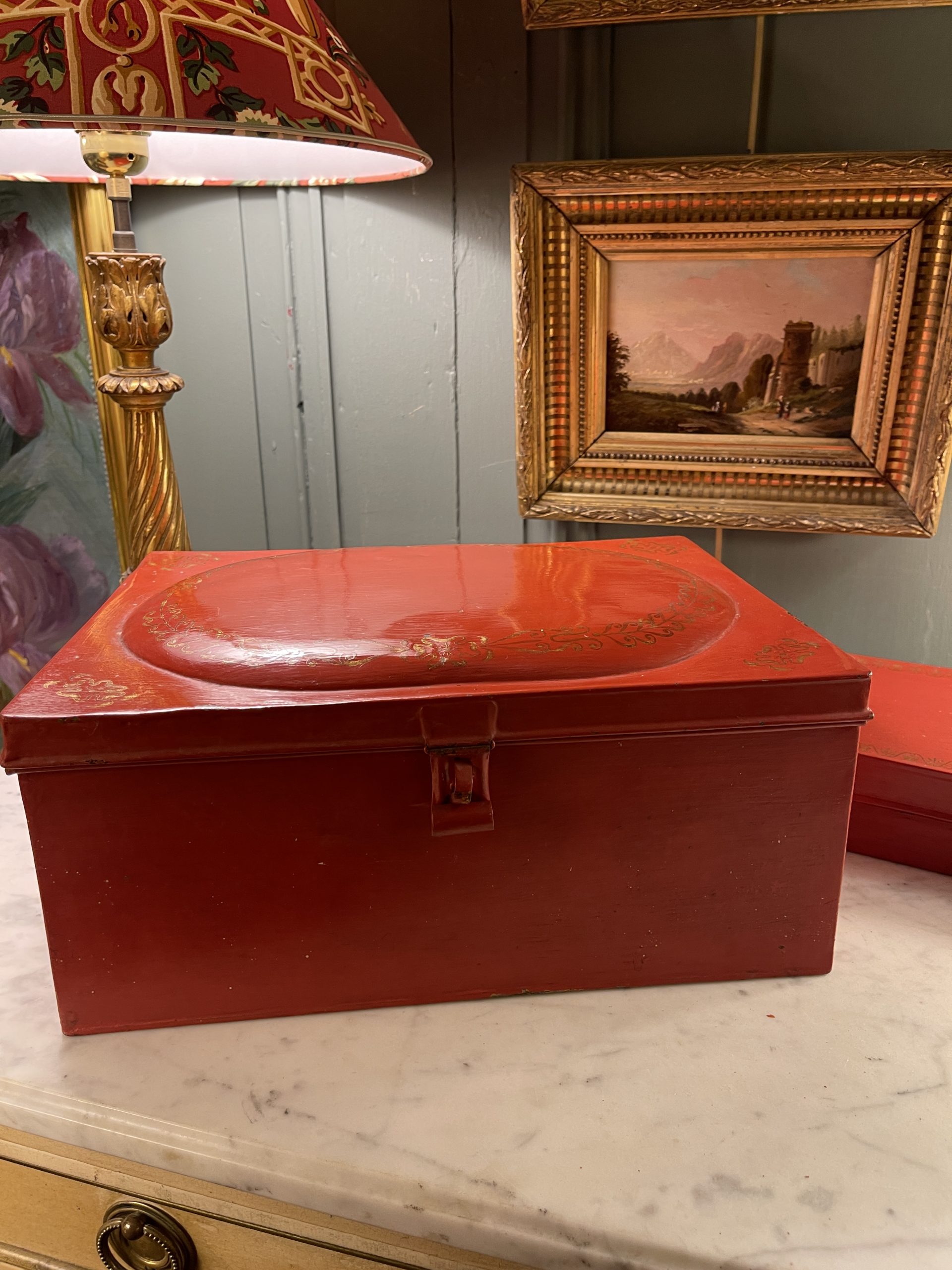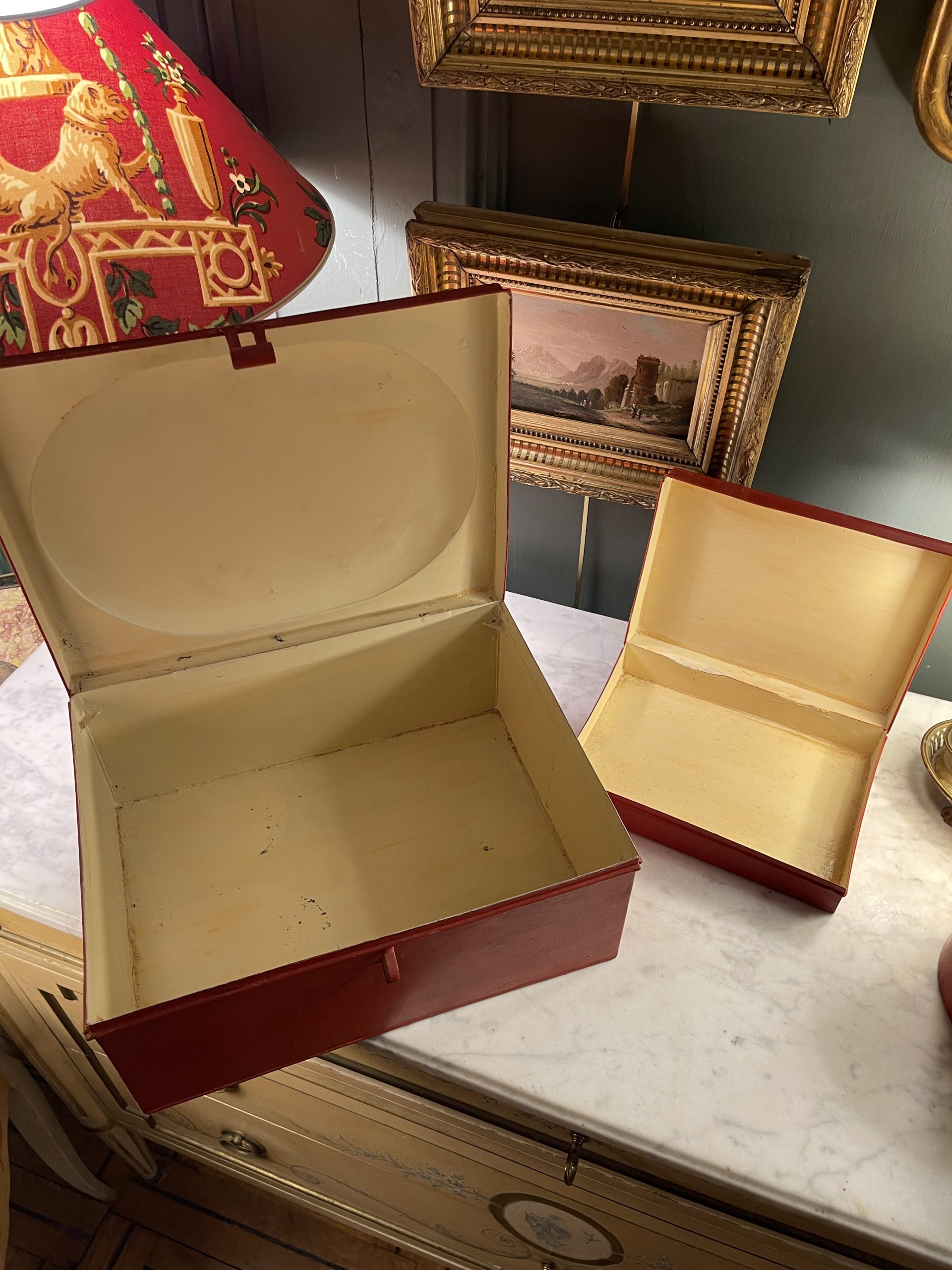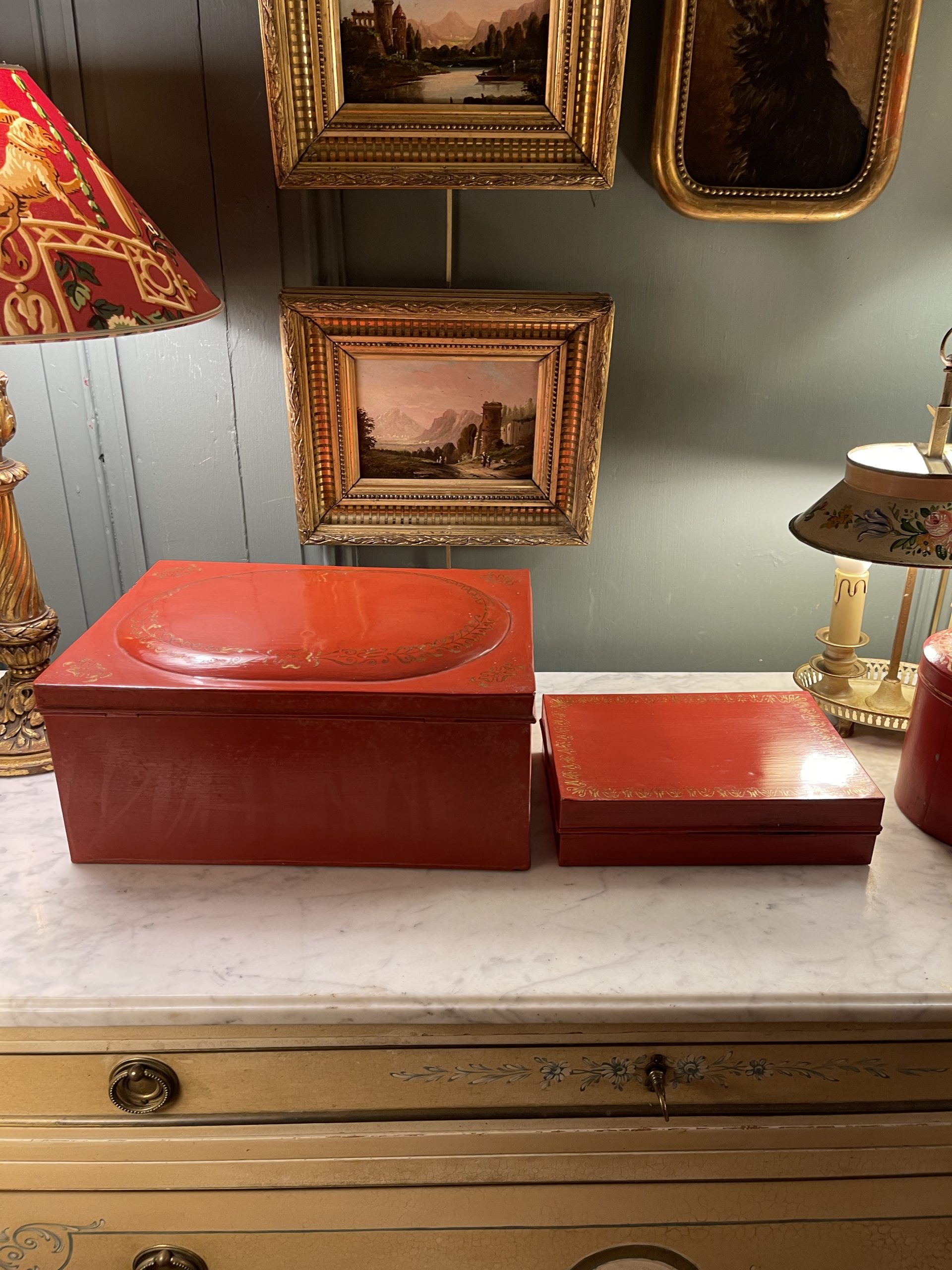 Ensemble de deux boîtes en tôle peinte de couleur rouge ornées de frises dorées datant de la première partie du XXème.