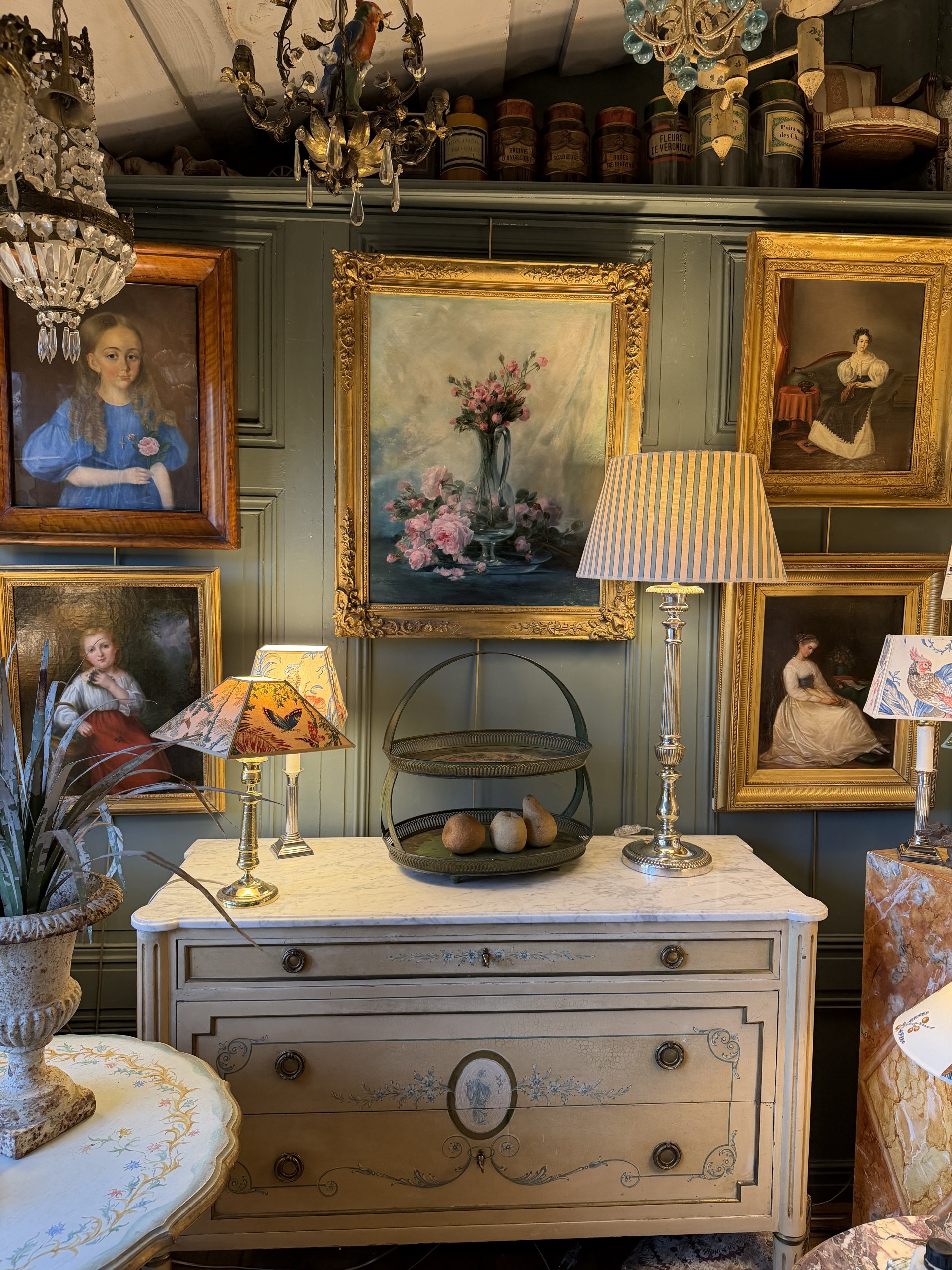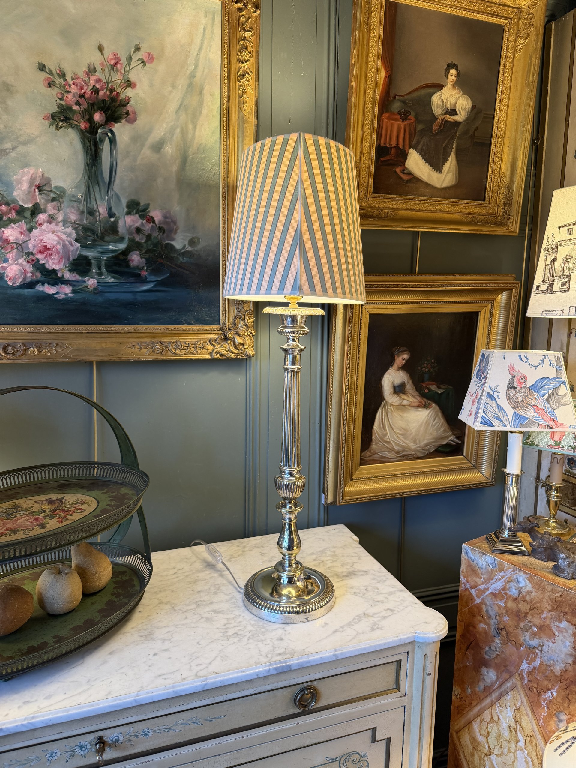 Son abat-jour de forme ovale pointu a été créé à partir d’un tissu de Manuel Canovas « Sophie » coloris Jade