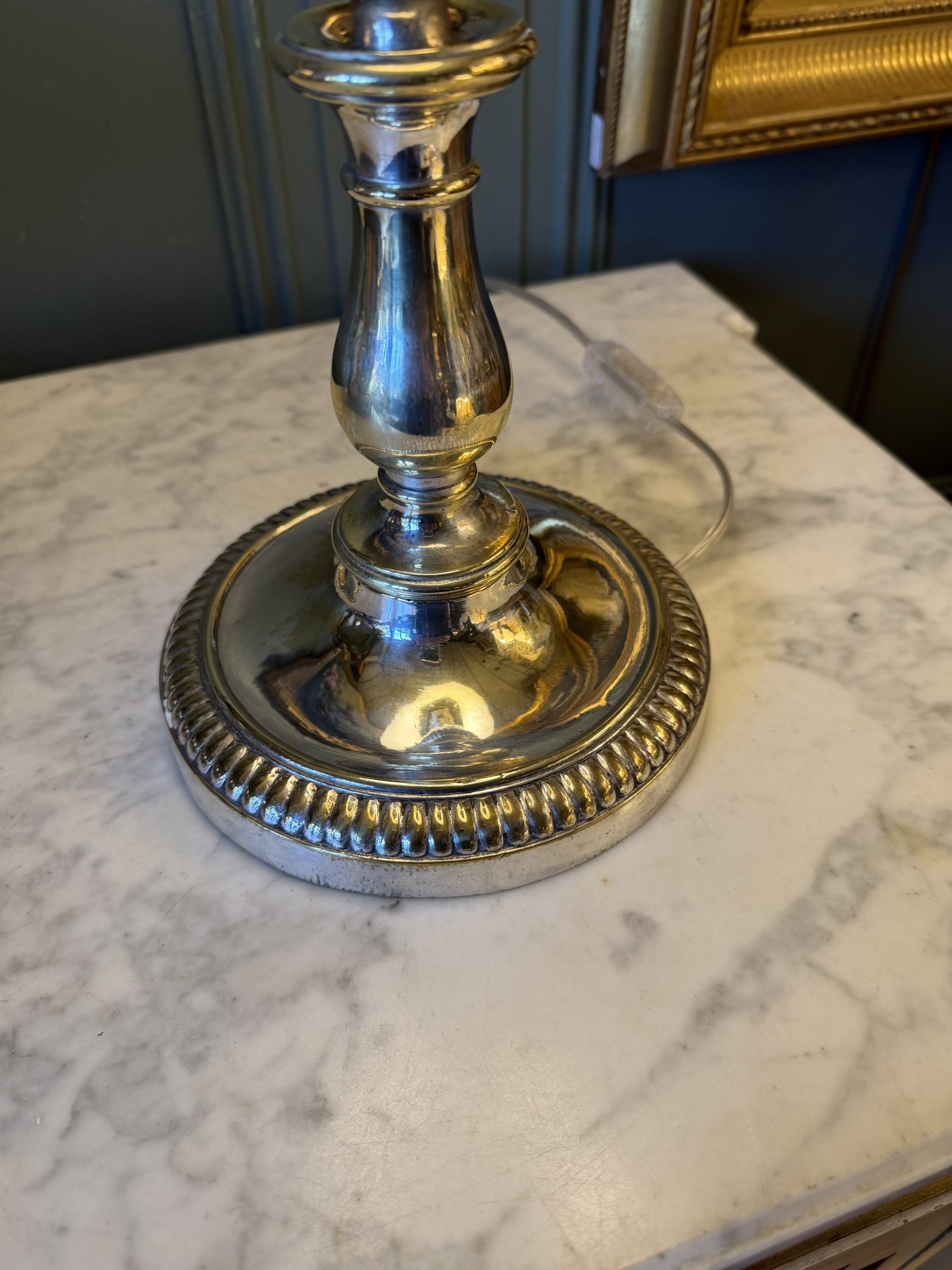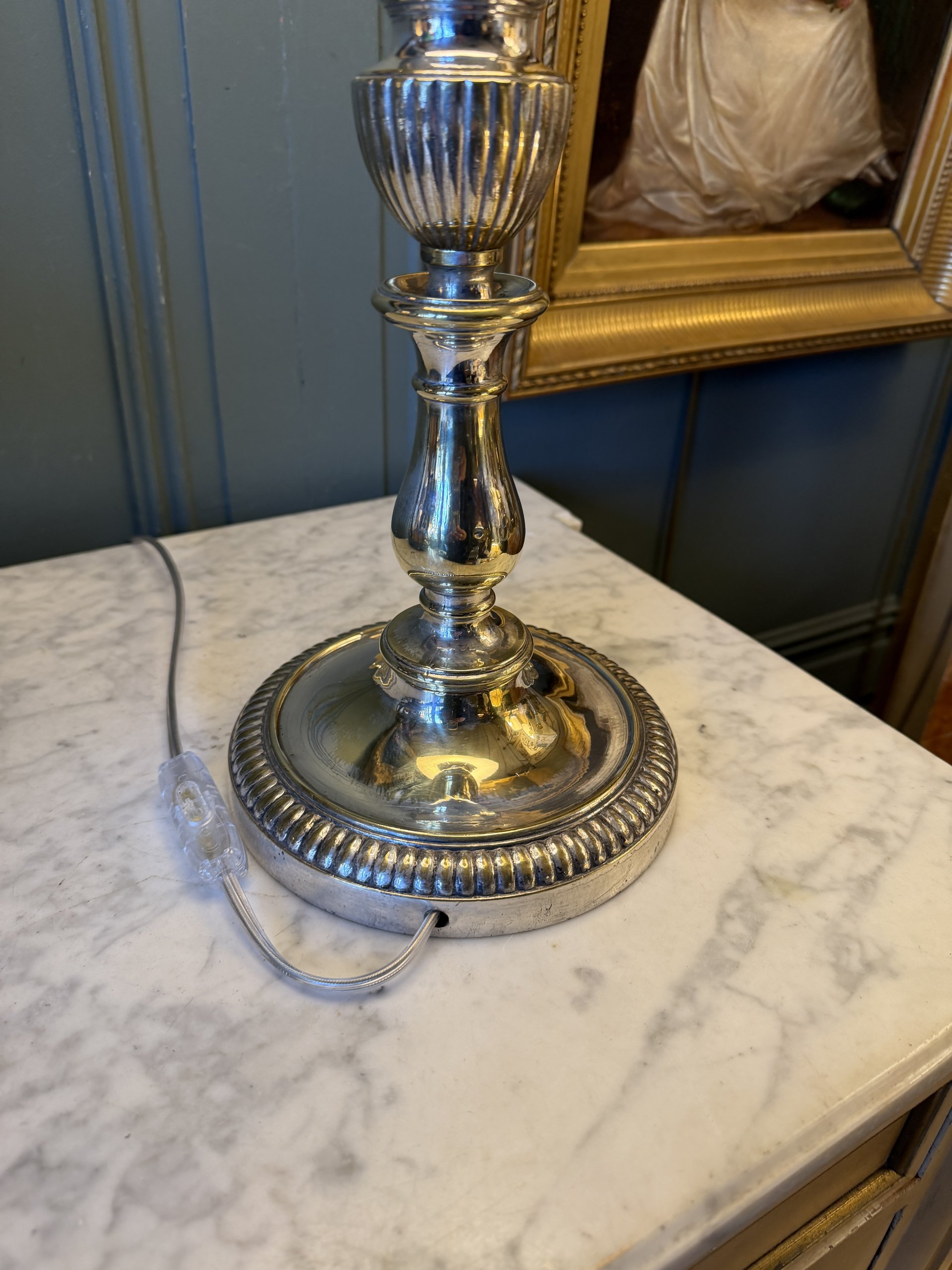 Pique-cierge en métal argenté poli début XXème de style Louis XVI monté en lampe.