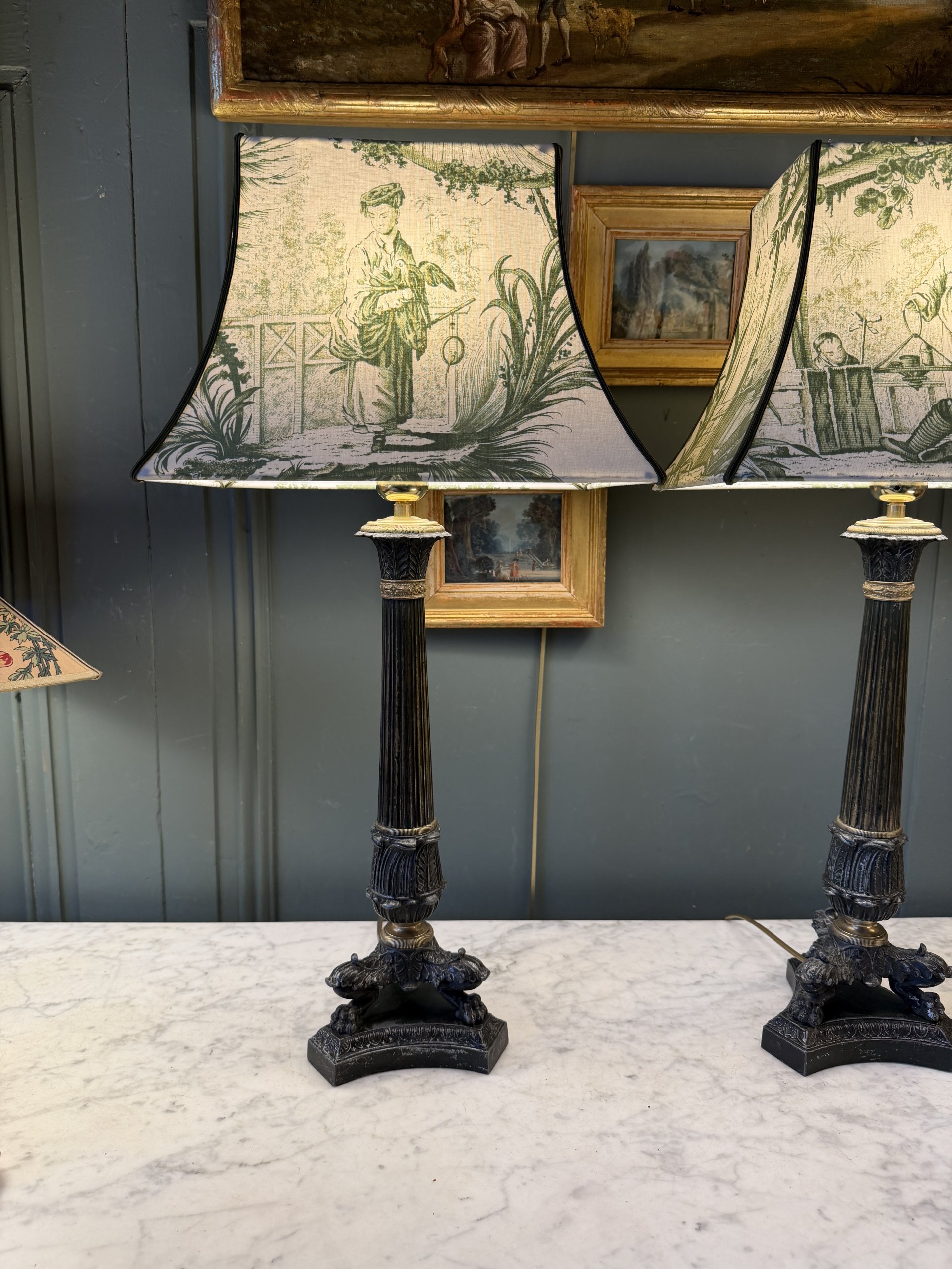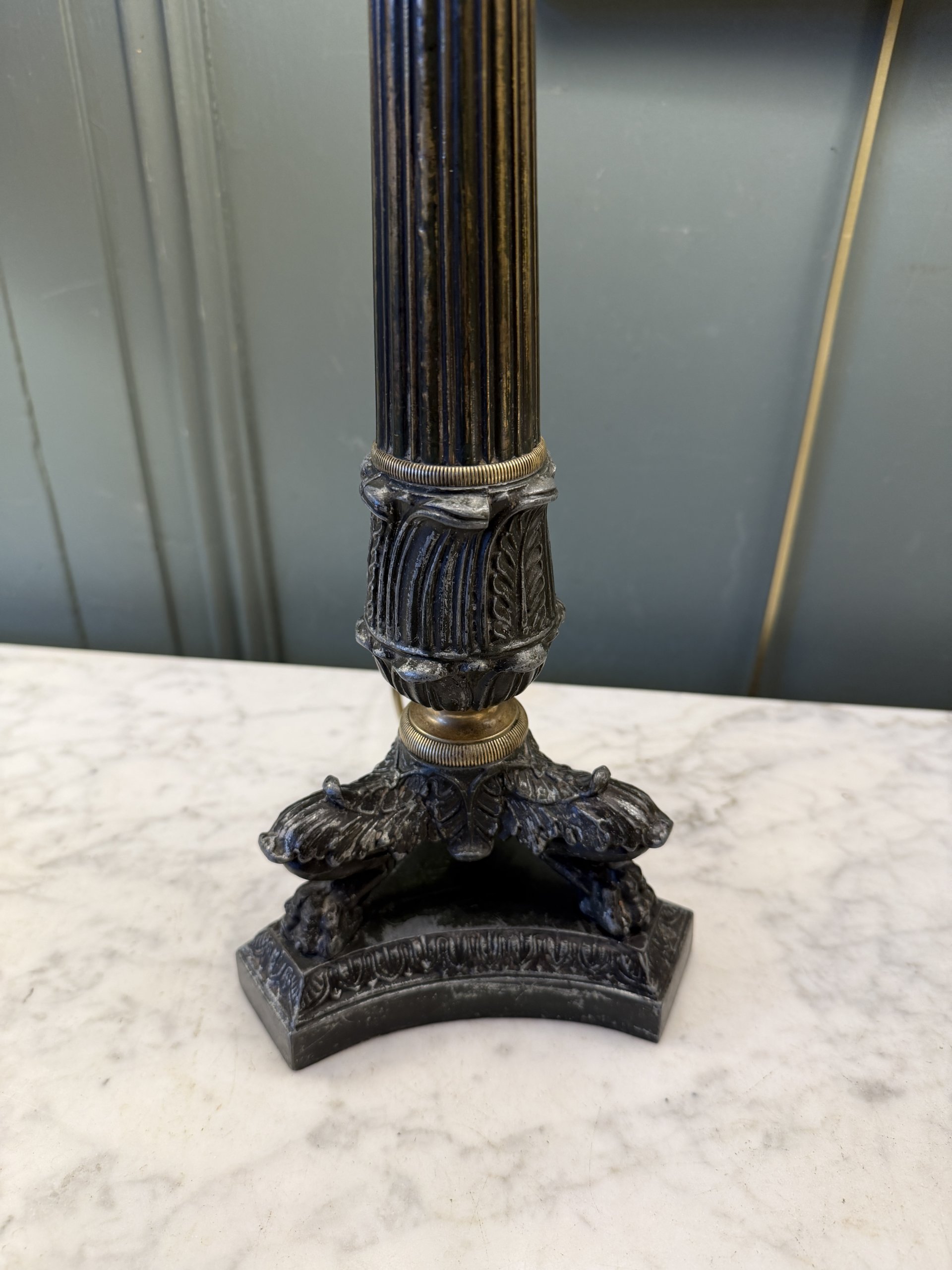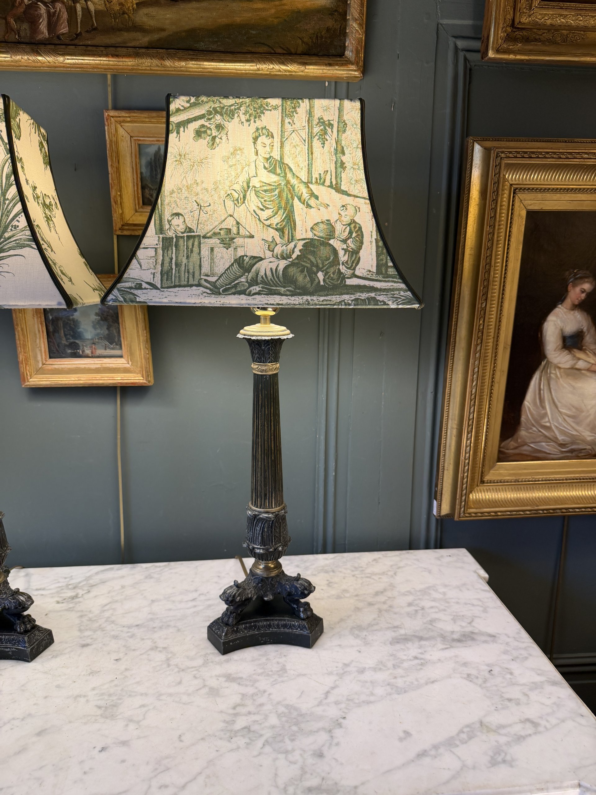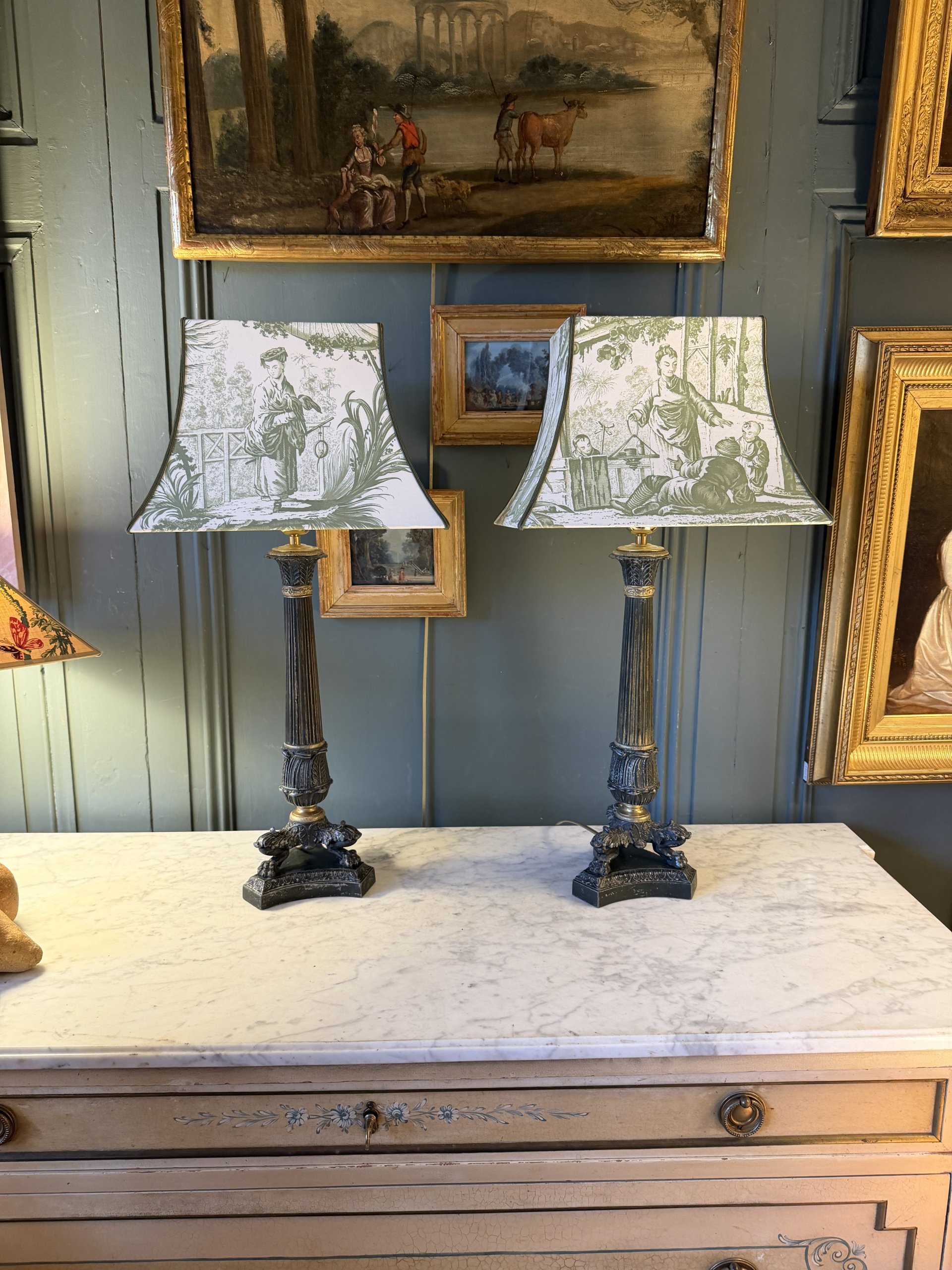 Grande paire de flambeaux époque Restauration (vers 1825) en laiton et fer blanc patiné (vert) montés en lampes.