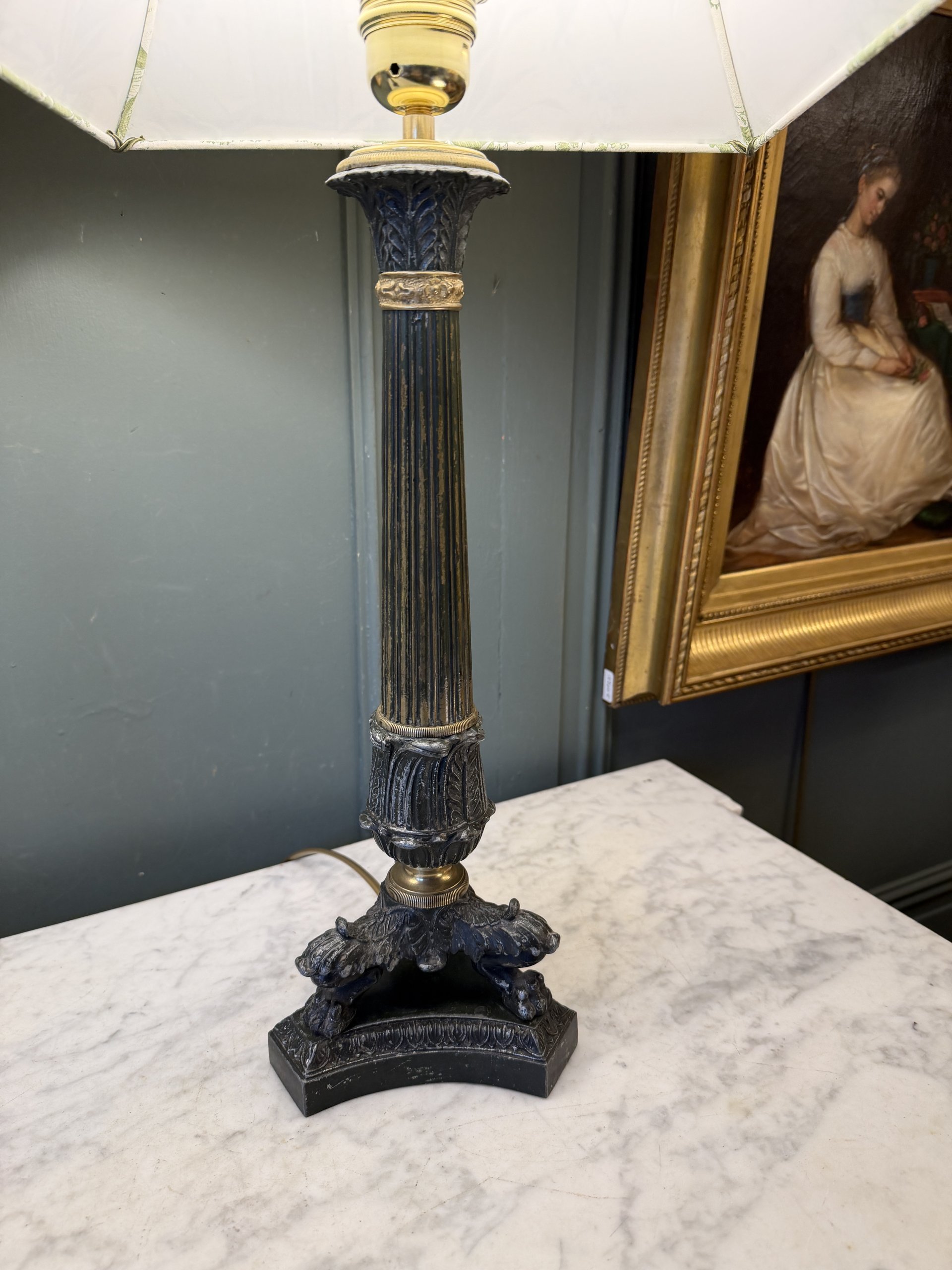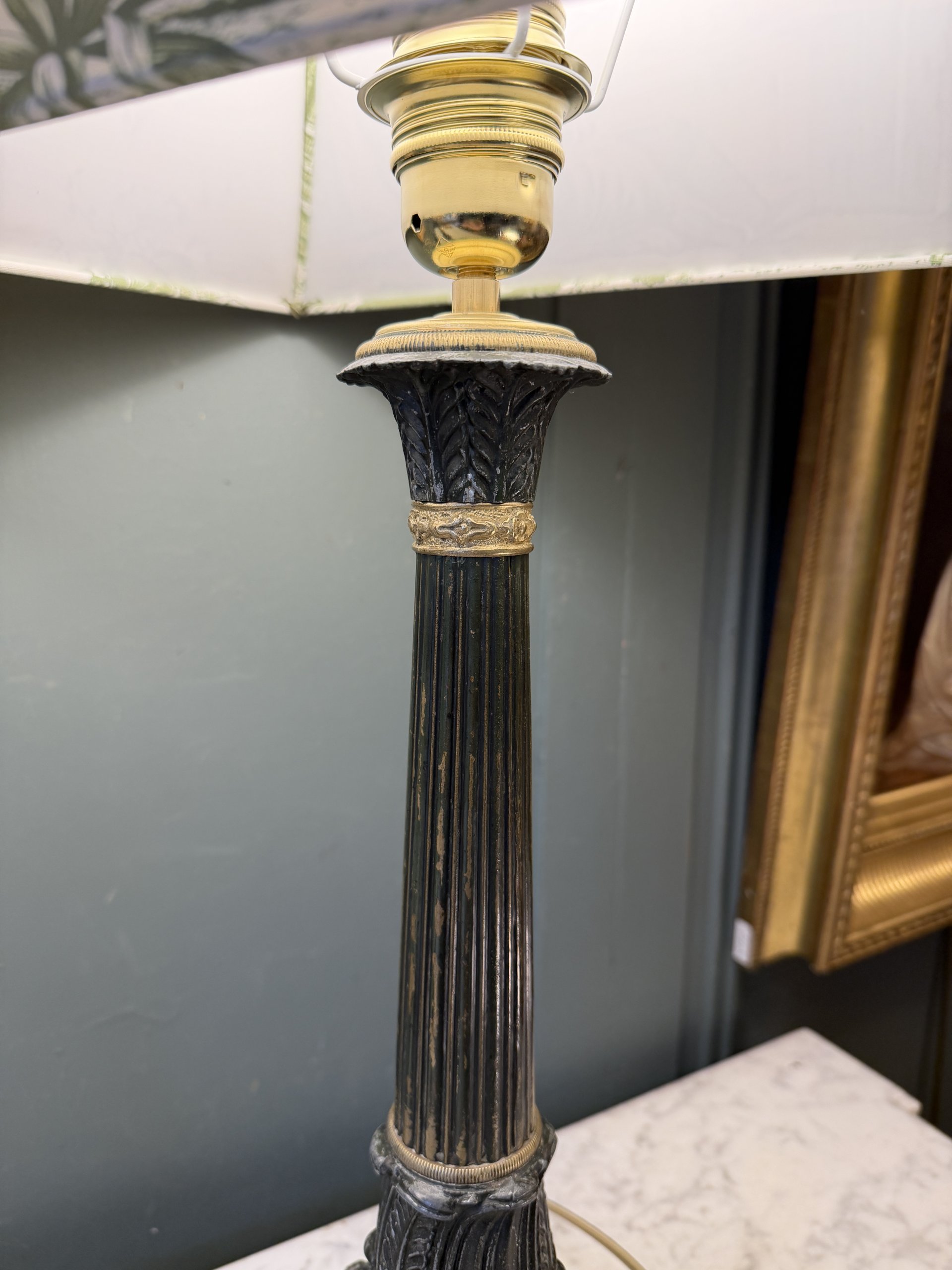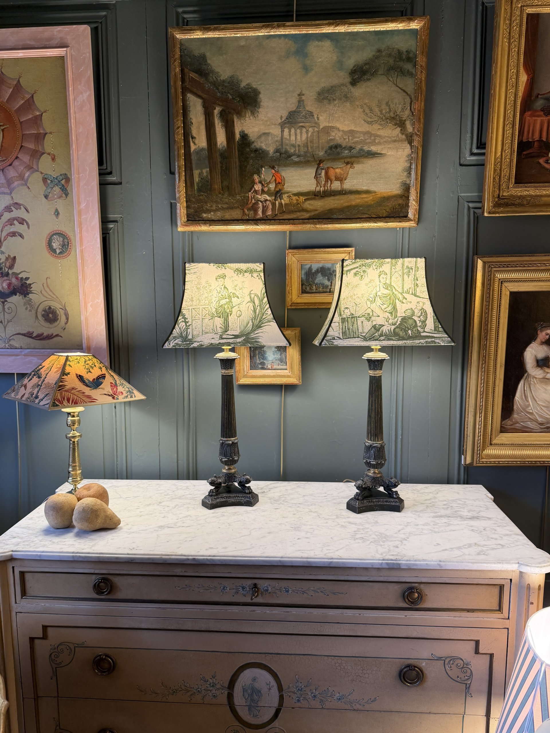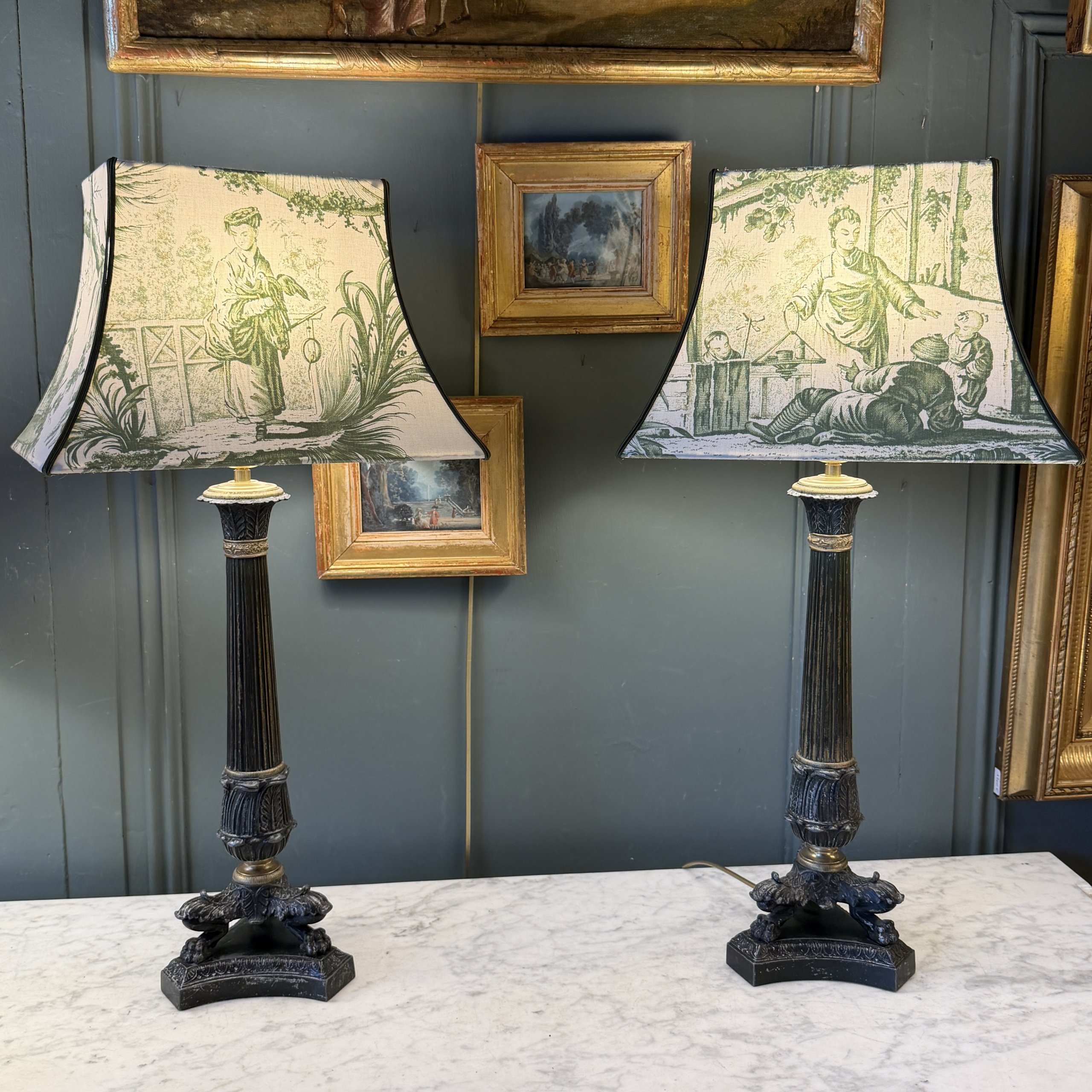 Grande paire de flambeaux époque Restauration (vers 1825) en laiton et fer blanc patiné (vert) montés en lampes.