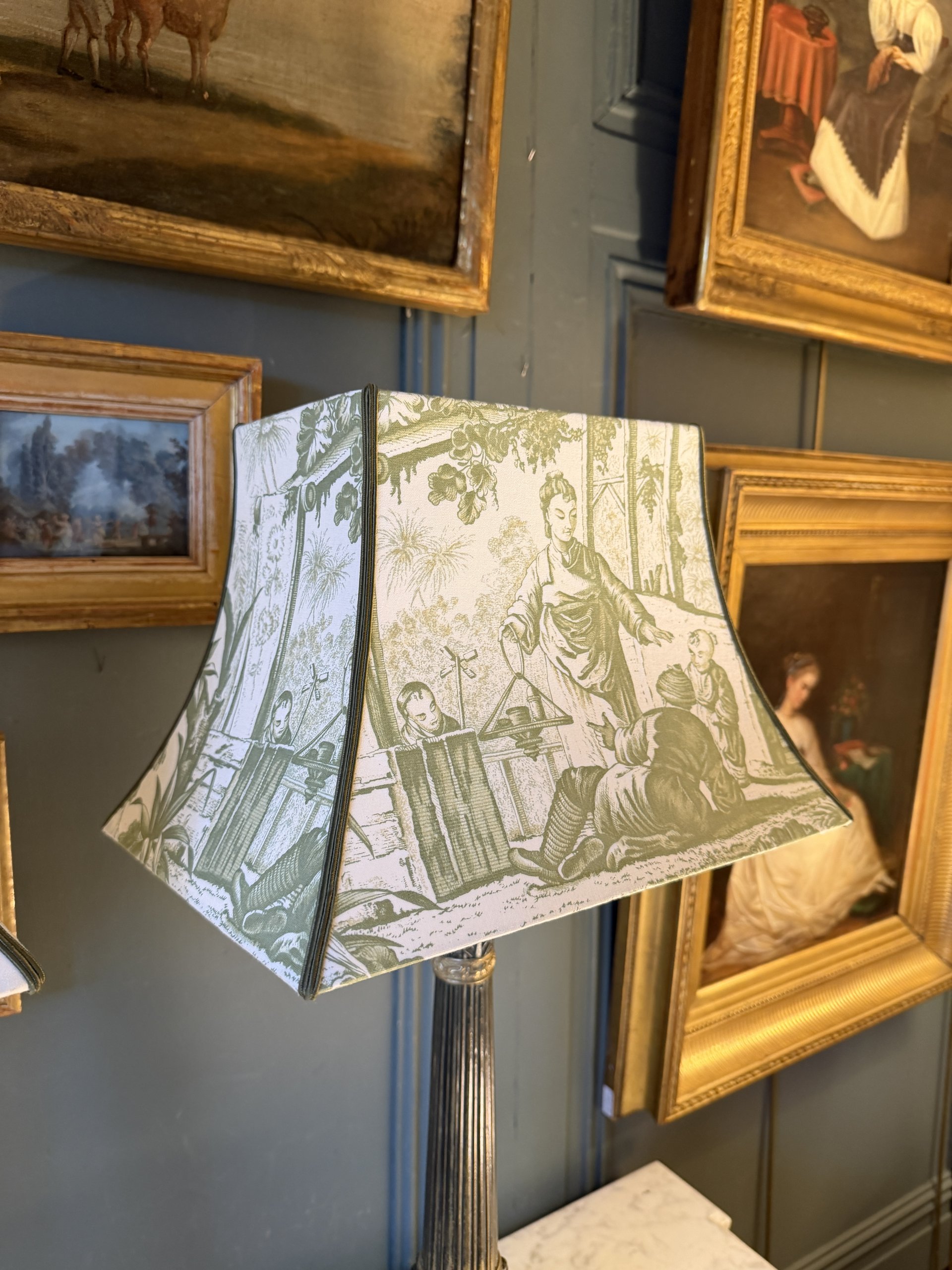 Les abat-jour de forme pagodes ont été créés à partir d’une toile de jouy à décor de personnages asiatiques dans les tons de vert.