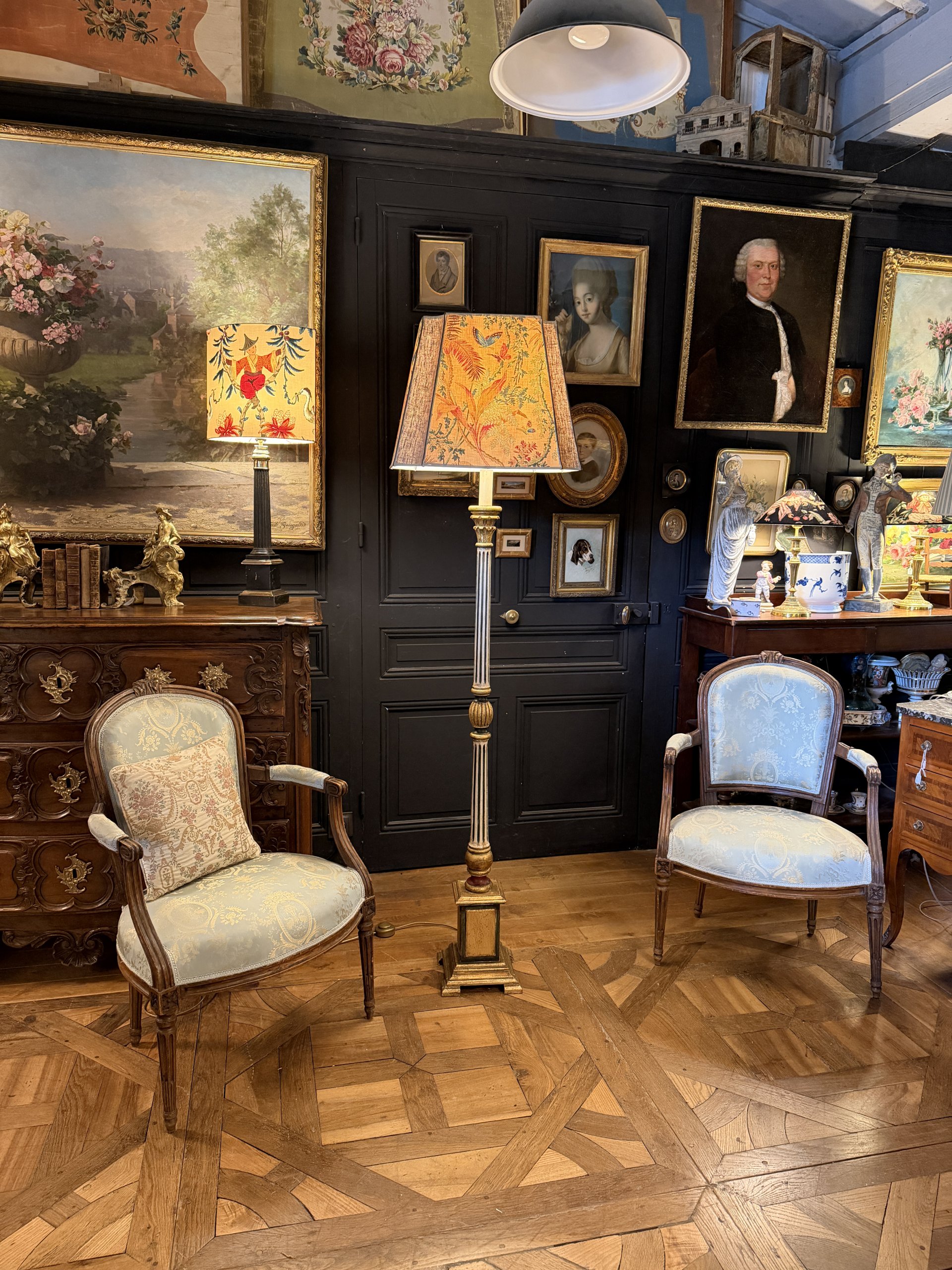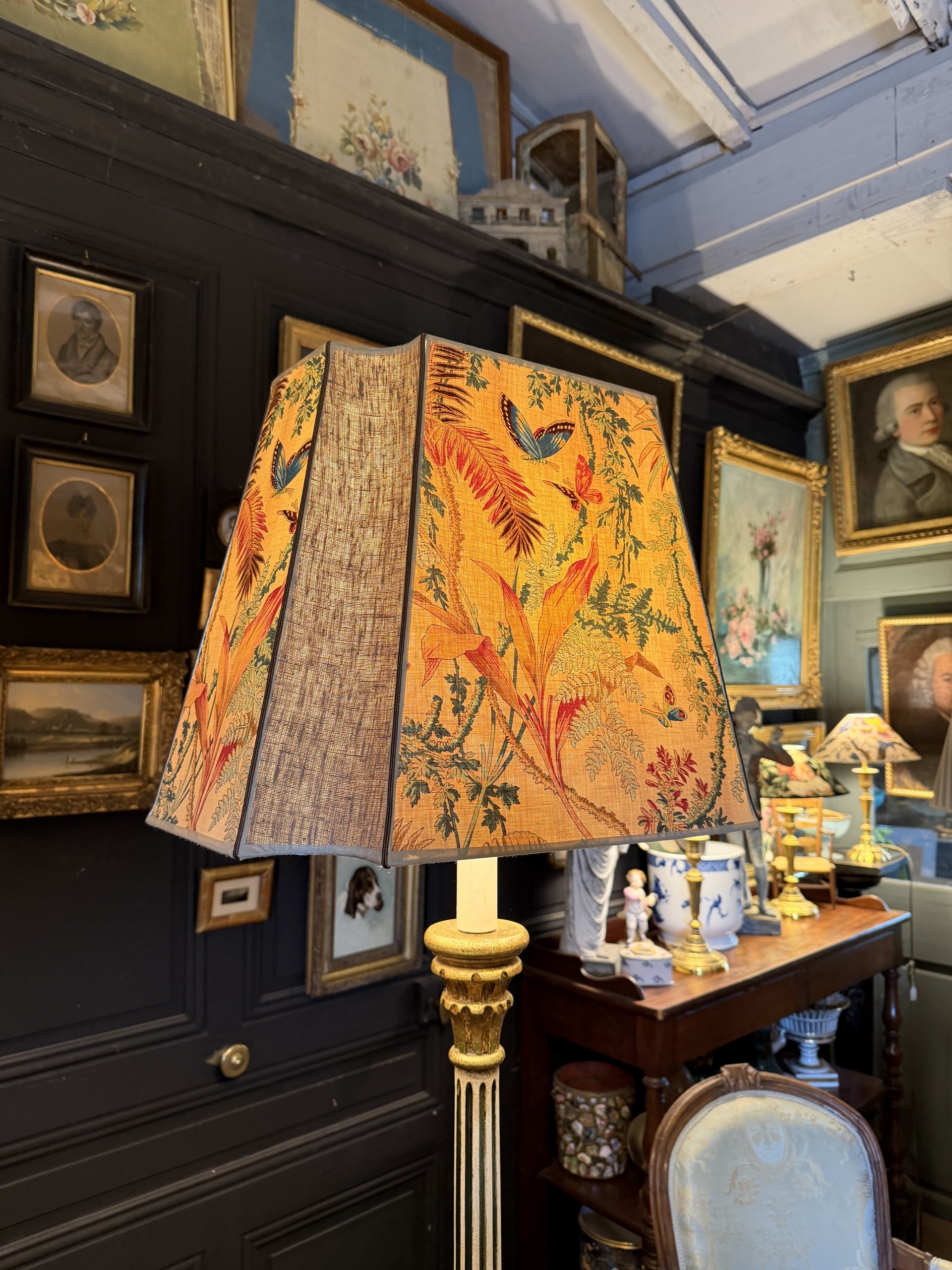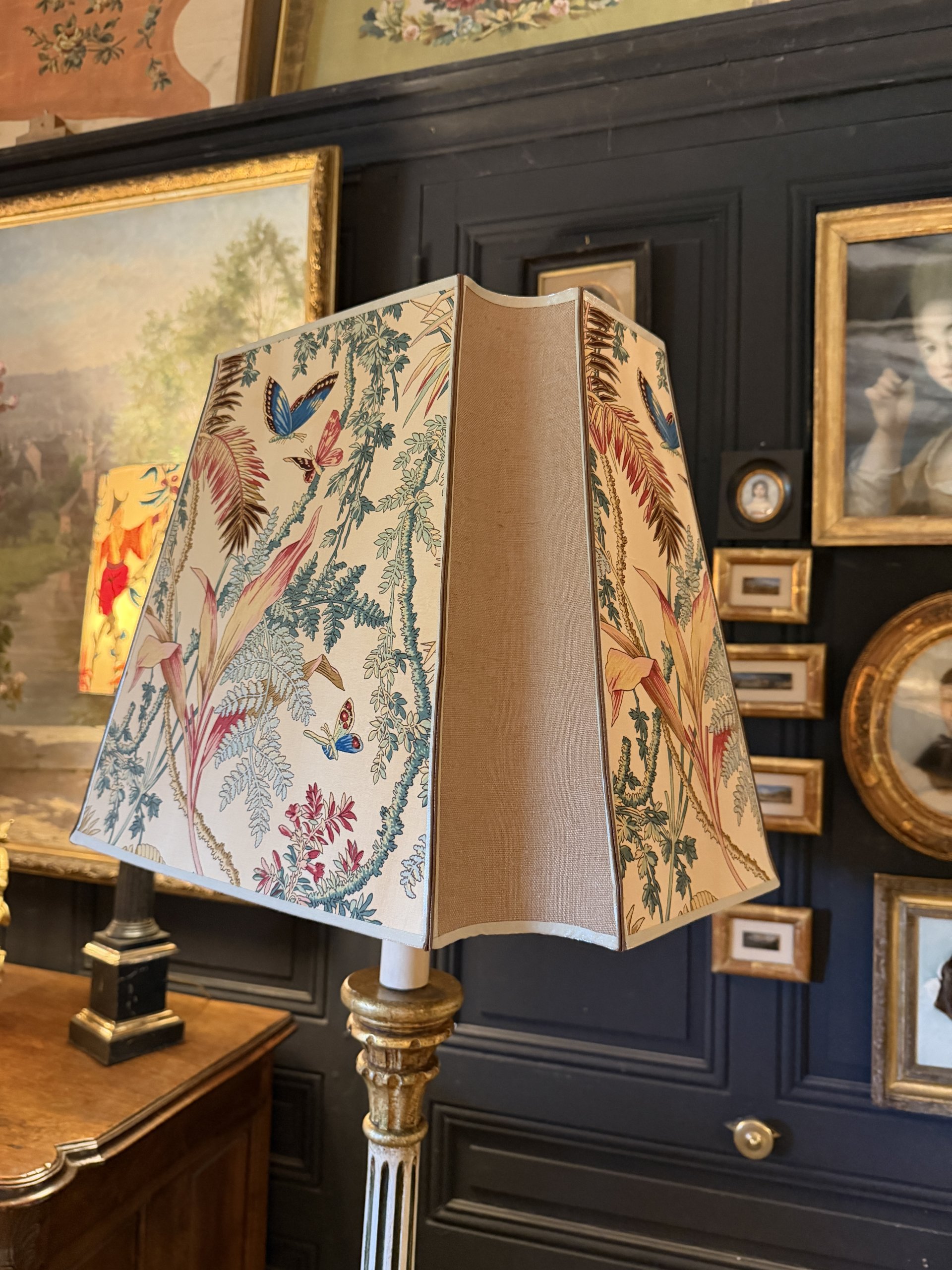 Son abat-jour de forme carré espagnol, a été créé à partir d’un tissu ancien de Braquenié « Papillons exotiques »