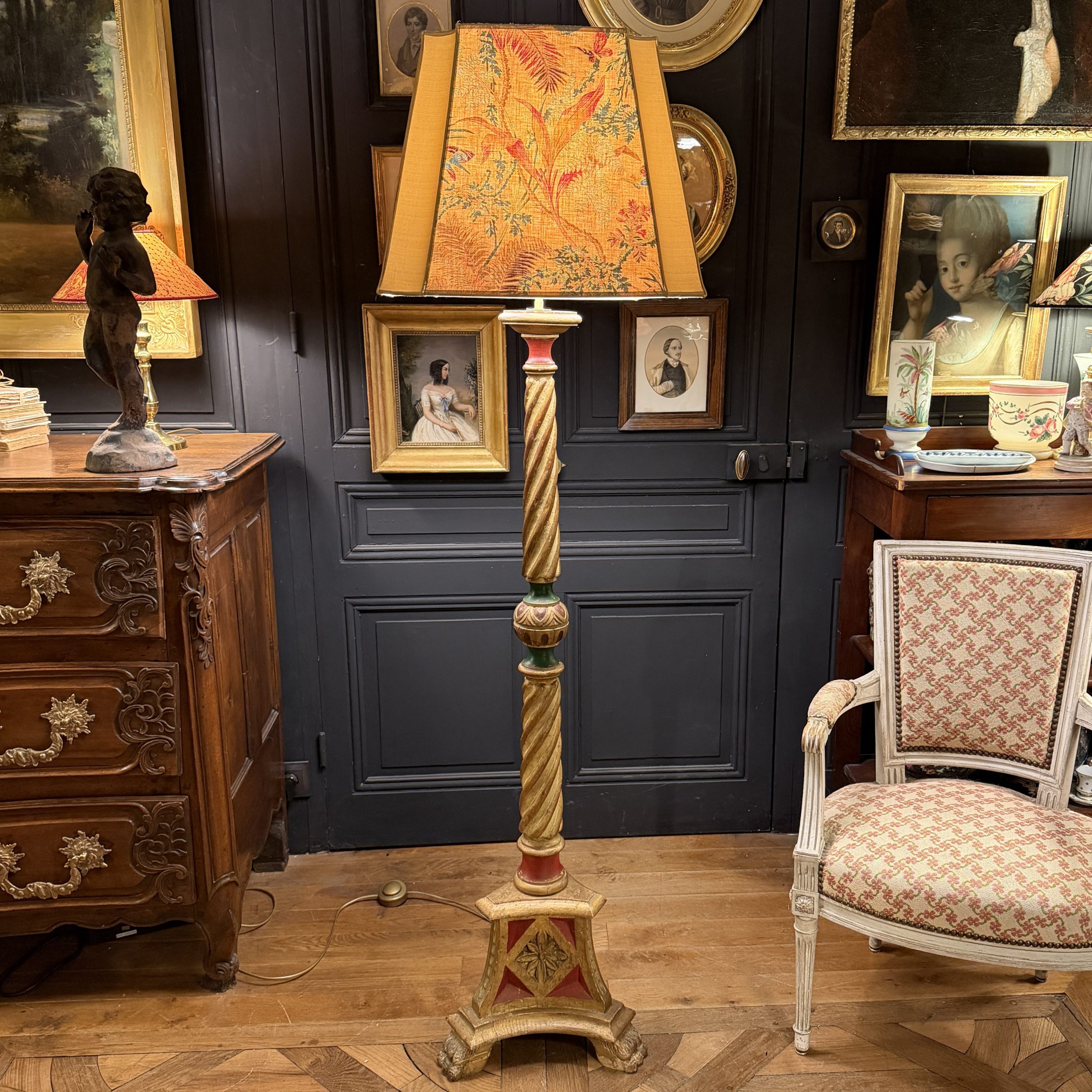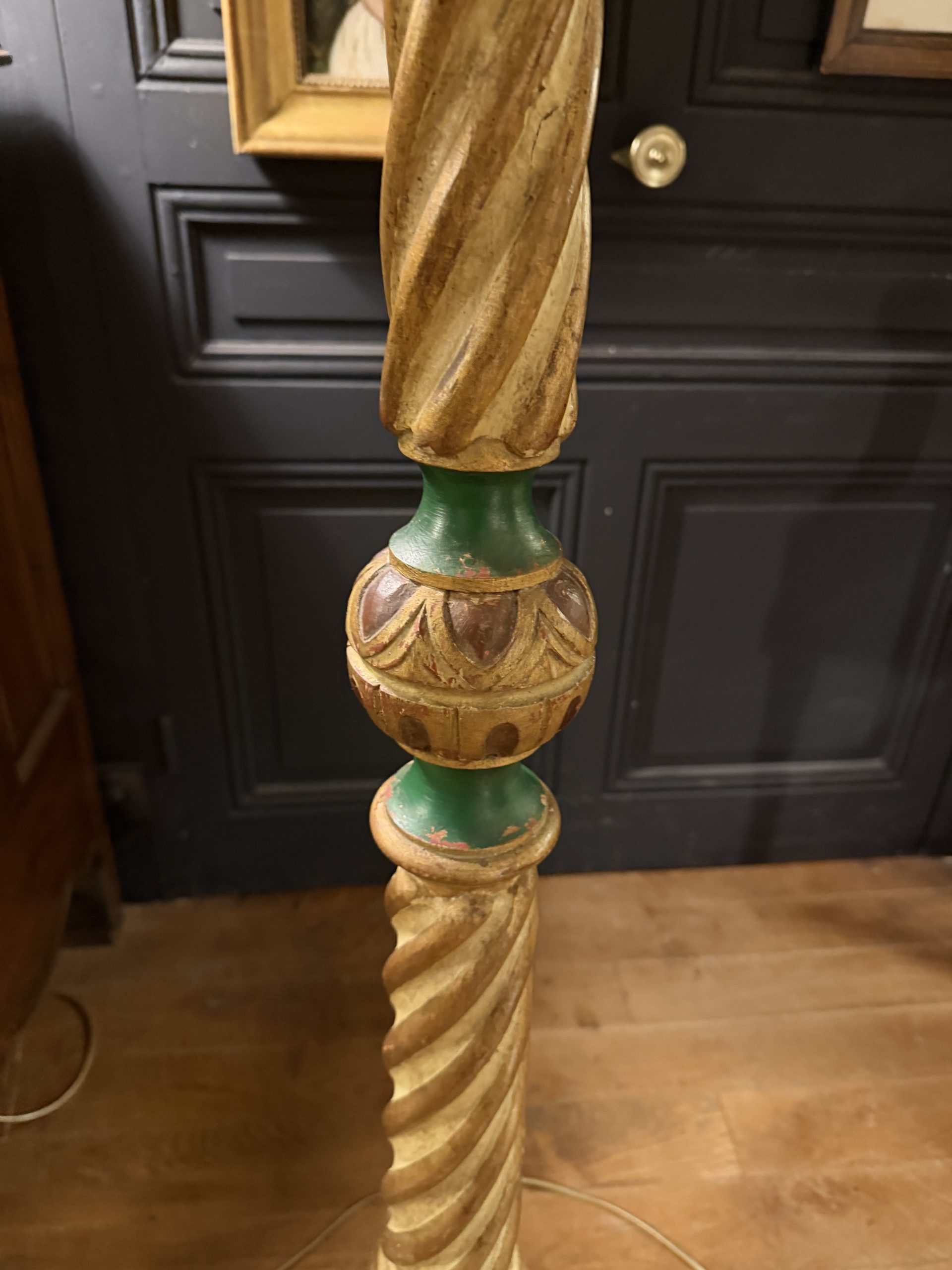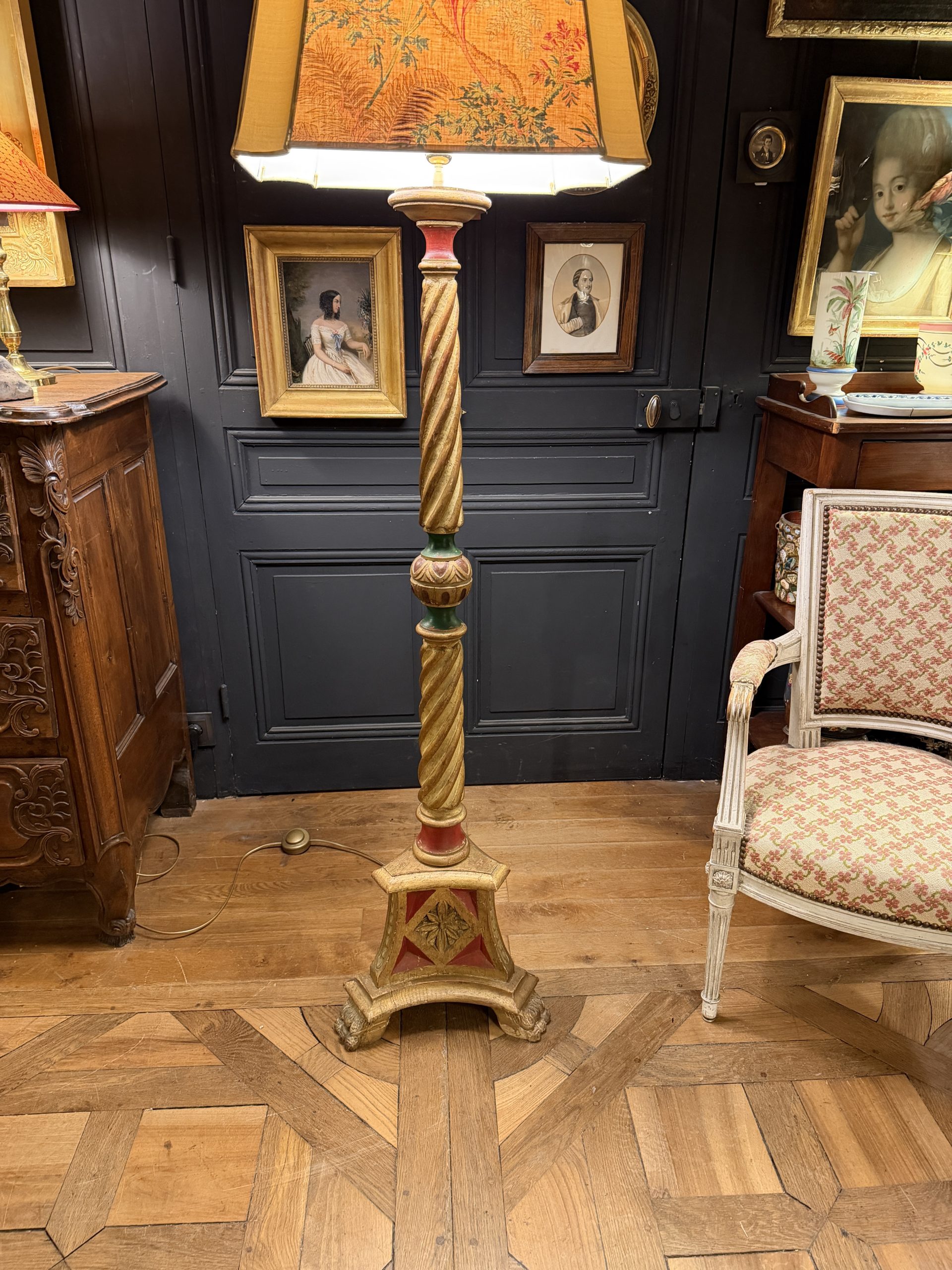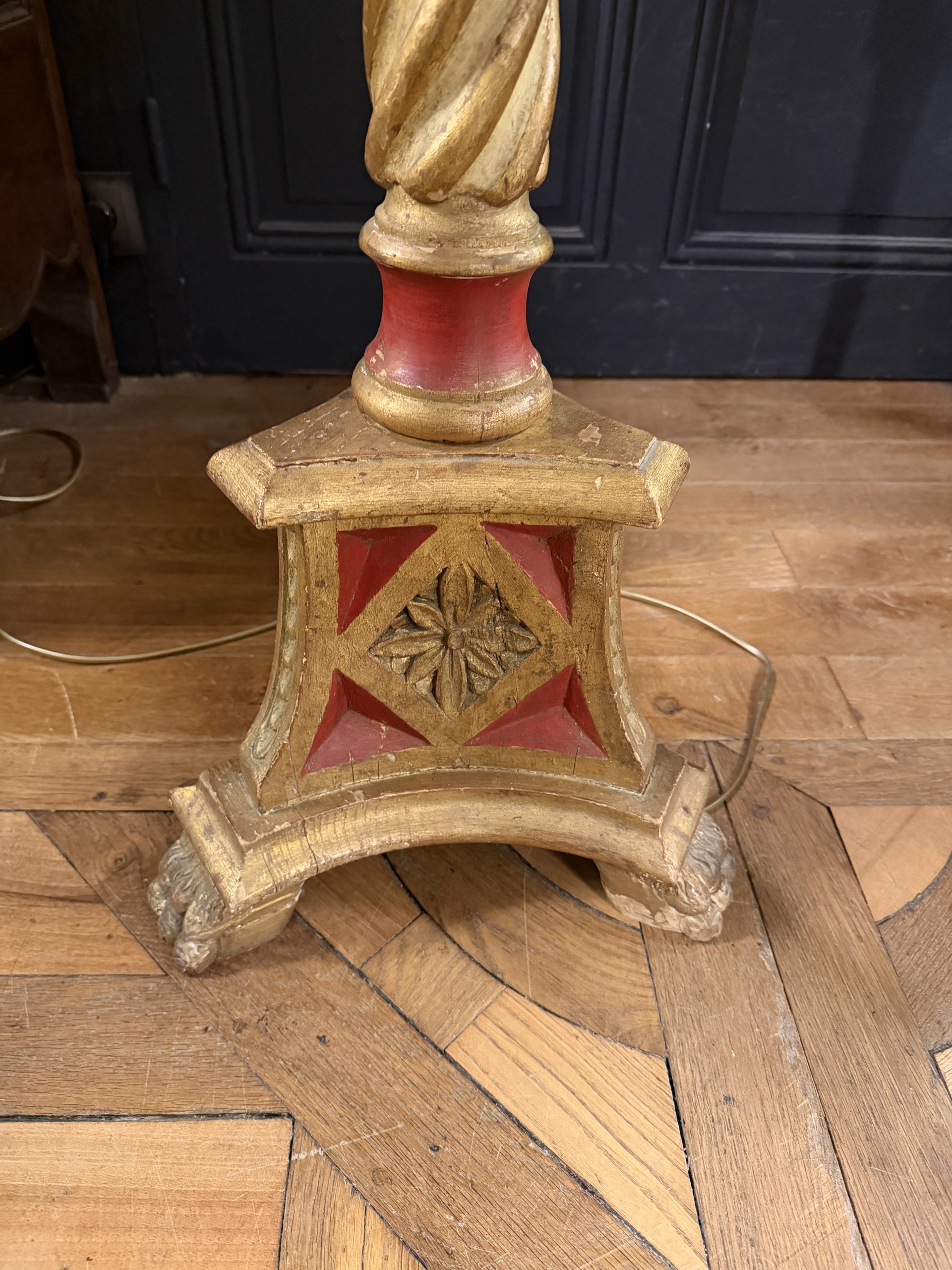 Lampadaire tripode en bois peint rouge, vert et doré époque XXème.