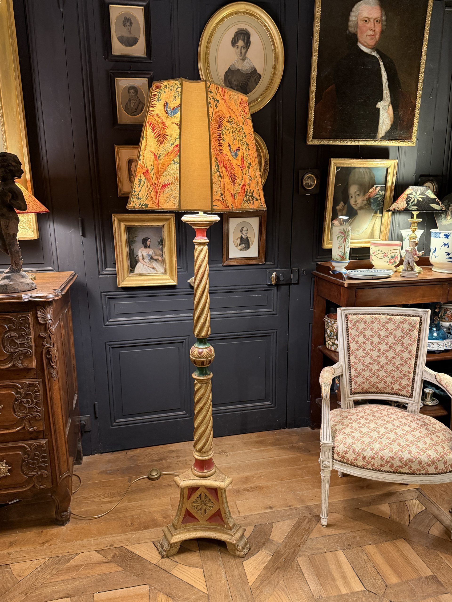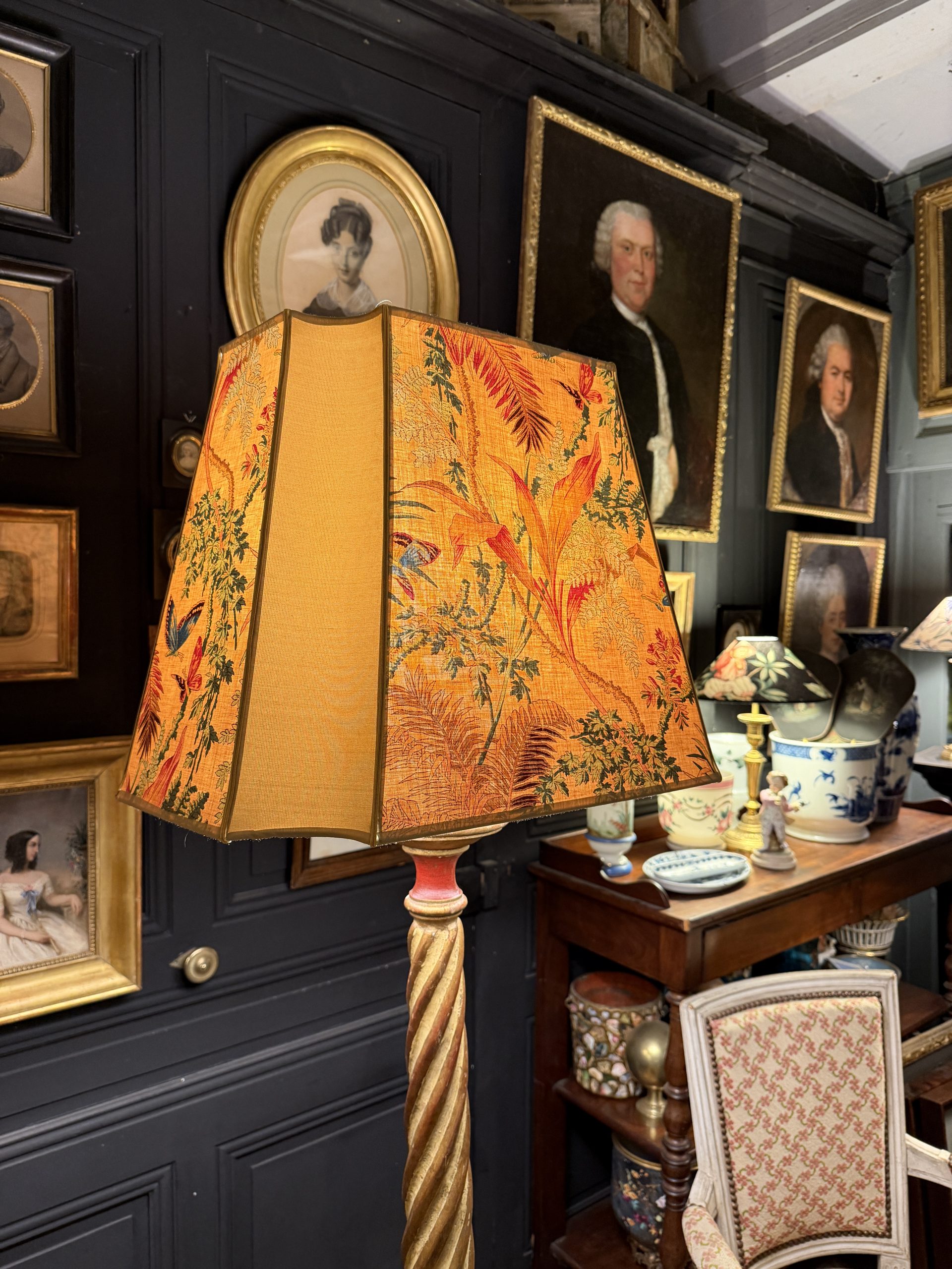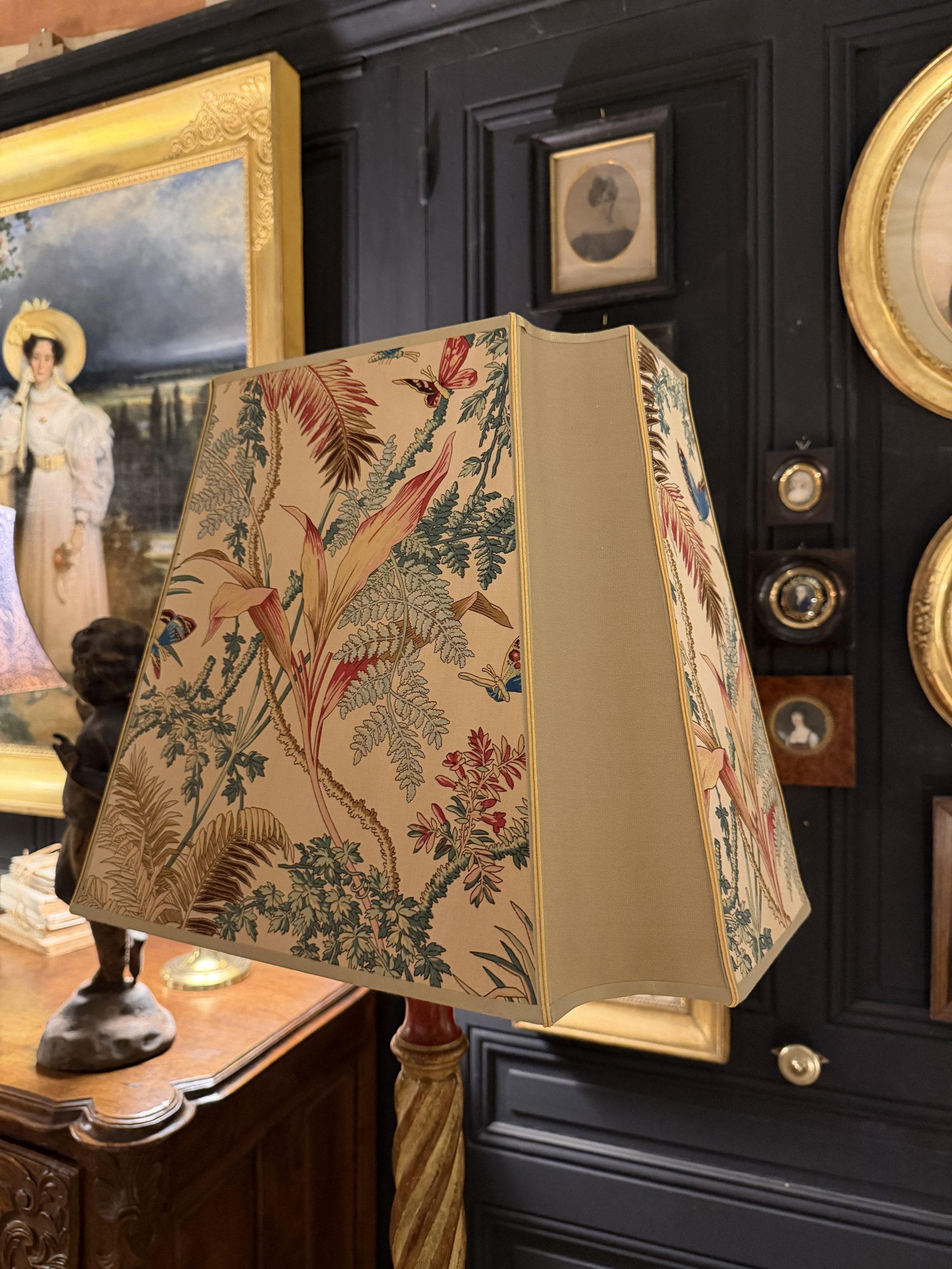 Son abat-jour de forme carrée espagnole à 8 pans a été créé à partir d’un tissu ancien de Braquenié « Papillons exotiques » à décor floral et de papillons