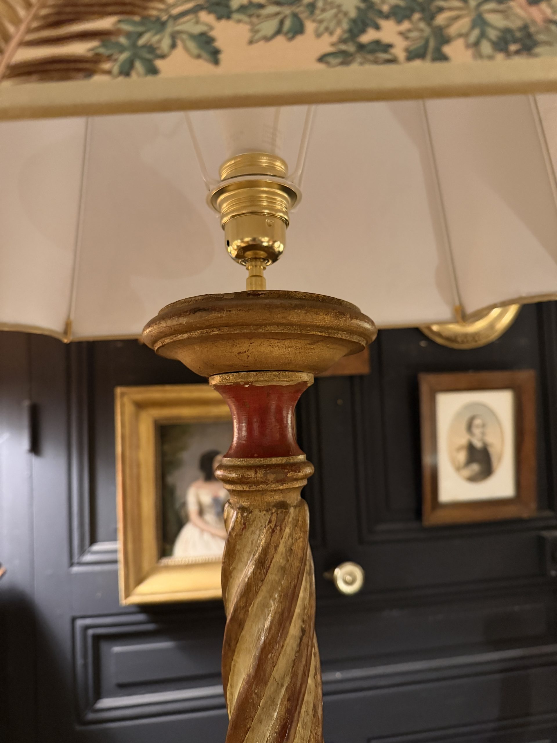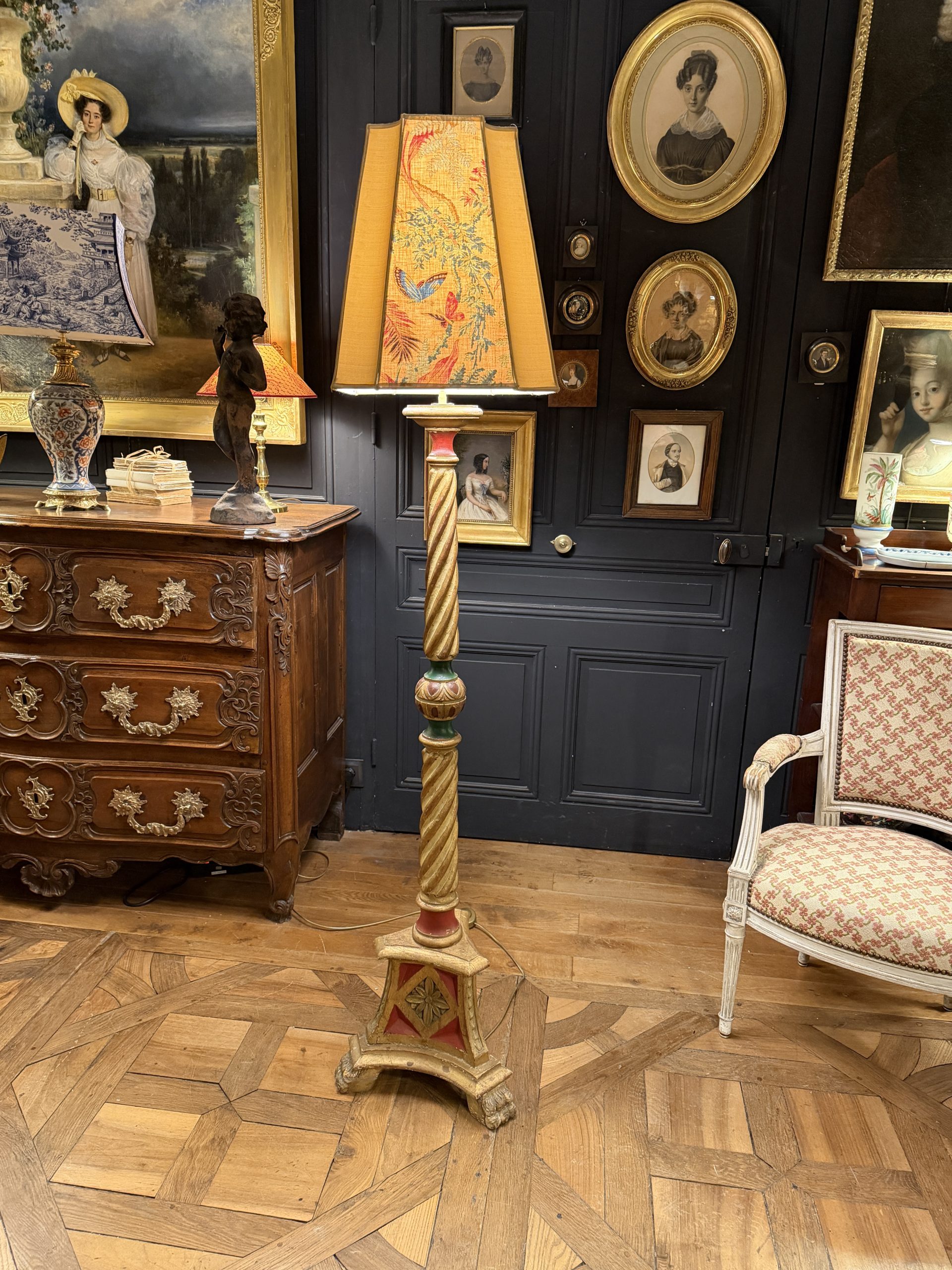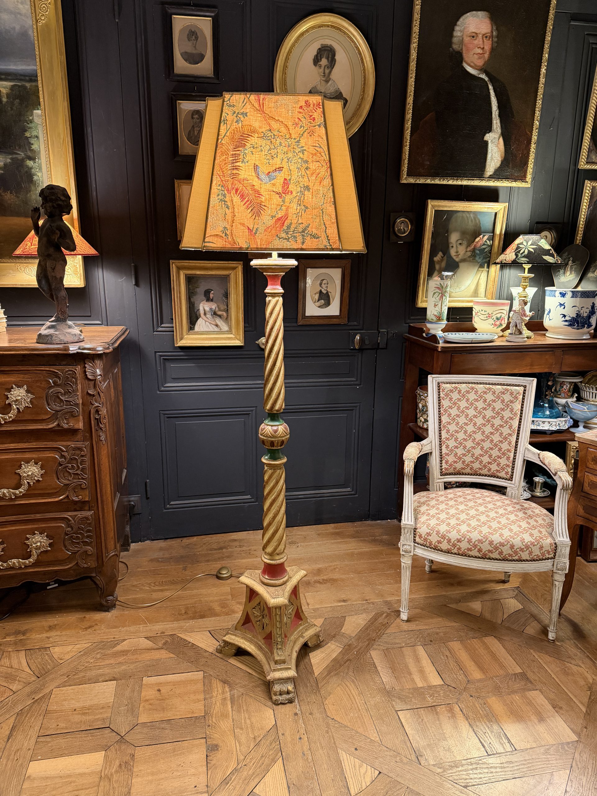 Son abat-jour de forme carrée espagnole à 8 pans a été créé à partir d’un tissu ancien de Braquenié « Papillons exotiques » à décor floral et de papillons