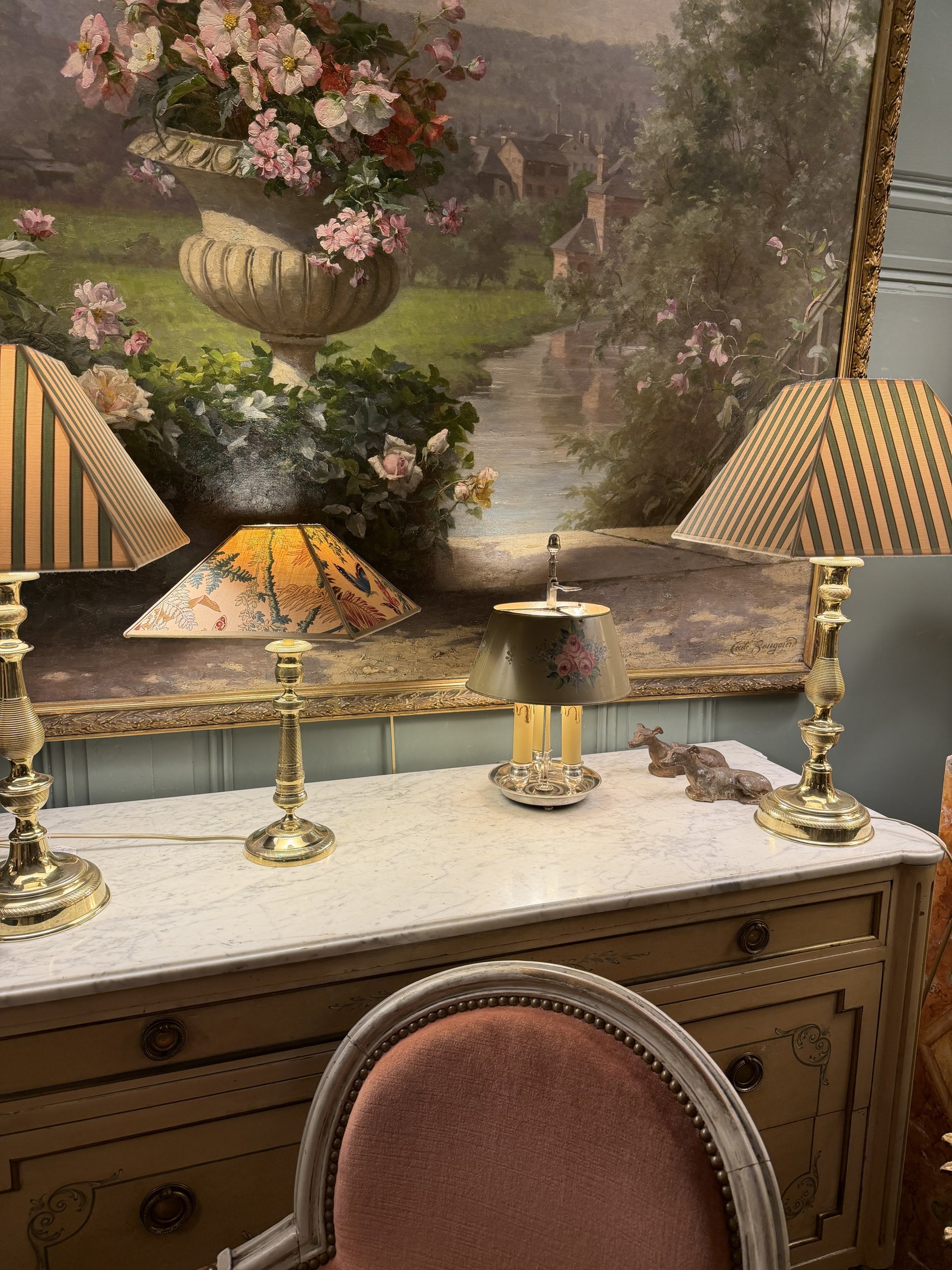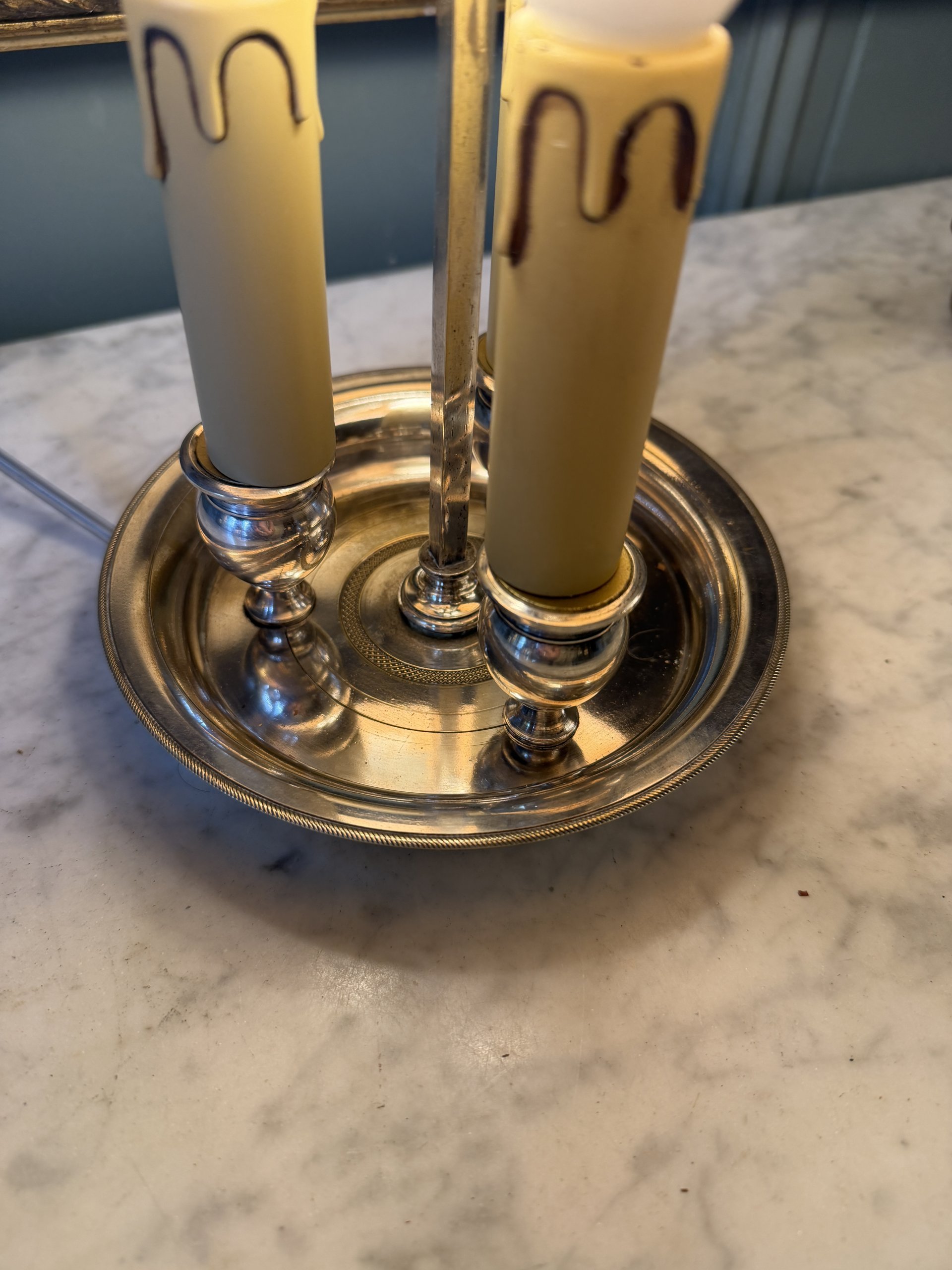 Lampe bouillotte à trois feux en tôle peinte et bronze argenté époque début XXème.