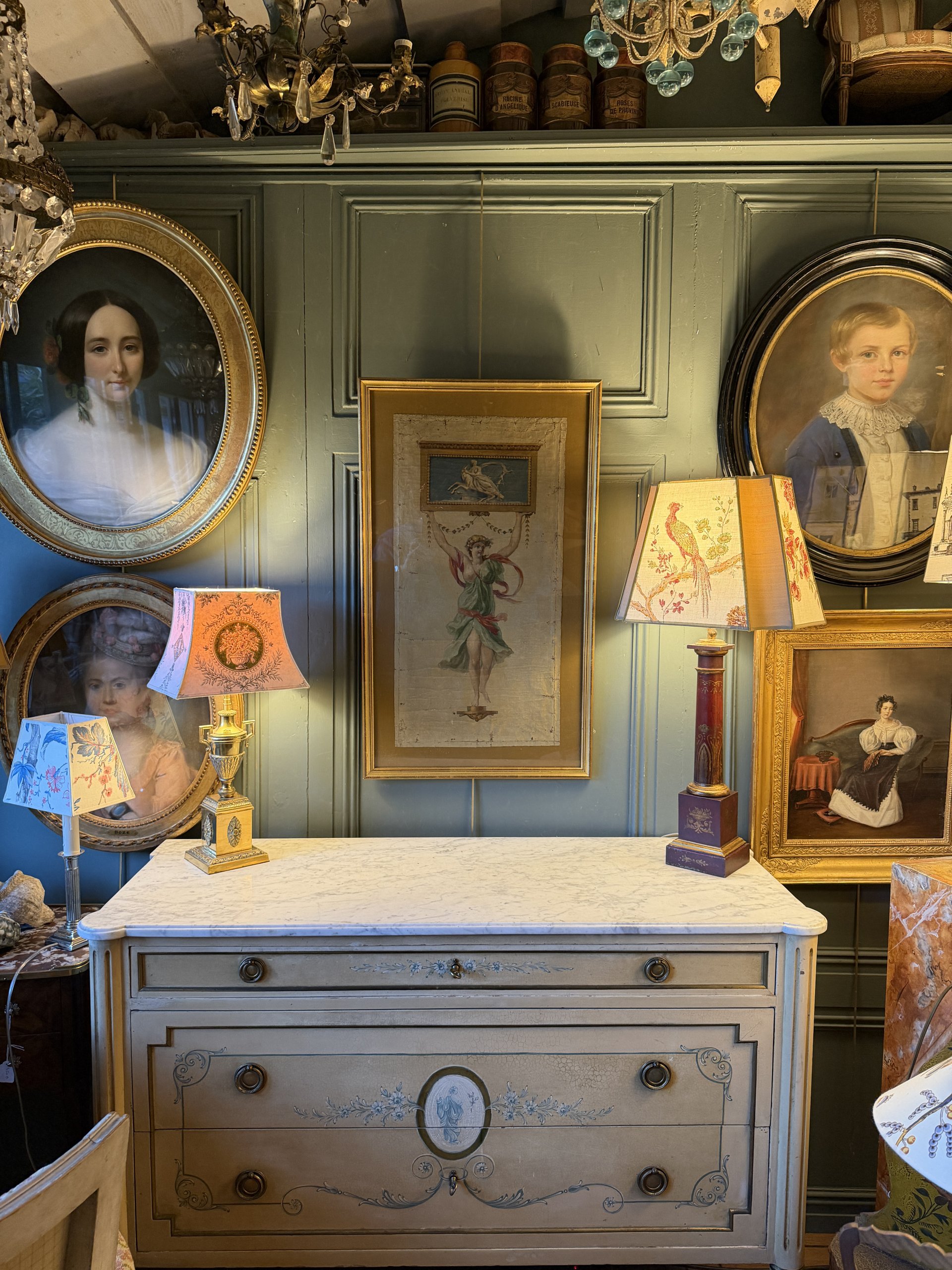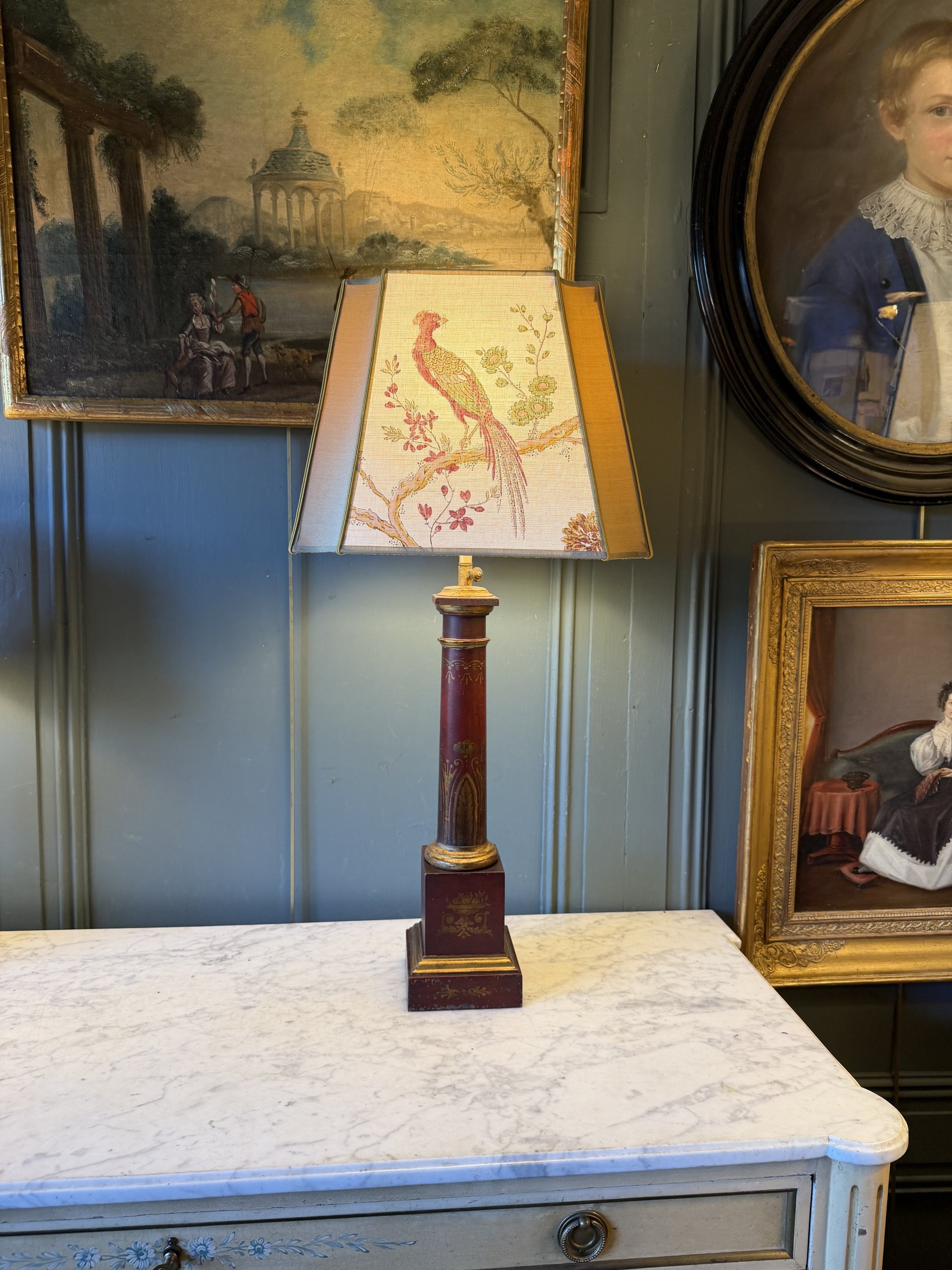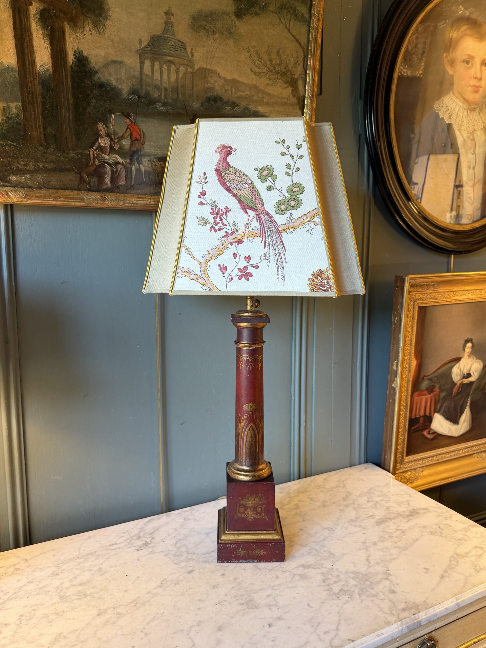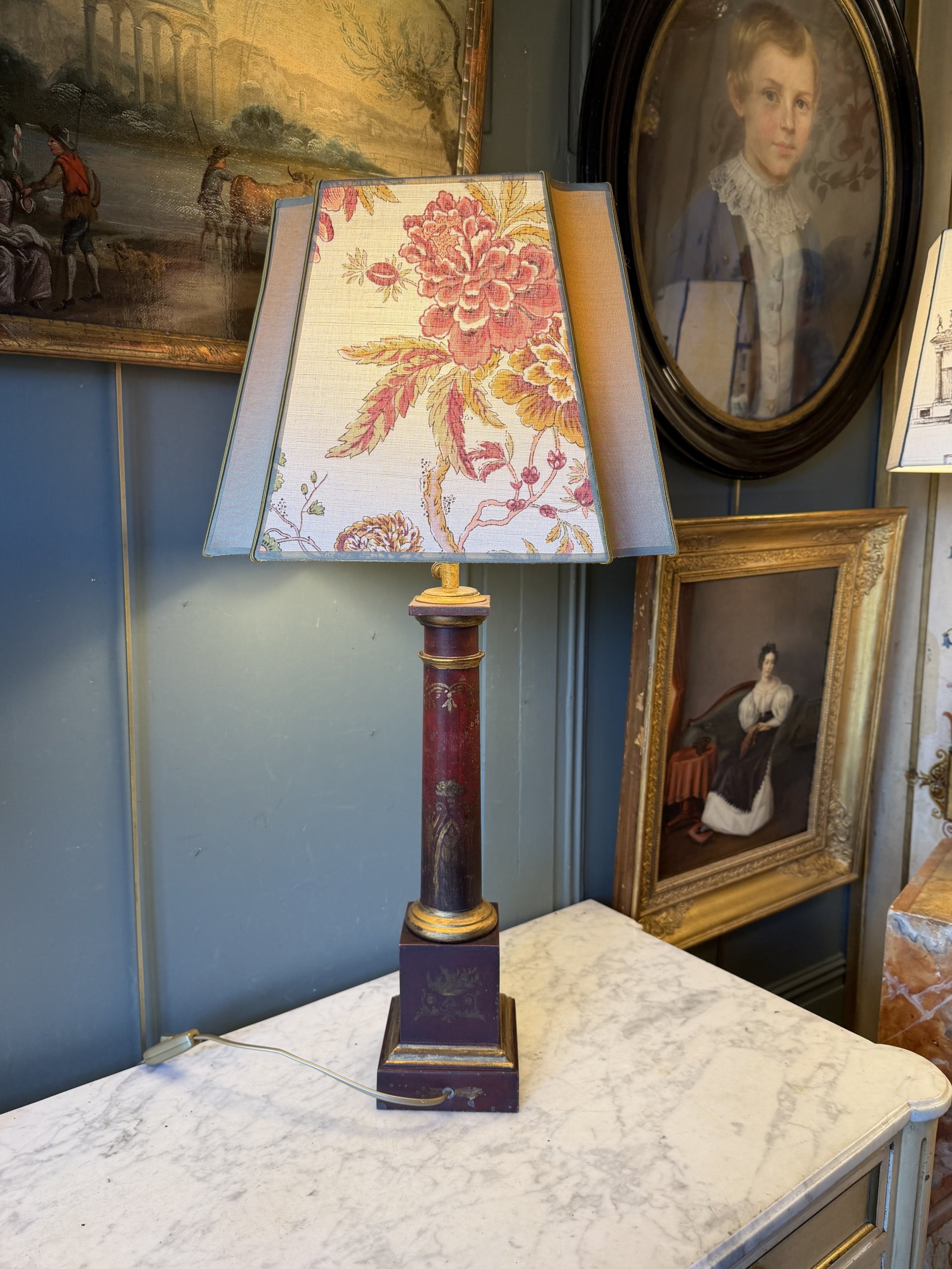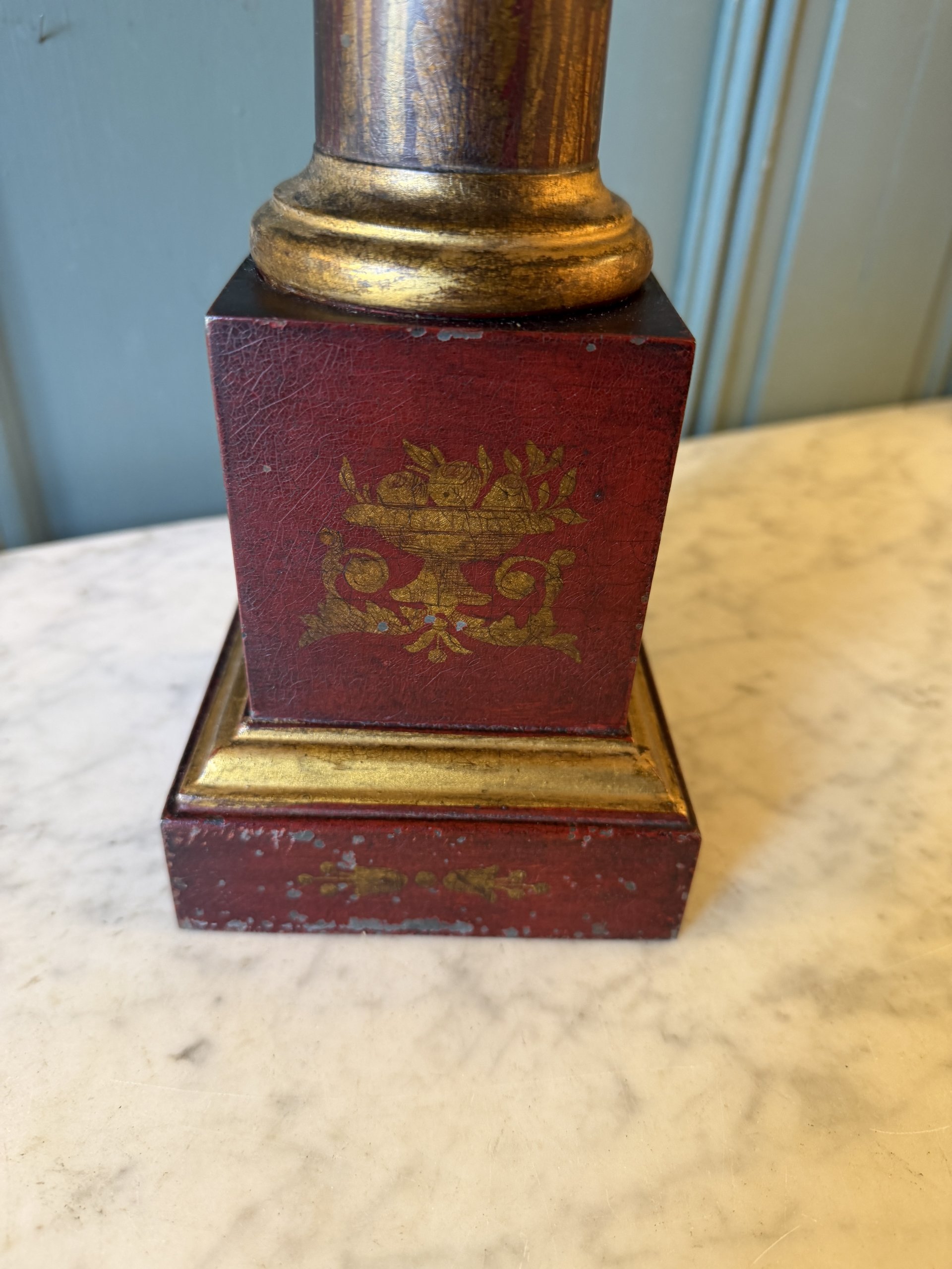 Le fût et la base sont ornés de décor d’arabesques, de feuilles d’acanthes et de bouquets de fleurs dans des vases à l’antique peint en doré.