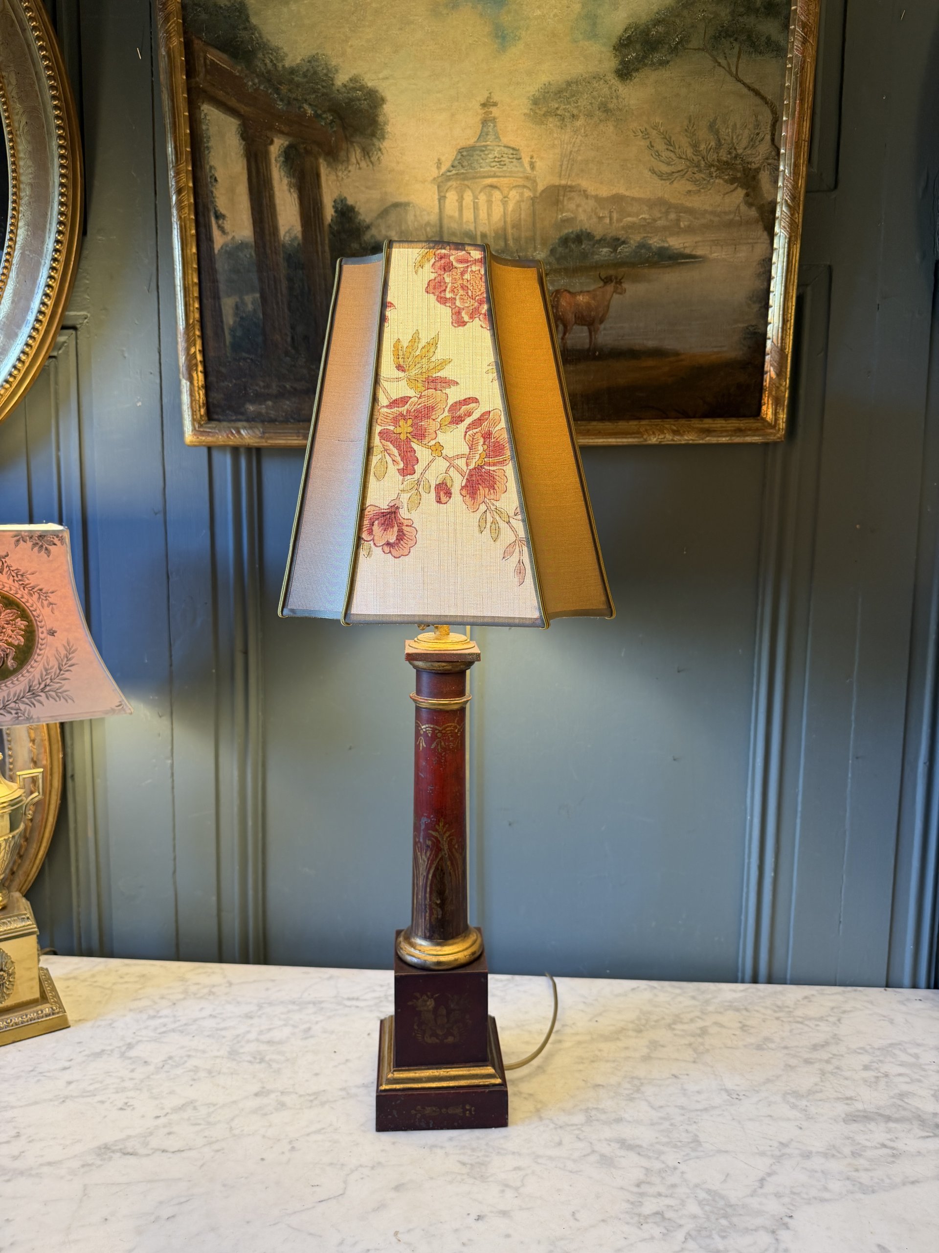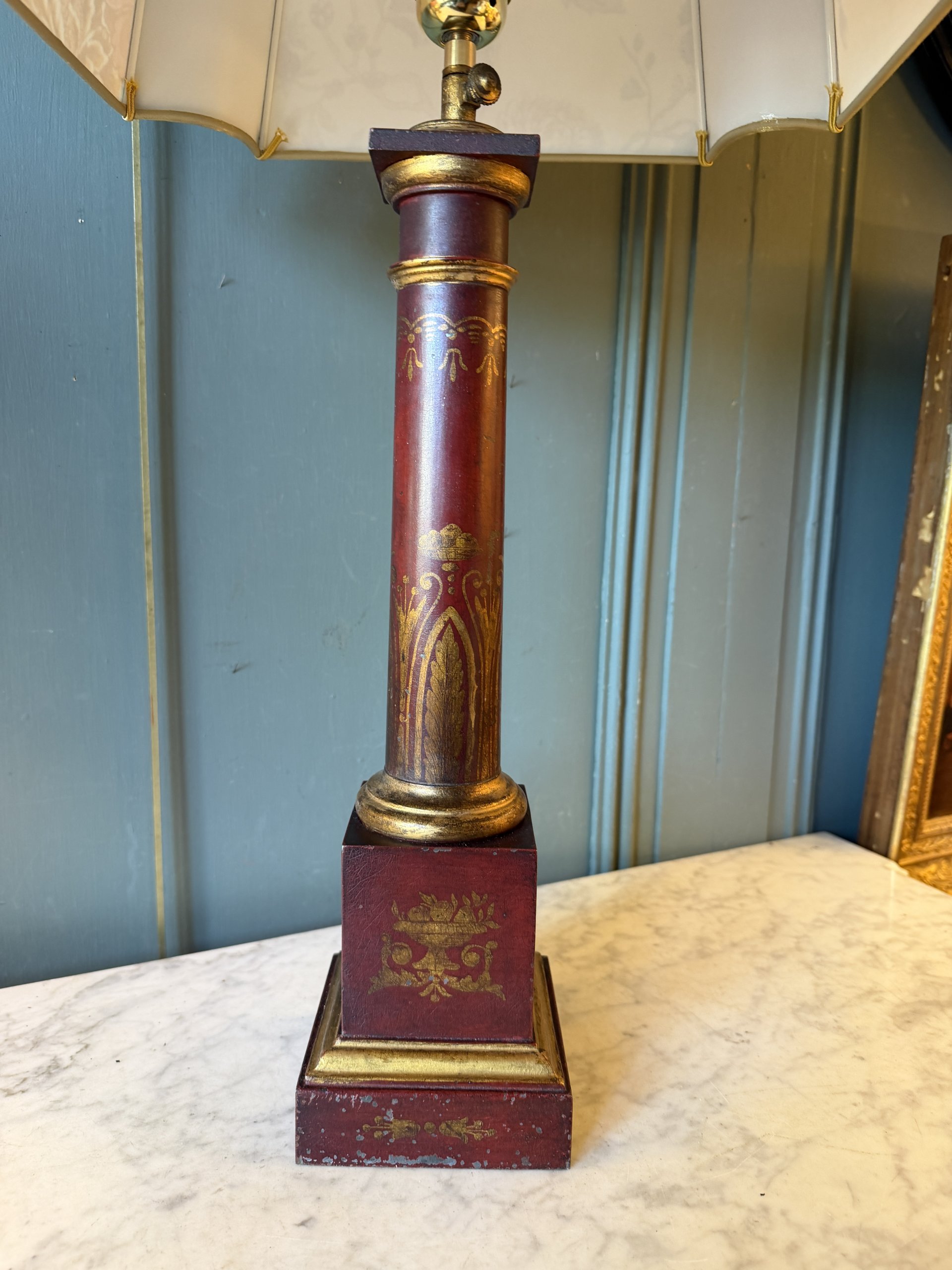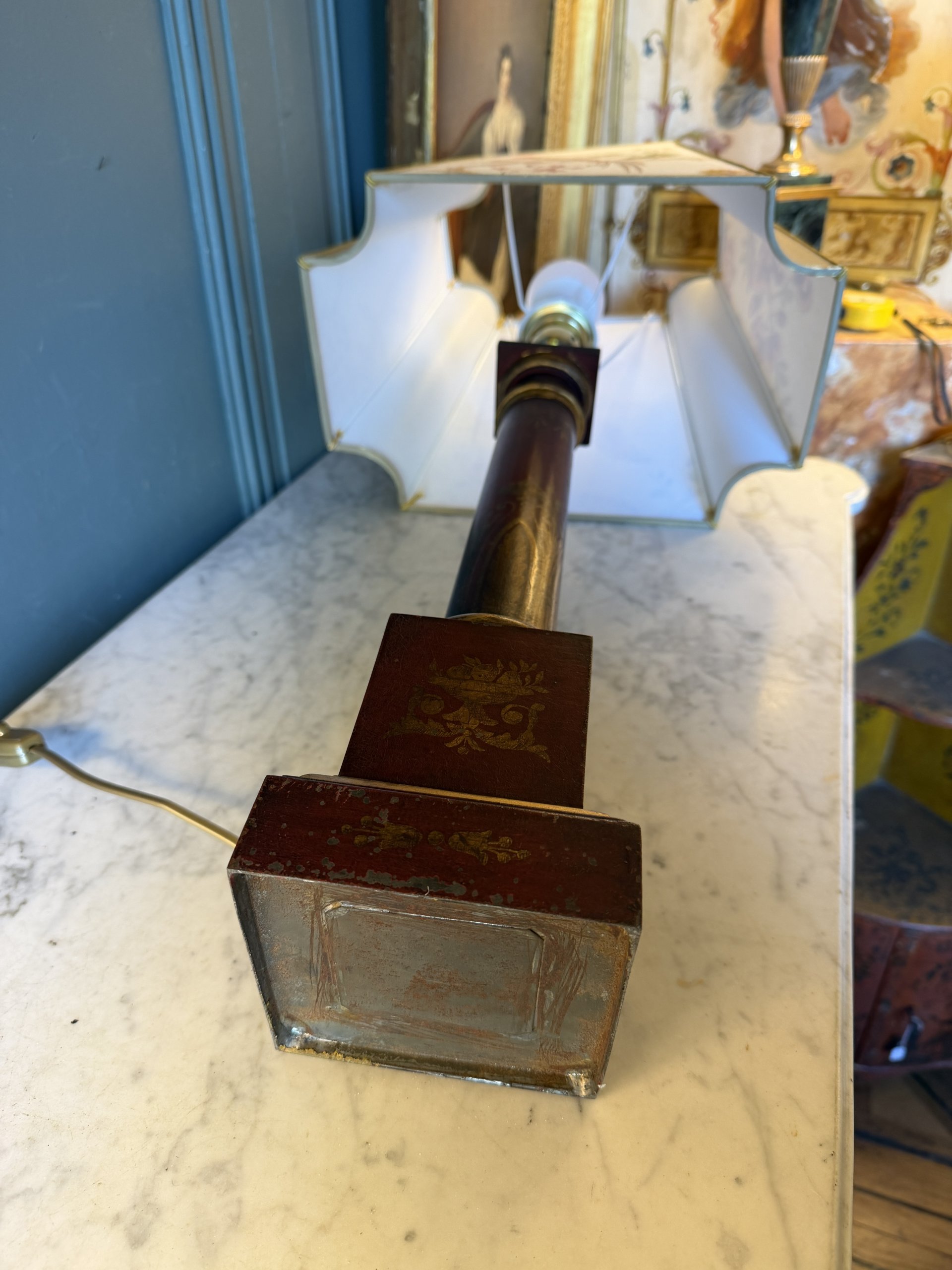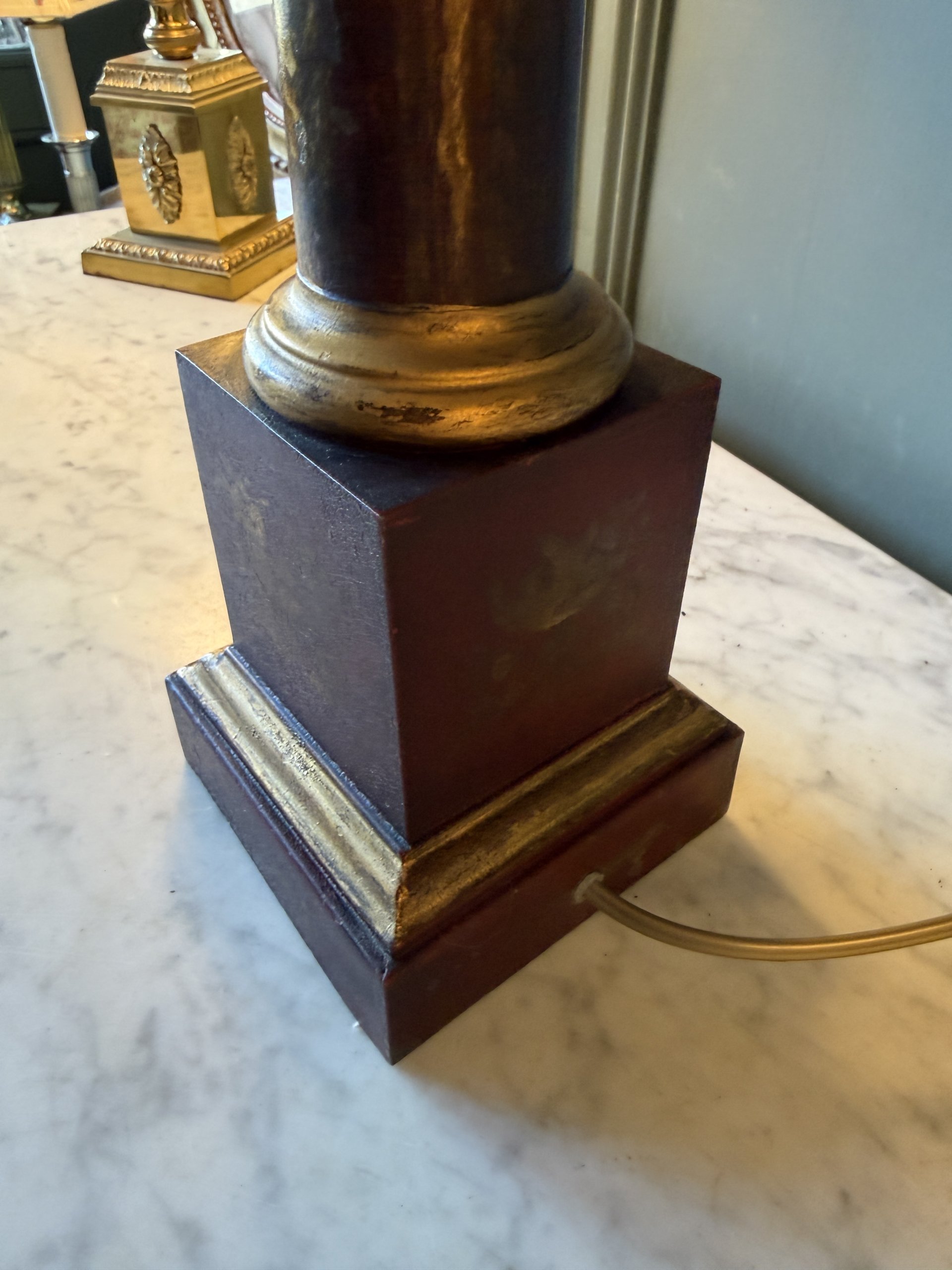 Lampe « Carcel » en tôle peinte de couleur « sang de boeuf », formant une colonne d’ordre Toscan stylisée.
