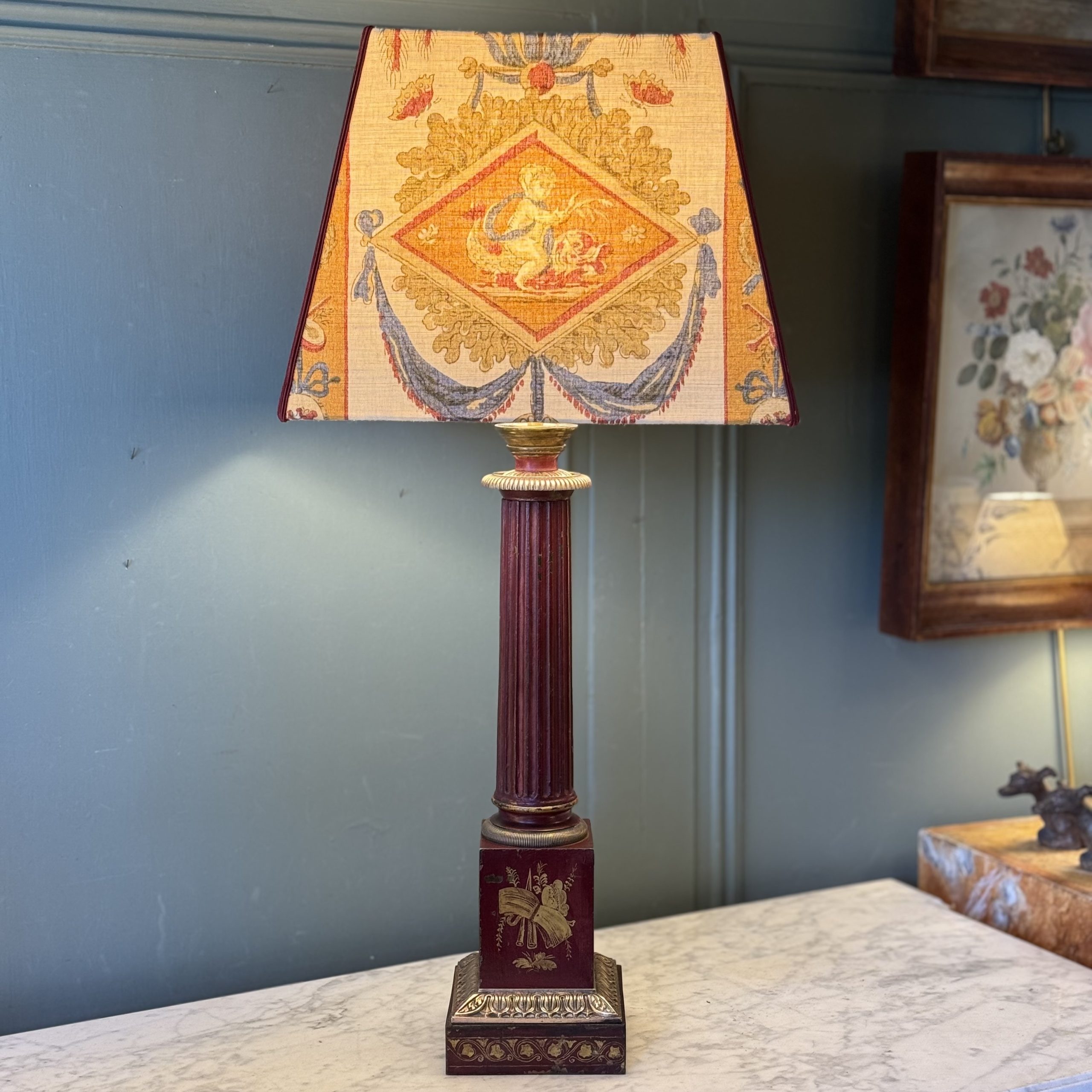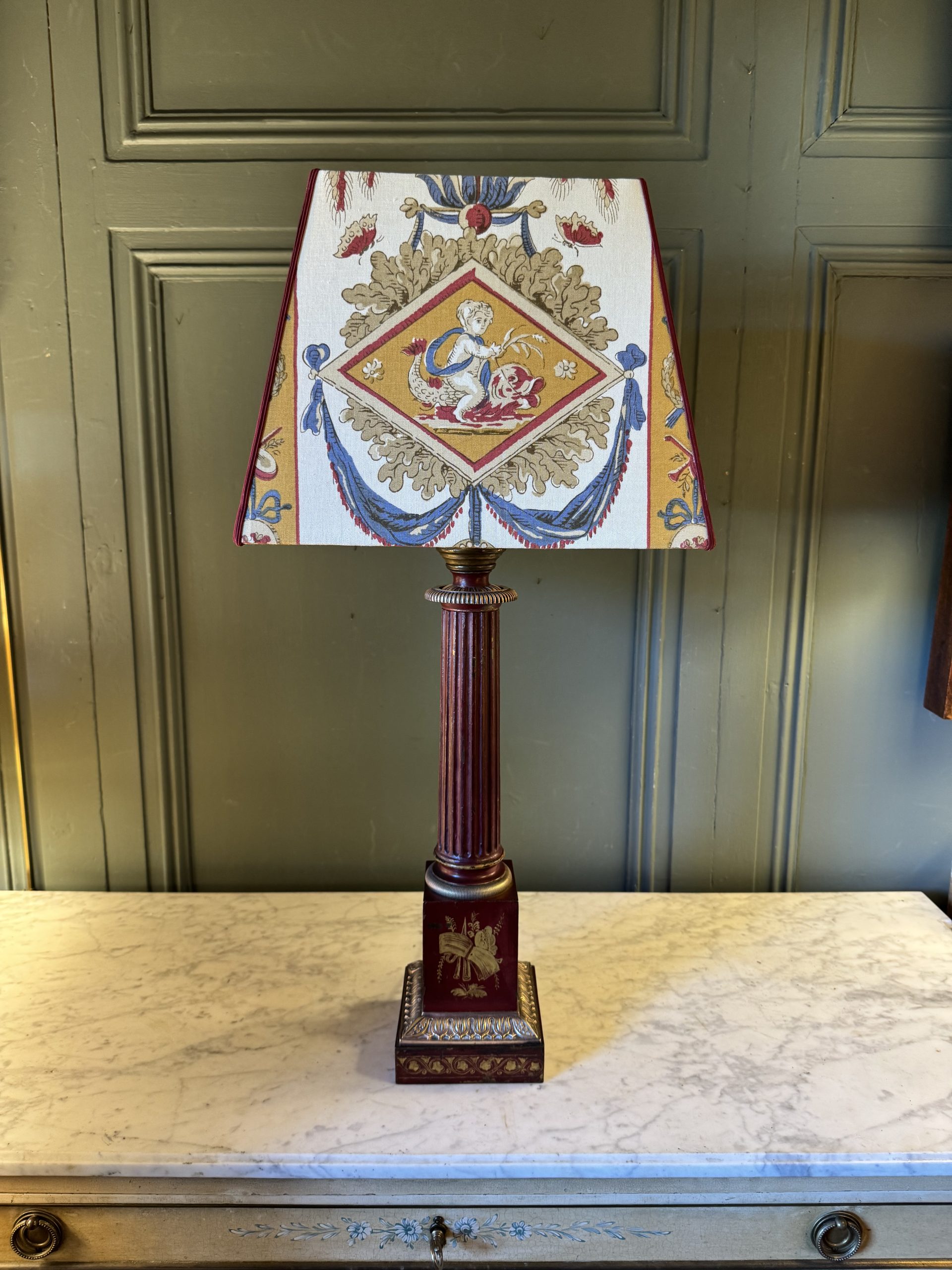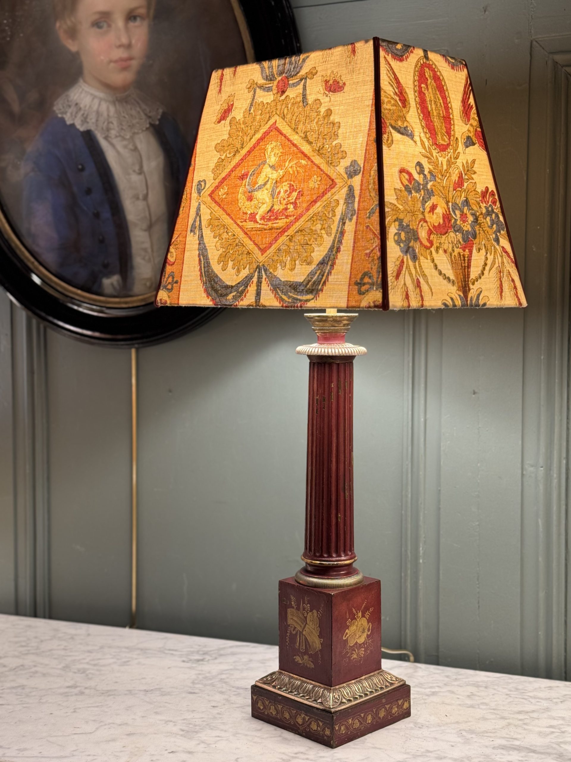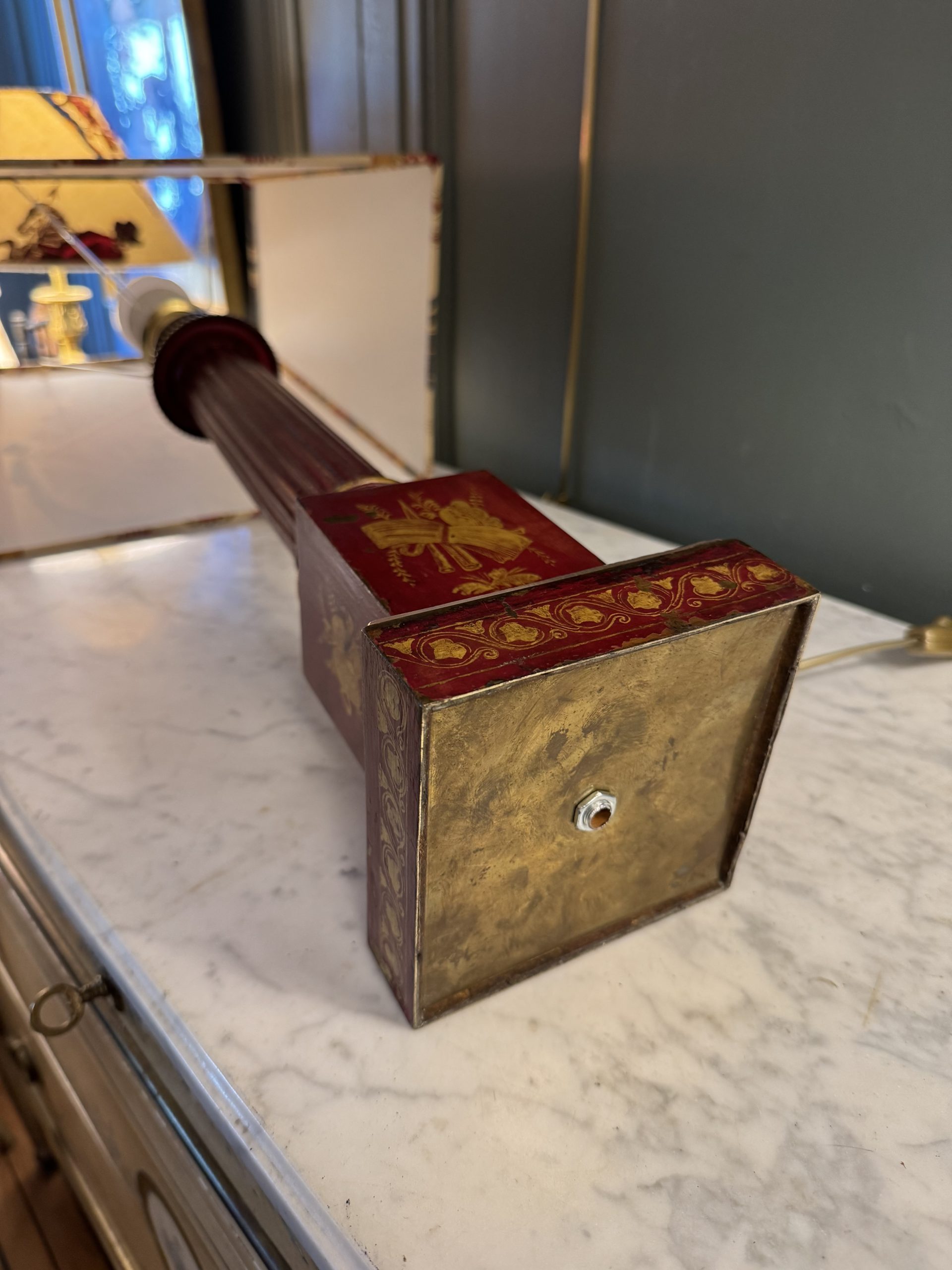 Lampe « Carcel » en tôle peinte formant une colonne d’ordre Dorique stylisée, époque Restauration première partie du XIXème.