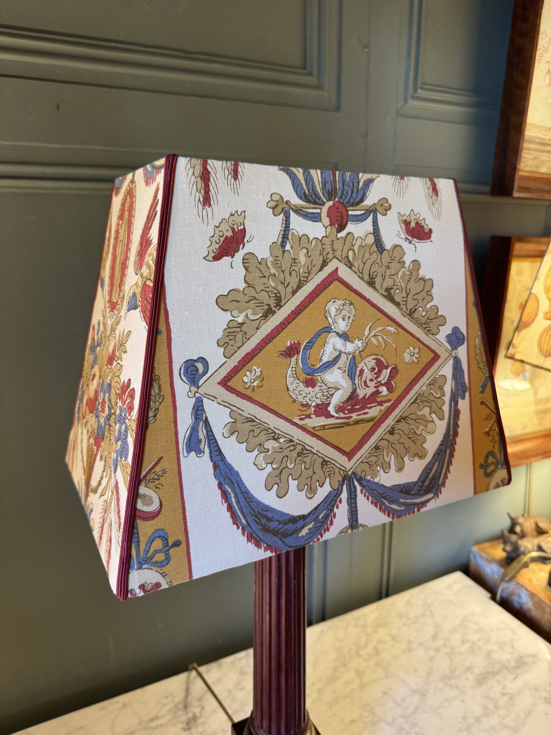 Son abat-jour de forme rectangulaire, a été créé à partir d’un tissus de chez Braquenié à décor « A l’Antique ».