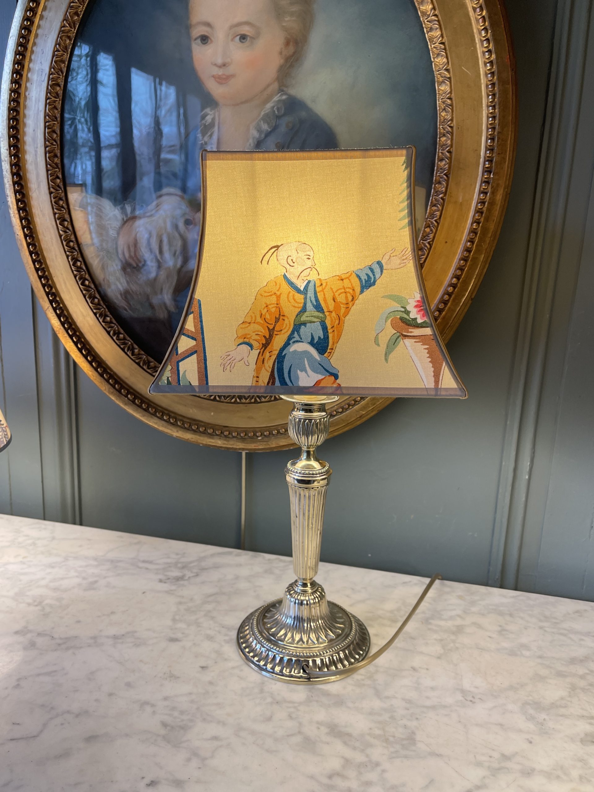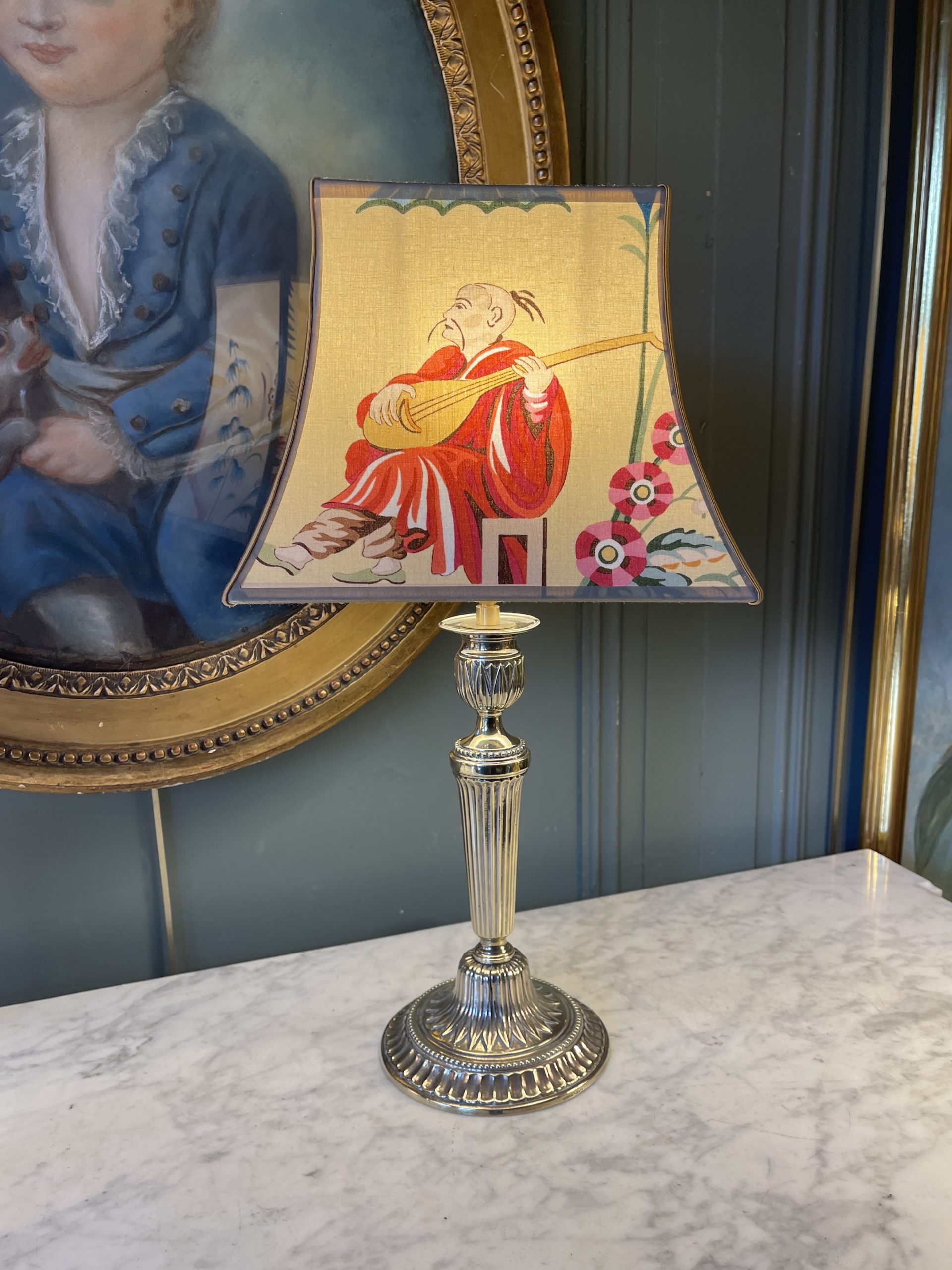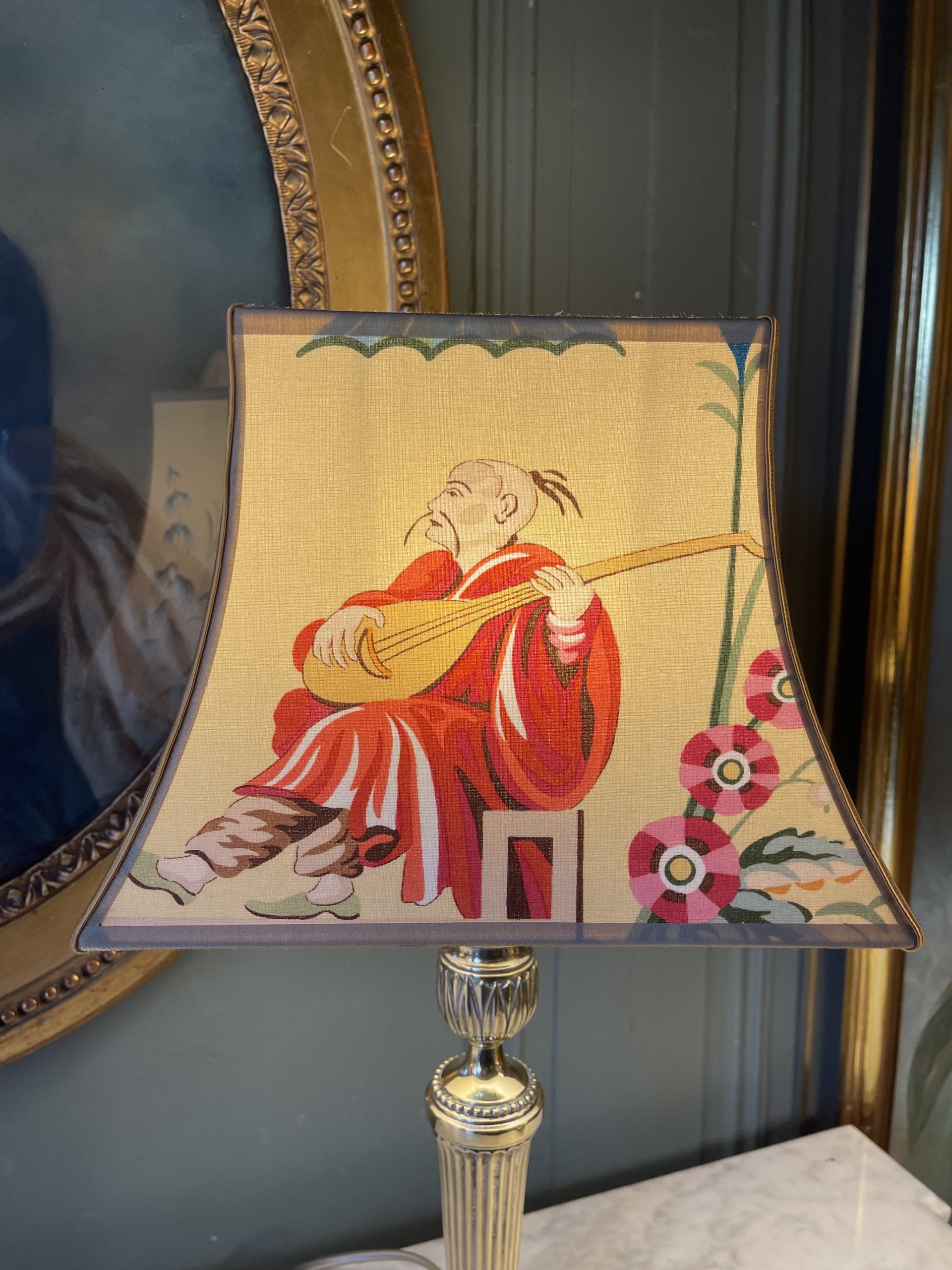 Son abat-jour pagode a été créé à partir d’un tissu de Brunschwig & fils, River Song à décor de personnages asiatiques sur fond jaune.