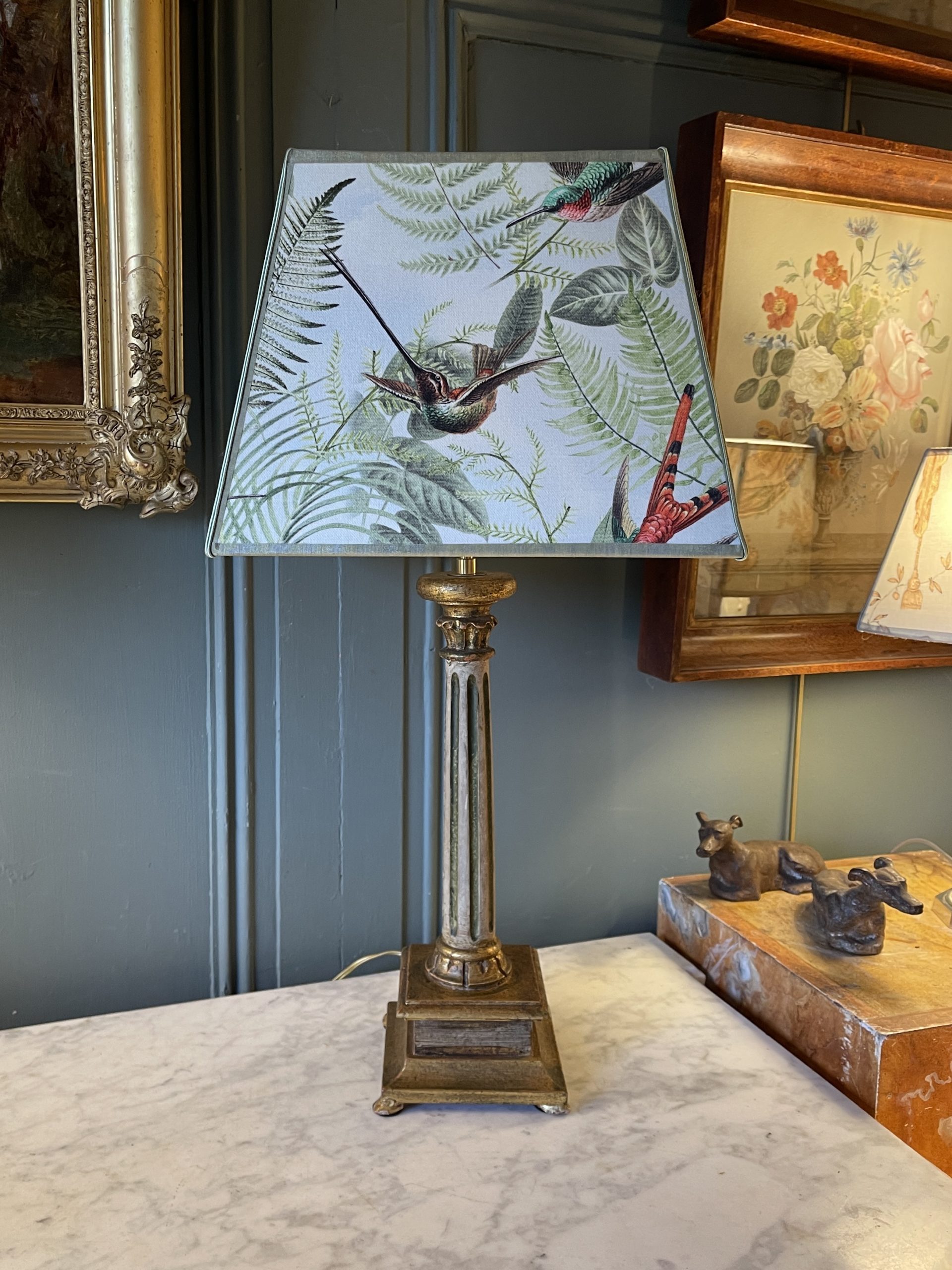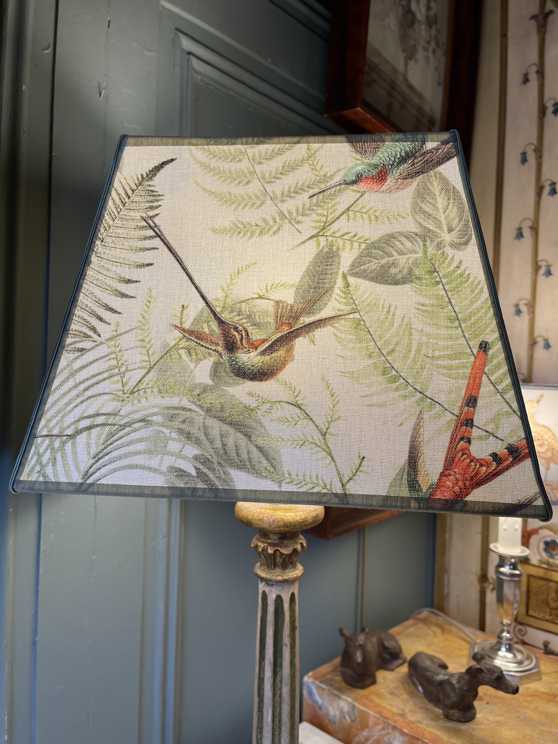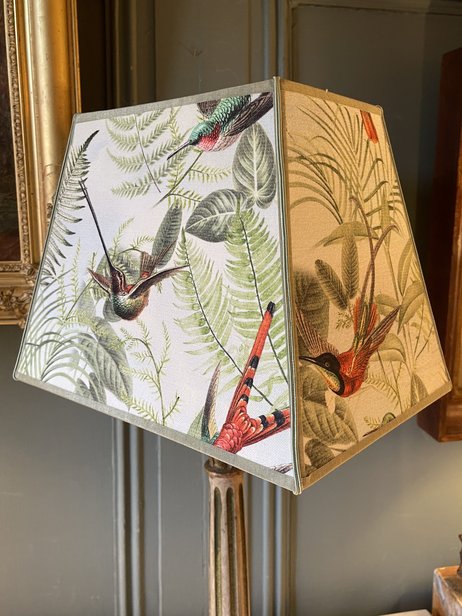 Son abat-jour rectangulaire a été créé à partir d’un tissu à décor de Colibris.