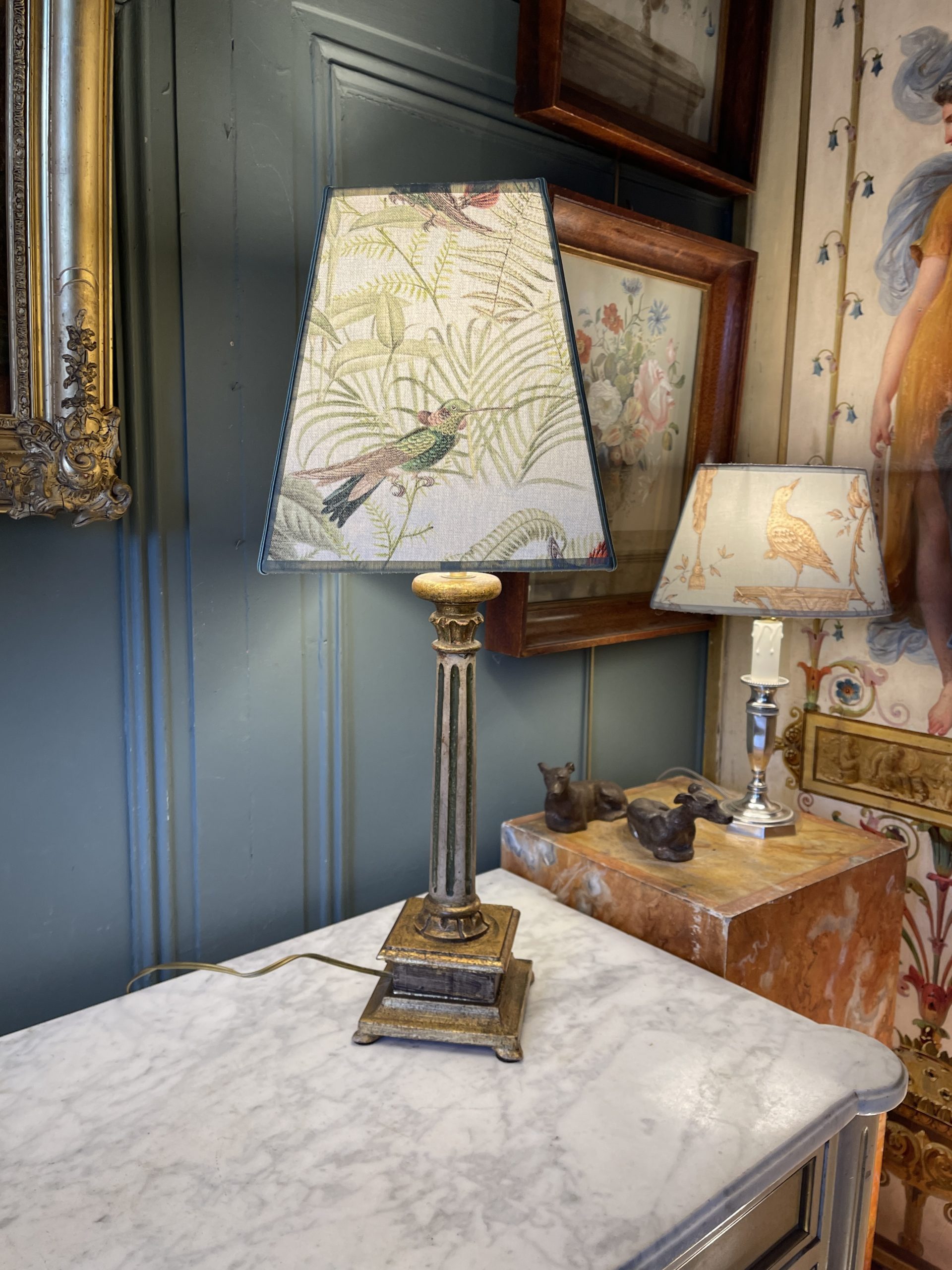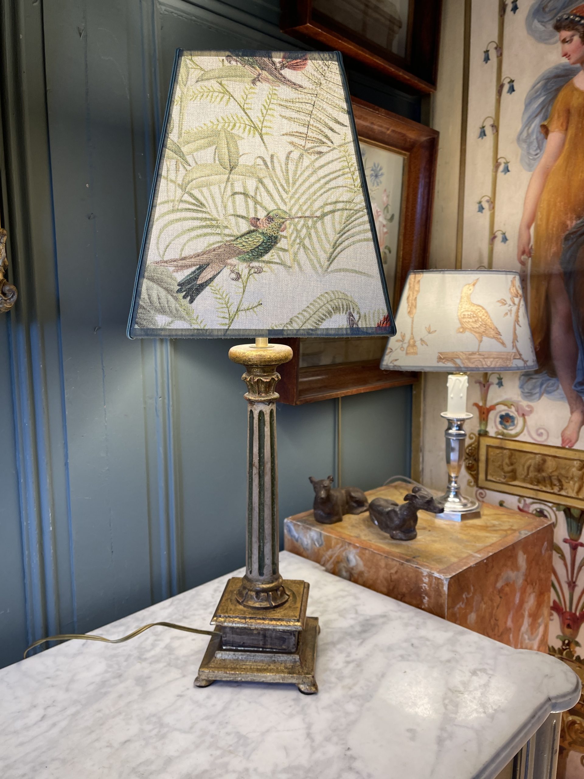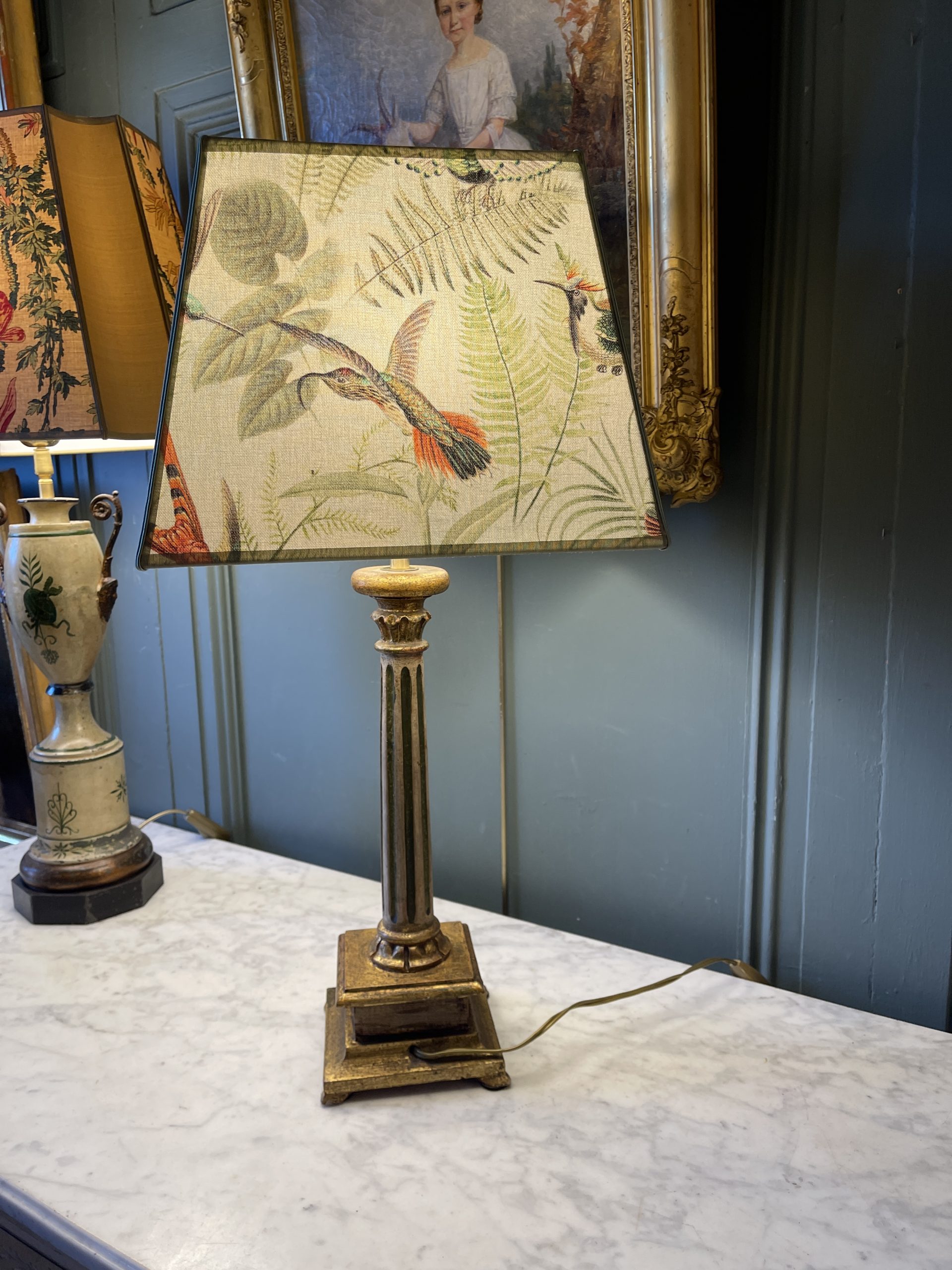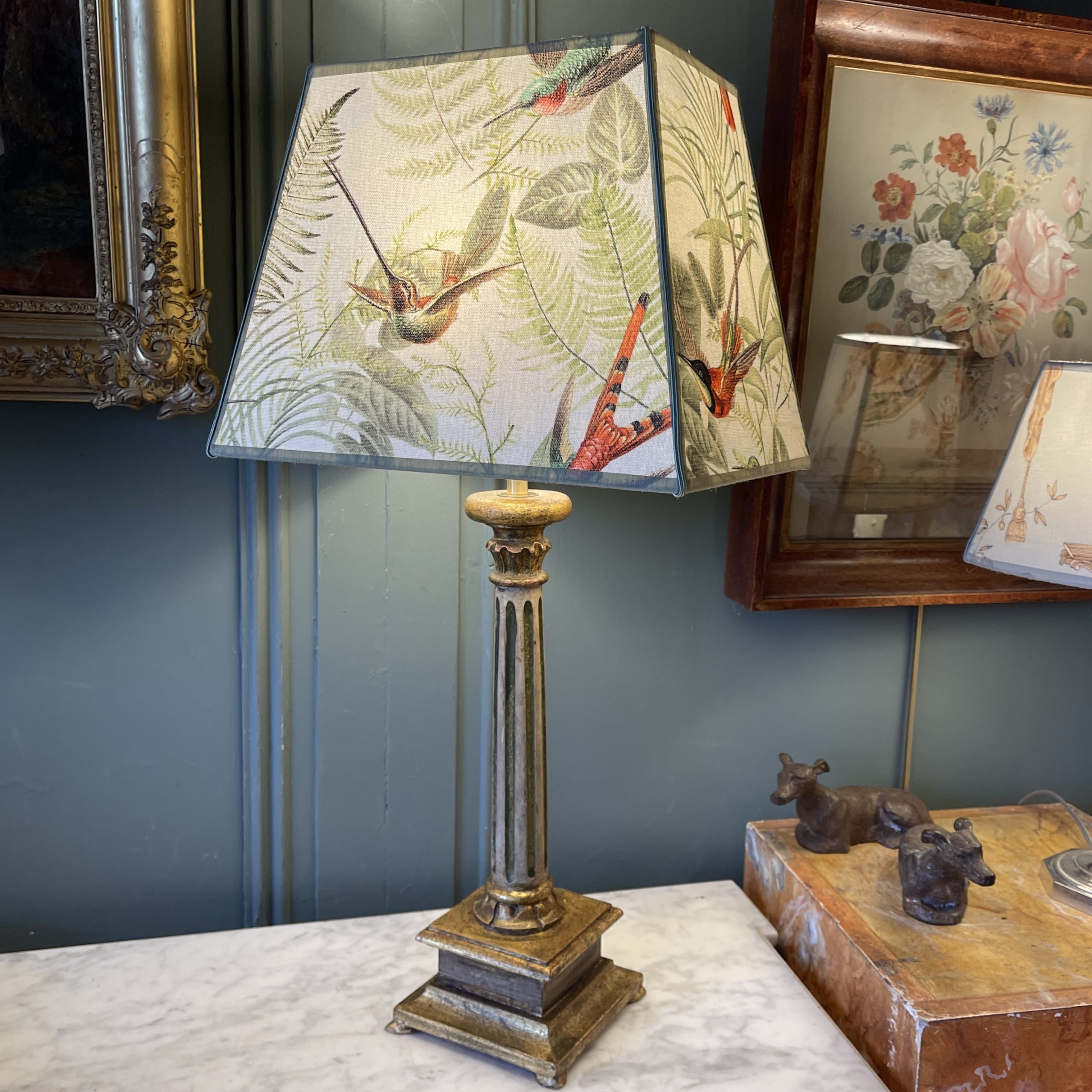 Son abat-jour rectangulaire a été créé à partir d’un tissu à décor de Colibris.