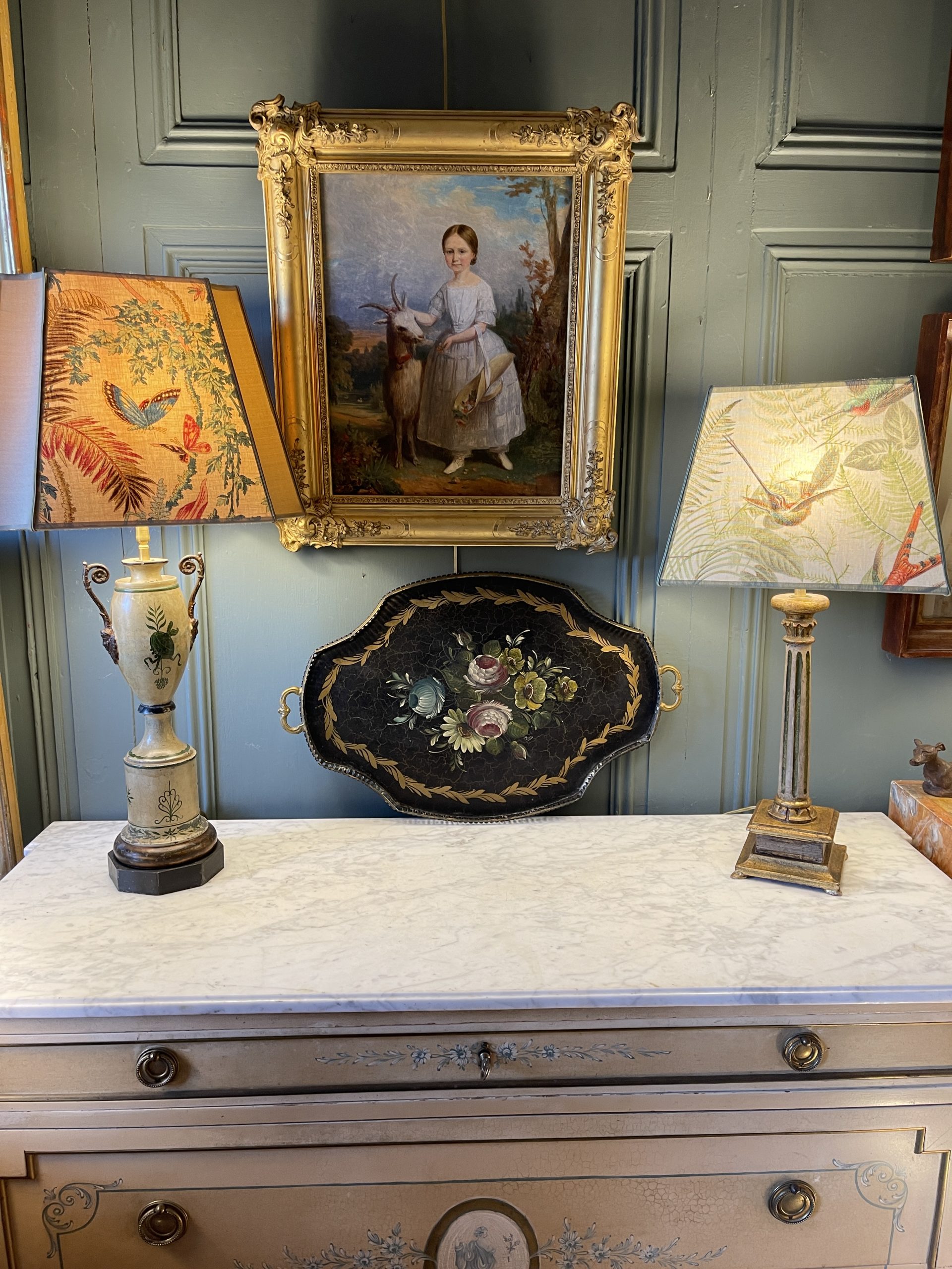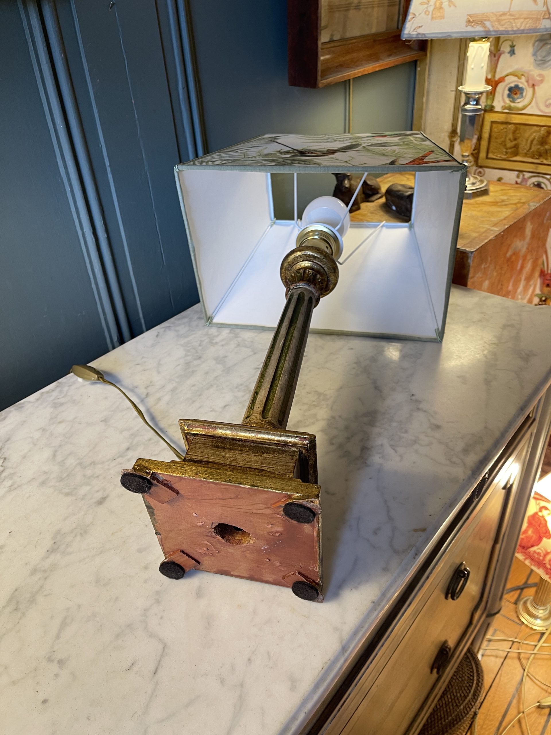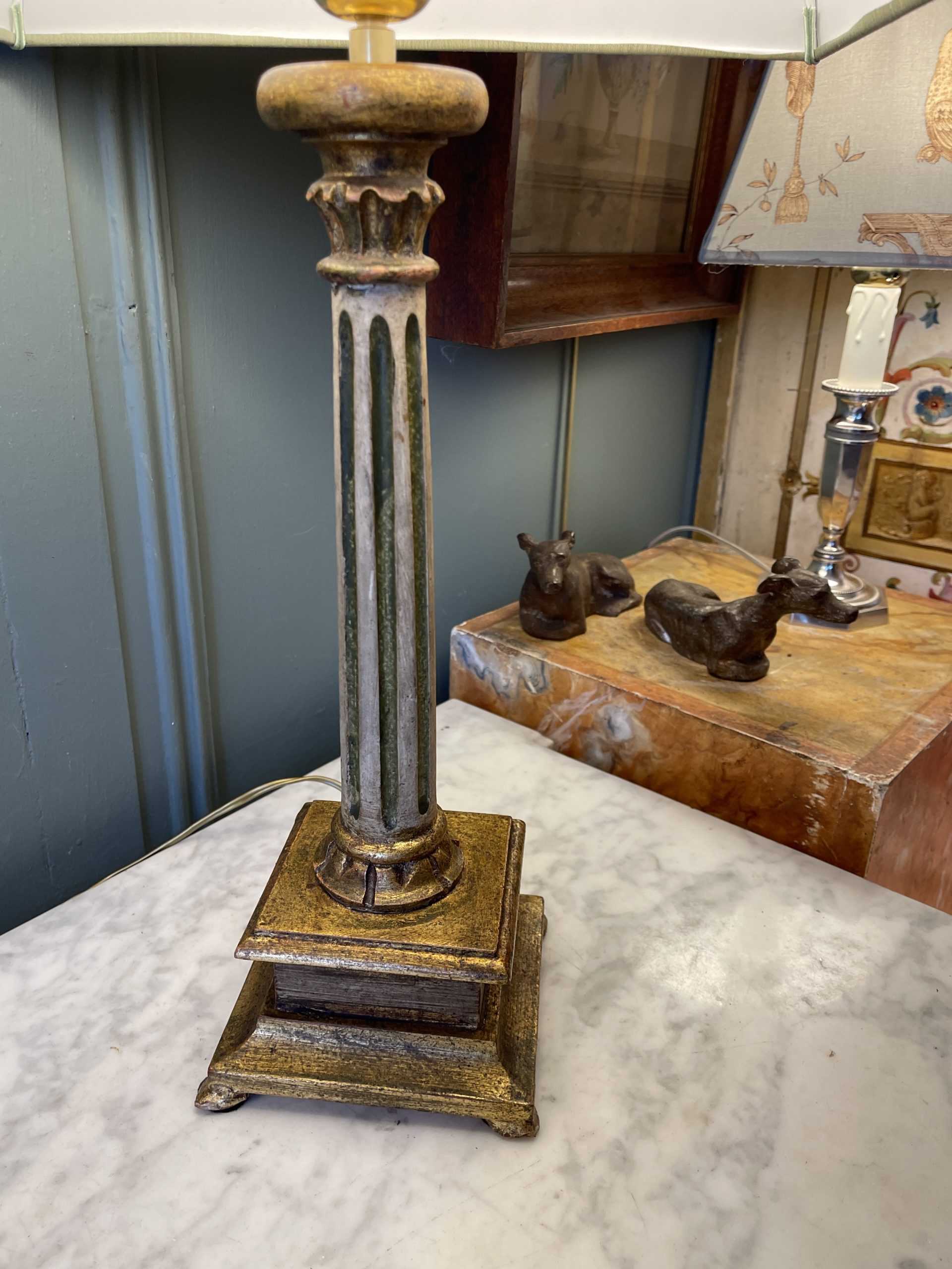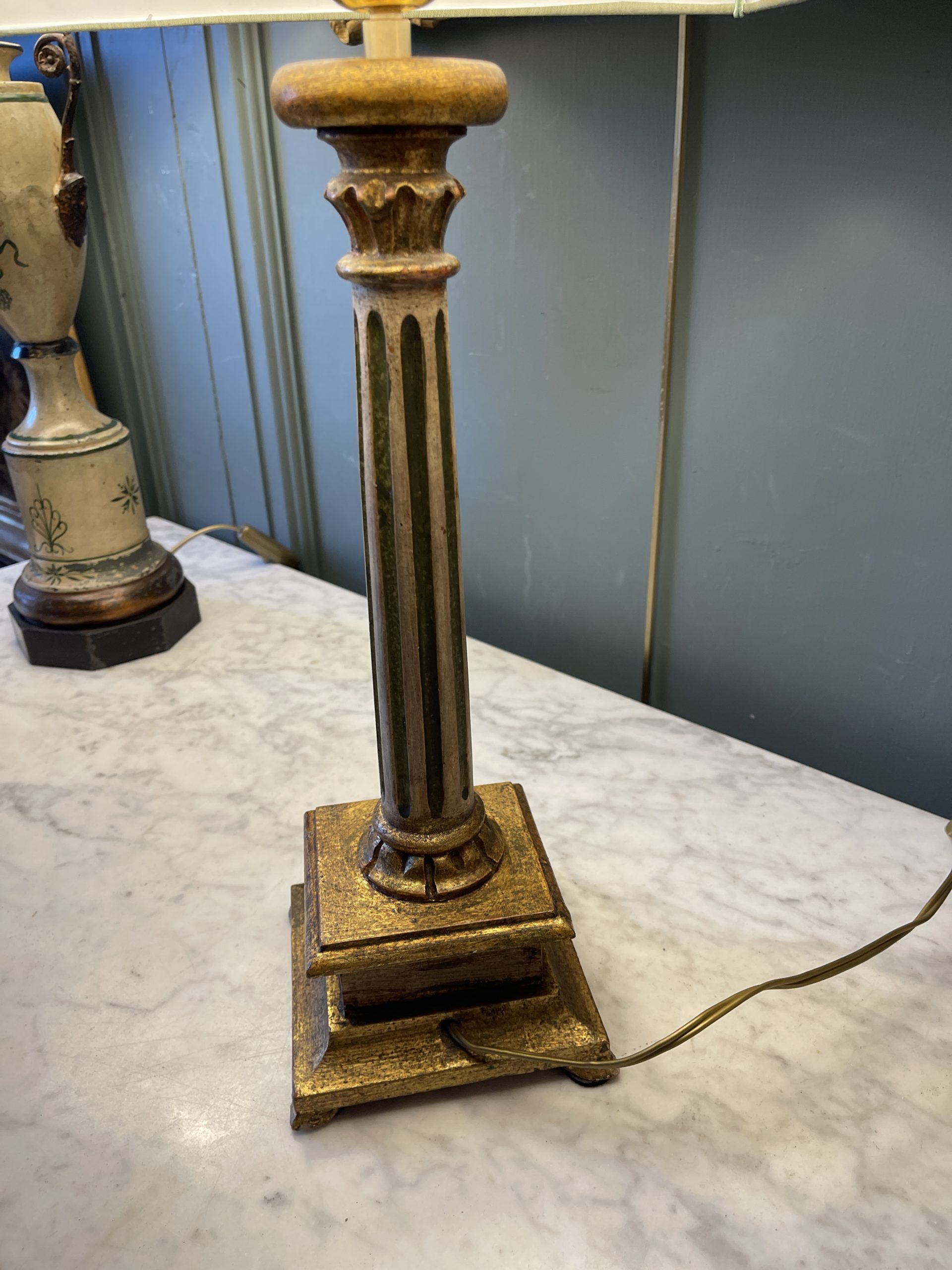 Lampe en bois peint de couleur crème, vert et doré époque XXème.