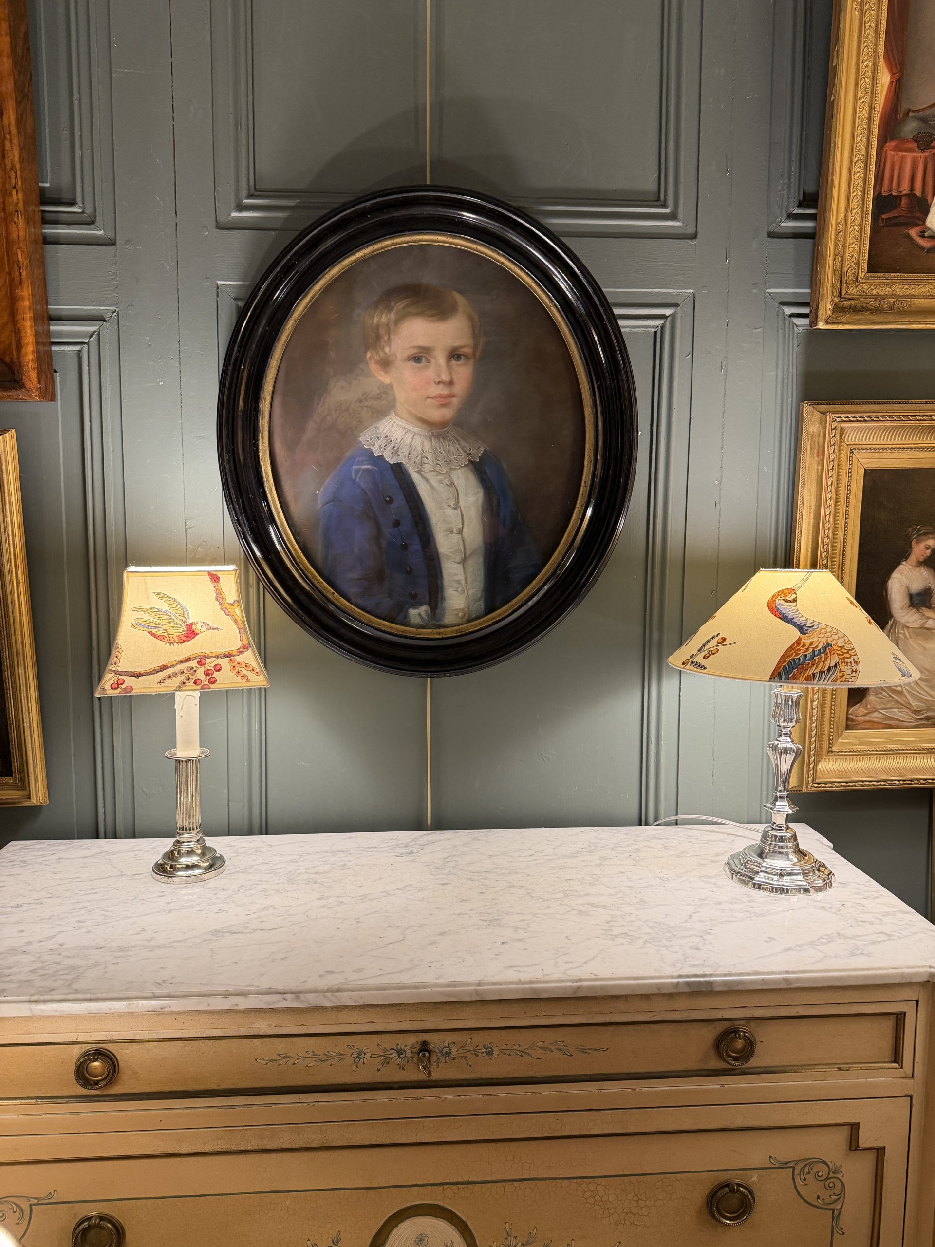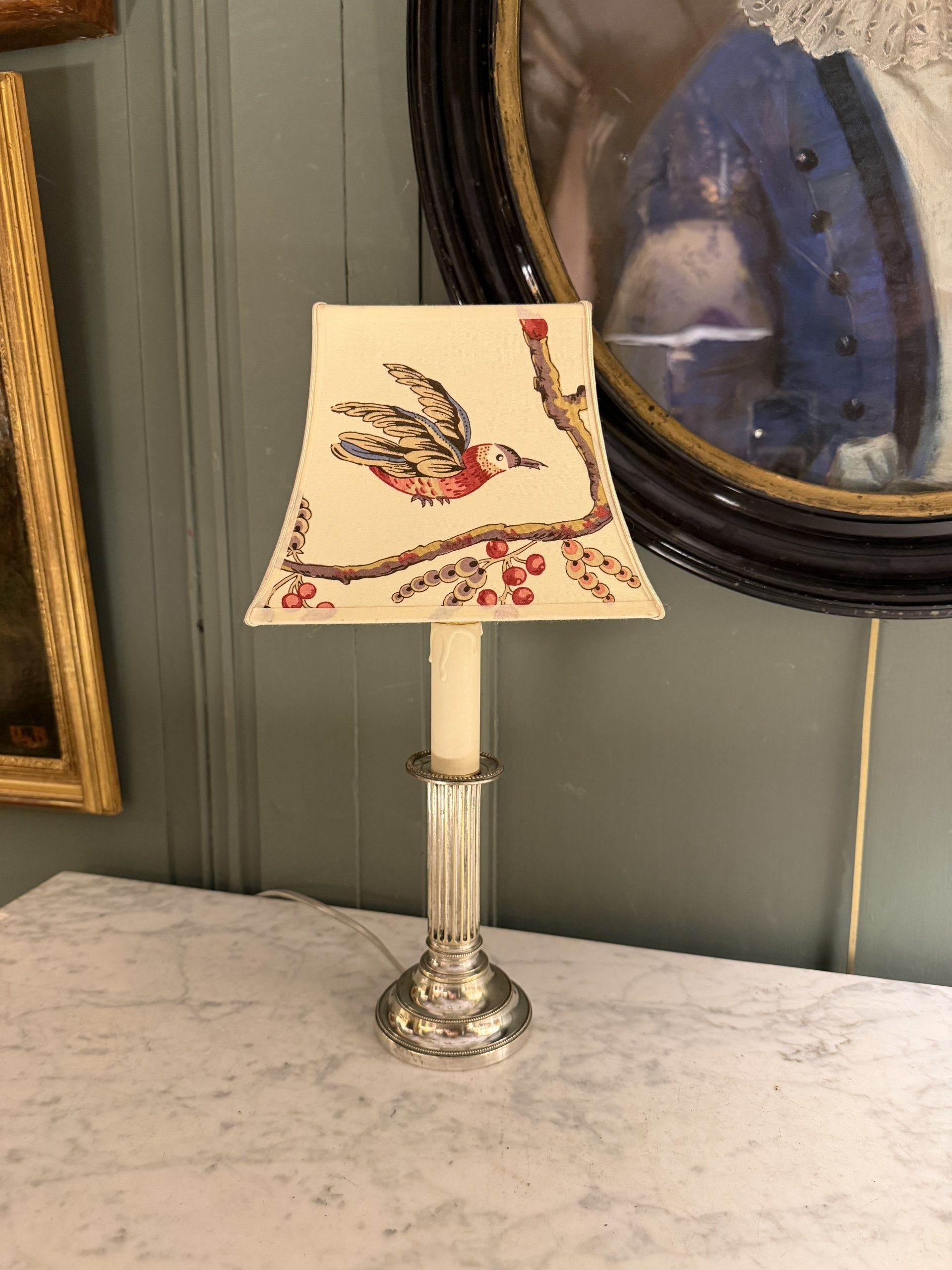 Son abat-jour pagode a été créé à partir d’un tissu de Braquenié « la Vallière » à décor d’un oiseau.