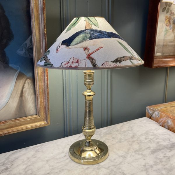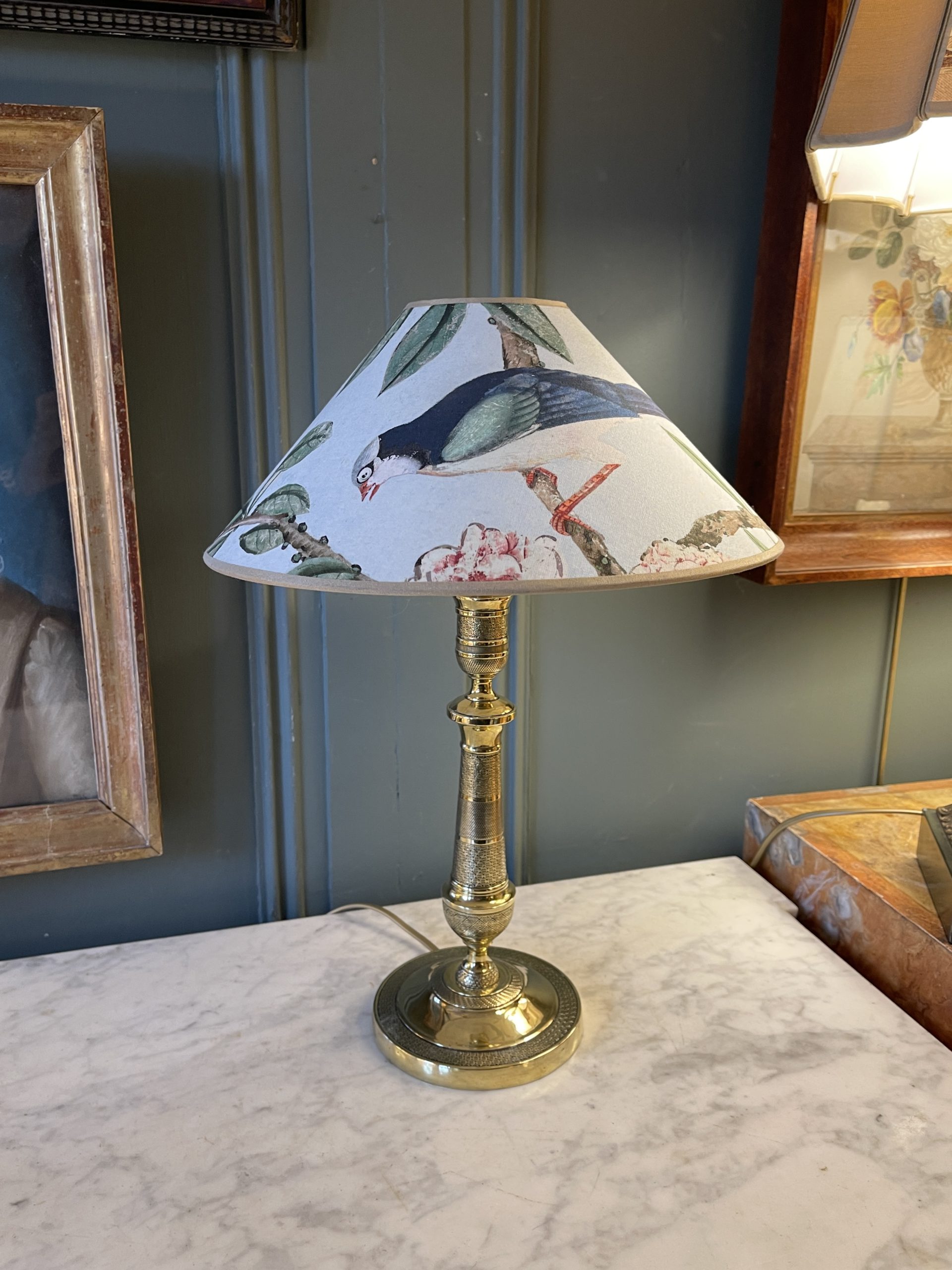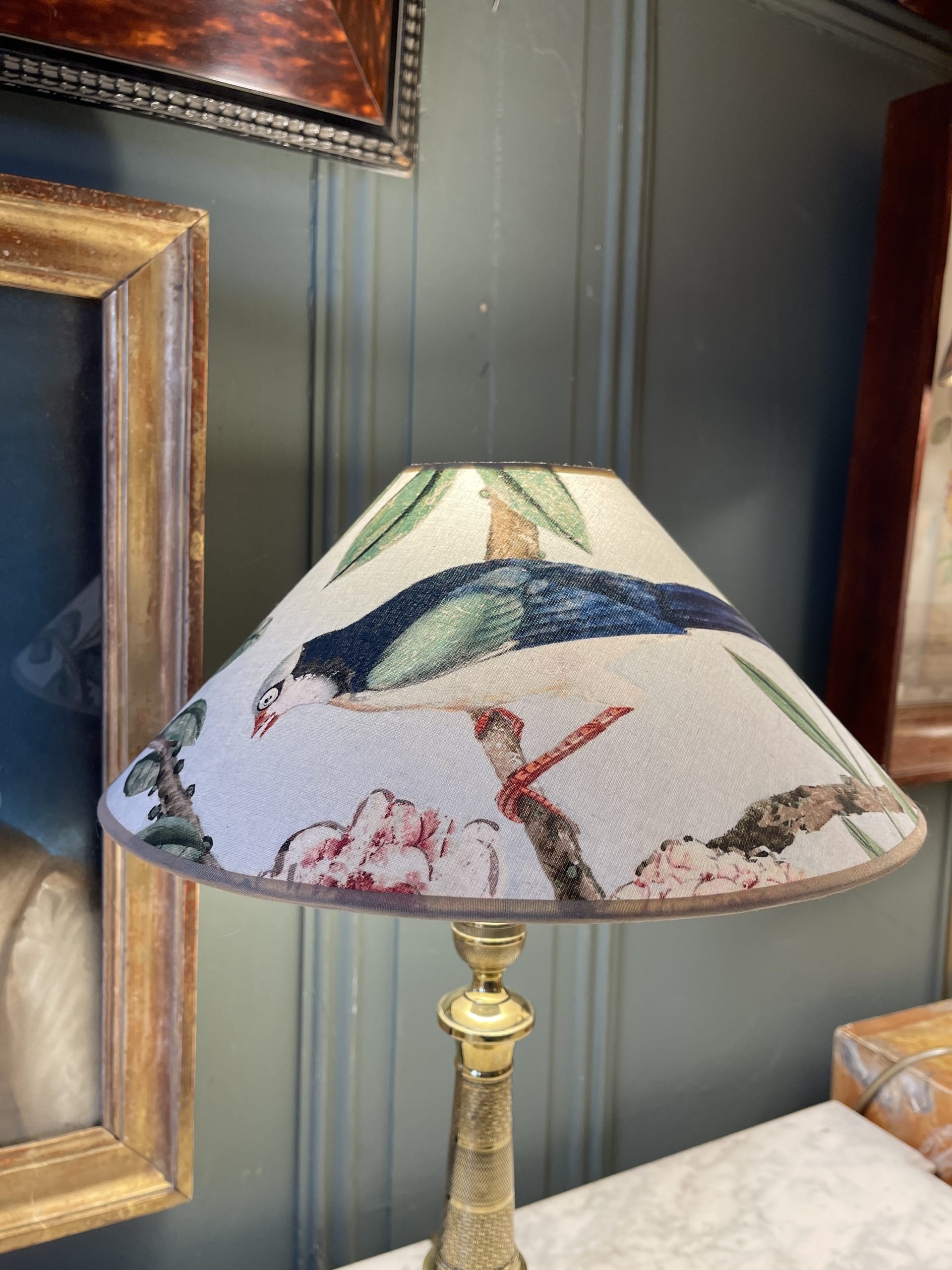 Son abat-jour conique a été créé à partir d’un tissu à décor d’un oiseau sur fond bleu très pâle, d’Antoinette Poisson « Canton ».