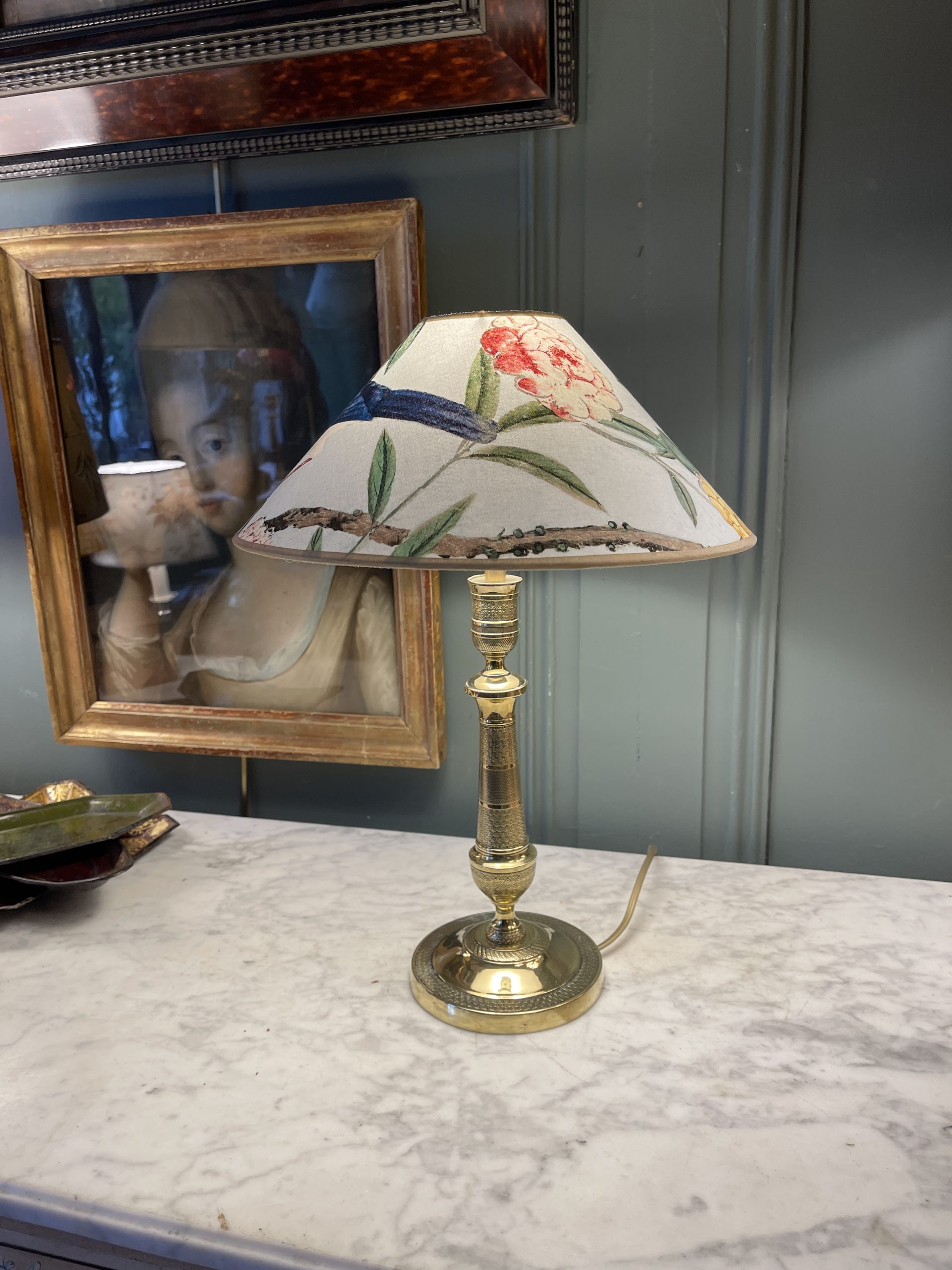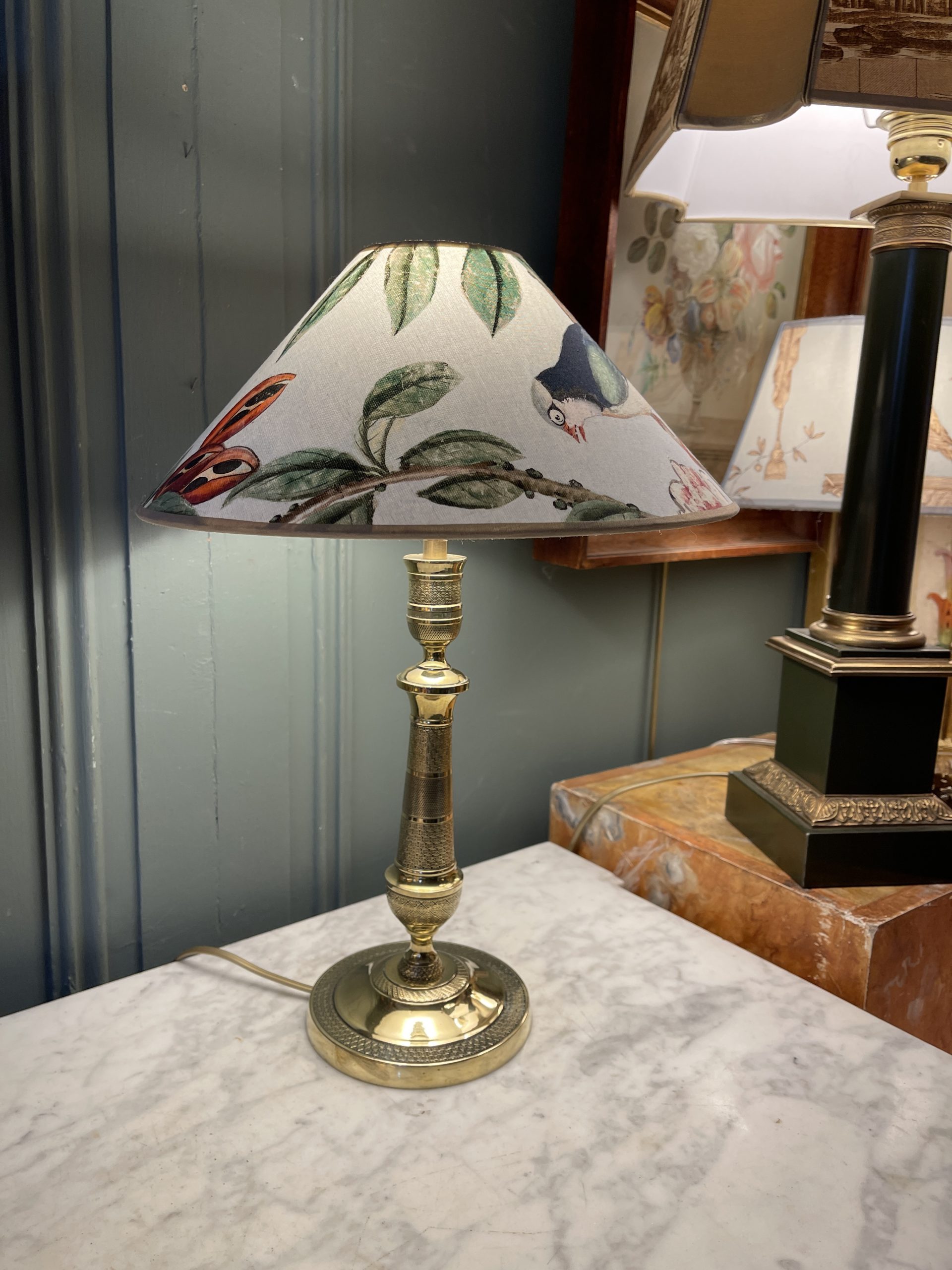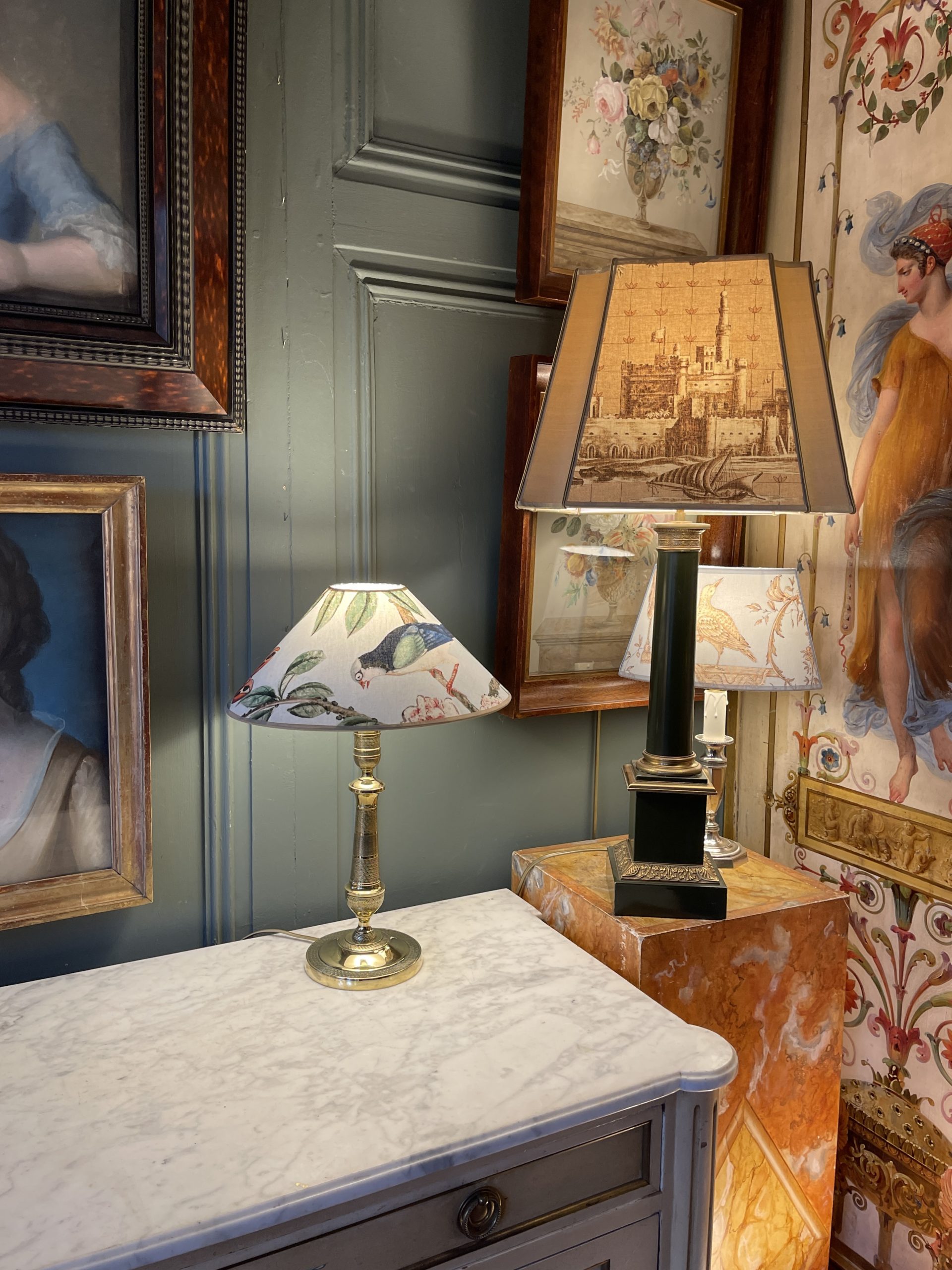 Son abat-jour conique a été créé à partir d’un tissu à décor d’un oiseau sur fond bleu très pâle, d’Antoinette Poisson « Canton ».