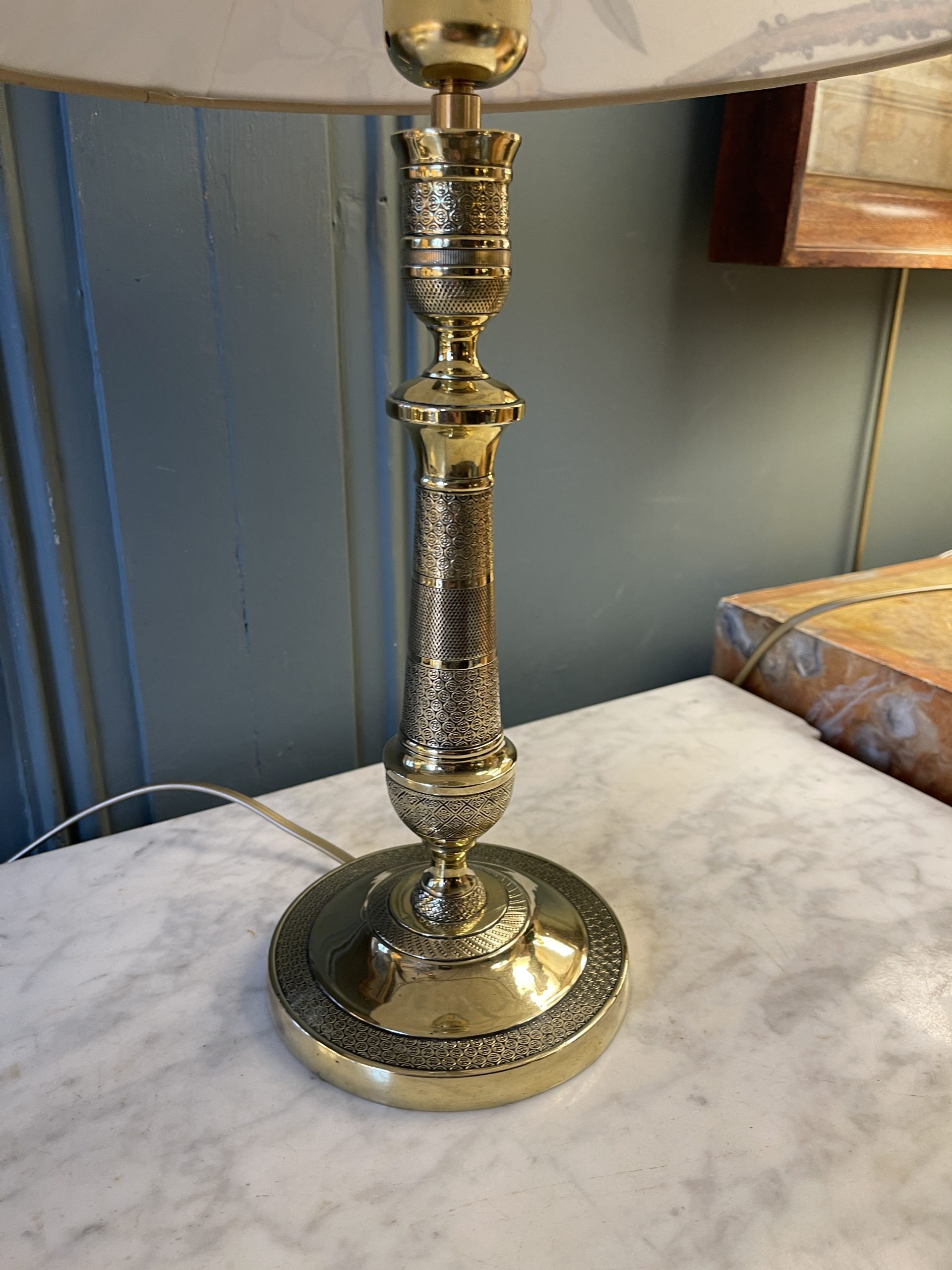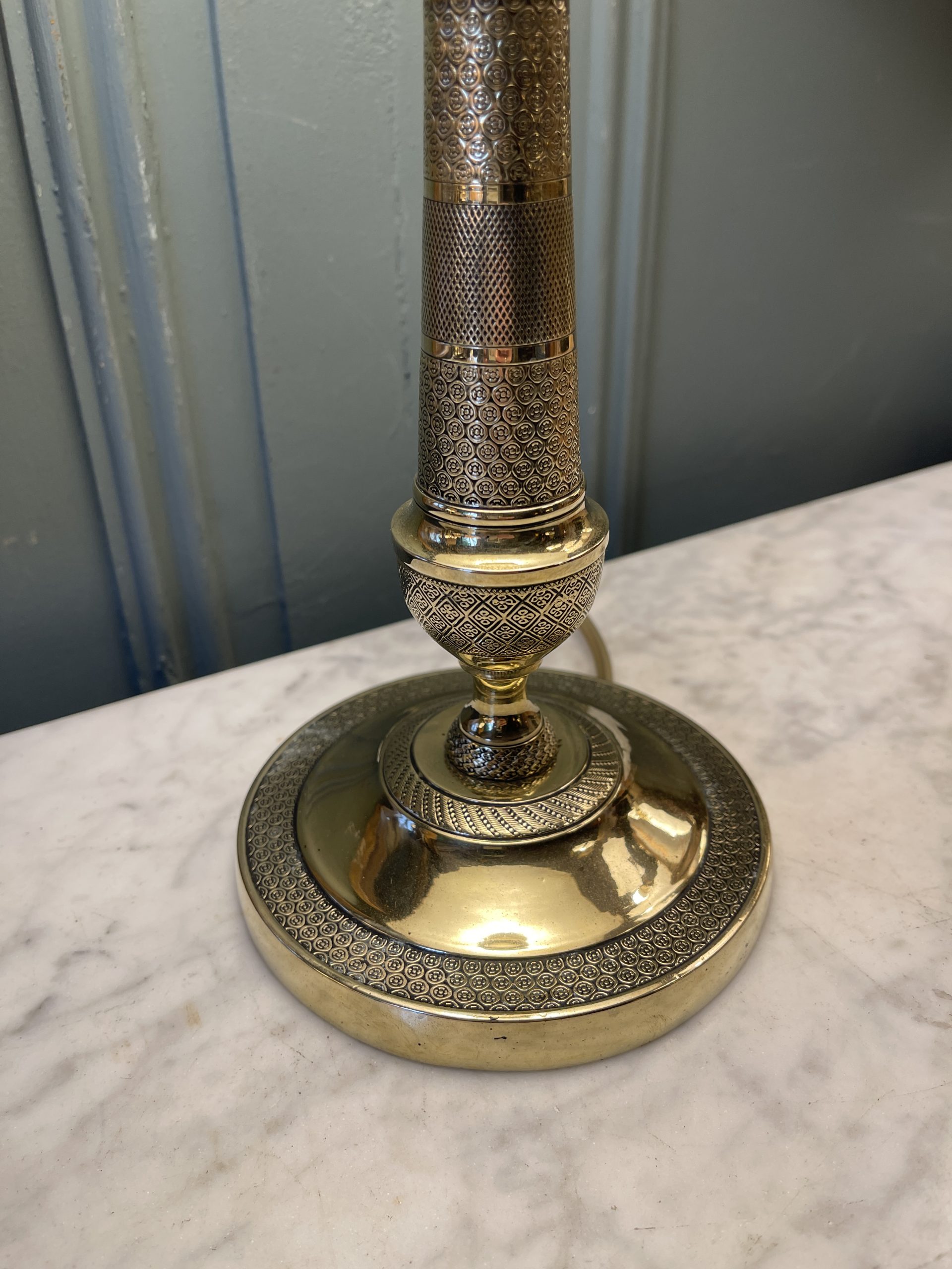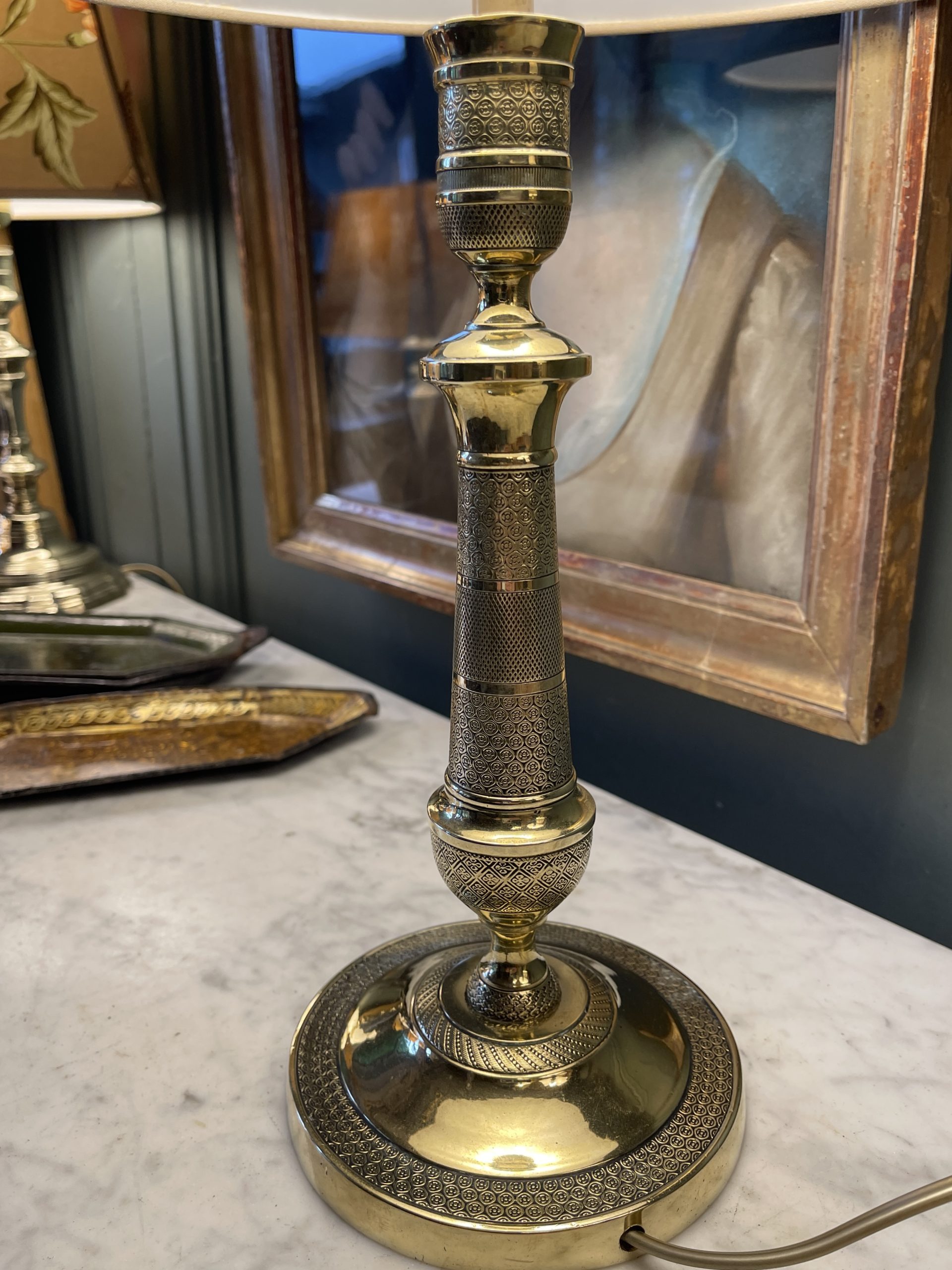Bougeoir XIXème époque restauration en bronze poli (couleur doré) finement ciselé et guilloché monté en lampe.