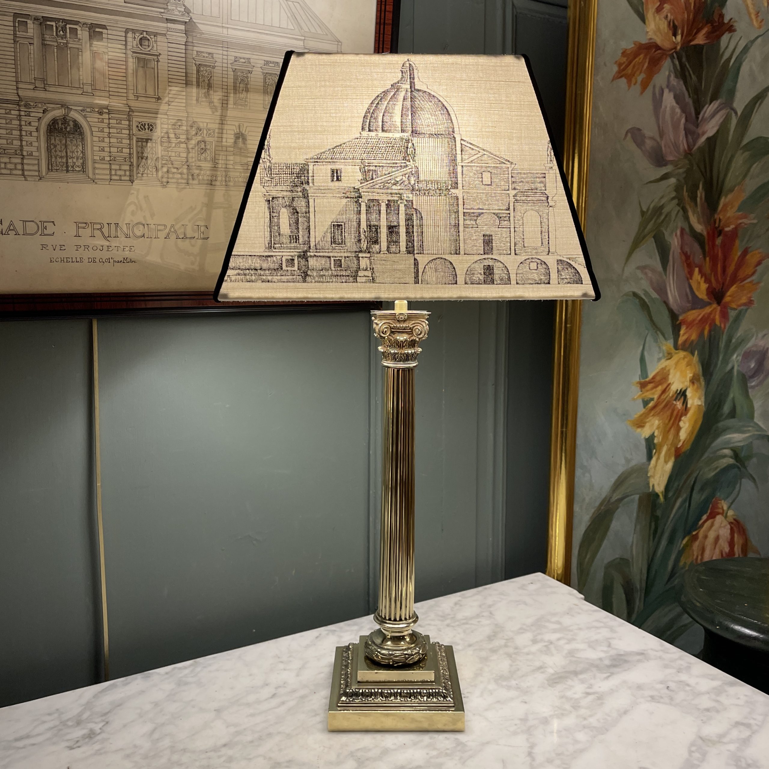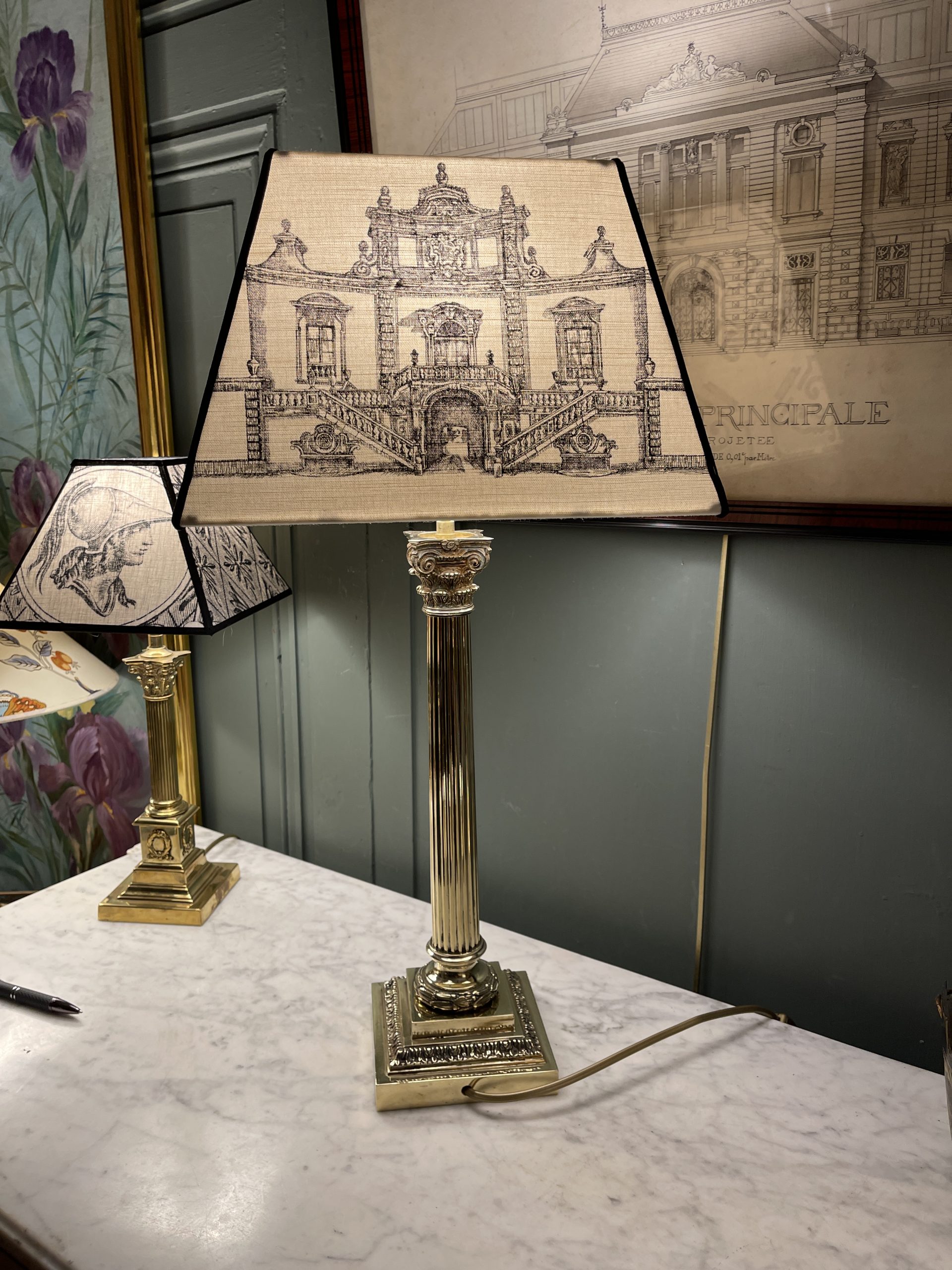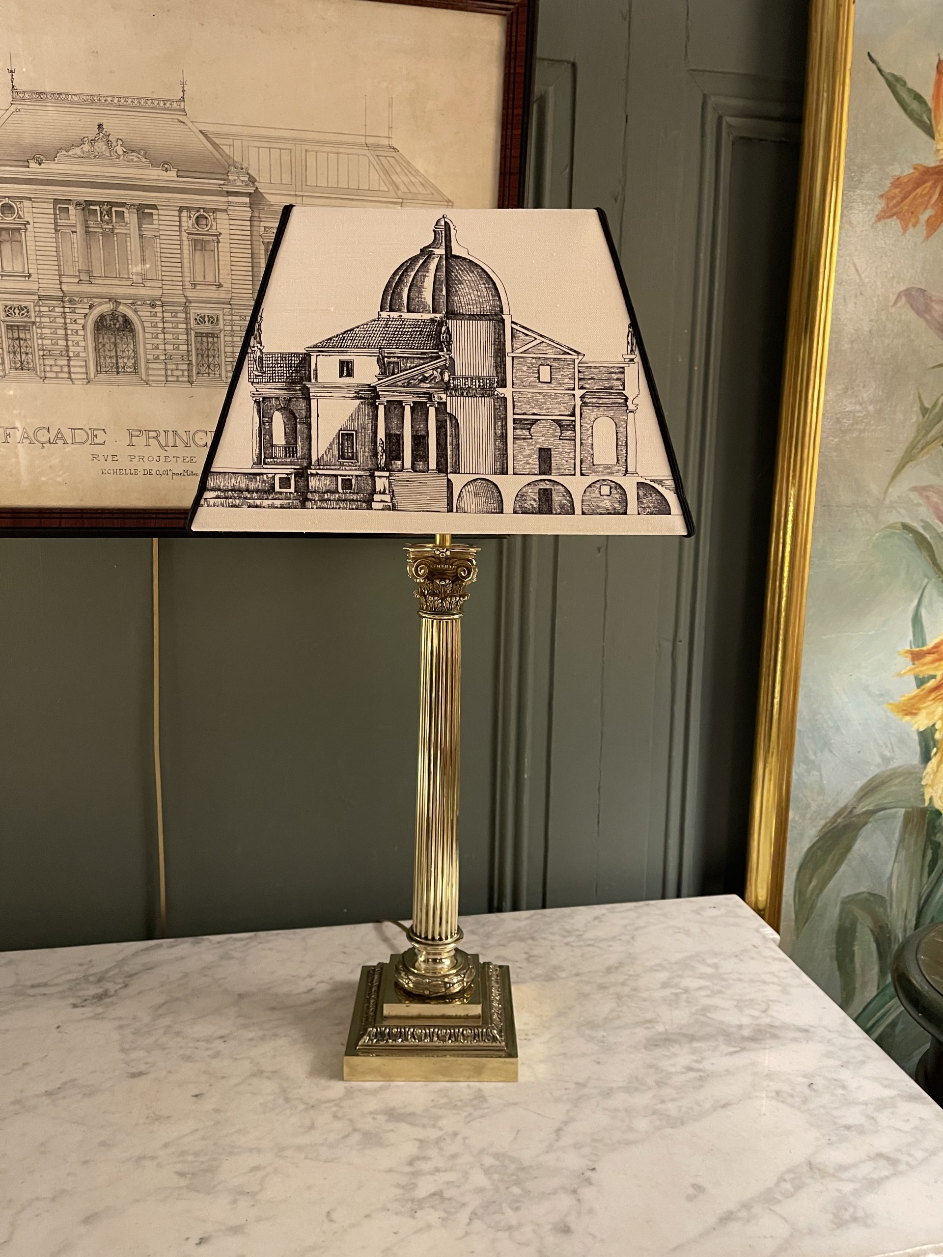 Son abat-jour de forme rectangulaire, a été créé à partir d’un tissus  « Palazzo » de Pierre Frey à décor de la Villa Almerico Capra. Cette forme d’abat-jour a l’avantage de ne pas prendre de volume car peu profond, idéal pour les consoles, cheminées…